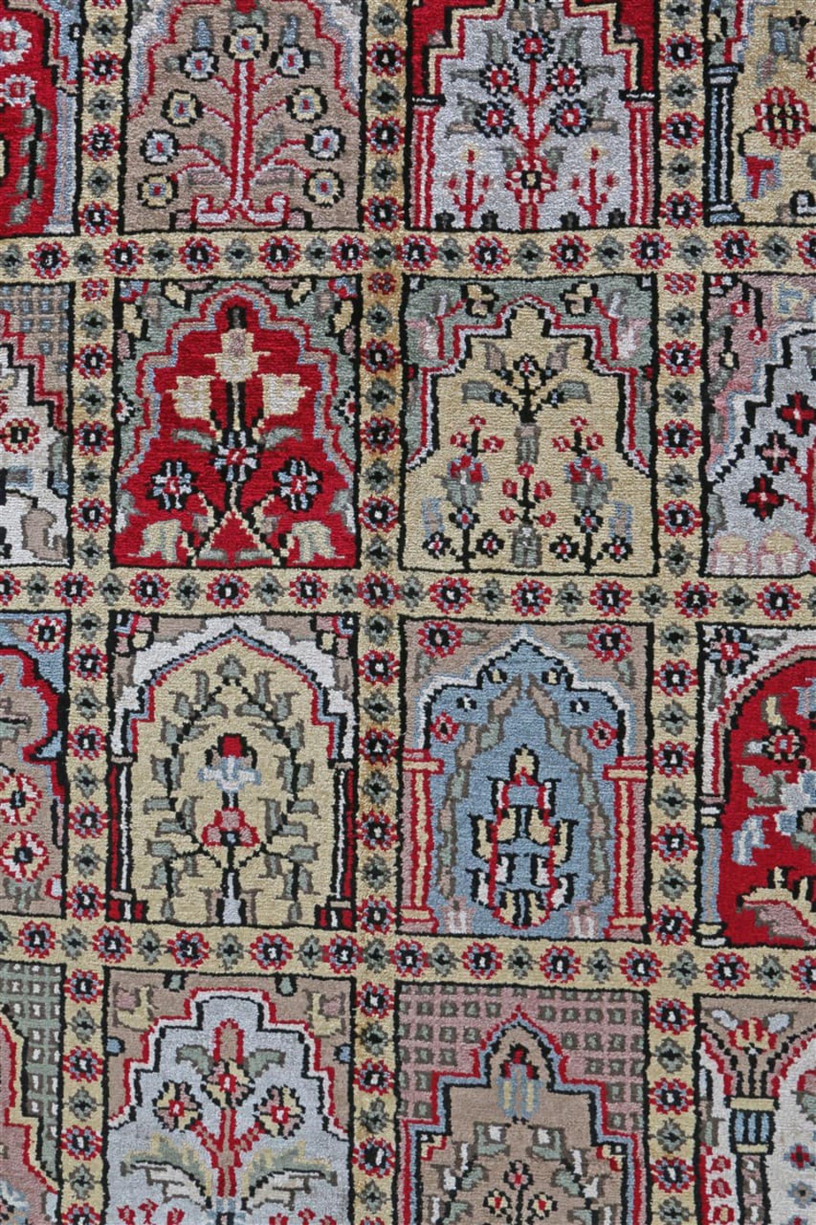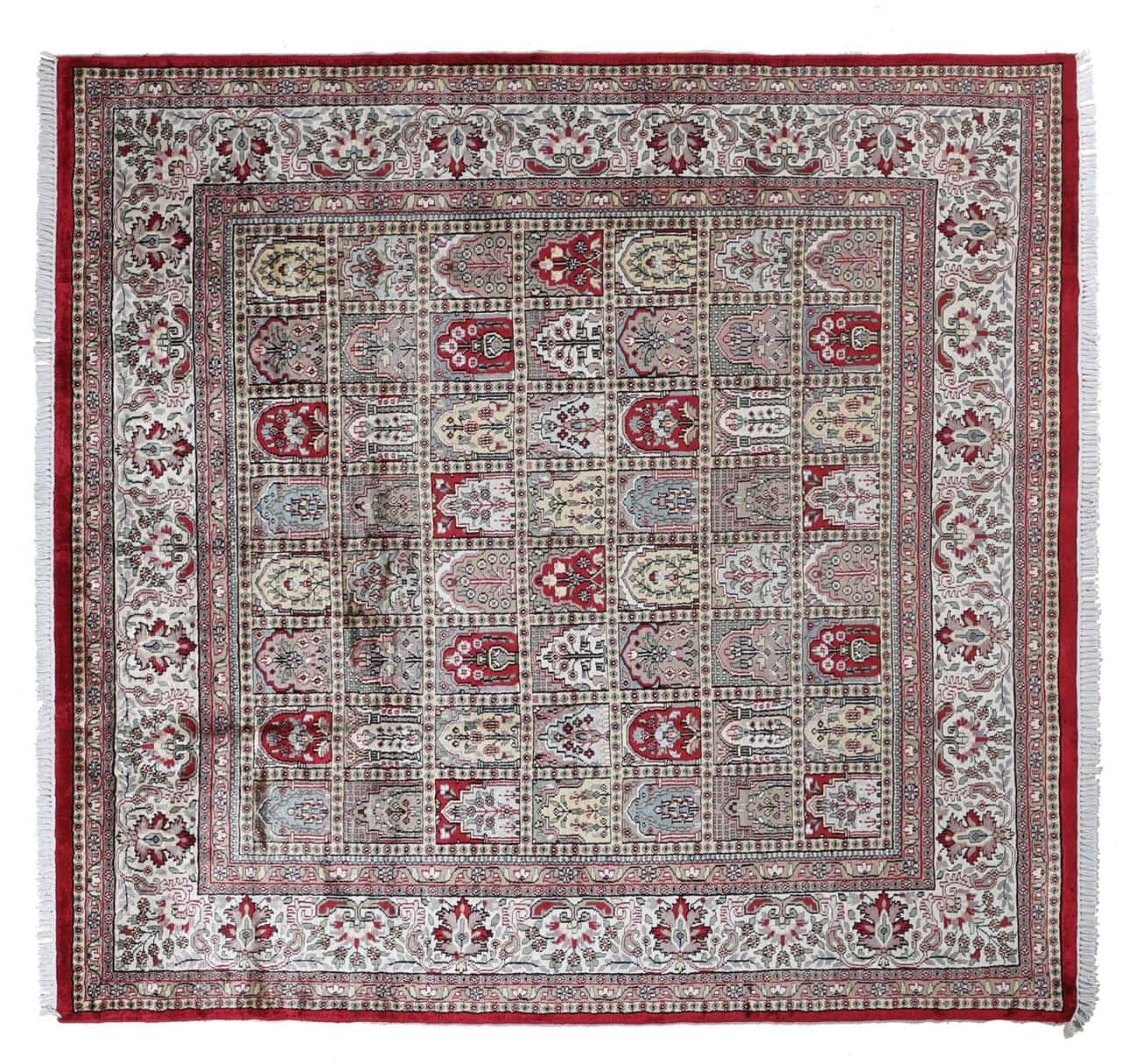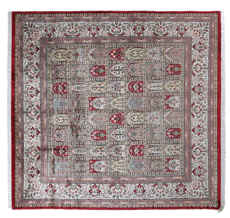 Tæppe-nr.: 290572006627545 Størrelse: 247x236 cm Tykkelse: ca. 8 mm Knuder: 320 000 - 360 000 / m² Forarbejdelse: Knyttet i hånden Luv: Viskose Kæde: Bomuld Oprindelse: Indien Alder: Ny Vægt: ca. 20 kg Antal på lager: Unik - Kun 1 tilbage på lager