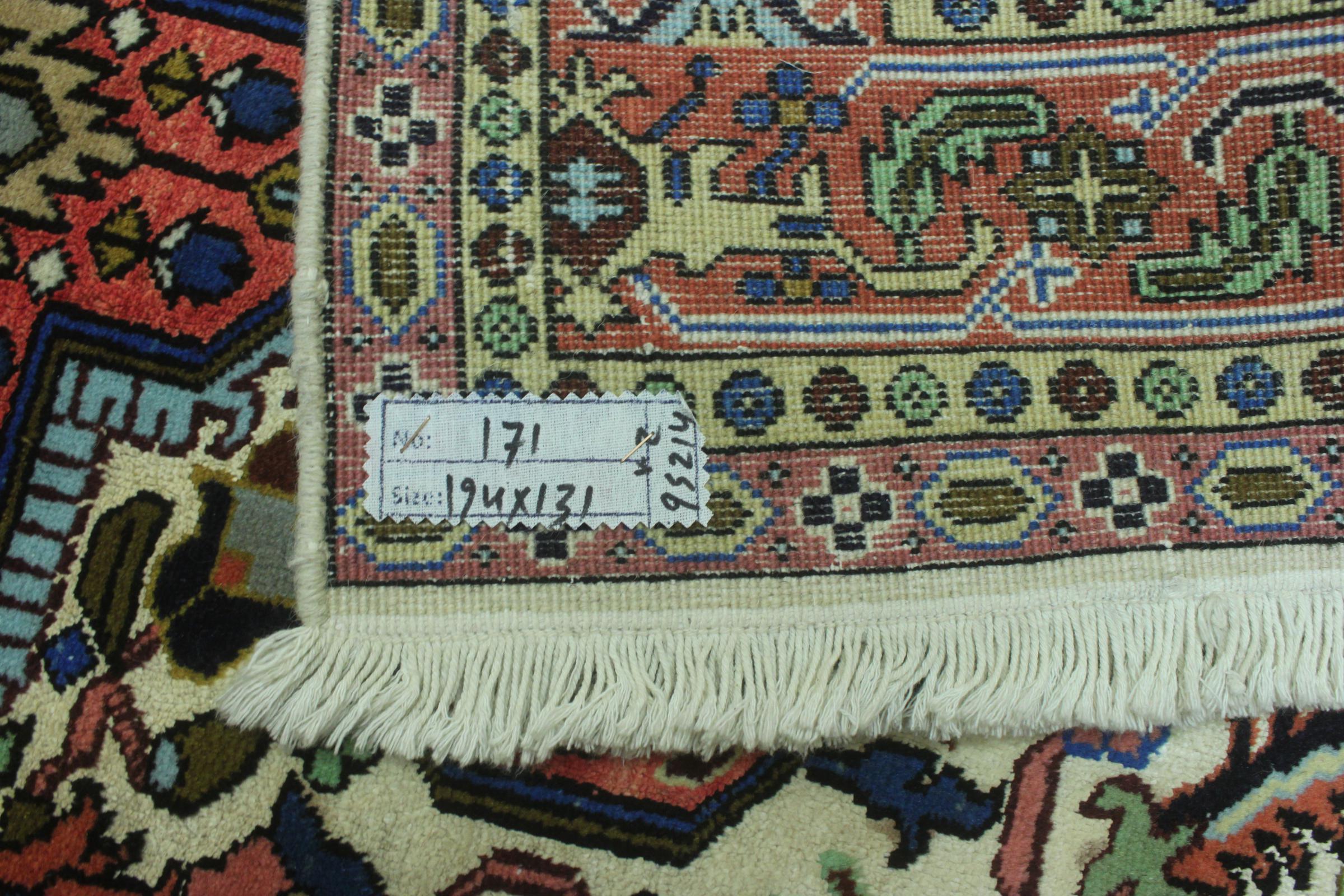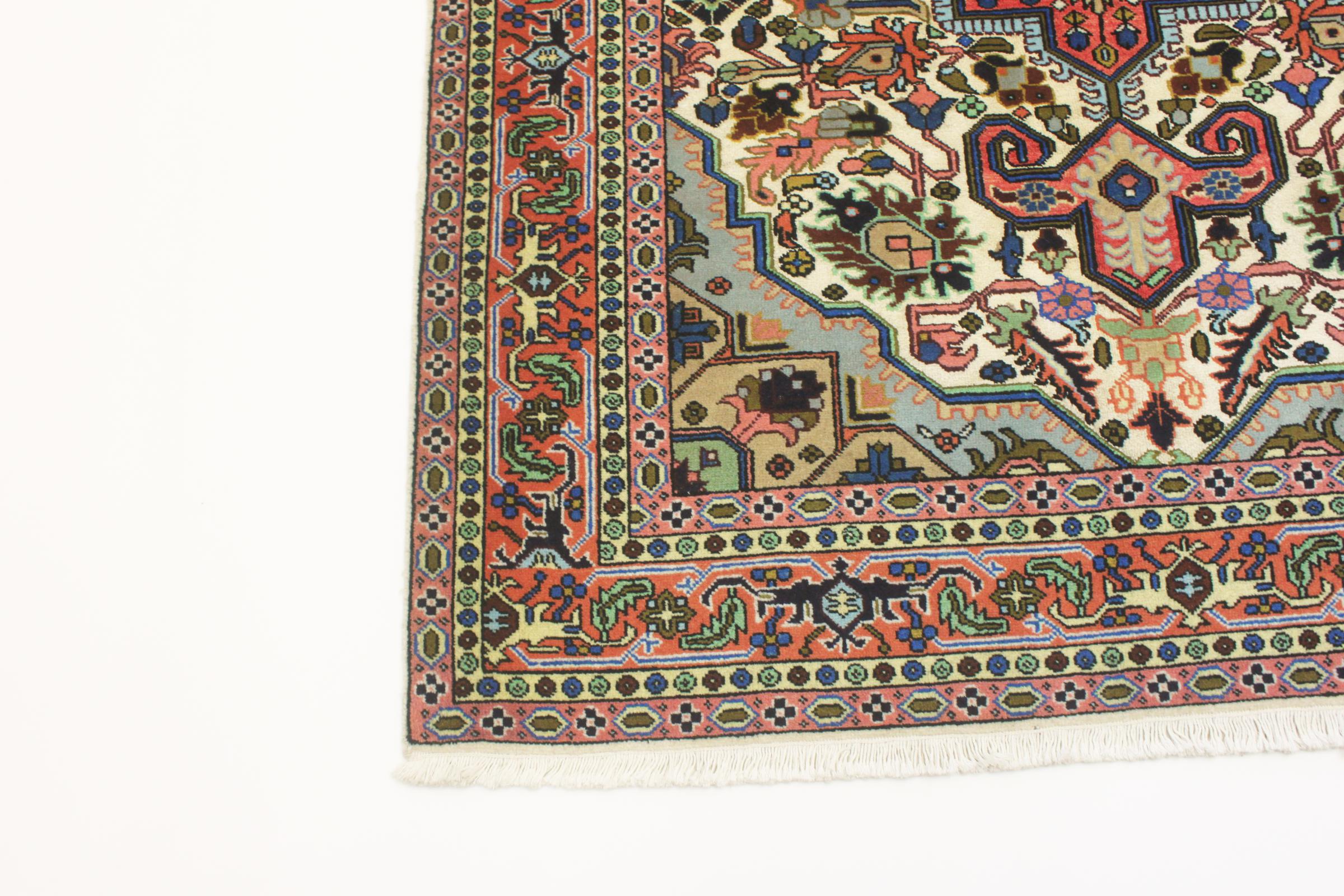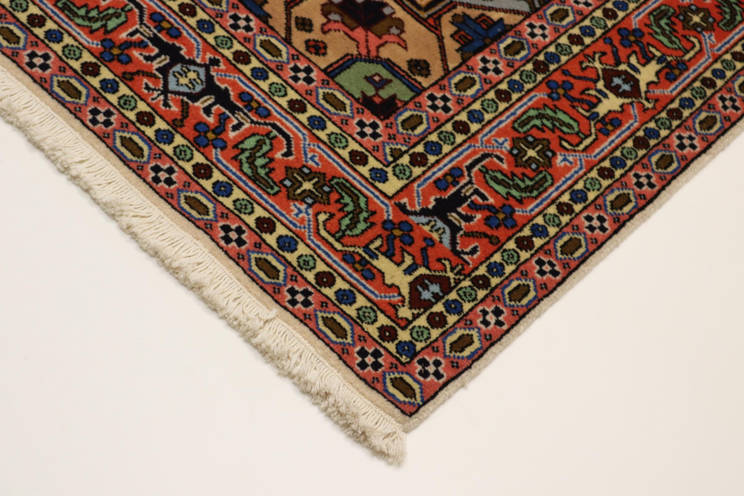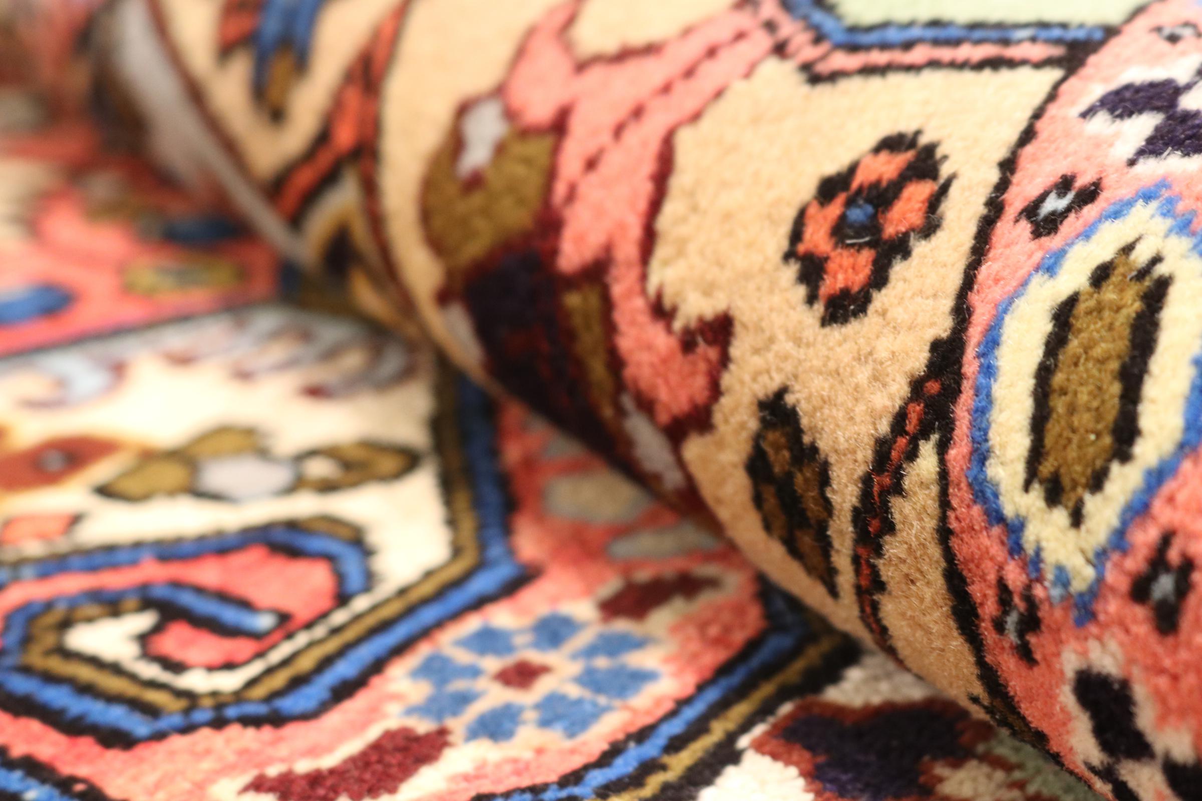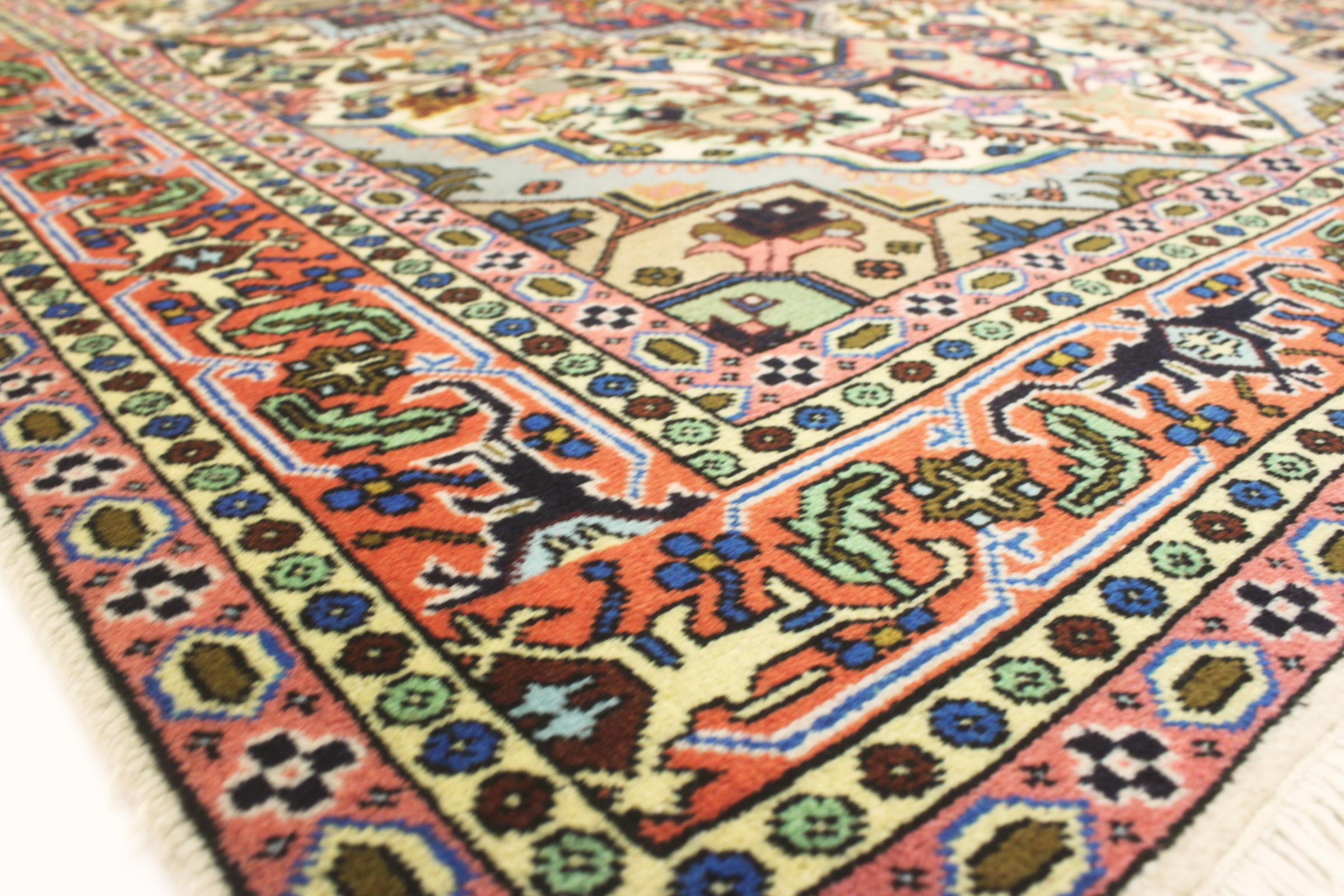 Dette Heriz-tæppe er et smukt eksempel på persisk tæppehåndværk. Dets rustikke design er et bevis på dets holdbarhed. Det er håndknyttet i byen Heriz, som ligger i nærheden af Tabriz i det nordvestlige Iran. Enhver, der er på udkig efter et persisk tæppe, der vil give glæde i lang tid og er meget moderne, vil elske dette Heriz. Heriz-tæppernes ornamenter er ekstremt populære i dag og ses som meget moderne. Du vil aldrig opgive et tæppe som dette igen.