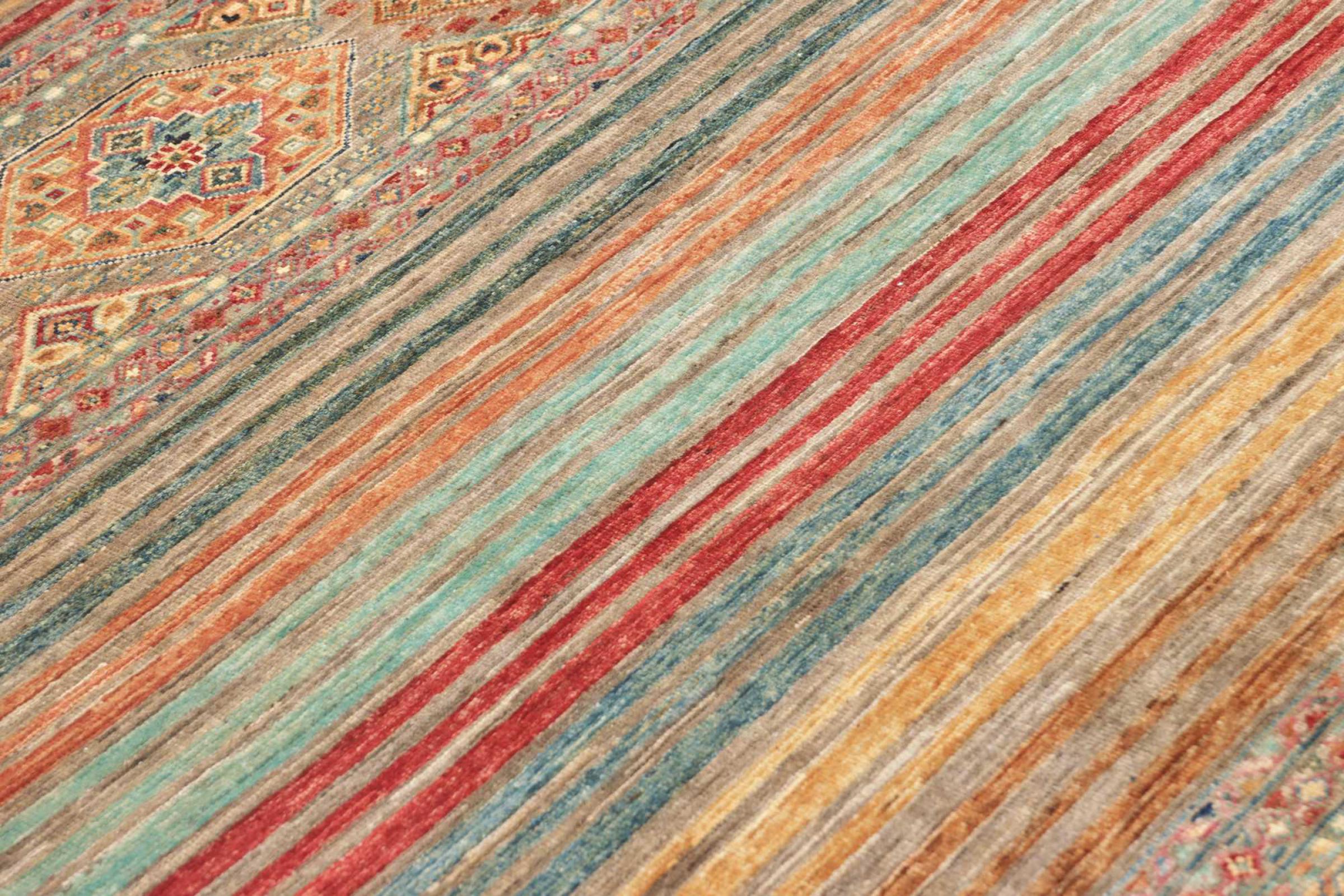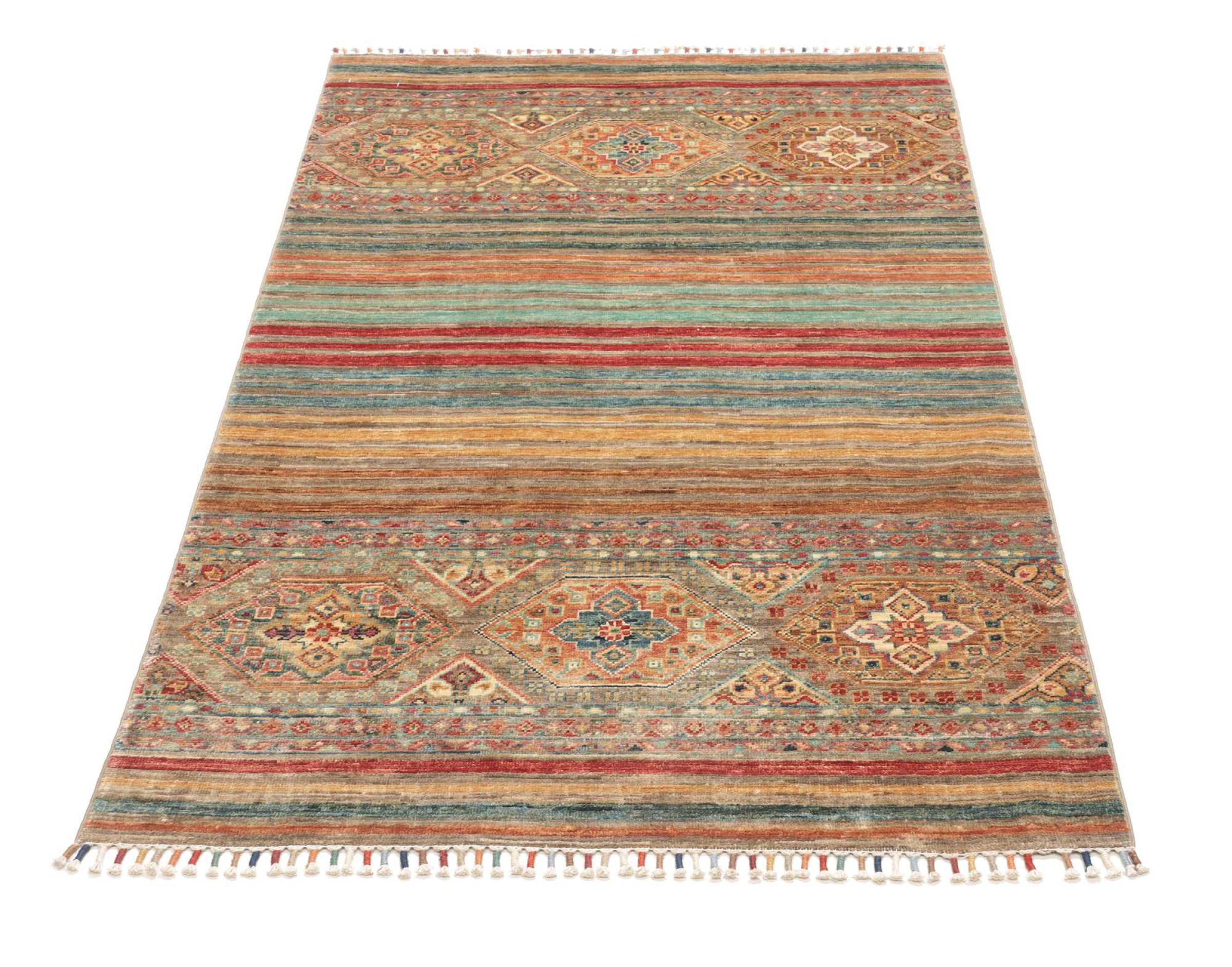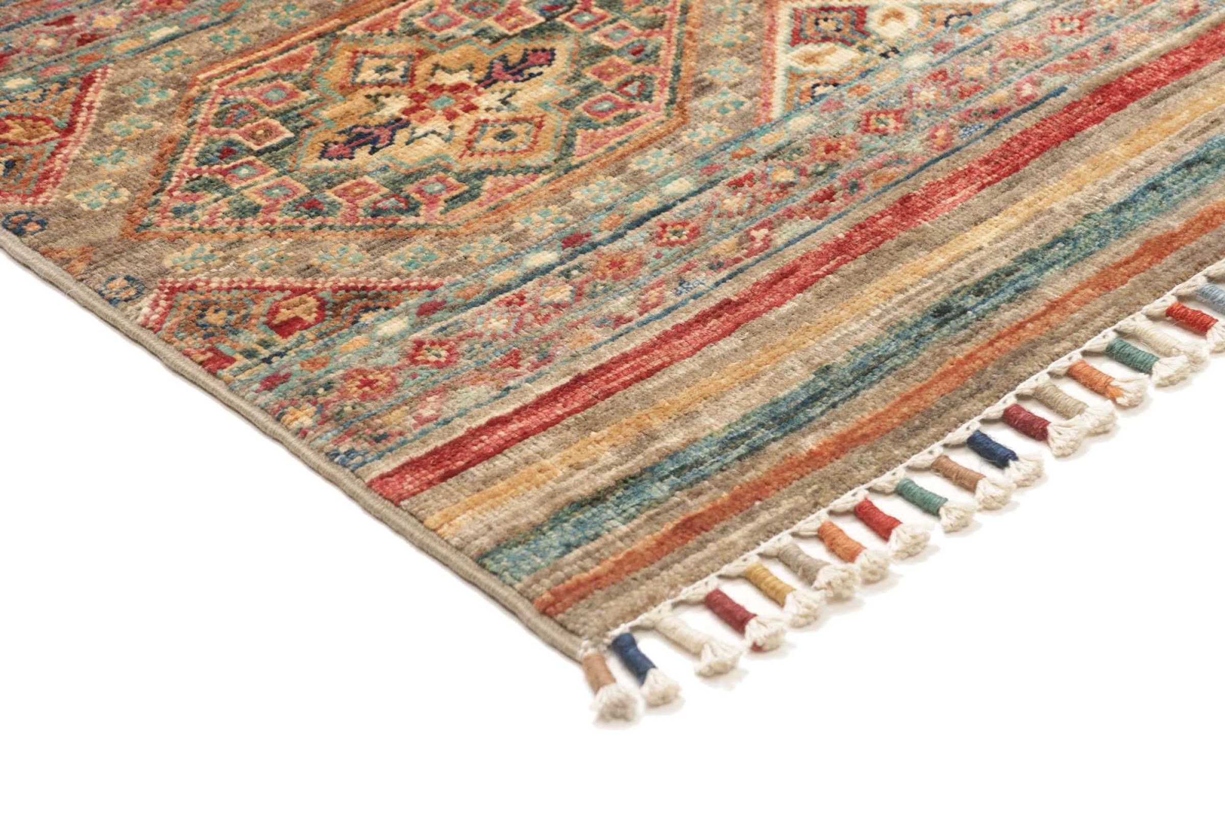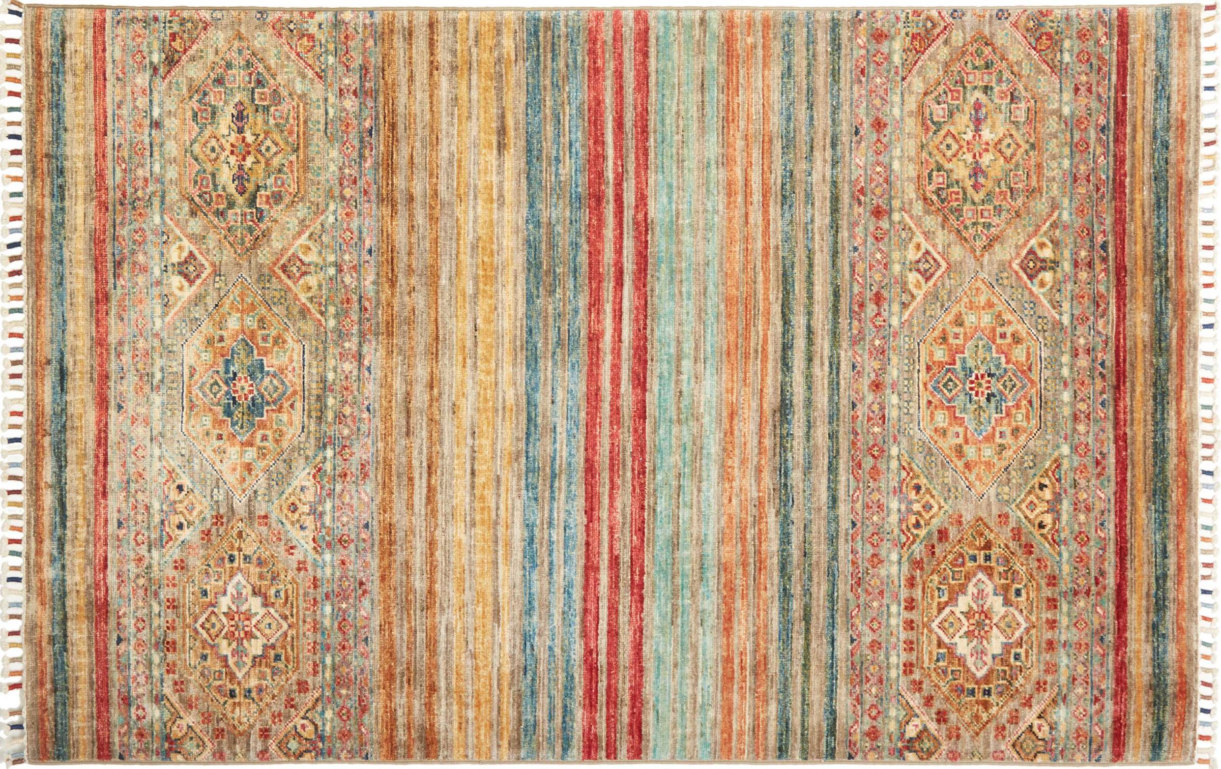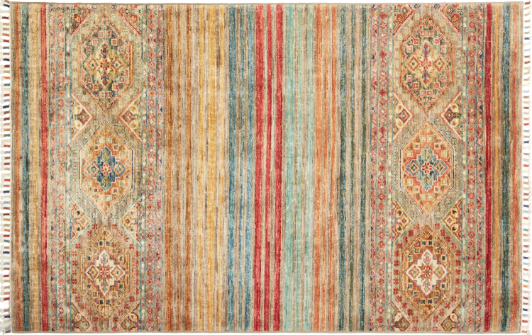 Dette Arijana Shaal-tæppe er fint håndknyttet i Pakistan. Det lover meget høj kvalitet og giver derfor langvarig fornøjelse. Det stribede mønster er varieret og spændende. Det er inspireret af det velkendte Moharamati-design. Enhver, der synes, at monokrome tæpper er for kedelige, vil helt sikkert blive imponeret af dette Arijana Shaal.
