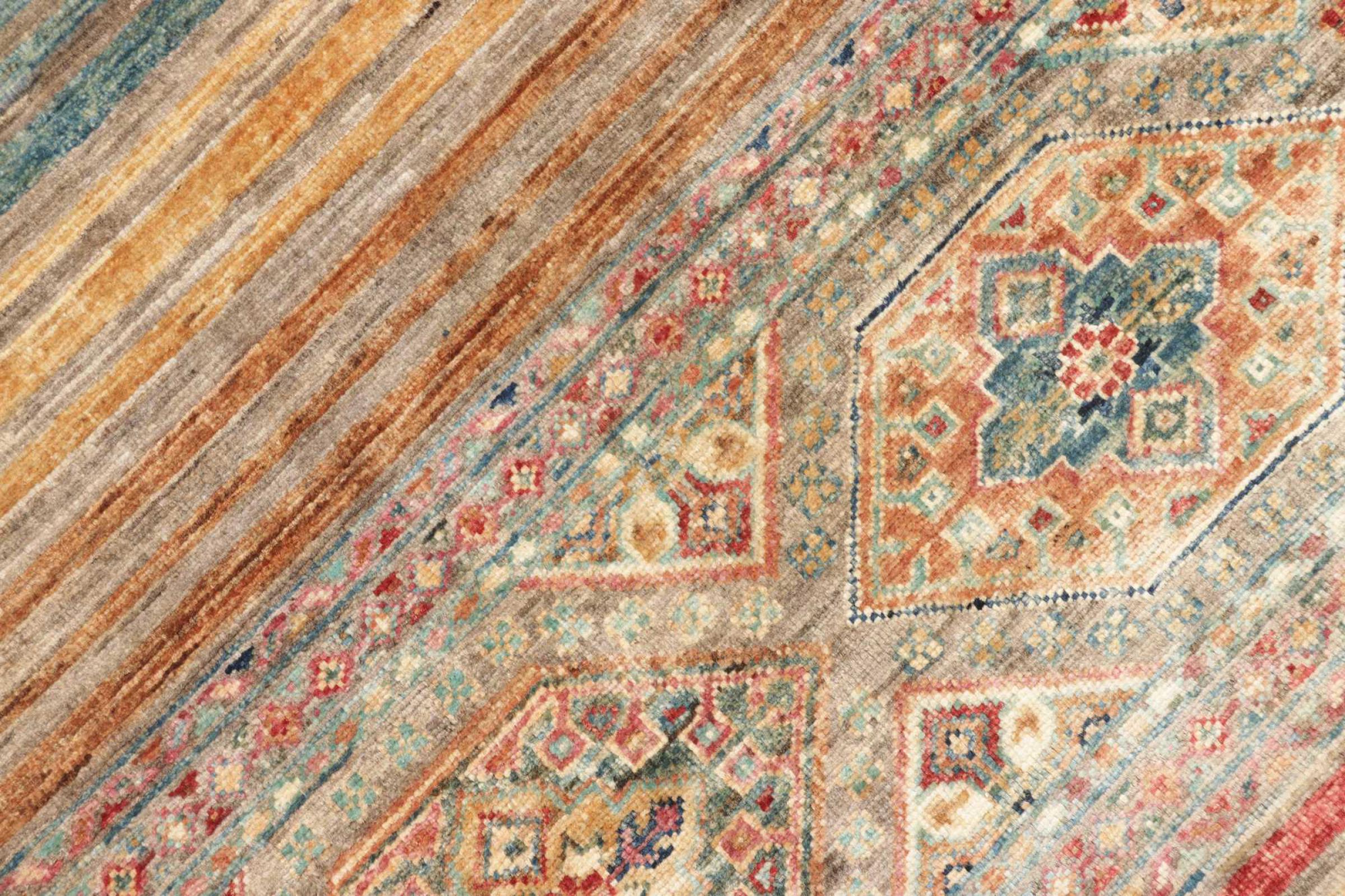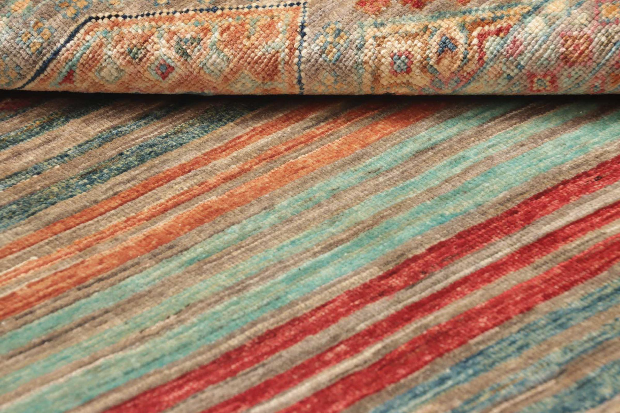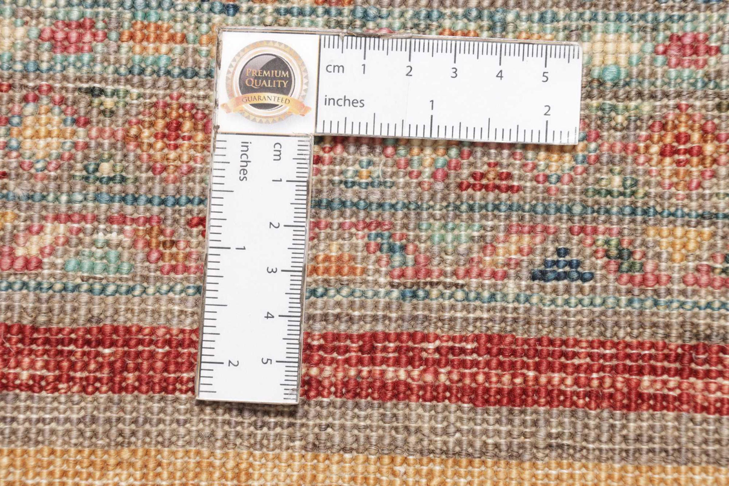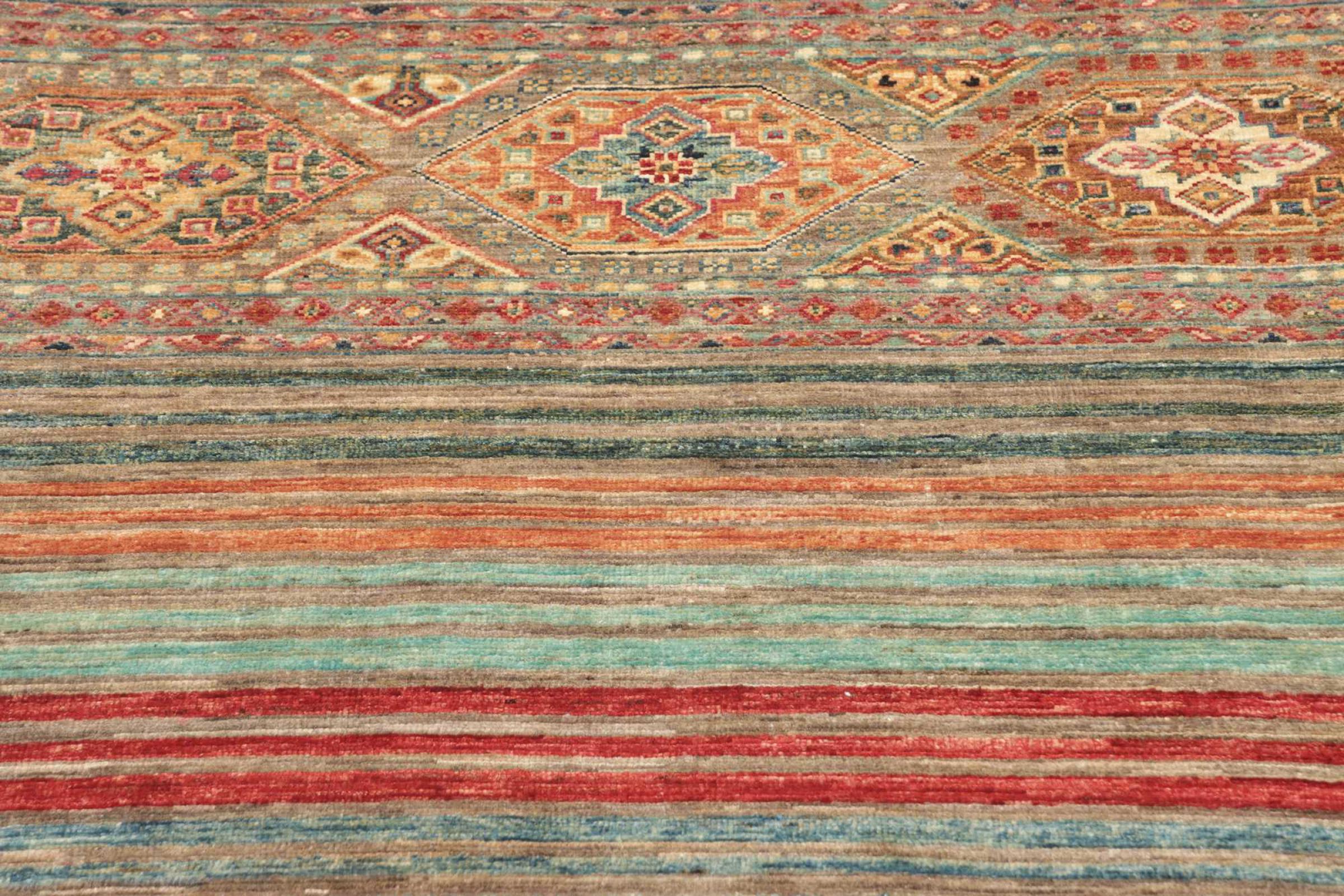 Dette Arijana Shaal-tæppe er fint håndknyttet i Pakistan. Det lover meget høj kvalitet og giver derfor langvarig fornøjelse. Det stribede mønster er varieret og spændende. Det er inspireret af det velkendte Moharamati-design. Enhver, der synes, at monokrome tæpper er for kedelige, vil helt sikkert blive imponeret af dette Arijana Shaal.