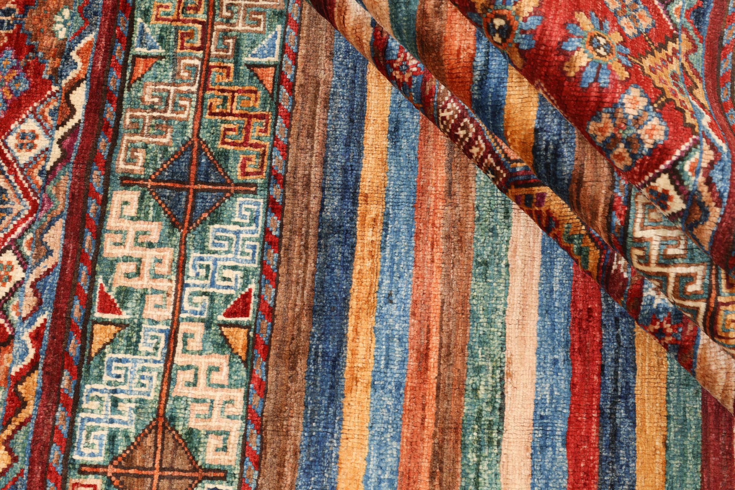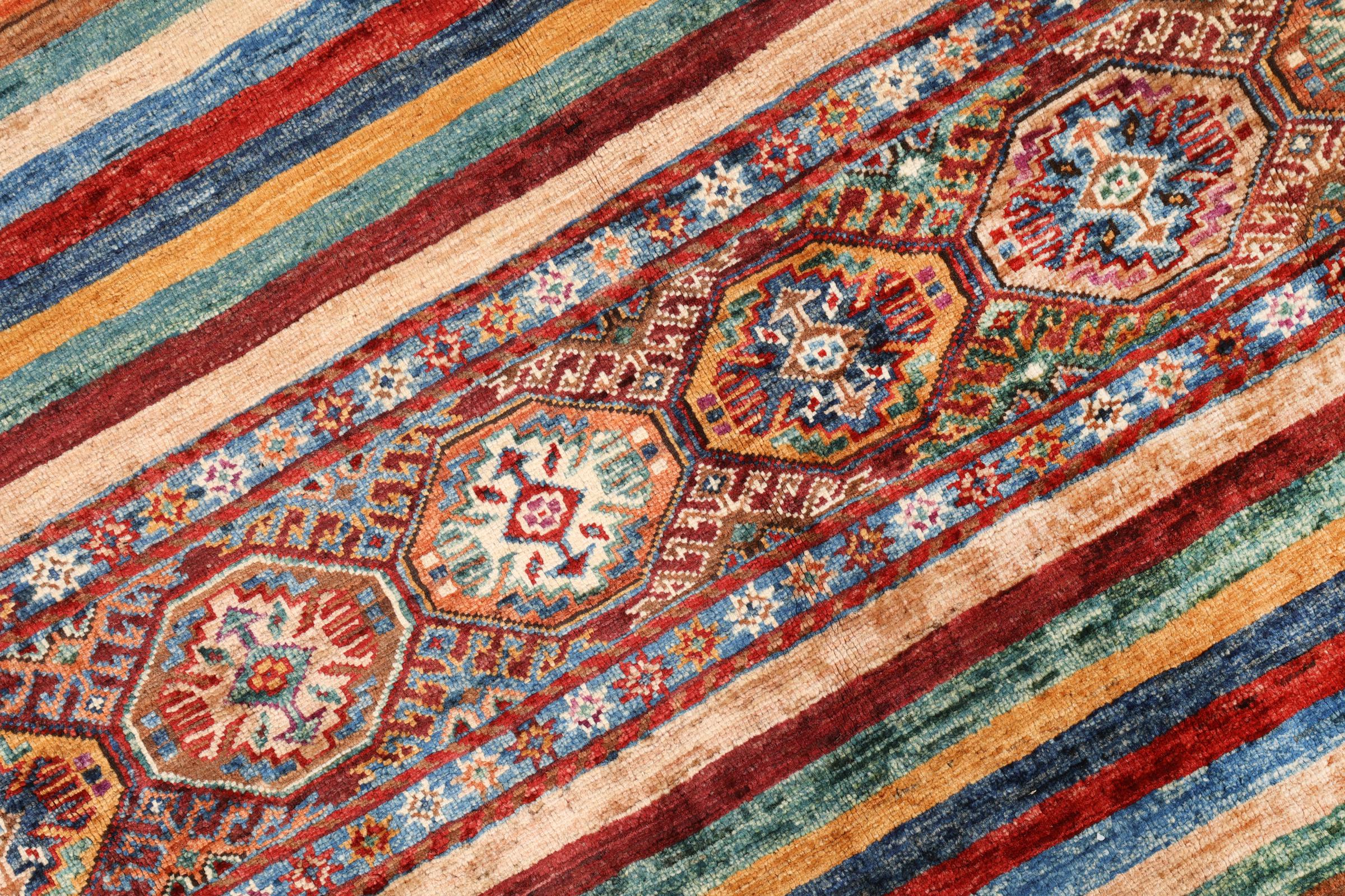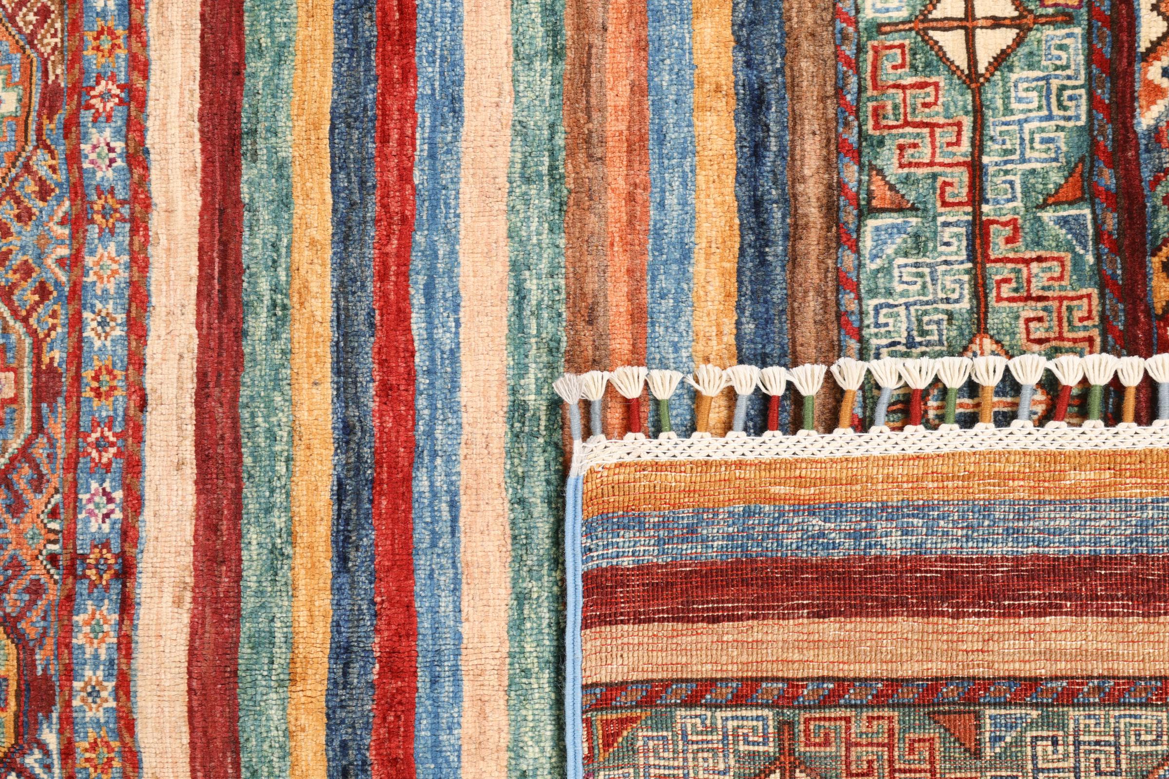 Dette Arijana Shaal-tæppe er fint håndknyttet i Pakistan. Det lover meget høj kvalitet og giver derfor langvarig fornøjelse. Det stribede mønster er varieret og spændende. Det er inspireret af det velkendte Moharamati-design. Enhver, der synes, at monokrome tæpper er for kedelige, vil helt sikkert blive imponeret af dette Arijana Shaal.