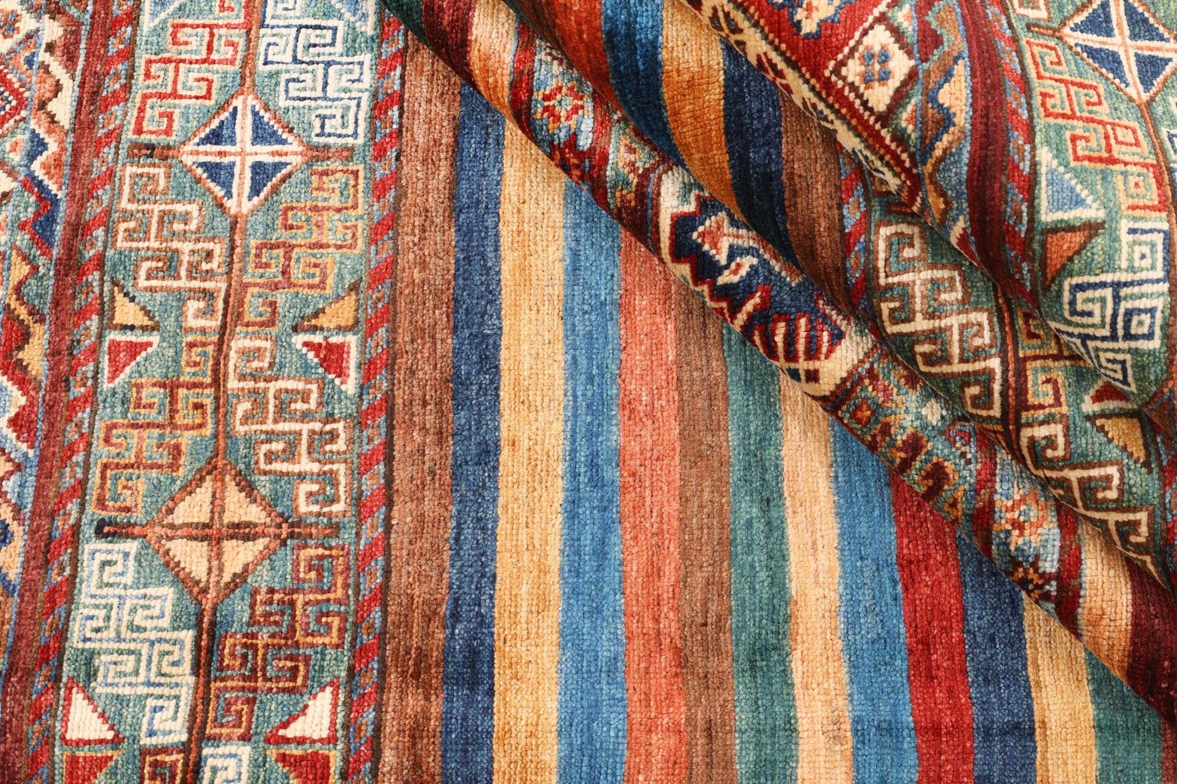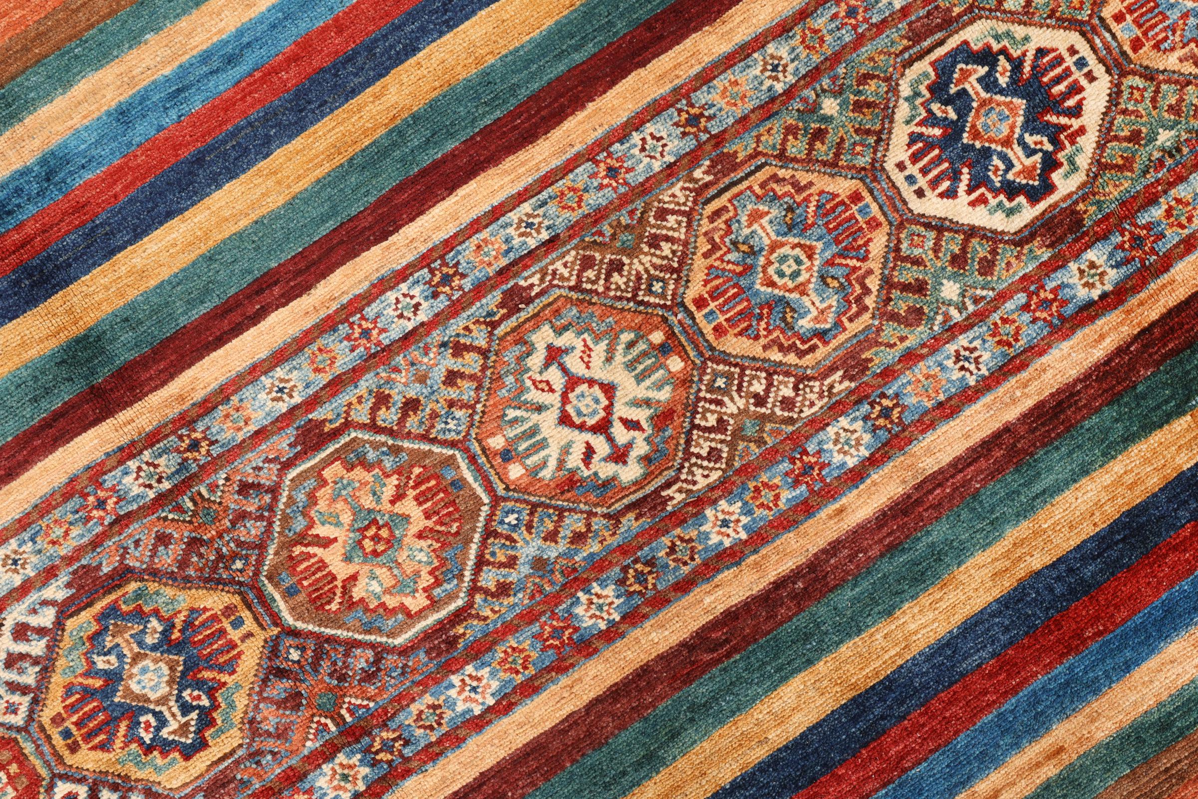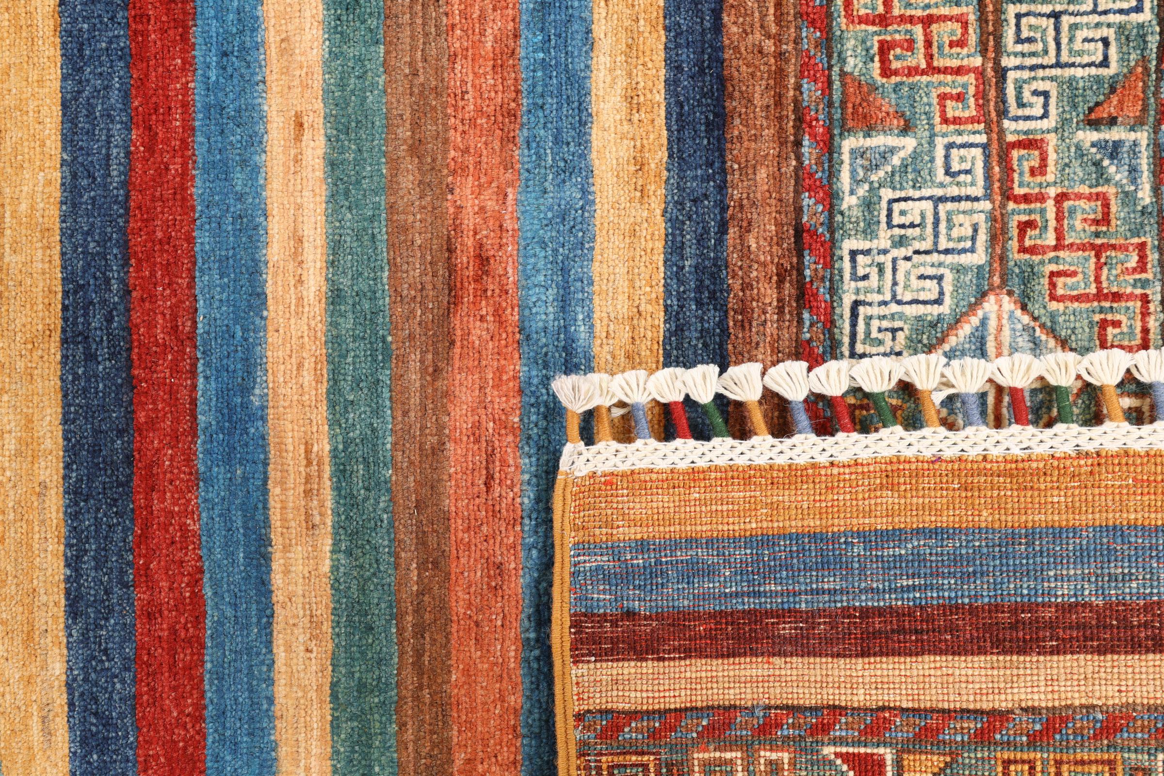Dette Arijana Shaal-tæppe er fint håndknyttet i Pakistan. Det lover meget høj kvalitet og giver derfor langvarig fornøjelse. Det stribede mønster er varieret og spændende. Det er inspireret af det velkendte Moharamati-design. Enhver, der synes, at monokrome tæpper er for kedelige, vil helt sikkert blive imponeret af dette Arijana Shaal.