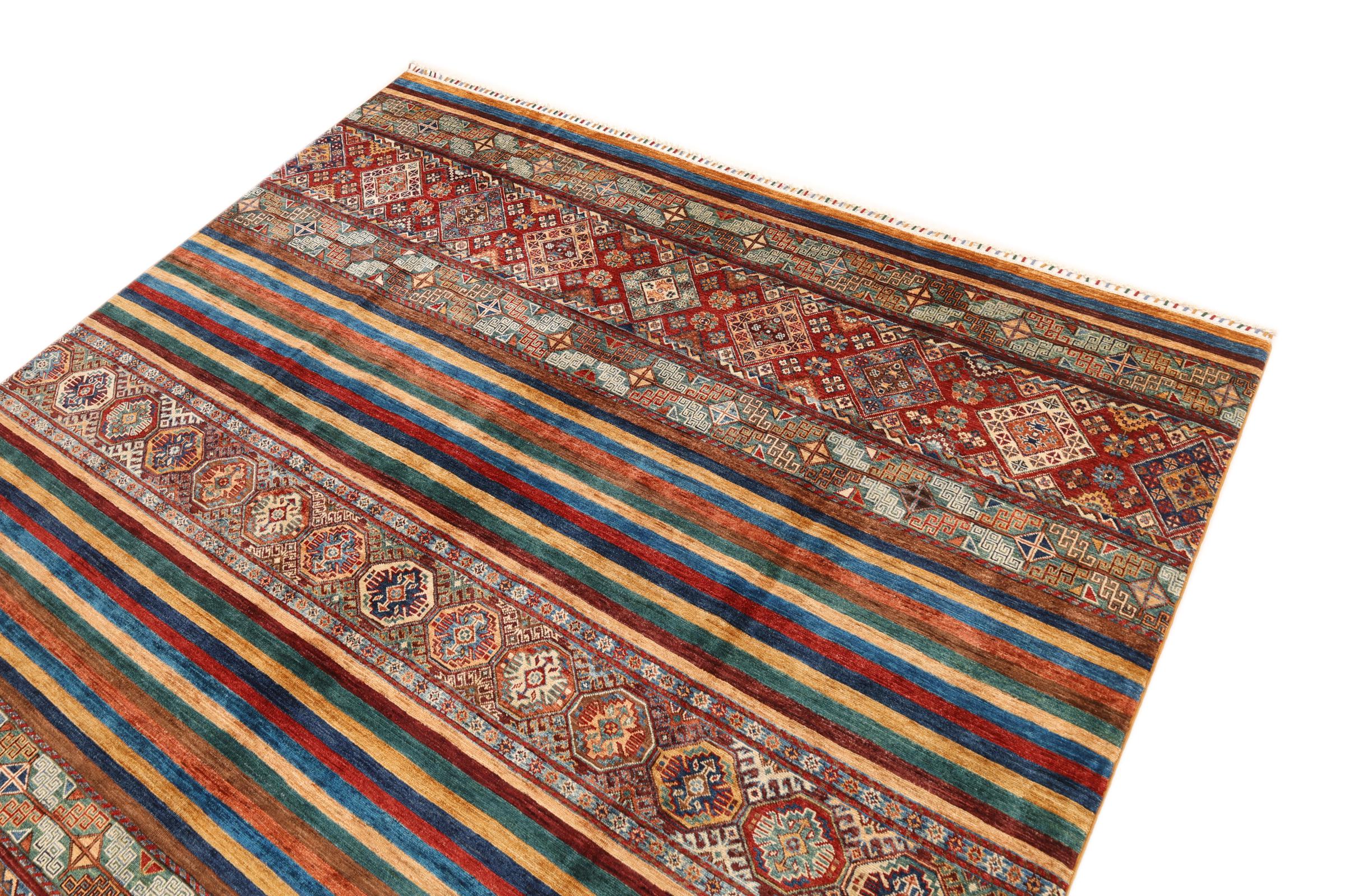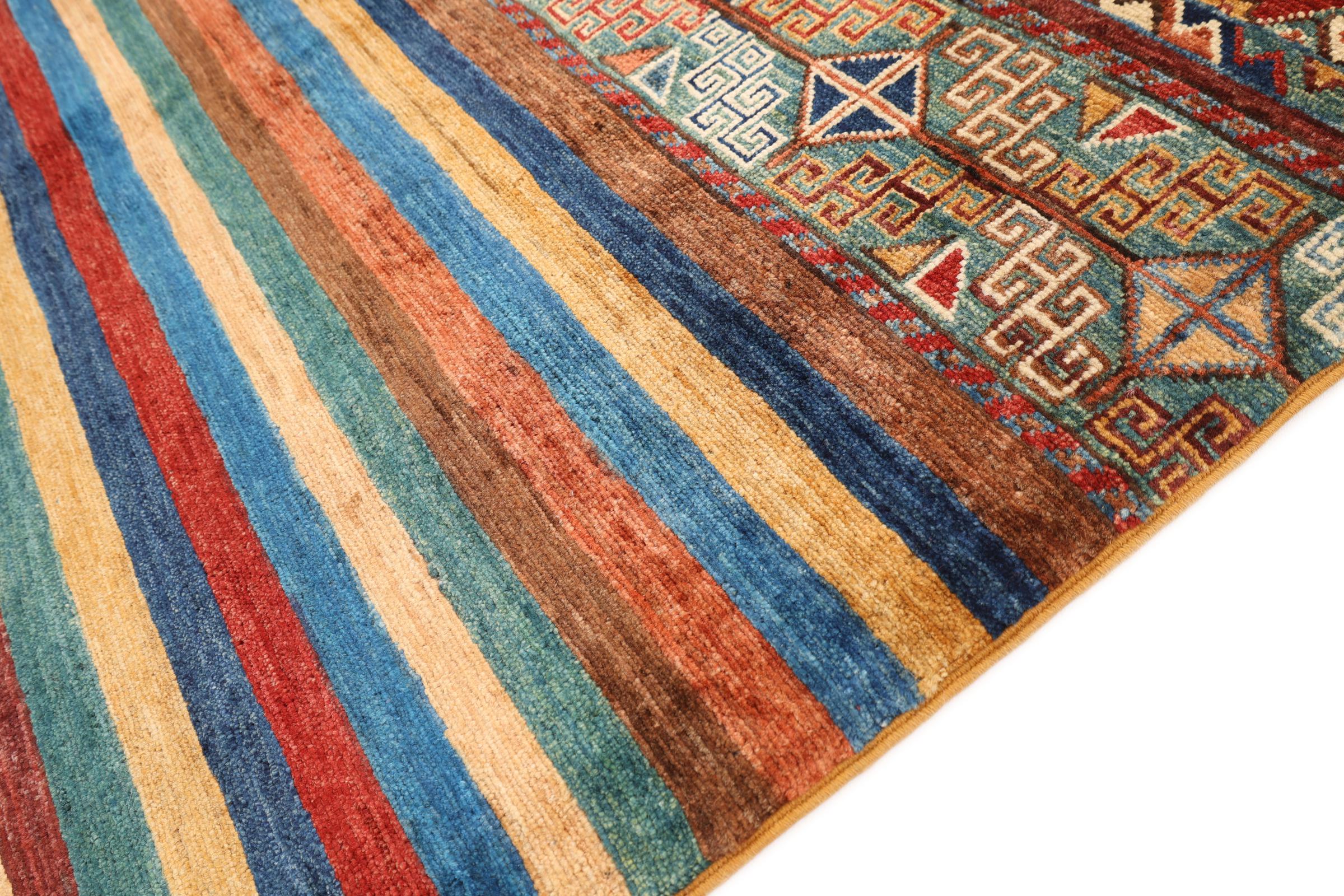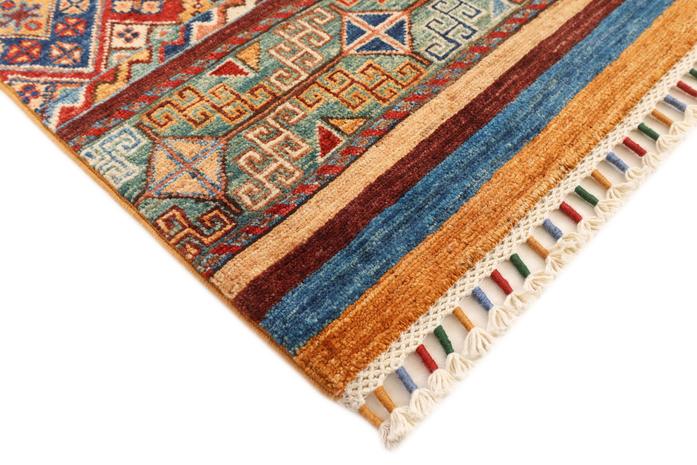 Dette Arijana Shaal-tæppe er fint håndknyttet i Pakistan. Det lover meget høj kvalitet og giver derfor langvarig fornøjelse. Det stribede mønster er varieret og spændende. Det er inspireret af det velkendte Moharamati-design. Enhver, der synes, at monokrome tæpper er for kedelige, vil helt sikkert blive imponeret af dette Arijana Shaal.