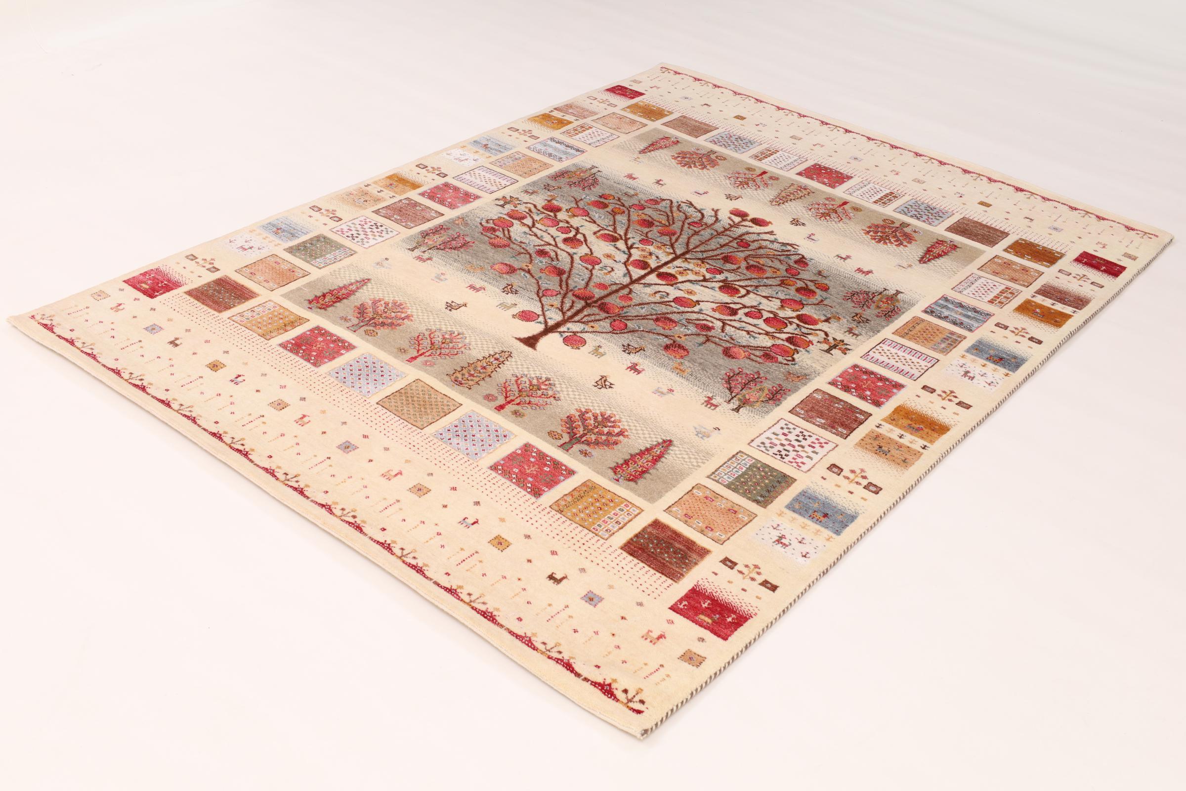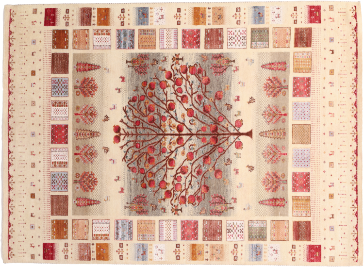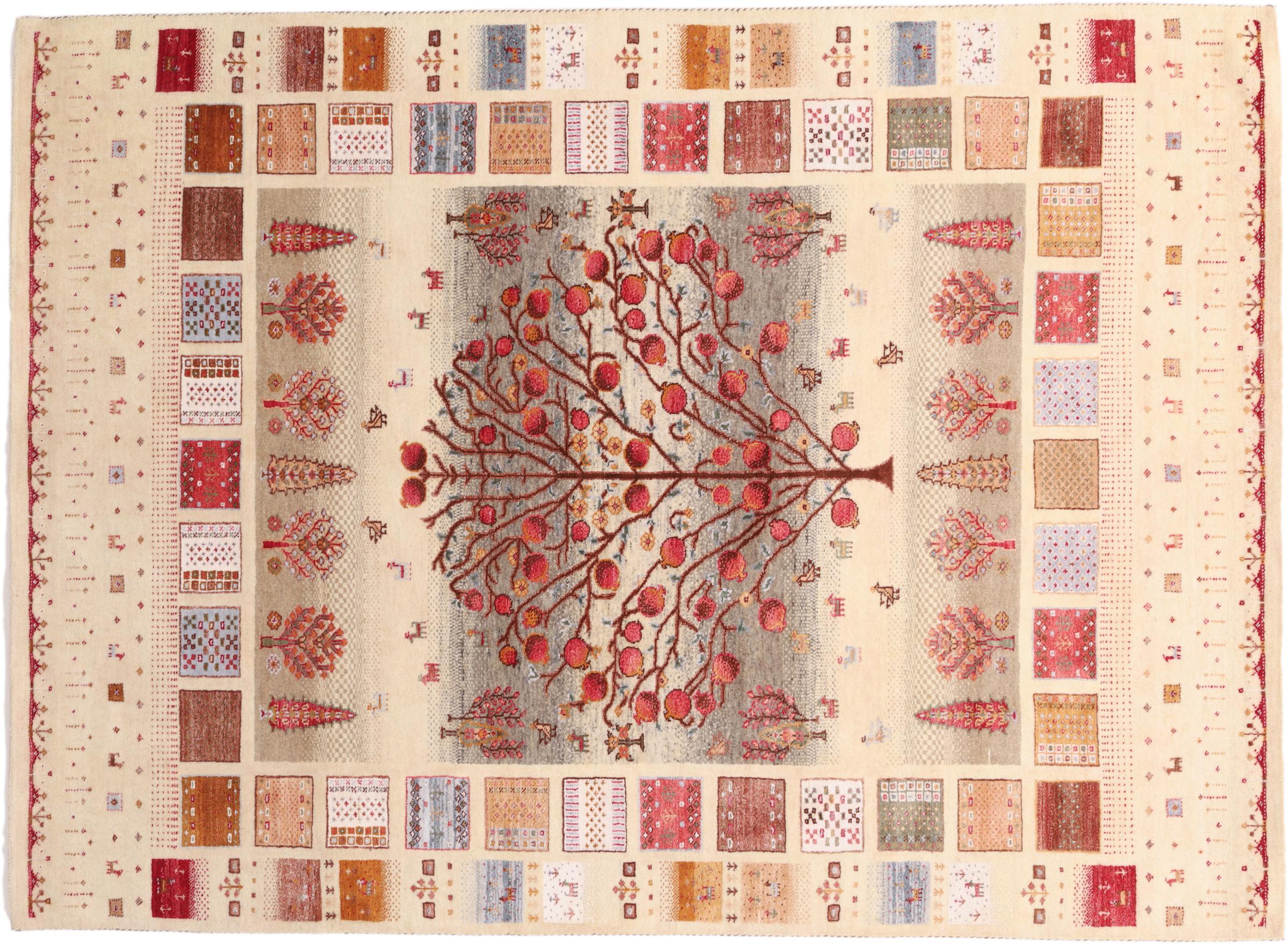 Dette smukke Gabbeh-tæppe blev håndknyttet i Indien. Indiske Gabbeh-tæpper er lavet af blød fåruld, er behagelige på fødderne og har varmeisolerende egenskaber. De fleste af deres design er enkle og tidløst moderne. De blev inspireret af nomadiske folk, der lader meget enkle motiver fra deres omgivelser passere ind i tæpperne. Indiske Gabbeh-tæpper matcher ikke helt kvaliteten på en persisk Gabbeh, men de har et meget godt pris-ydelsesforhold. Dette gør dem ideelle som et håndknyttet tæppe på indgangsniveau.
