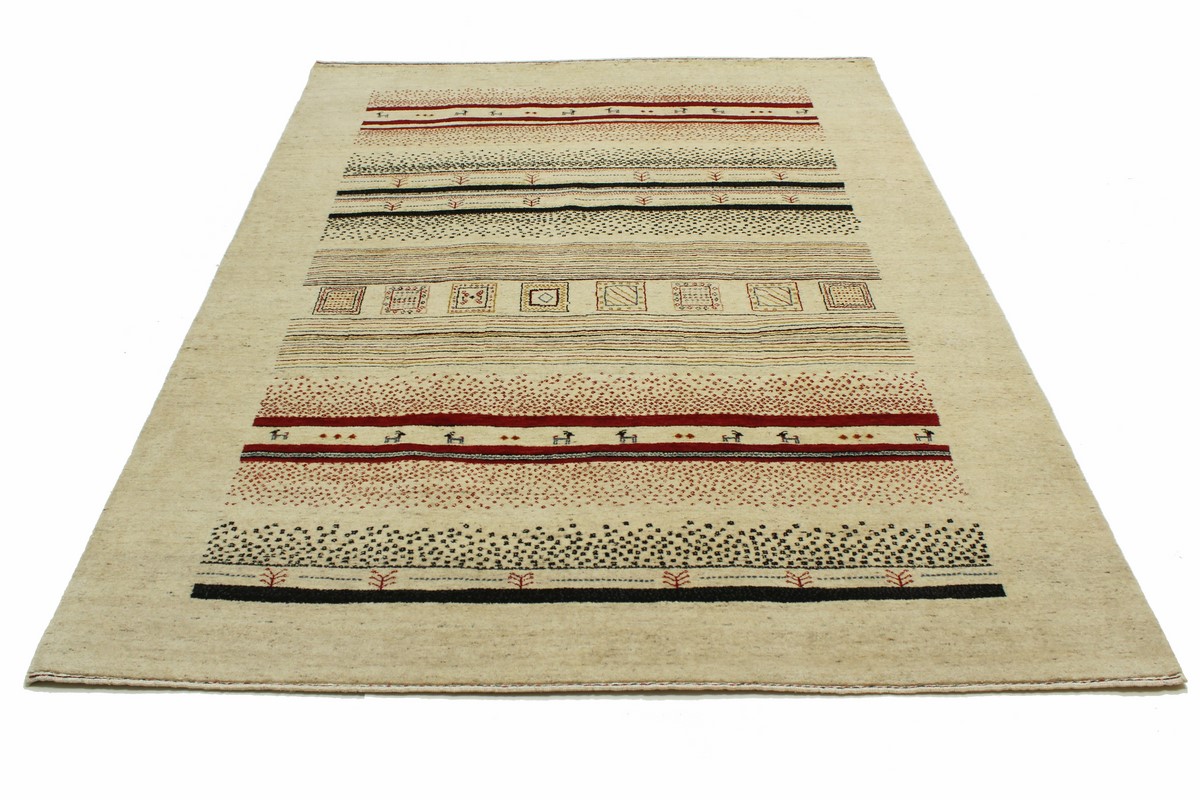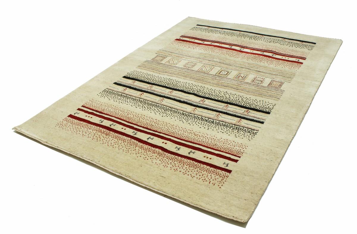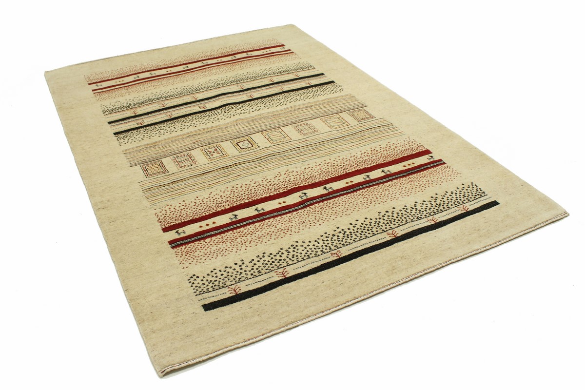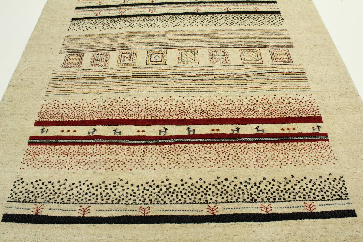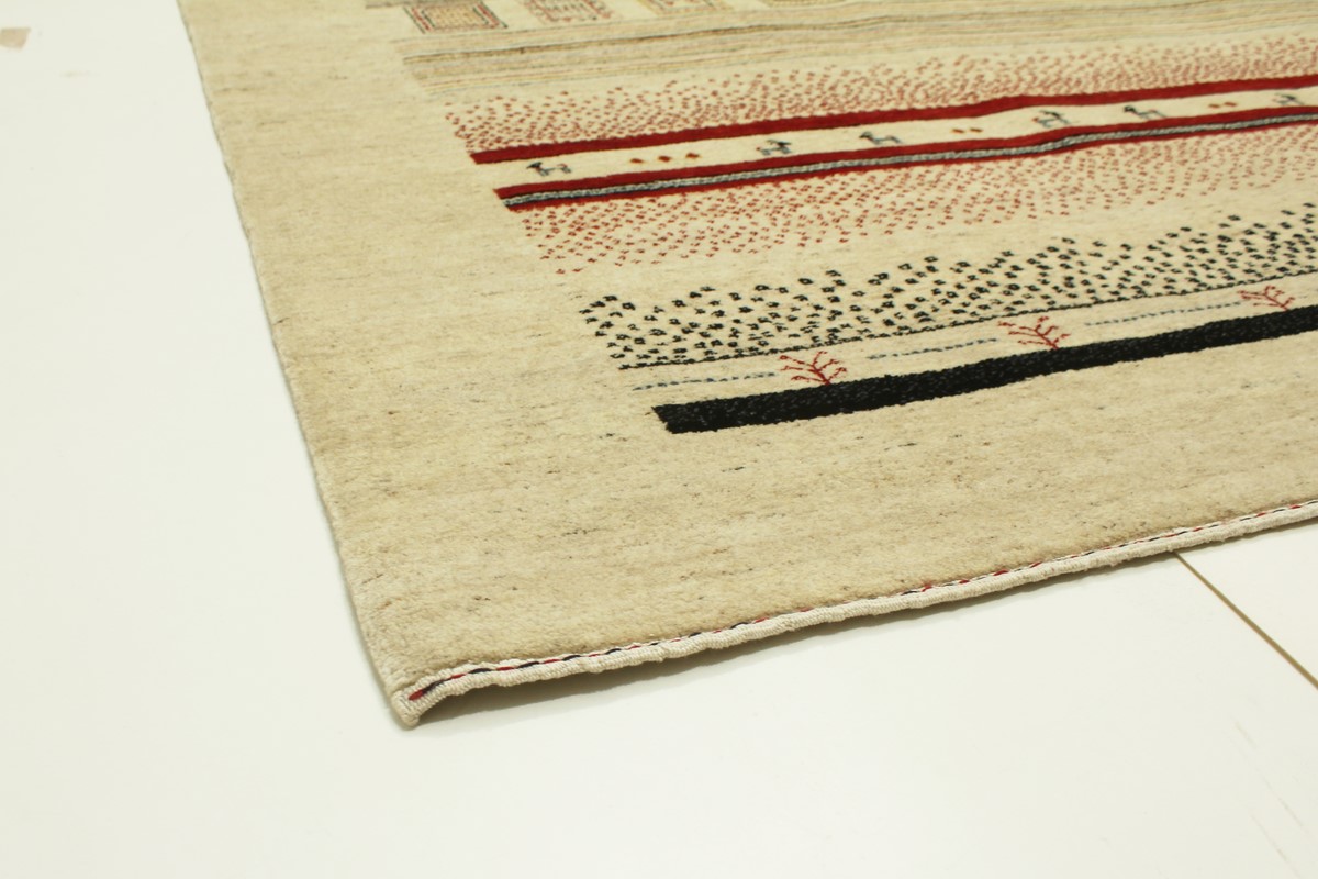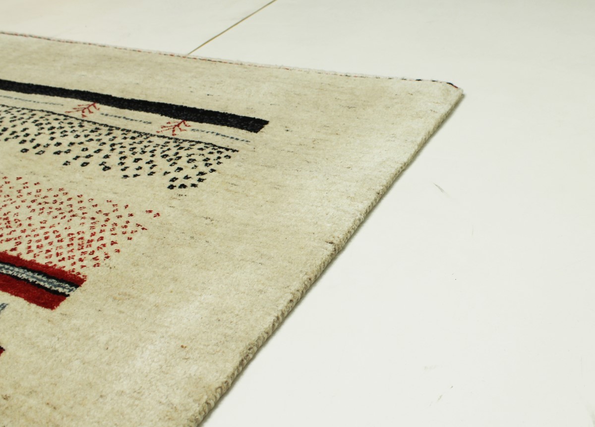Dette smukke Gabbeh-tæppe blev håndknyttet i Indien. Indiske Gabbeh-tæpper er lavet af blød fåruld, er behagelige på fødderne og har varmeisolerende egenskaber. De fleste af deres design er enkle og tidløst moderne. De blev inspireret af nomadiske folk, der lader meget enkle motiver fra deres omgivelser passere ind i tæpperne. Indiske Gabbeh-tæpper matcher ikke helt kvaliteten på en persisk Gabbeh, men de har et meget godt pris-ydelsesforhold. Dette gør dem ideelle som et håndknyttet tæppe på indgangsniveau.