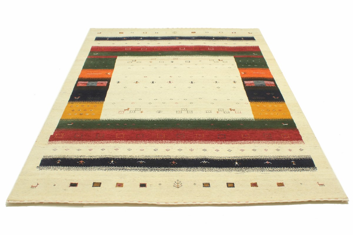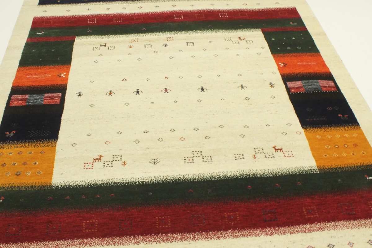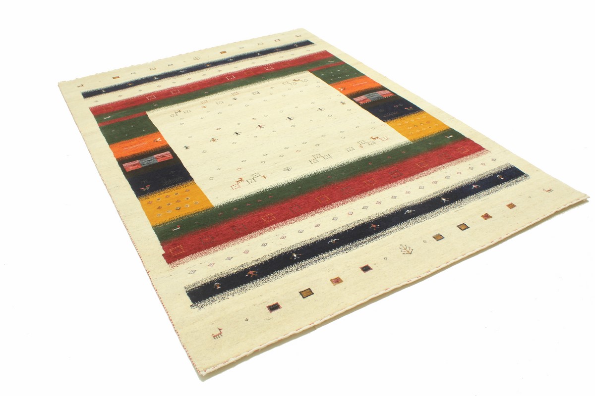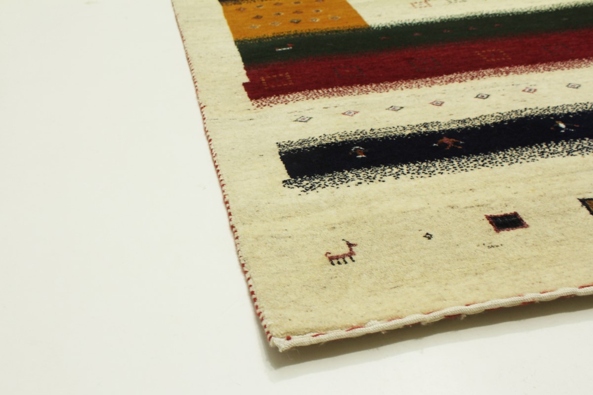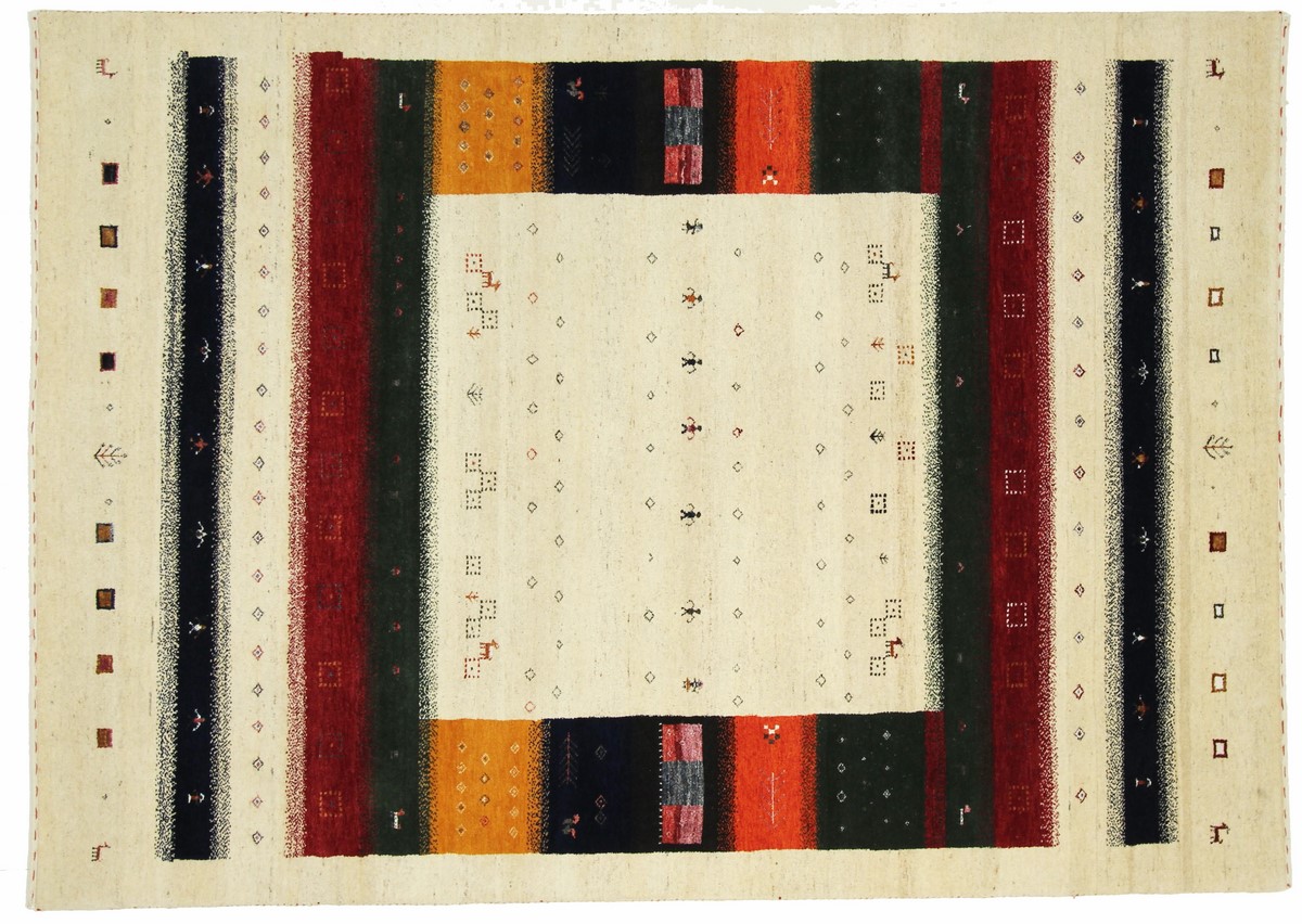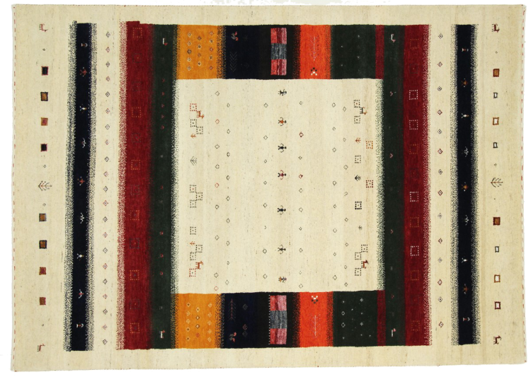 Dette smukke Gabbeh-tæppe blev håndknyttet i Indien. Indiske Gabbeh-tæpper er lavet af blød fåruld, er behagelige på fødderne og har varmeisolerende egenskaber. De fleste af deres design er enkle og tidløst moderne. De blev inspireret af nomadiske folk, der lader meget enkle motiver fra deres omgivelser passere ind i tæpperne. Indiske Gabbeh-tæpper matcher ikke helt kvaliteten på en persisk Gabbeh, men de har et meget godt pris-ydelsesforhold. Dette gør dem ideelle som et håndknyttet tæppe på indgangsniveau.