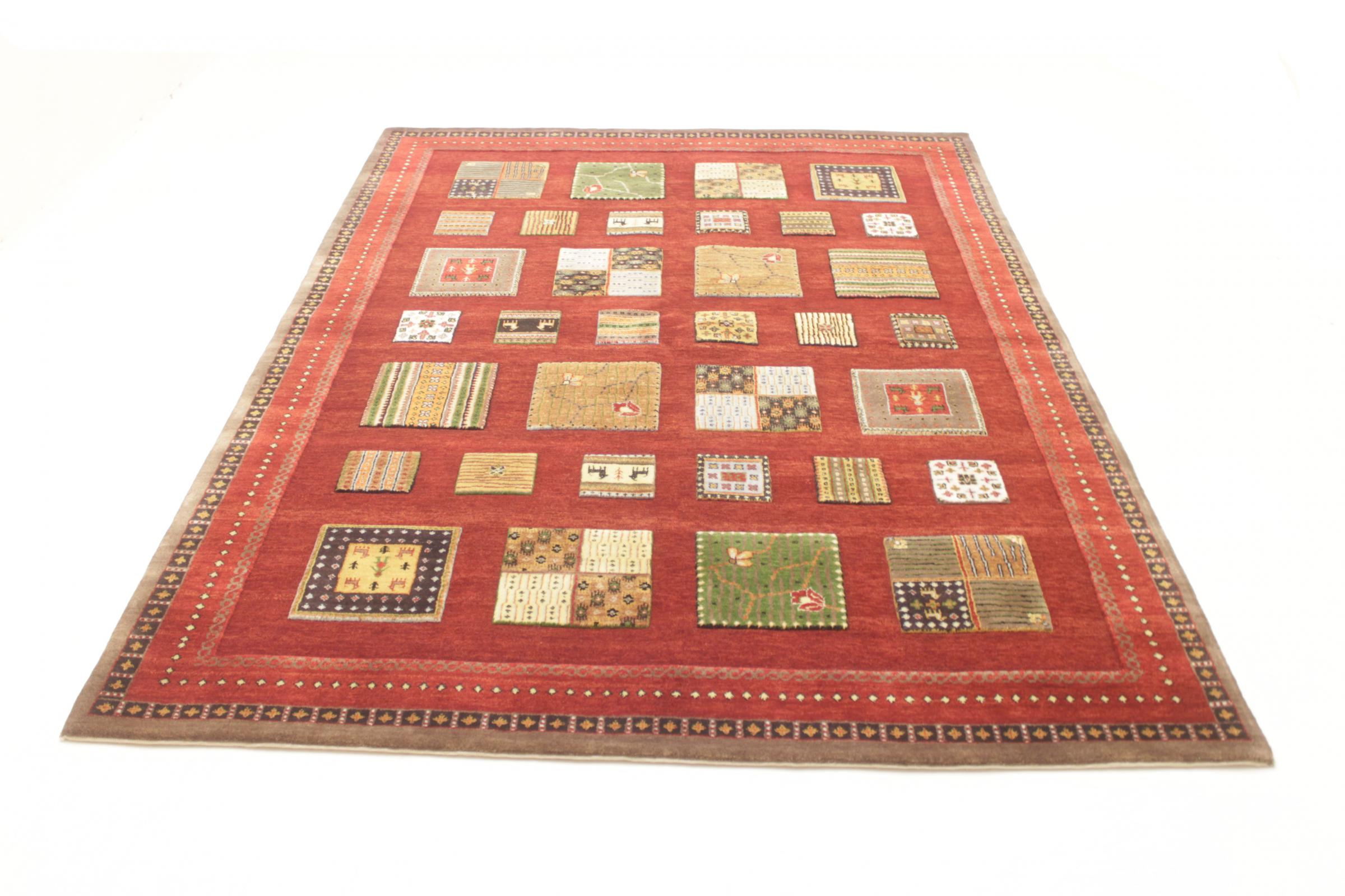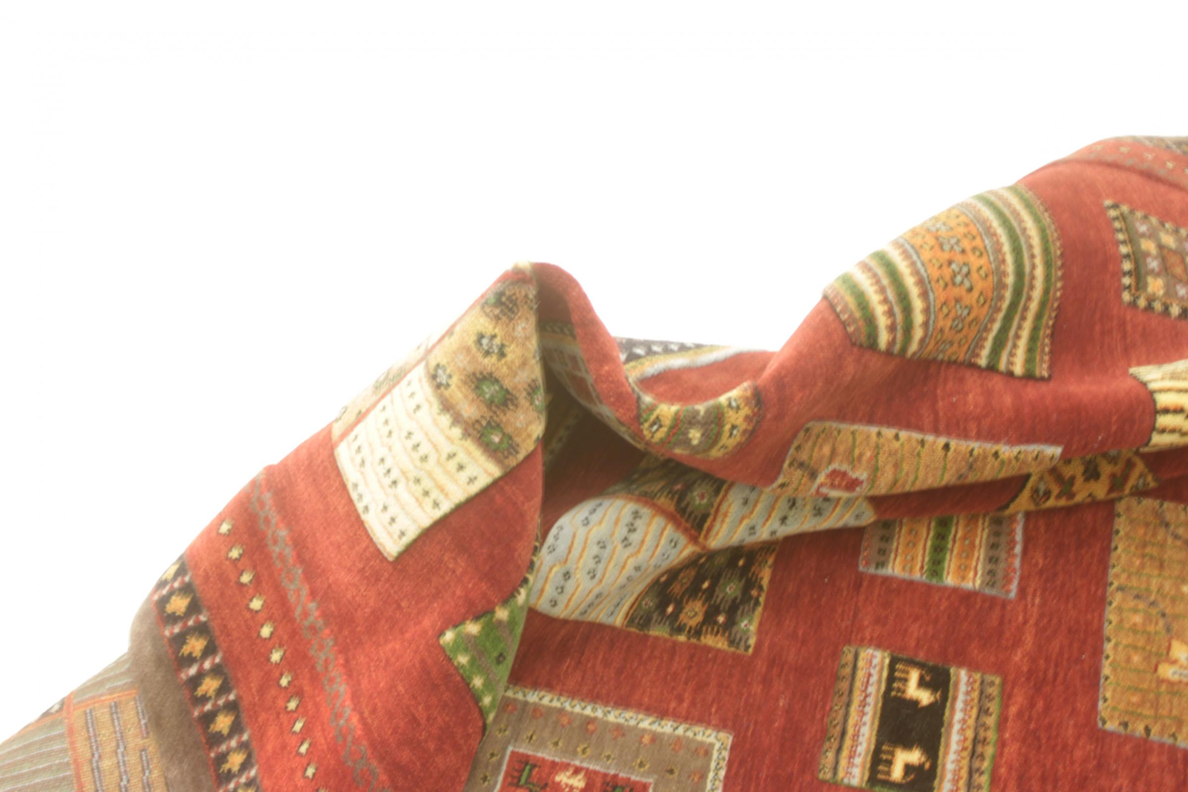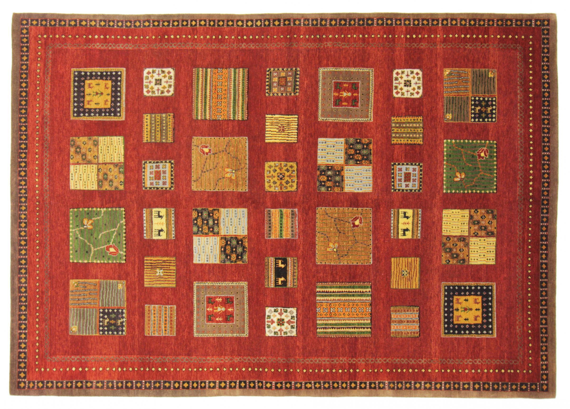 Dette smukke Gabbeh-tæppe blev håndknyttet i Indien. Indiske Gabbeh-tæpper er lavet af blød fåruld, er behagelige på fødderne og har varmeisolerende egenskaber. De fleste af deres design er enkle og tidløst moderne. De blev inspireret af nomadiske folk, der lader meget enkle motiver fra deres omgivelser passere ind i tæpperne. Indiske Gabbeh-tæpper matcher ikke helt kvaliteten på en persisk Gabbeh, men de har et meget godt pris-ydelsesforhold. Dette gør dem ideelle som et håndknyttet tæppe på indgangsniveau.