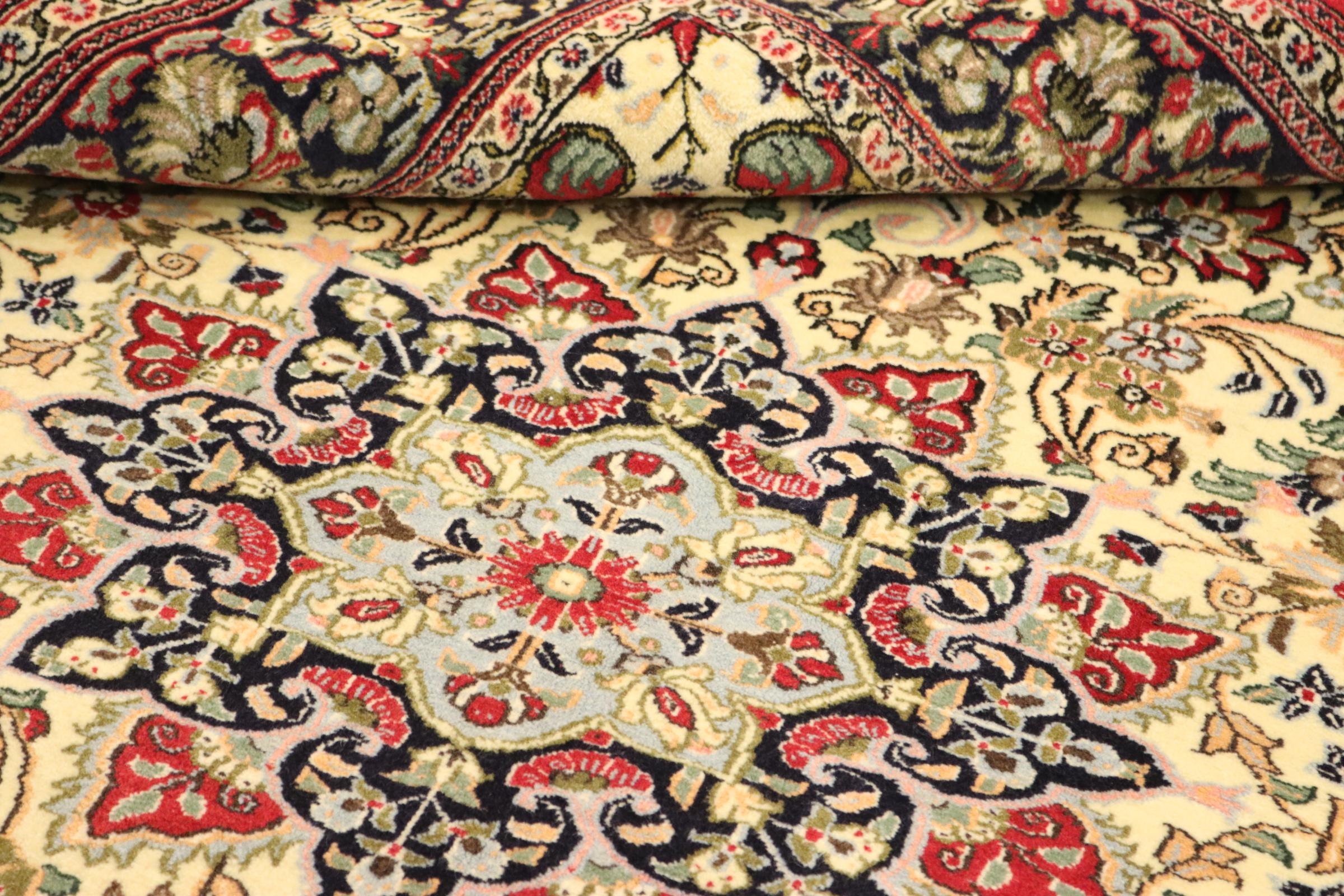 Denne Ghom-kork er ægte håndværkskunst. Dens fine ”flor” og kæden overbeviser enhver tæppe eksperte. Denne persisk tæppe blev lavet i den hellige by Ghom af det fineste kork uld. Takket være mønstret og design at hjertet slår hurtigere. Ingen persisk tæppe kan være smukkere.