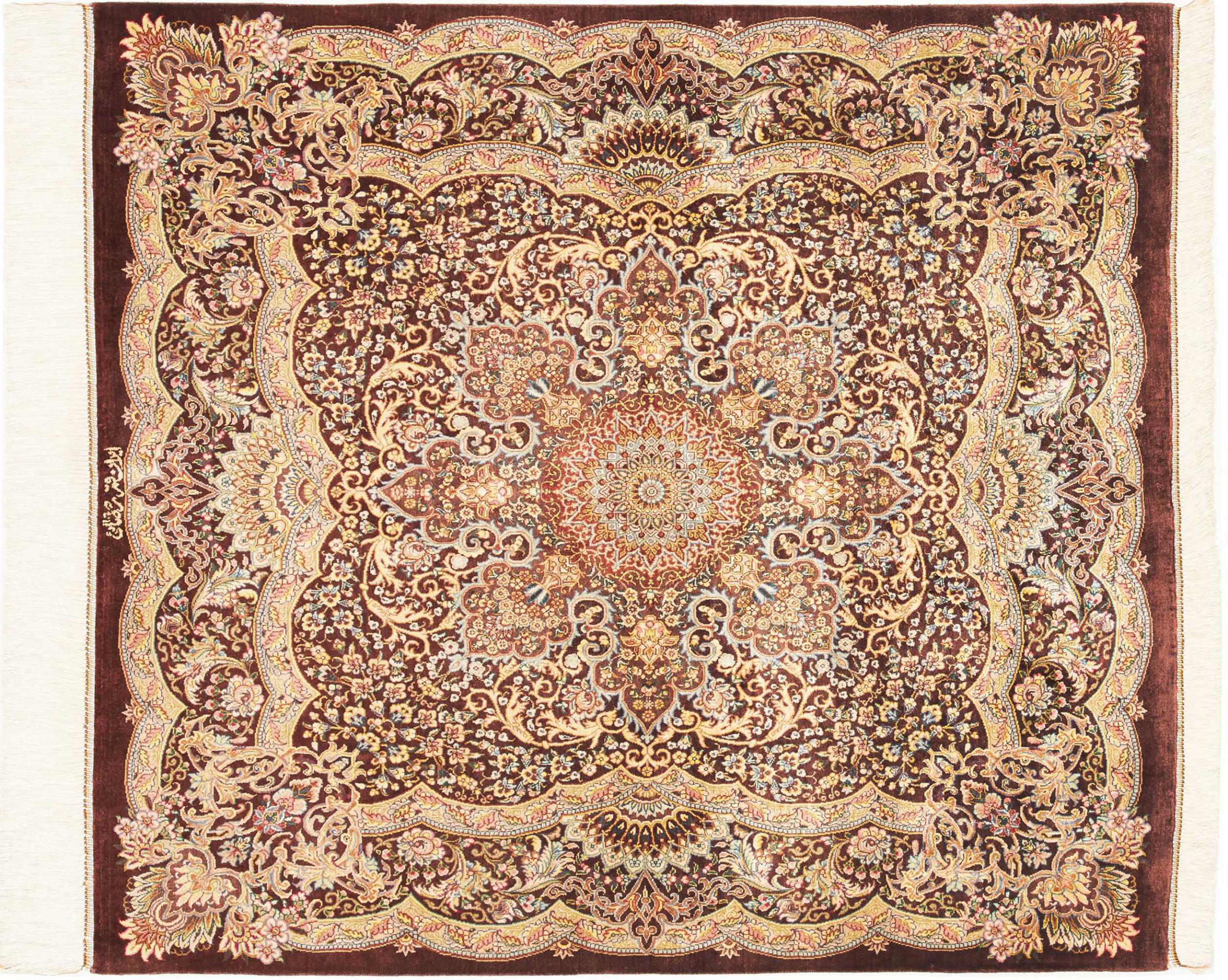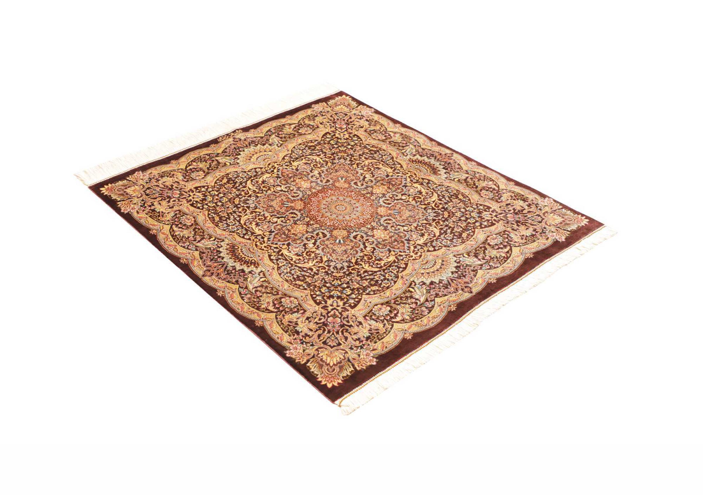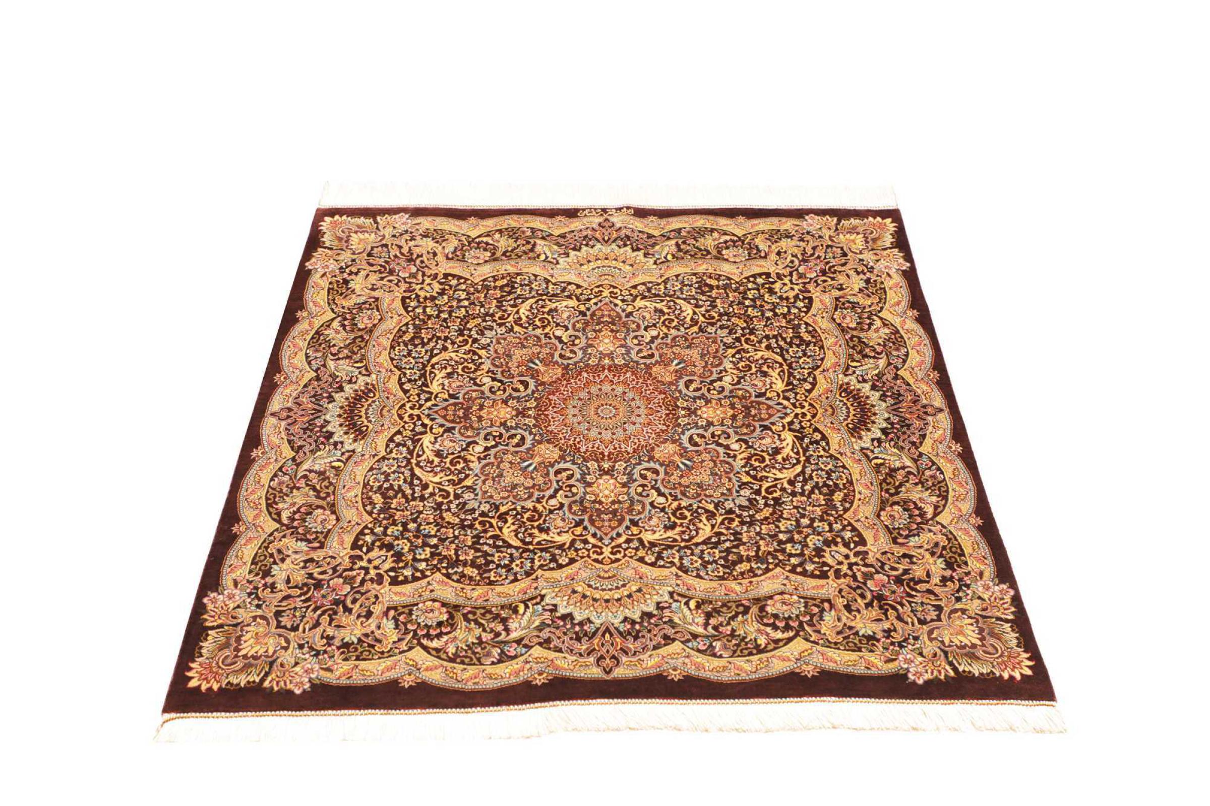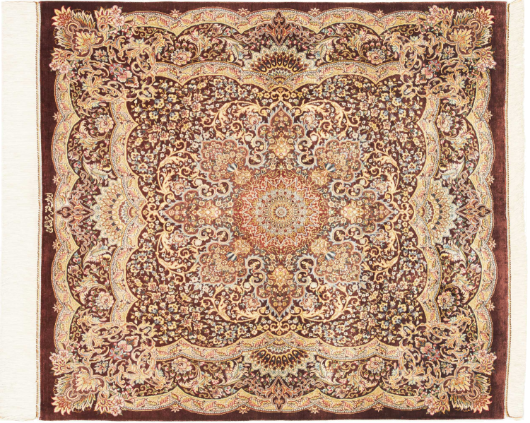 Tæppe-nr.: 252800006953323 Størrelse: 109x97 cm Tykkelse: ca. 3 mm Knuder: 1 000 000 / m² Forarbejdelse: Knyttet i hånden Luv: Silke Kæde: Silke Oprindelse: Persien / Iran Alder: Ny Vægt: ca. 2 kg Antal på lager: Unik - Kun 1 tilbage på lager