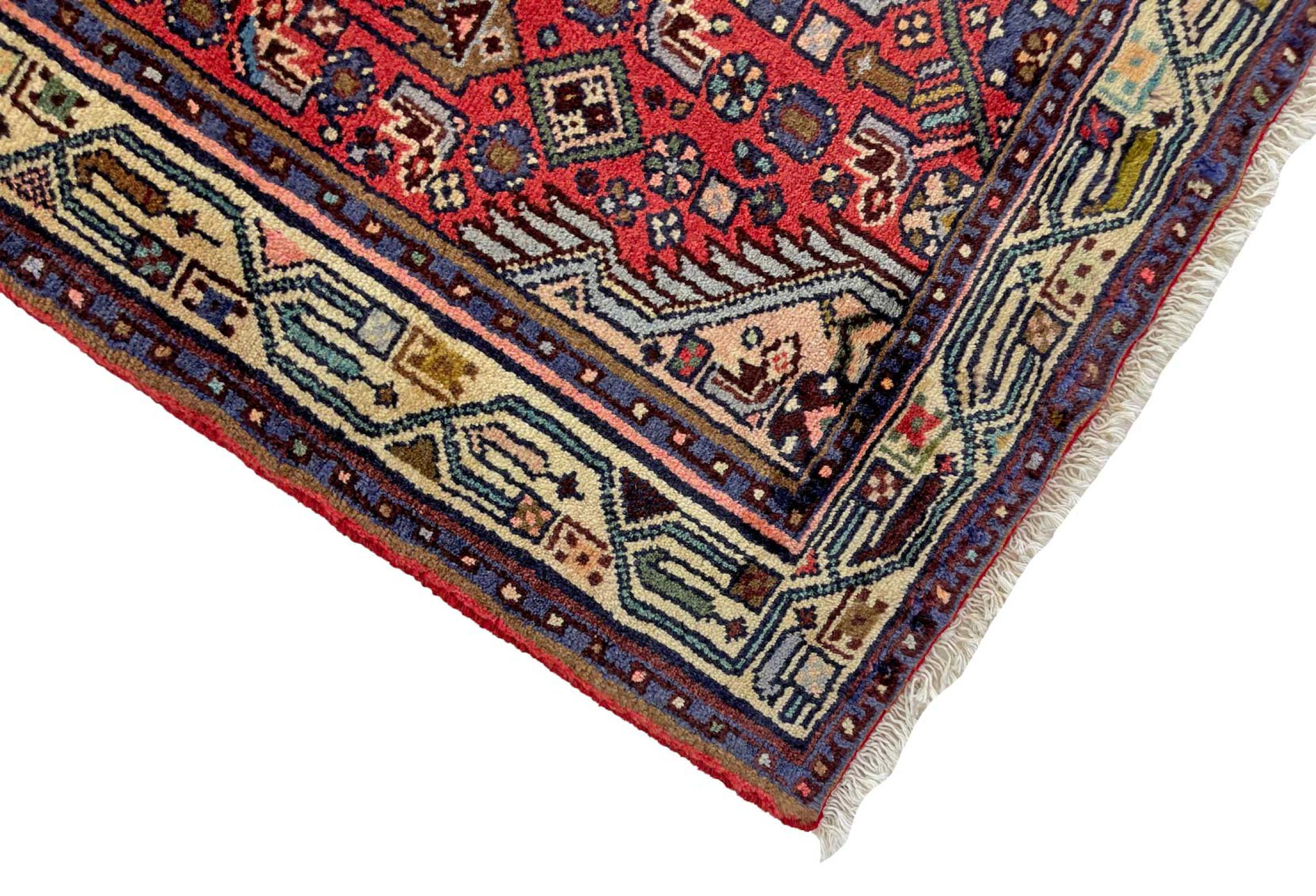 Dette Hamadan-tæppe er ikke efterspurgt i nye indretningskoncepter for ingenting. Det kombinerer en uovertruffen pris med exceptionel kvalitet. På grund af de stærke garner, der bruges i produktionen af Hamadan-tæpper, er dette persiske tæppe særligt holdbart. Det er håndknyttet i byen Hamadan. De ofte geometriske mønstre og ornamenter er tidløse og derfor ekstremt populære i skandinavisk interiør. De dristige farver bringer hygge og varme til dit rum.