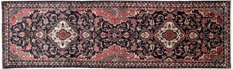 Tæppe-nr.: 111142005296562 Størrelse: 301x86 cm Tykkelse: ca. 8 mm Knuder: 160 000 - 200 000 / m² Forarbejdelse: Knyttet i hånden Luv: Håndspunden uld Kæde: Bomuld Oprindelse: Persien / Iran Alder: Ny Vægt: ca. 9 kg Også kendt som Huseinabad Antal på lager: Unik - Kun 1 tilbage på lager