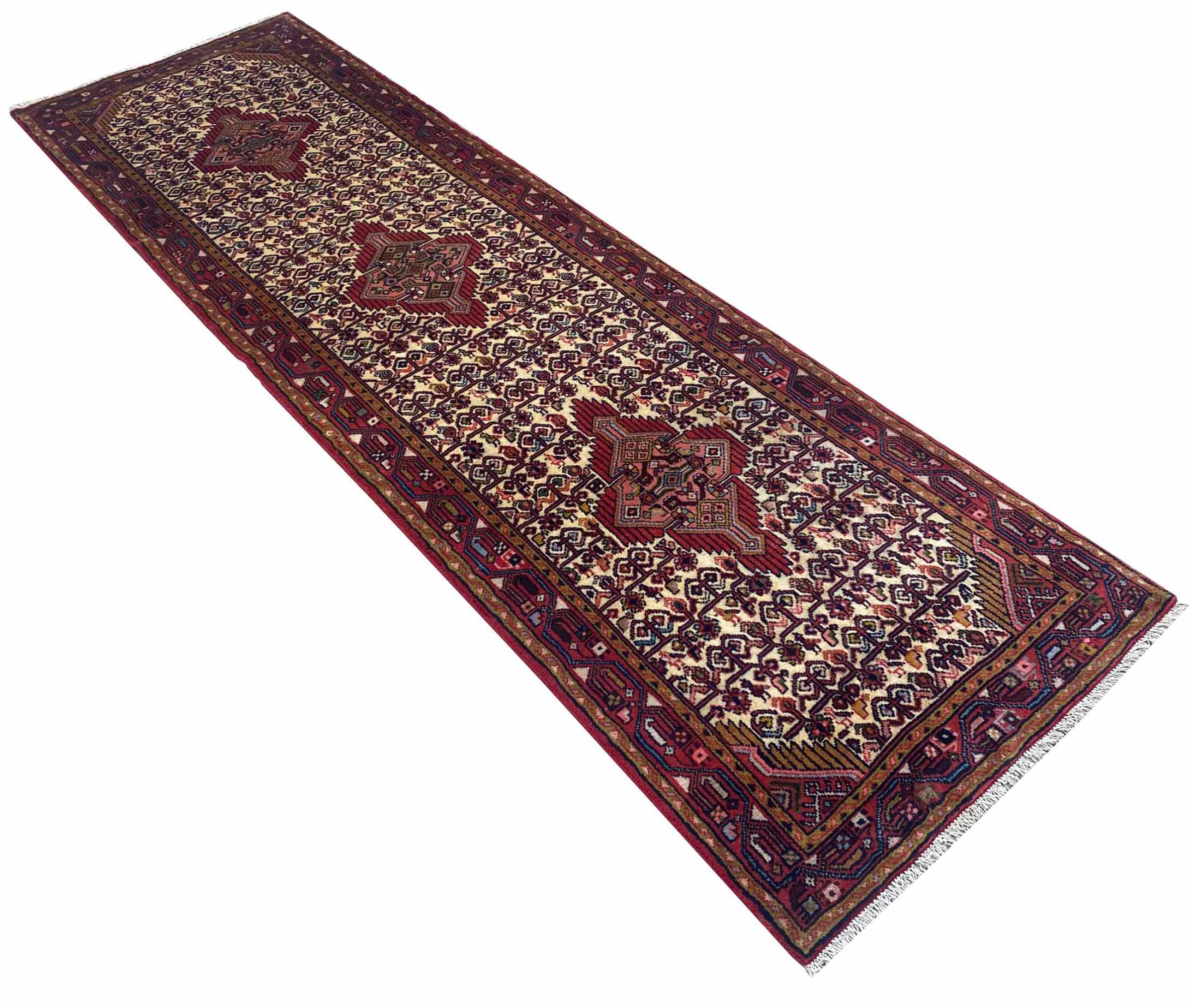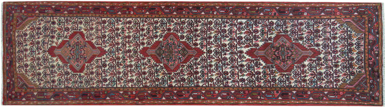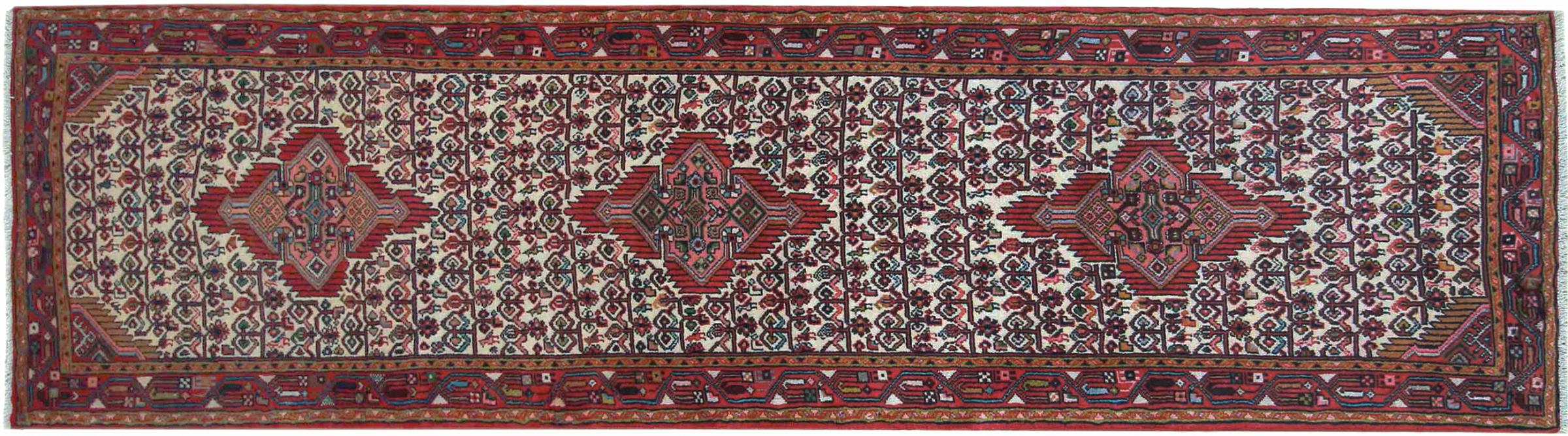 Tæppe-nr.: 302877006031420 Størrelse: 304x86 cm Tykkelse: ca. 8 mm Knuder: 128 000 - 160 000 / m² Forarbejdelse: Knyttet i hånden Luv: Håndspunden uld Kæde: Bomuld Oprindelse: Persien / Iran Alder: Ny Vægt: ca. 9 kg Også kendt som Huseinabad Antal på lager: Unik - Kun 1 tilbage på lager