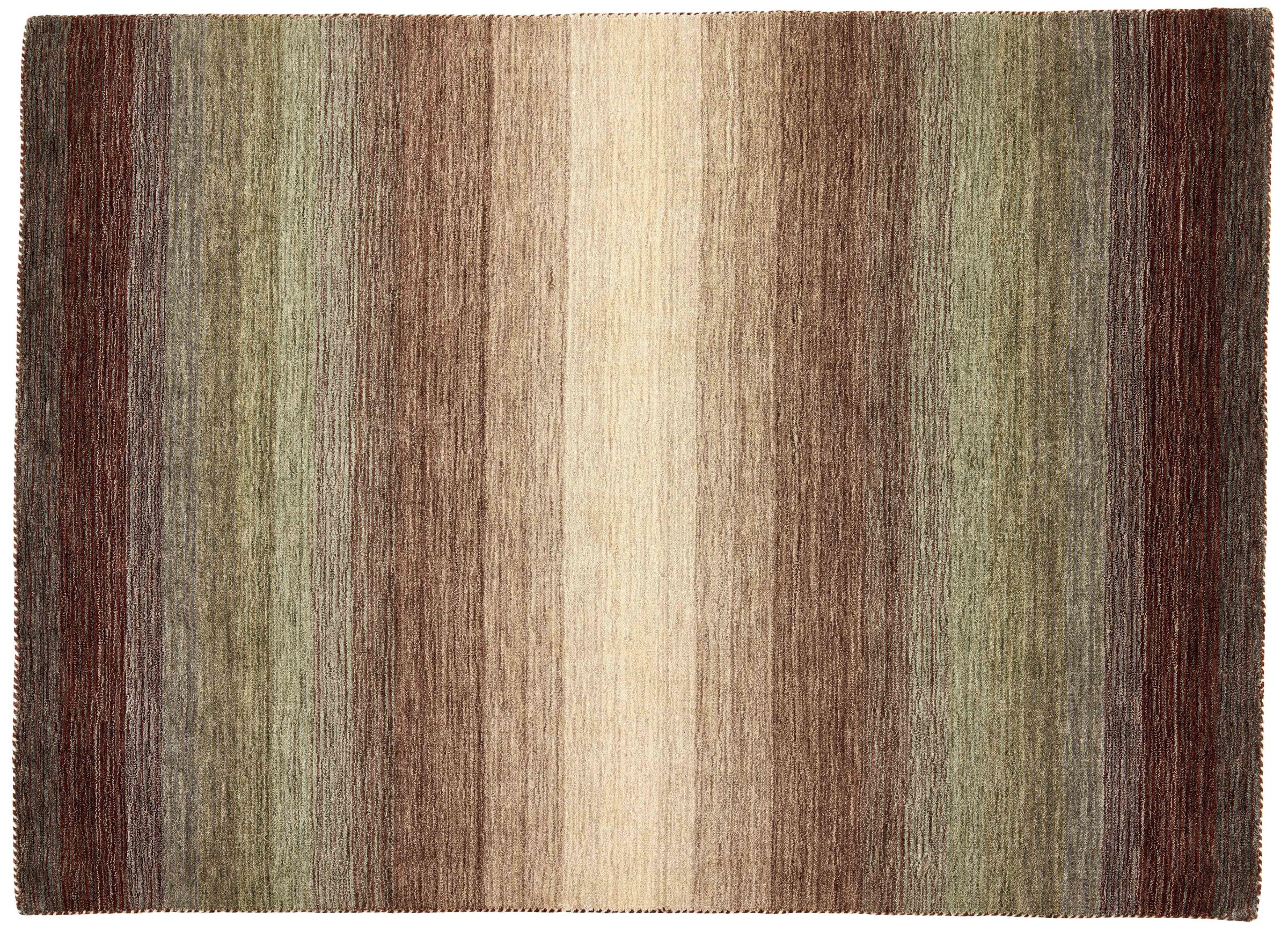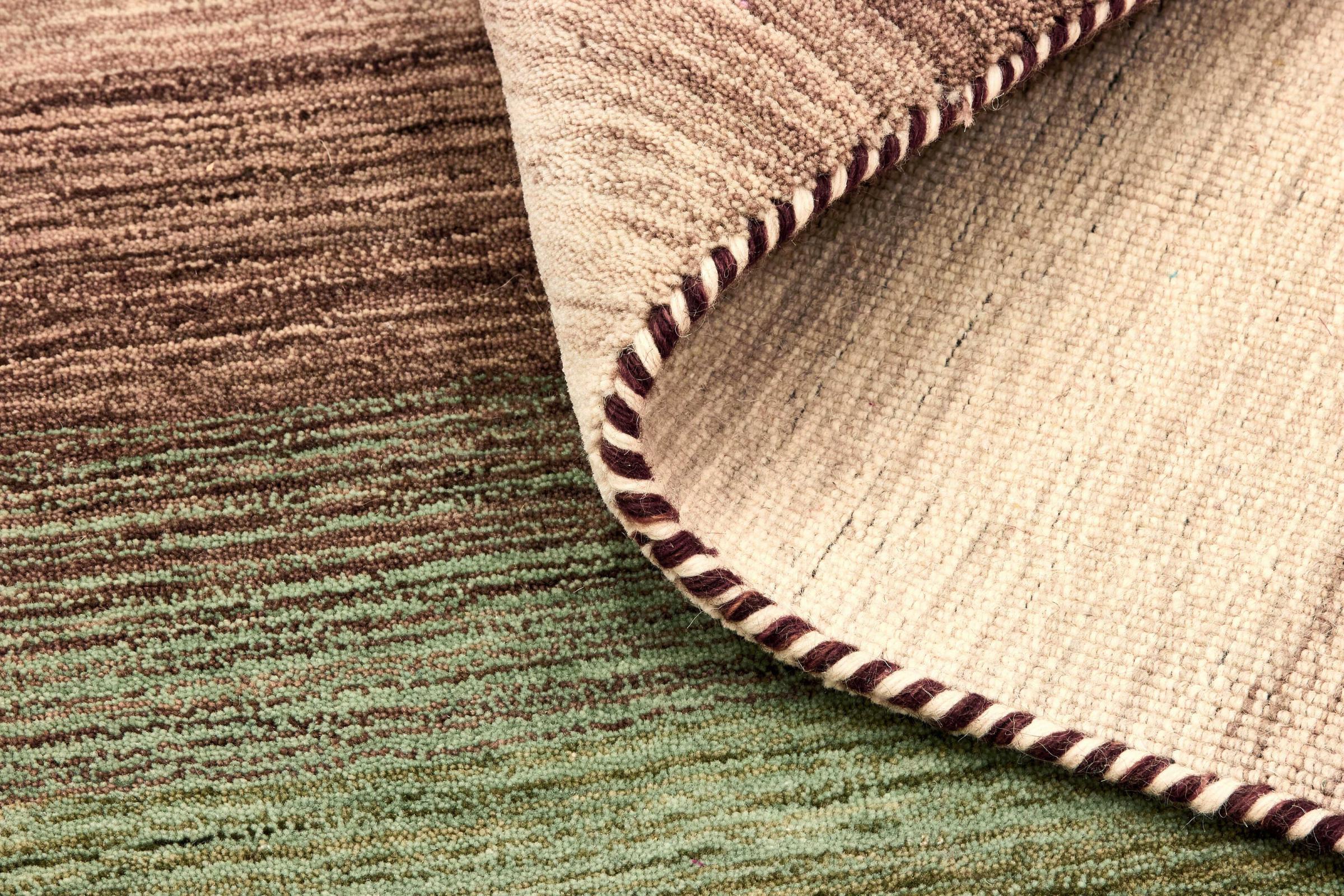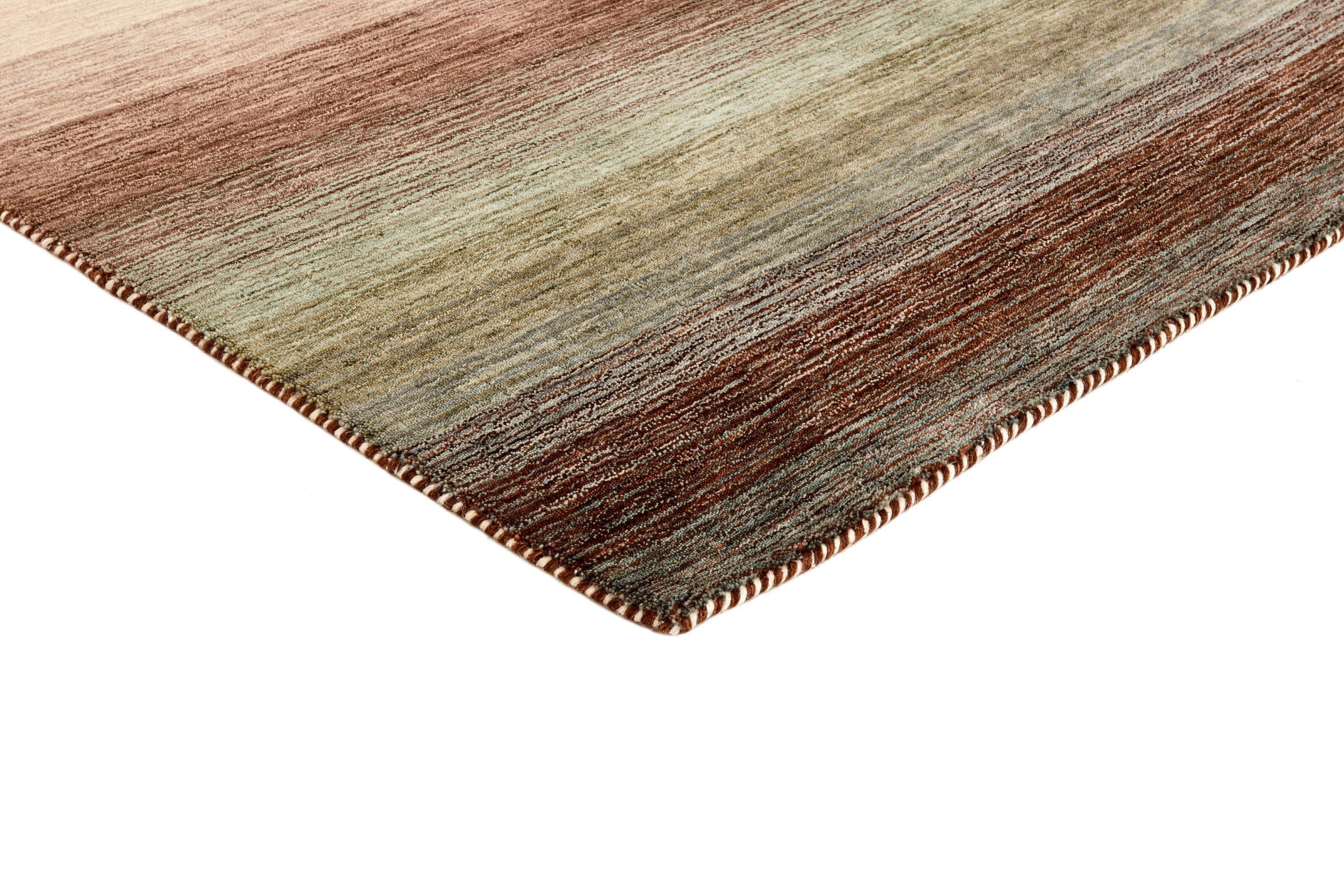 Dette håndlavede designertæppe tager bevidst fat i subtile nuancer af et bestemt farvespektrum. Resultatet er et roligt og alligevel moderne design. Naturlig uld er blevet brugt sammen med viskose for at skabe en smuk glans. Det får farvespektret til at se helt betagende ud i virkeligheden.