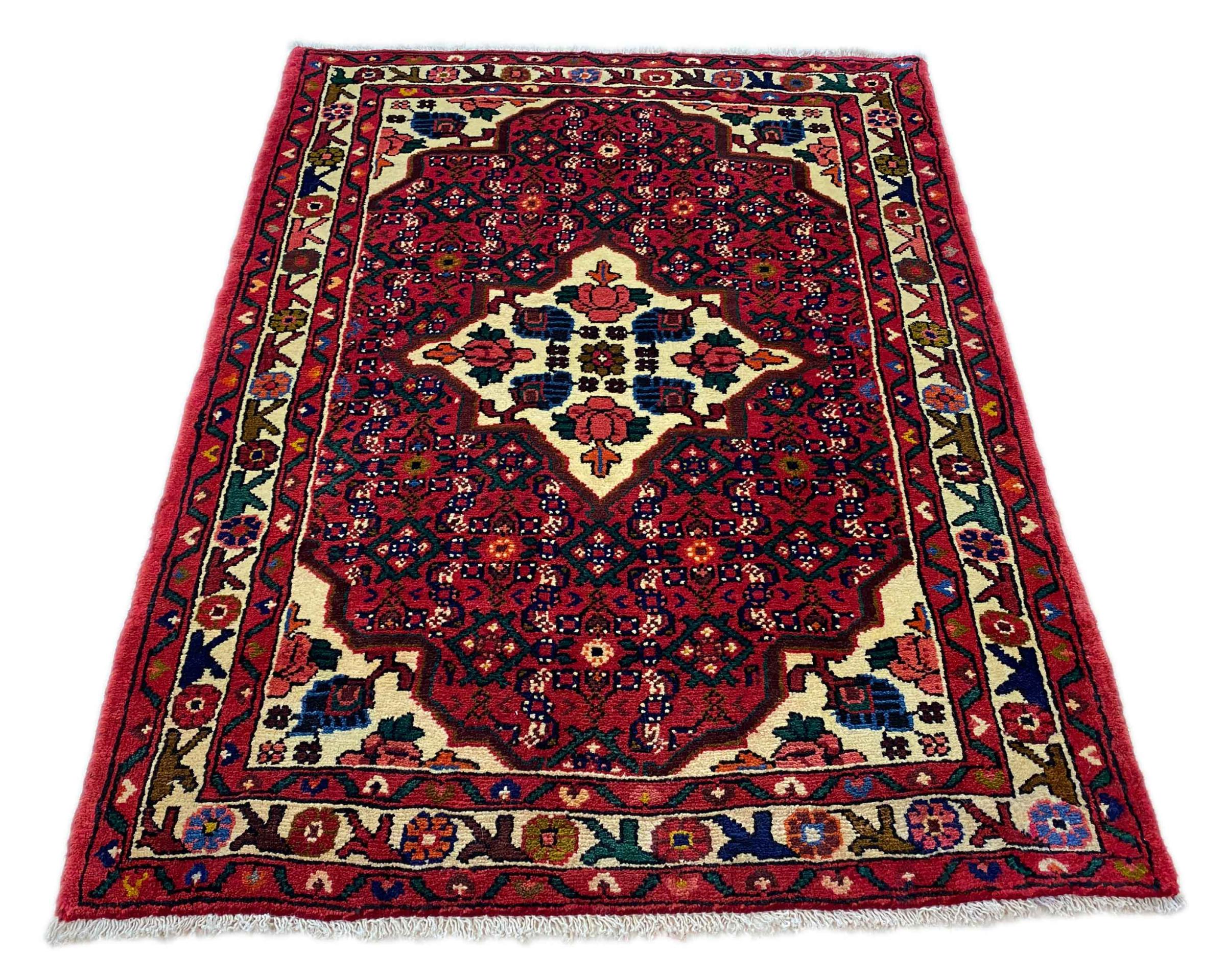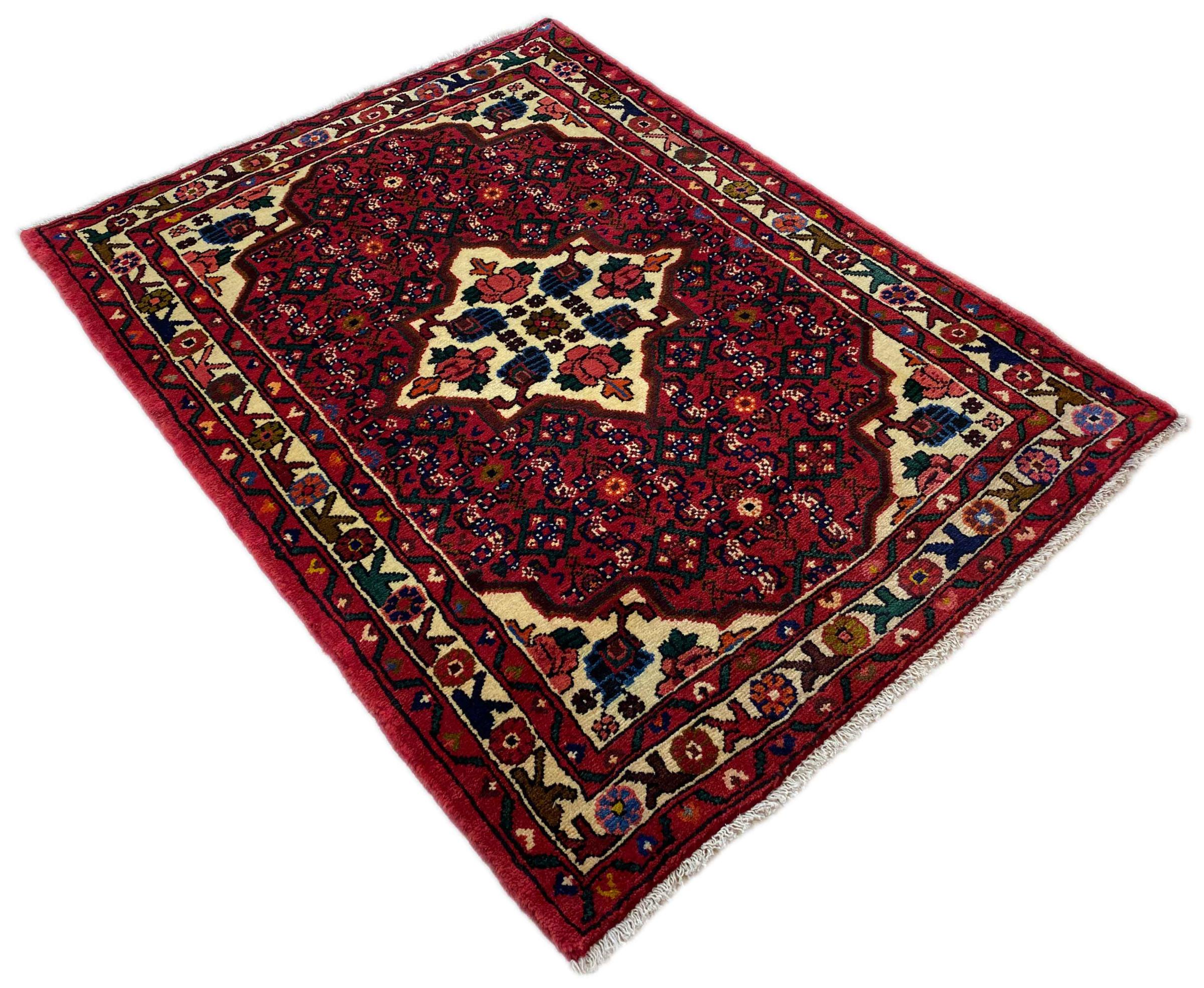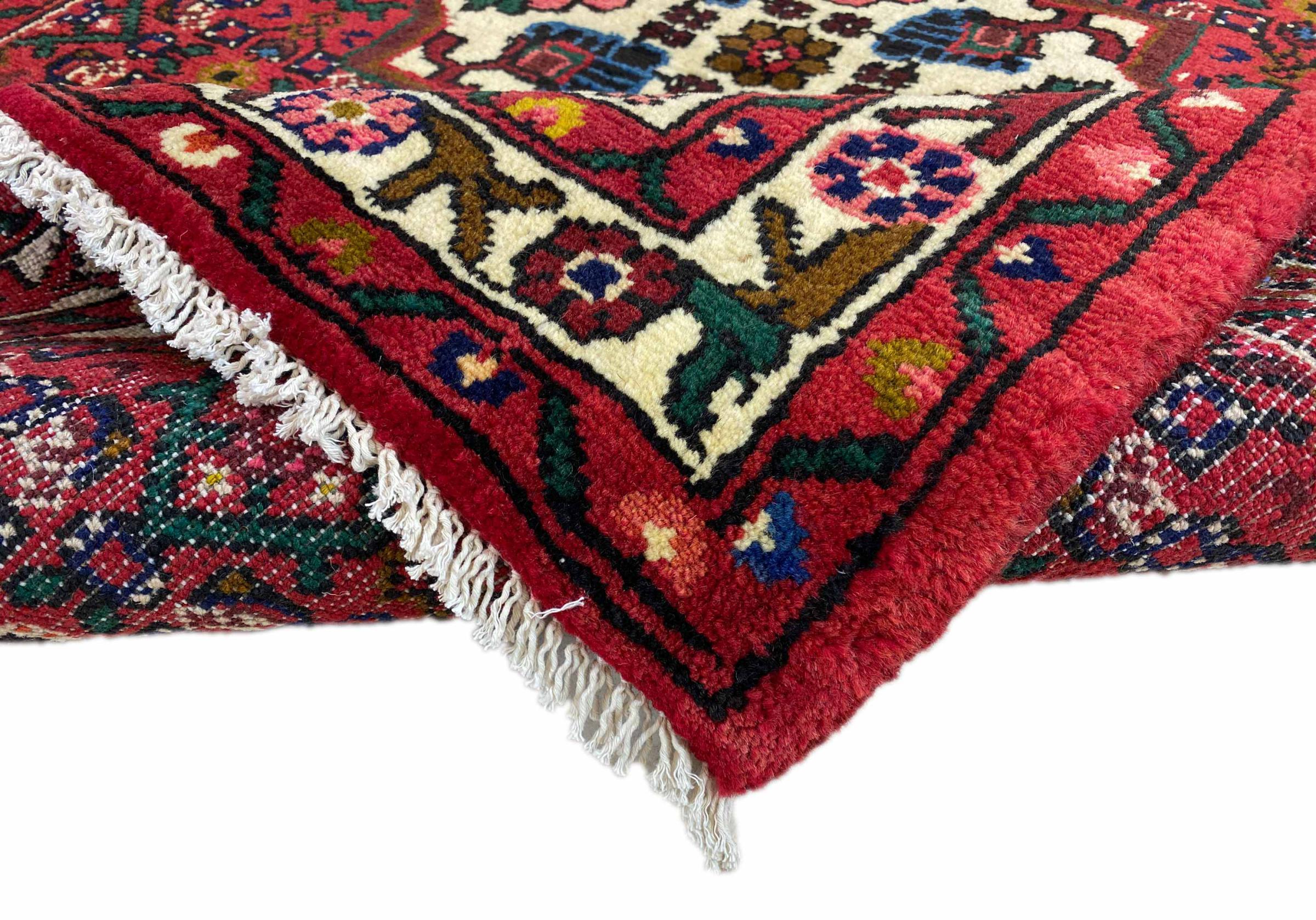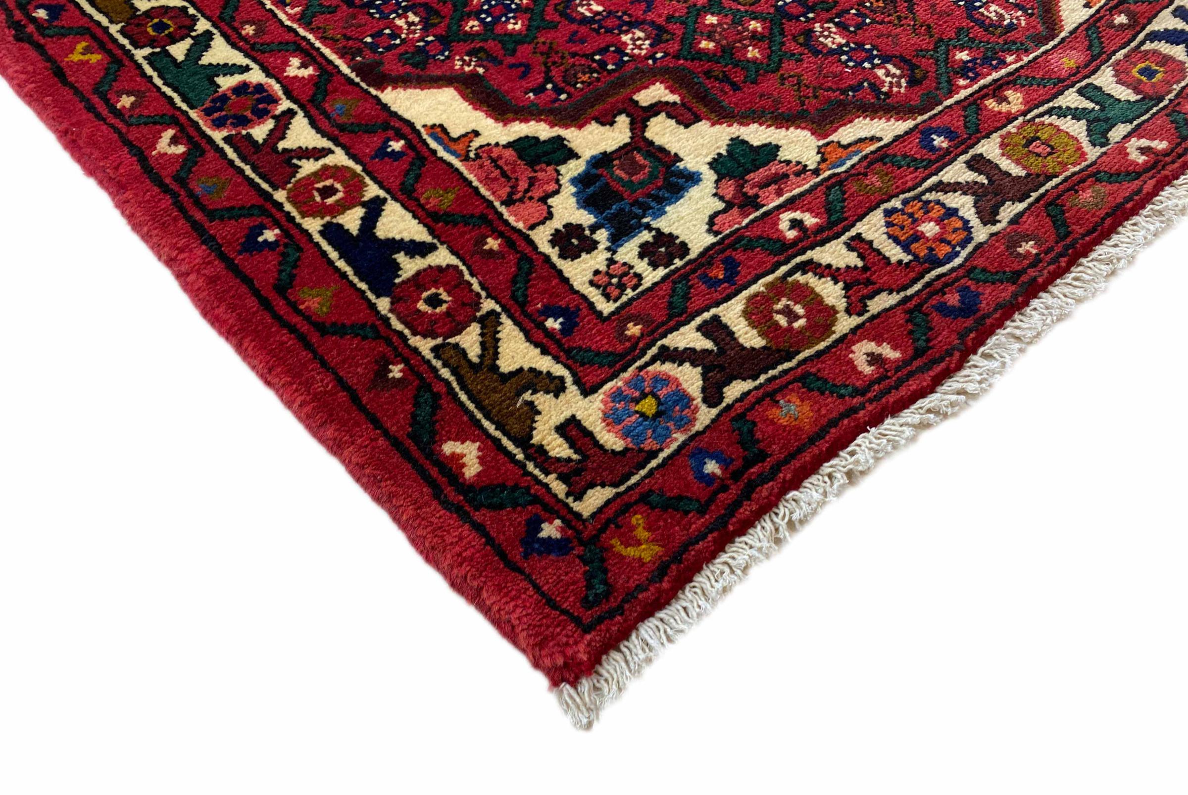 Denne håndknyttede Hoseinabad tilbyder traditionel persisk tæppekunst. Det blev håndlavet i den lille by Hoseinabad nær Hamadan. Den høje kvalitet af tæpperne fra denne region forbløffer. Føl et stykke af Østen under dine fødder med denne smukke Hoseinabad tæppe.