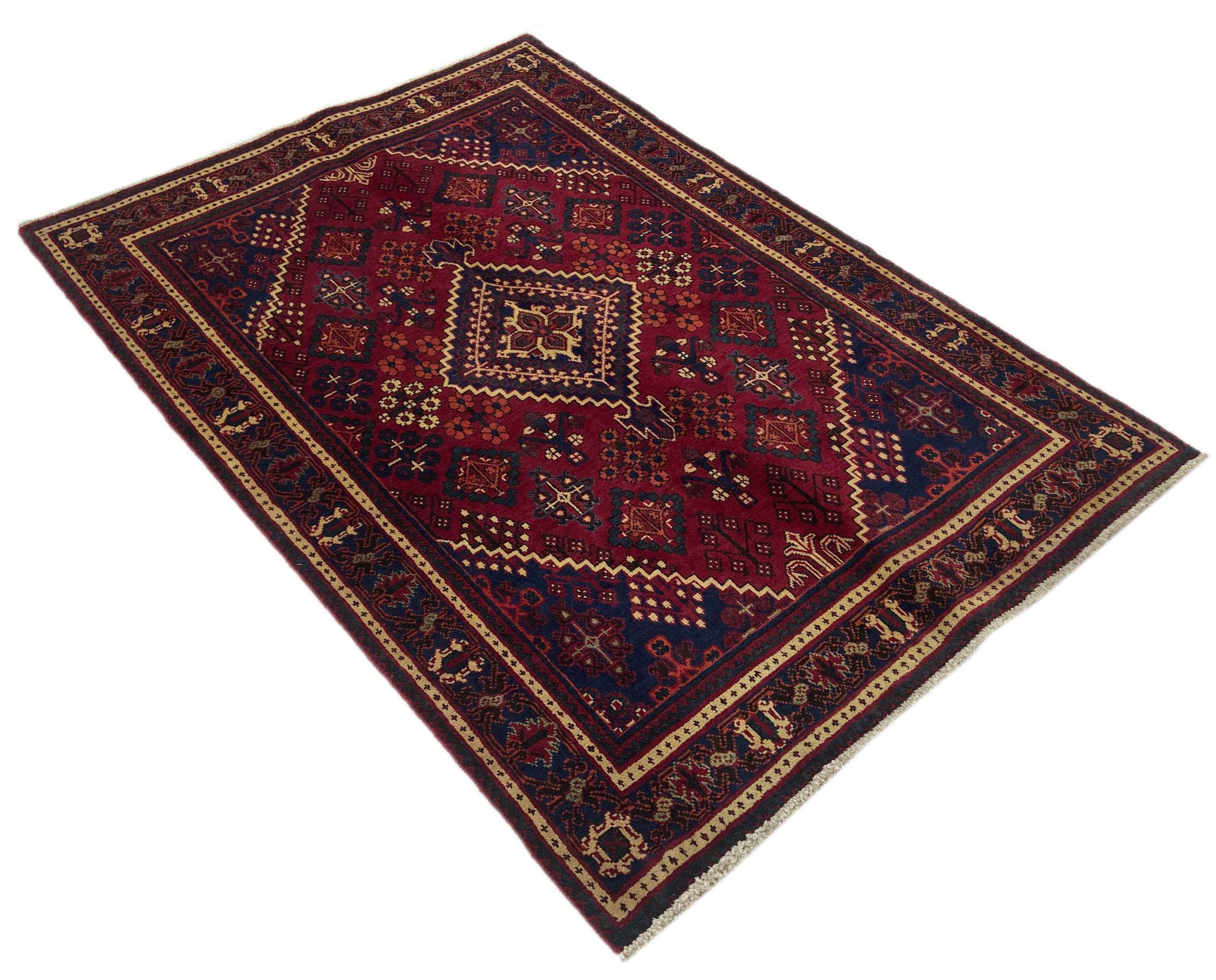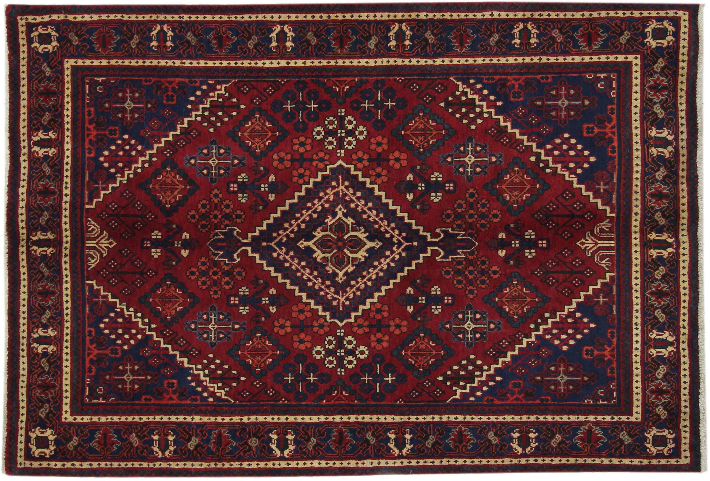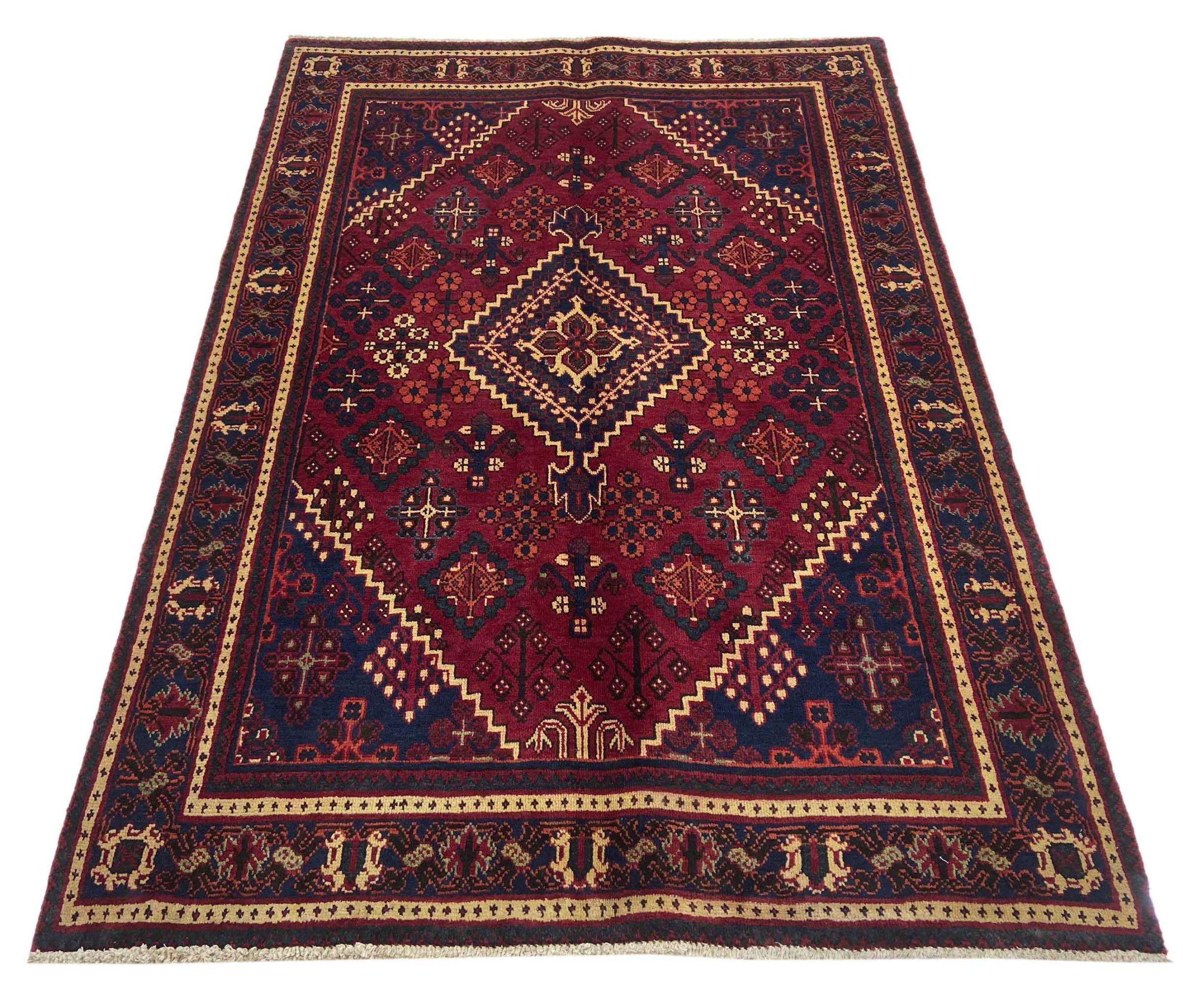 Denne persiske Joshaghan-tæppe stammer fra Hamadan-regionen i Iran og er en ægte landsbytæppe. Derfor kommer det i typiske mørke farvetoner og med de så populære geometriske mønstre og ornamentik.