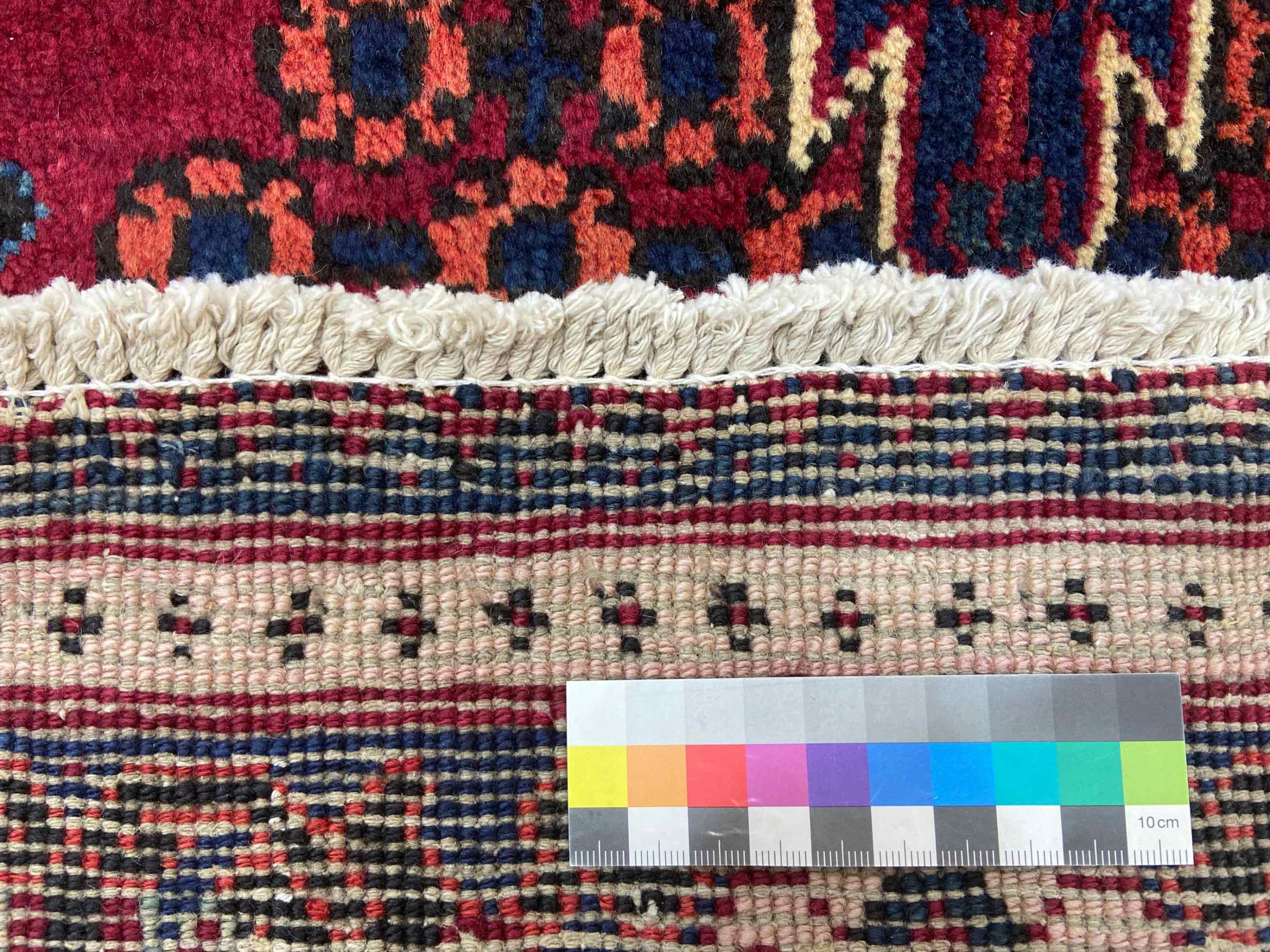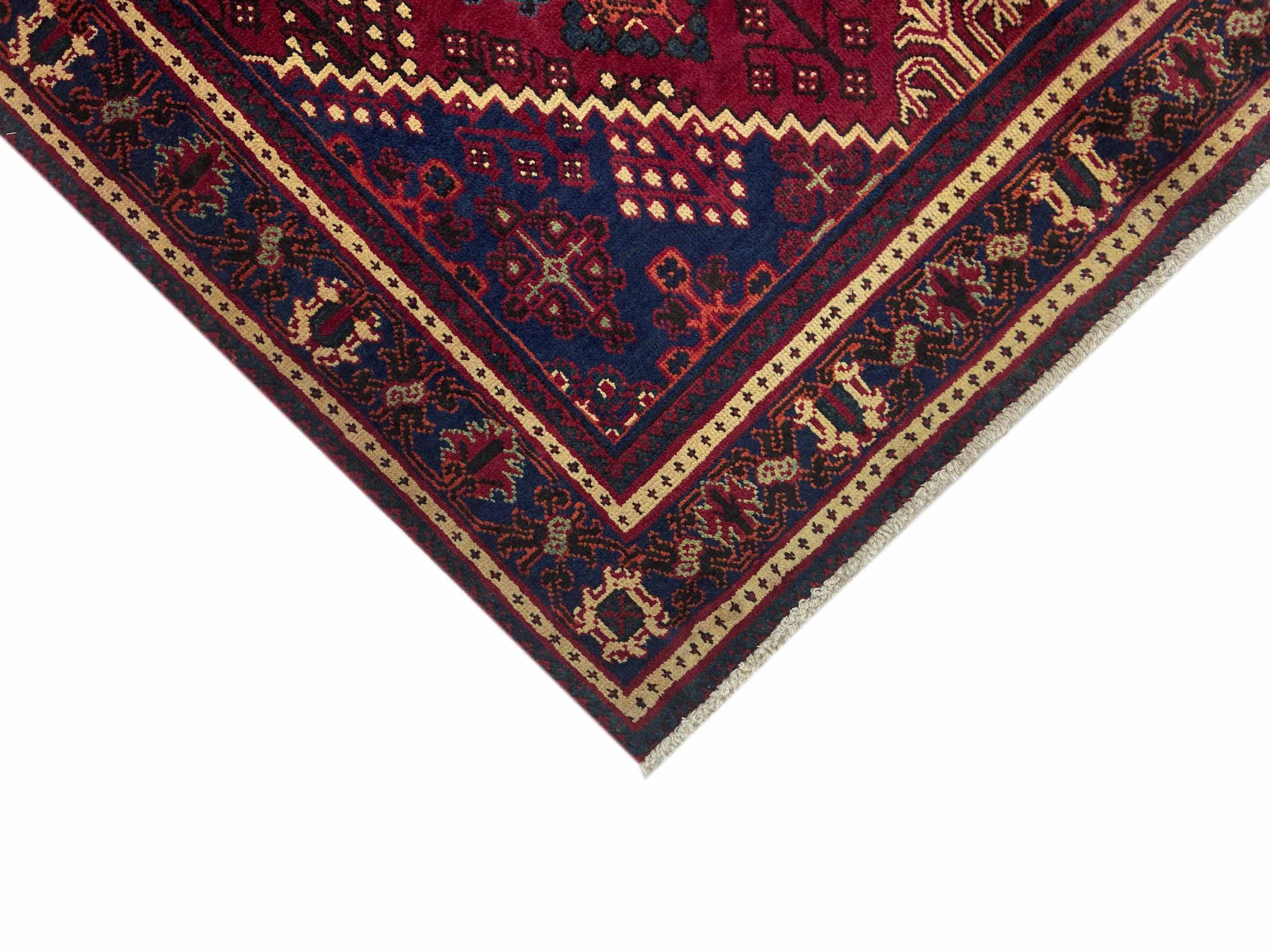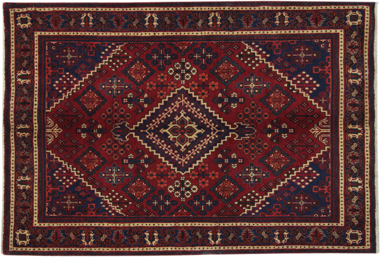 Denne persiske Joshaghan-tæppe stammer fra Hamadan-regionen i Iran og er en ægte landsbytæppe. Derfor kommer det i typiske mørke farvetoner og med de så populære geometriske mønstre og ornamentik.