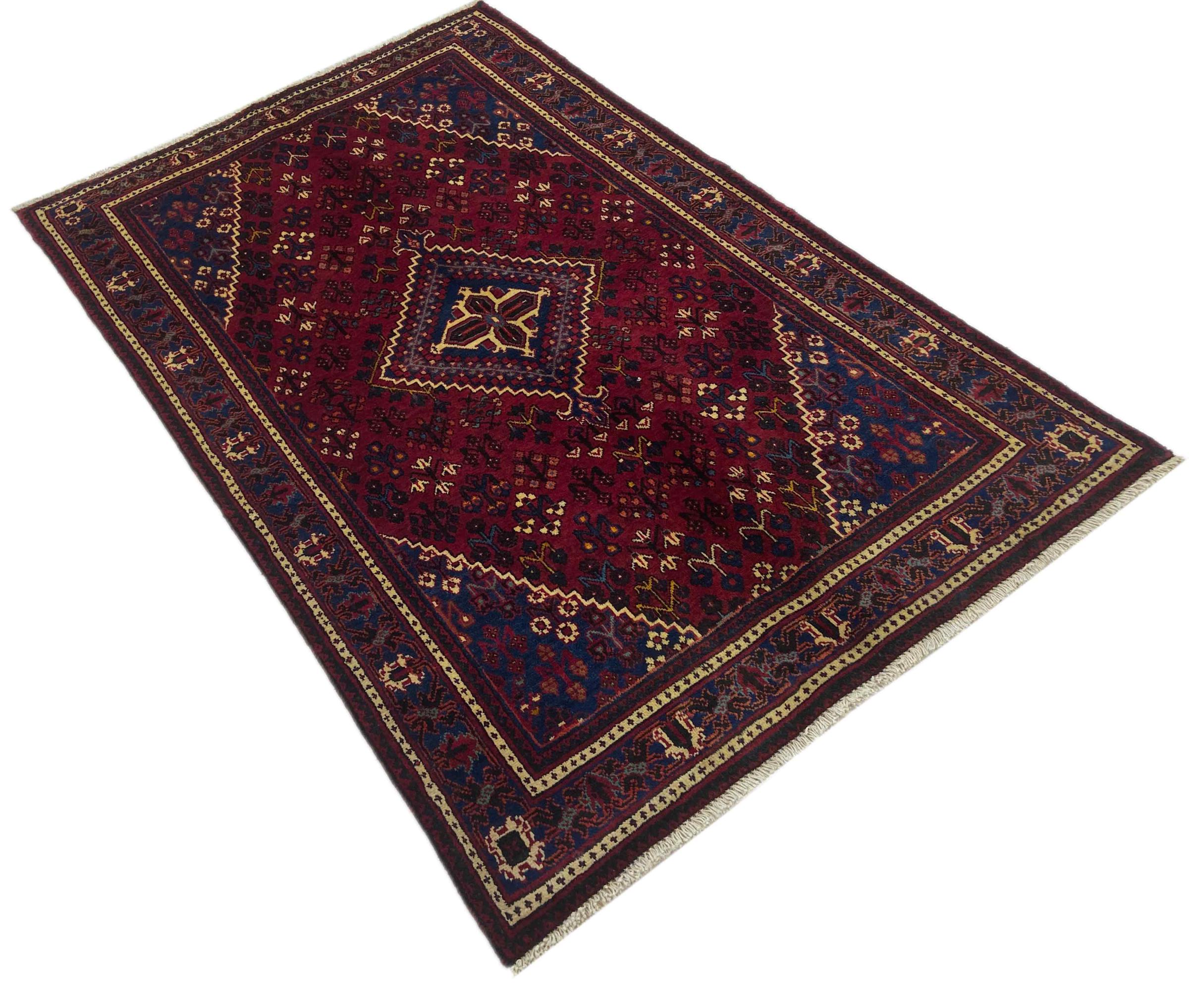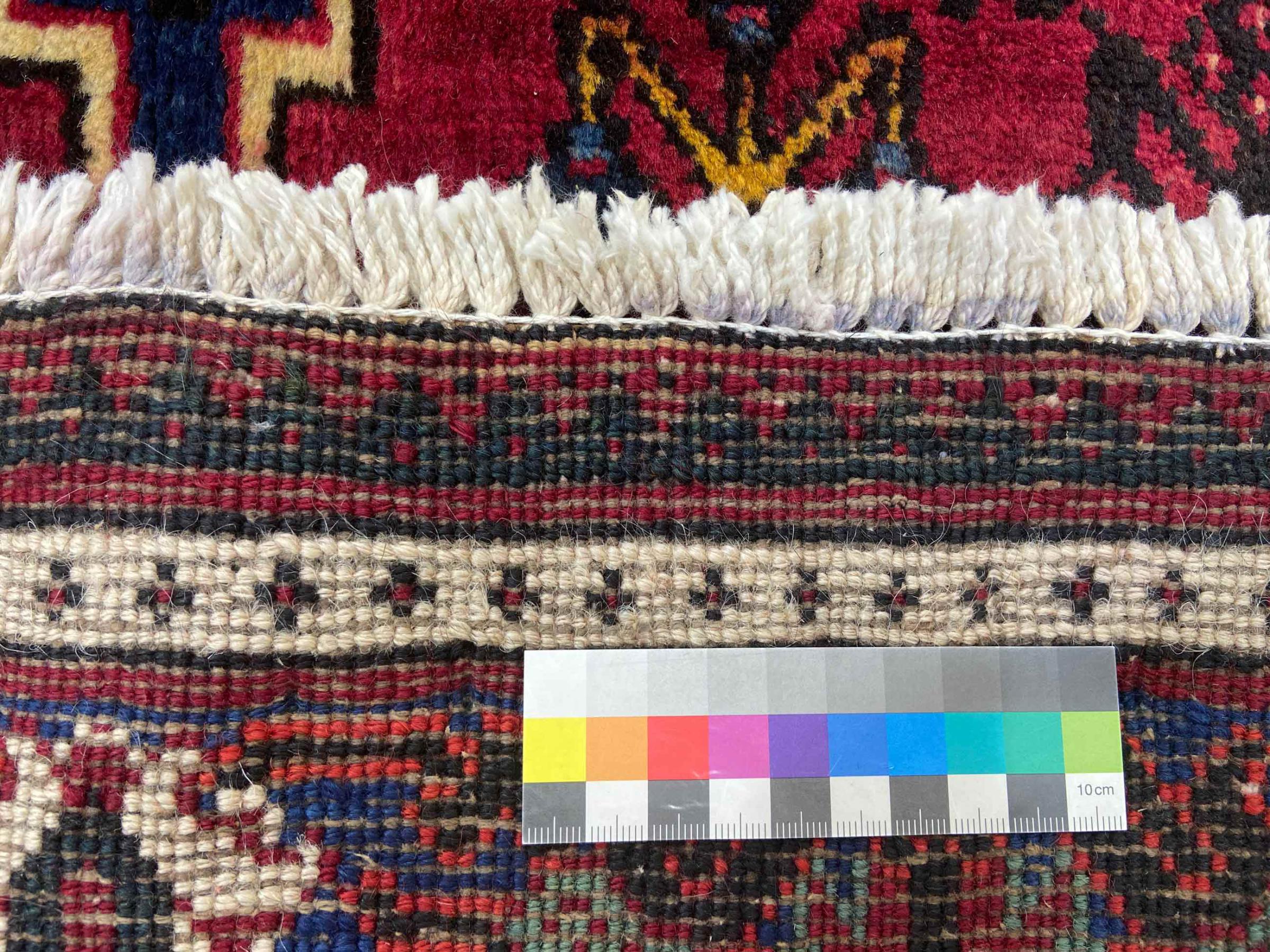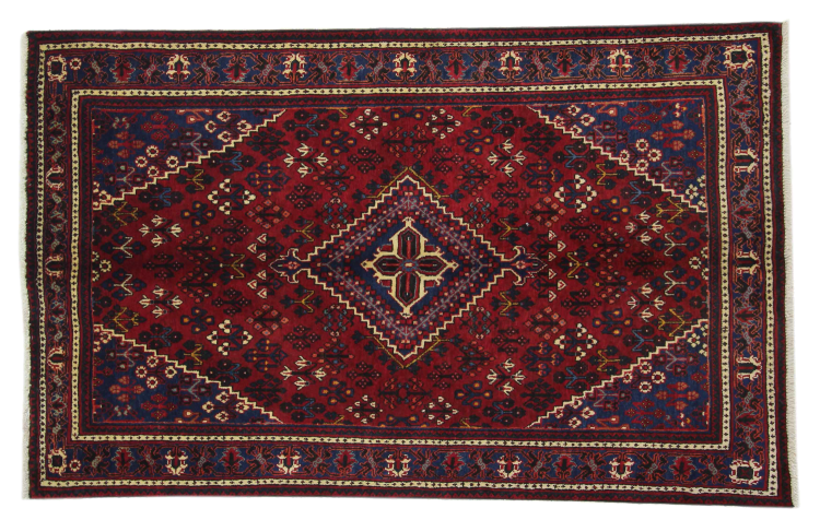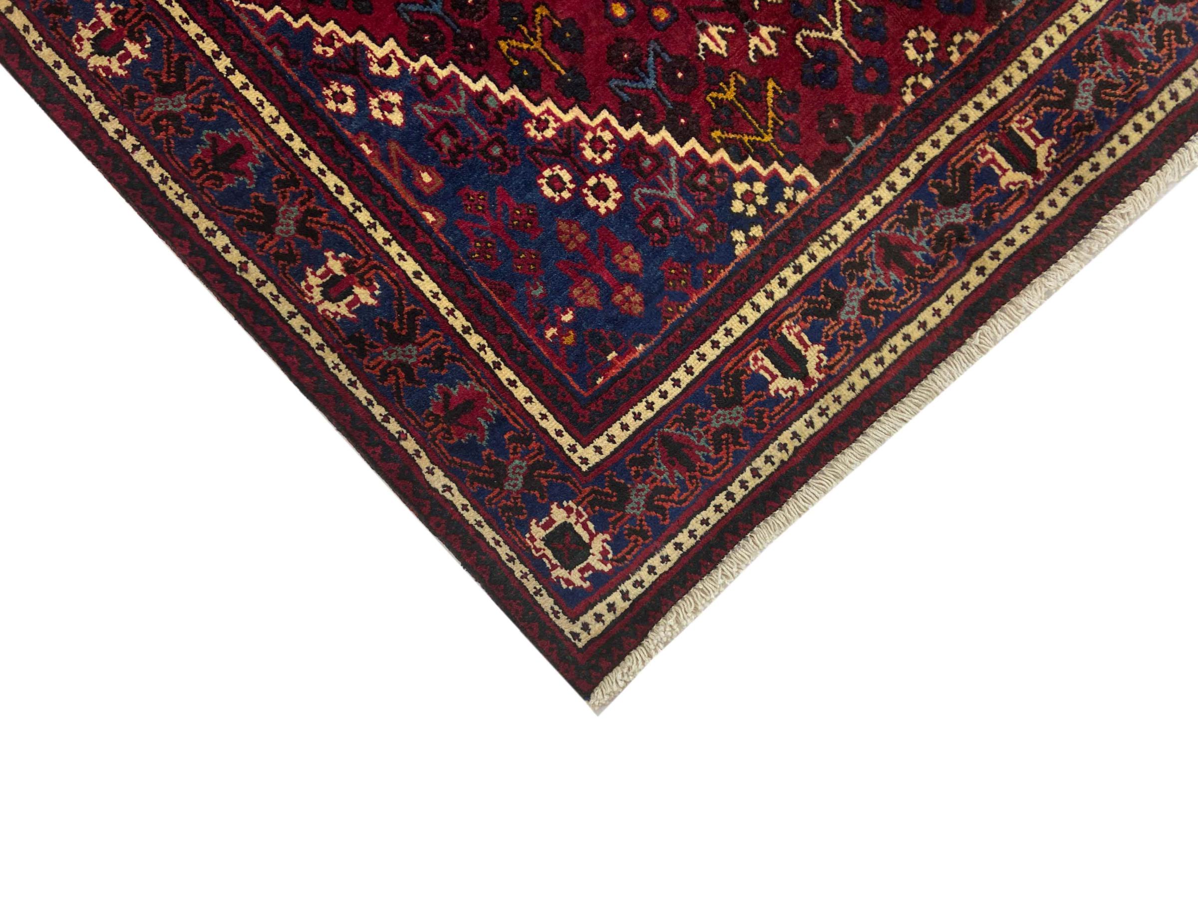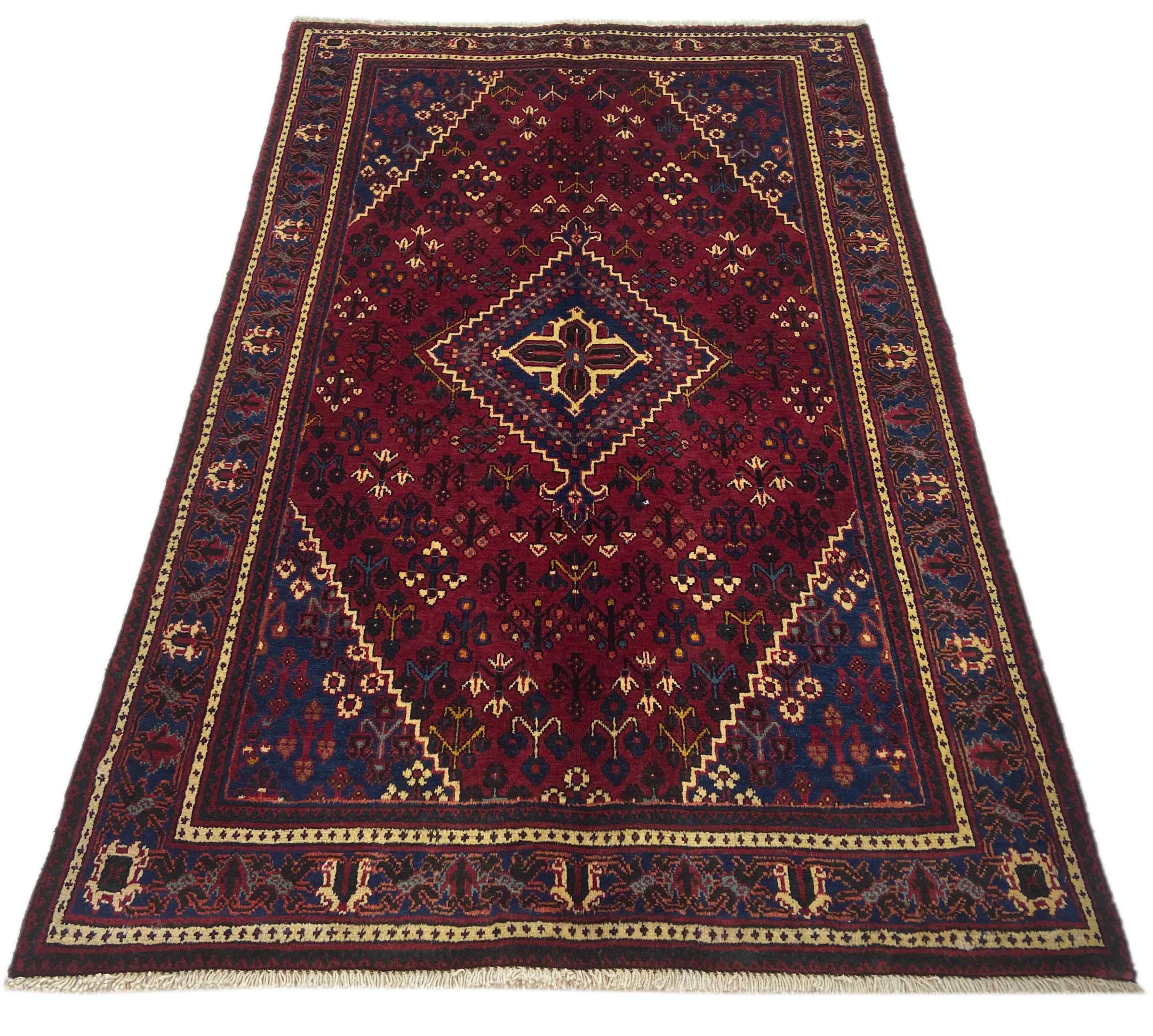 Denne persiske Joshaghan-tæppe stammer fra Hamadan-regionen i Iran og er en ægte landsbytæppe. Derfor kommer det i typiske mørke farvetoner og med de så populære geometriske mønstre og ornamentik.