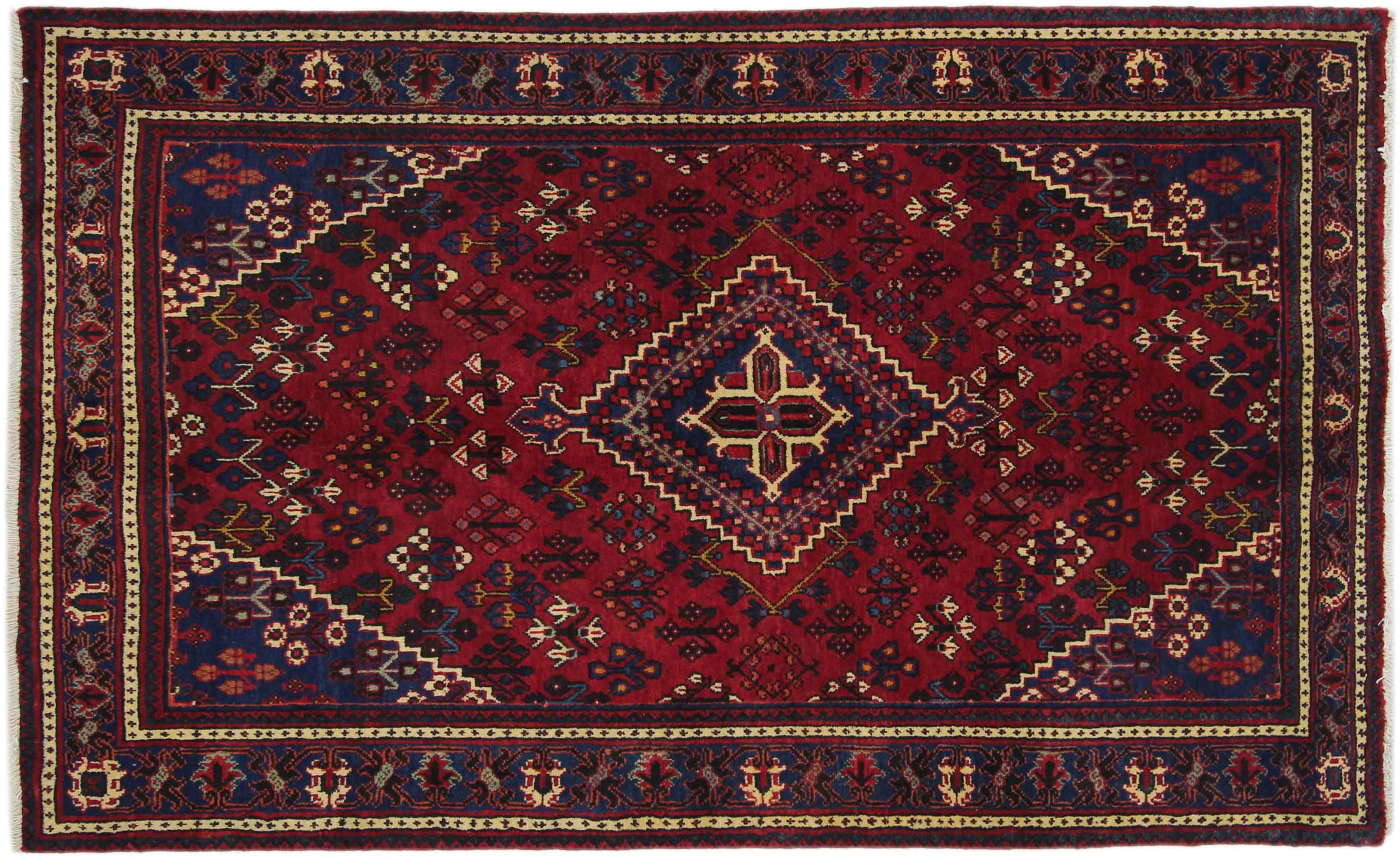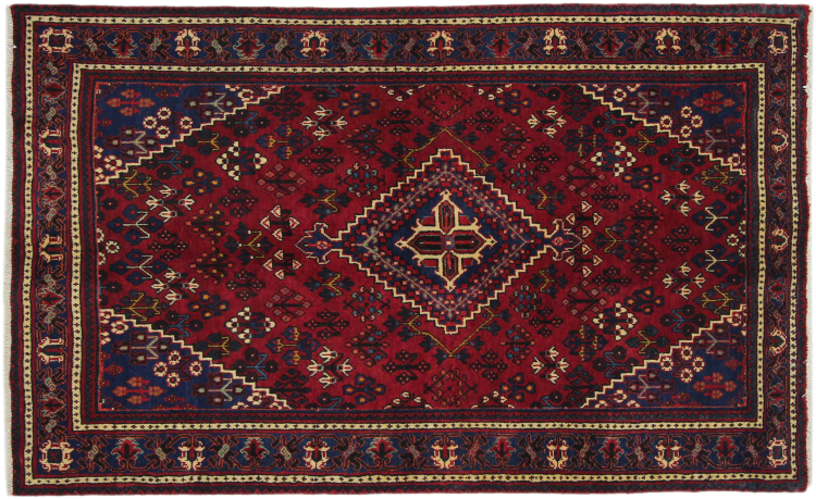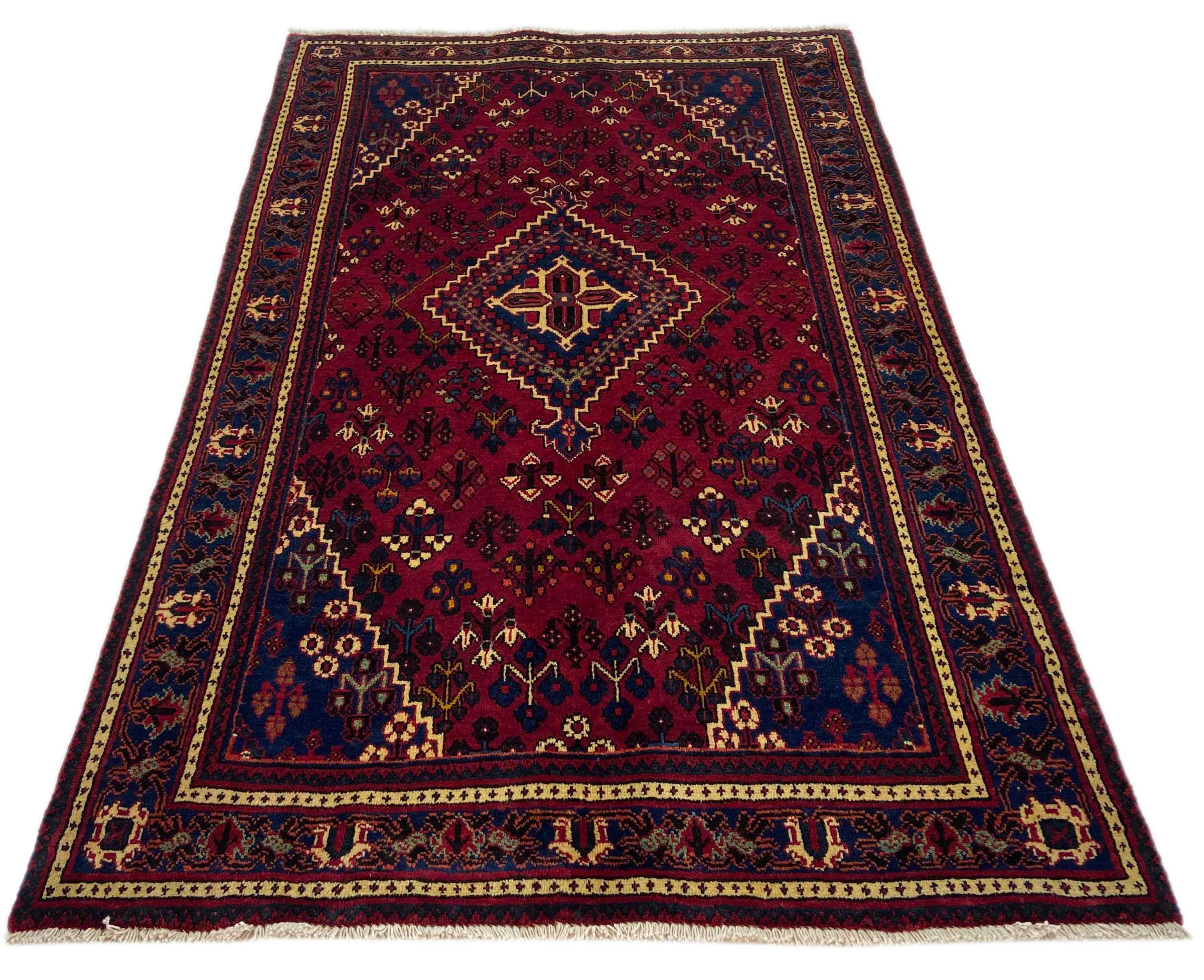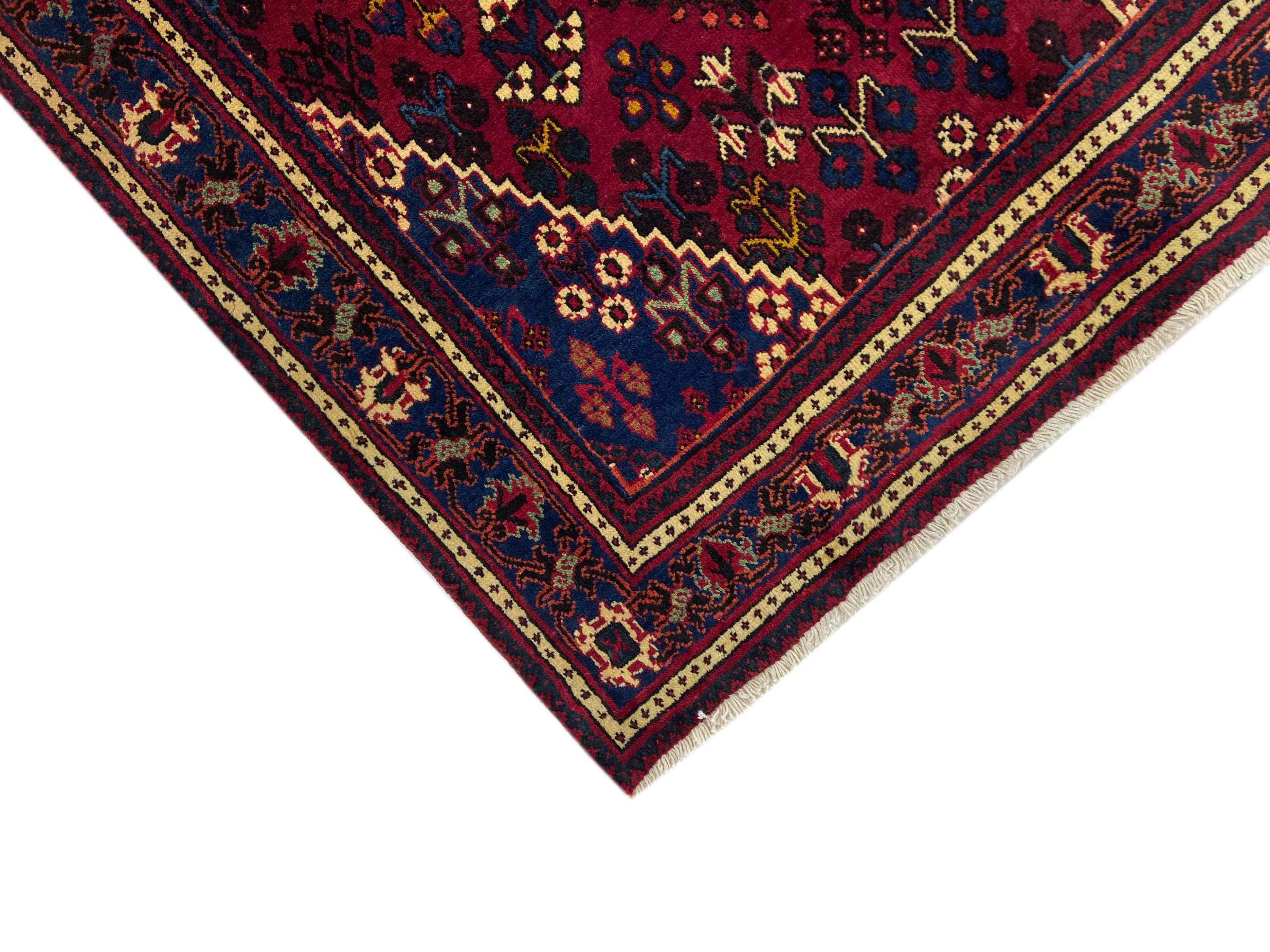 Denne persiske Joshaghan-tæppe stammer fra Hamadan-regionen i Iran og er en ægte landsbytæppe. Derfor kommer det i typiske mørke farvetoner og med de så populære geometriske mønstre og ornamentik.