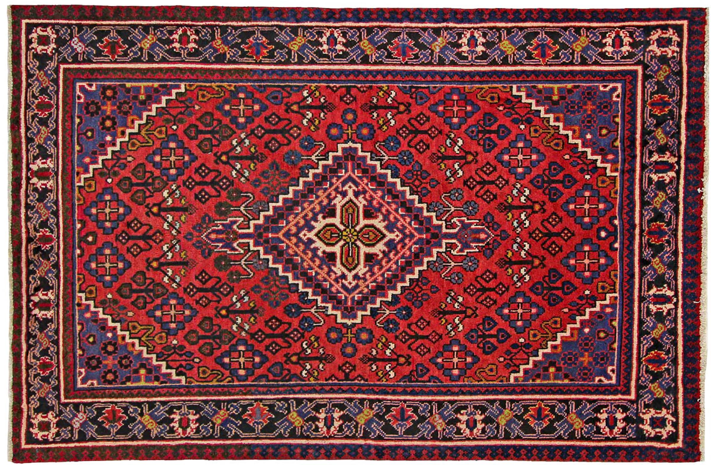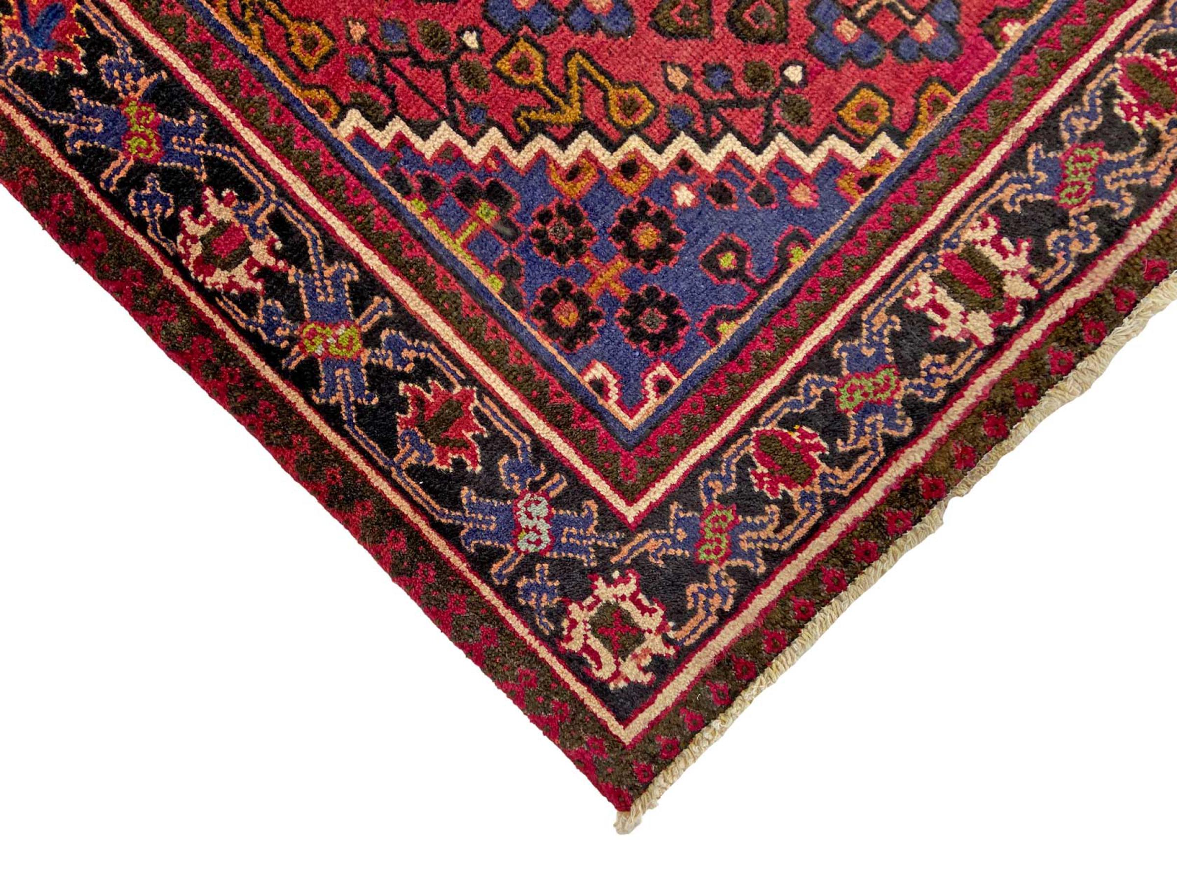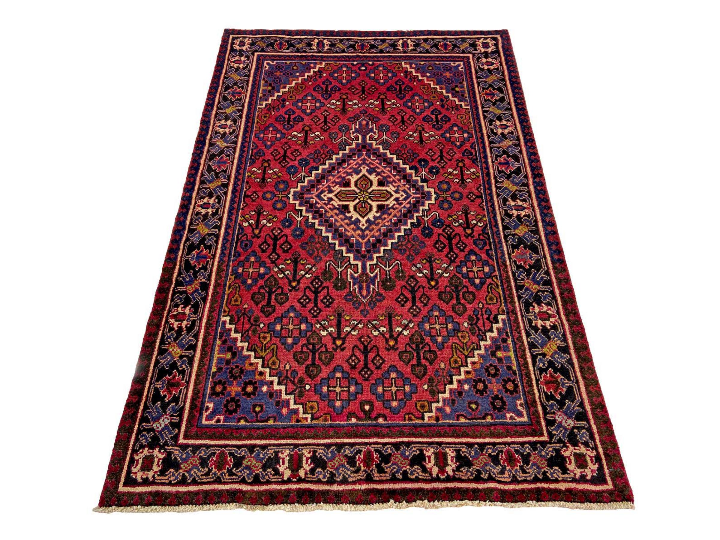 Denne persiske Joshaghan-tæppe stammer fra Hamadan-regionen i Iran og er en ægte landsbytæppe. Derfor kommer det i typiske mørke farvetoner og med de så populære geometriske mønstre og ornamentik.