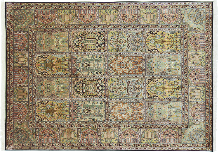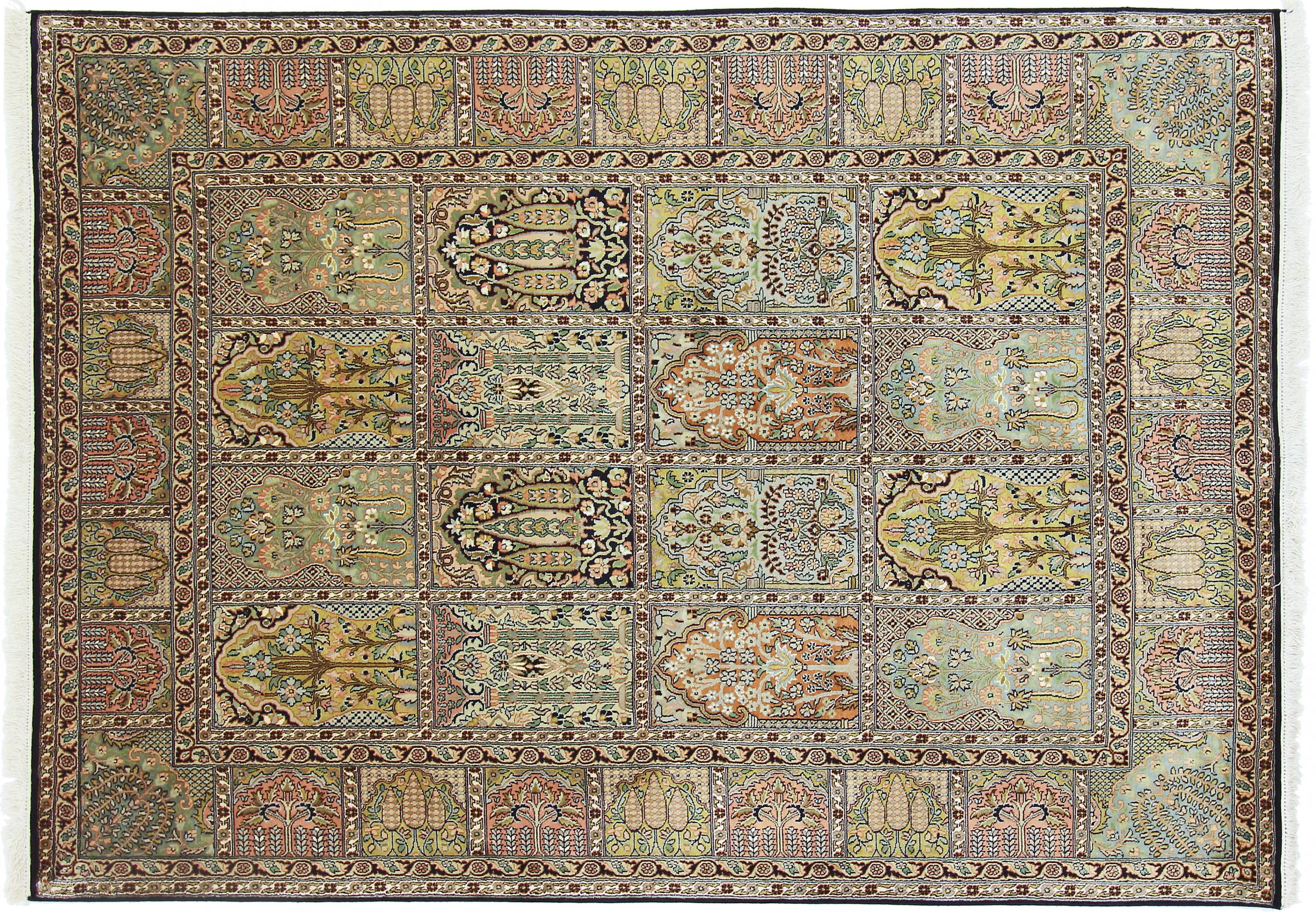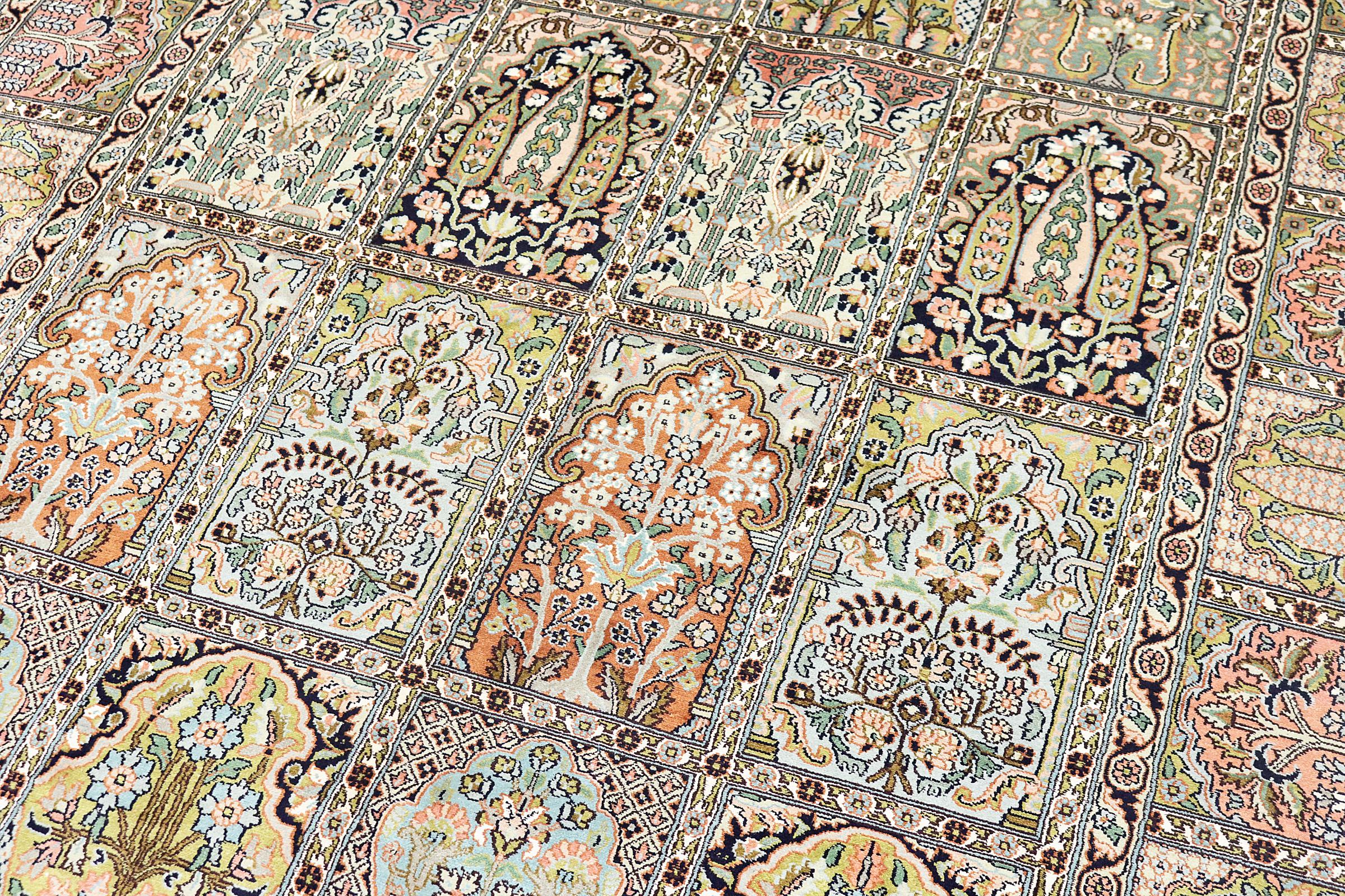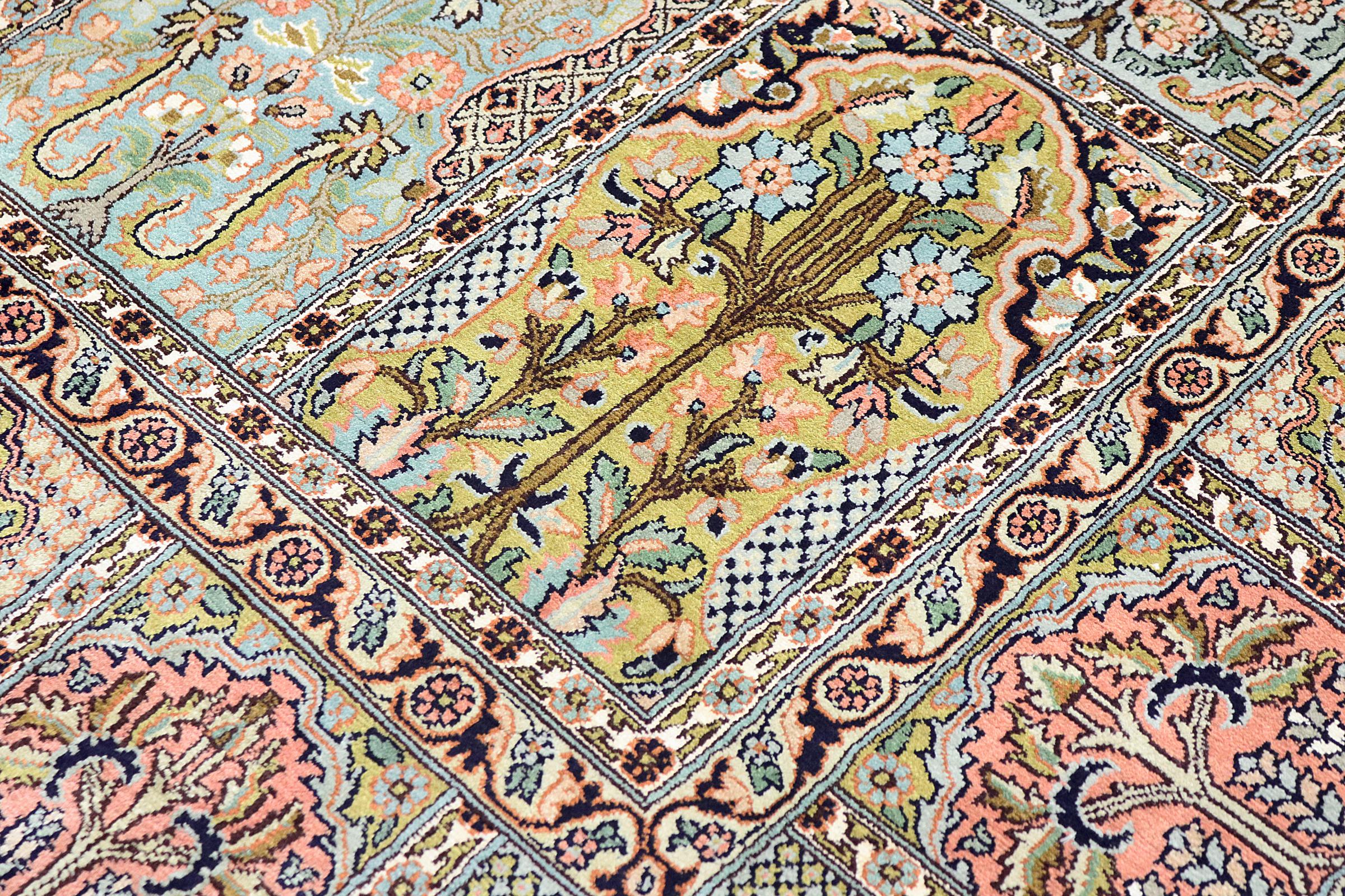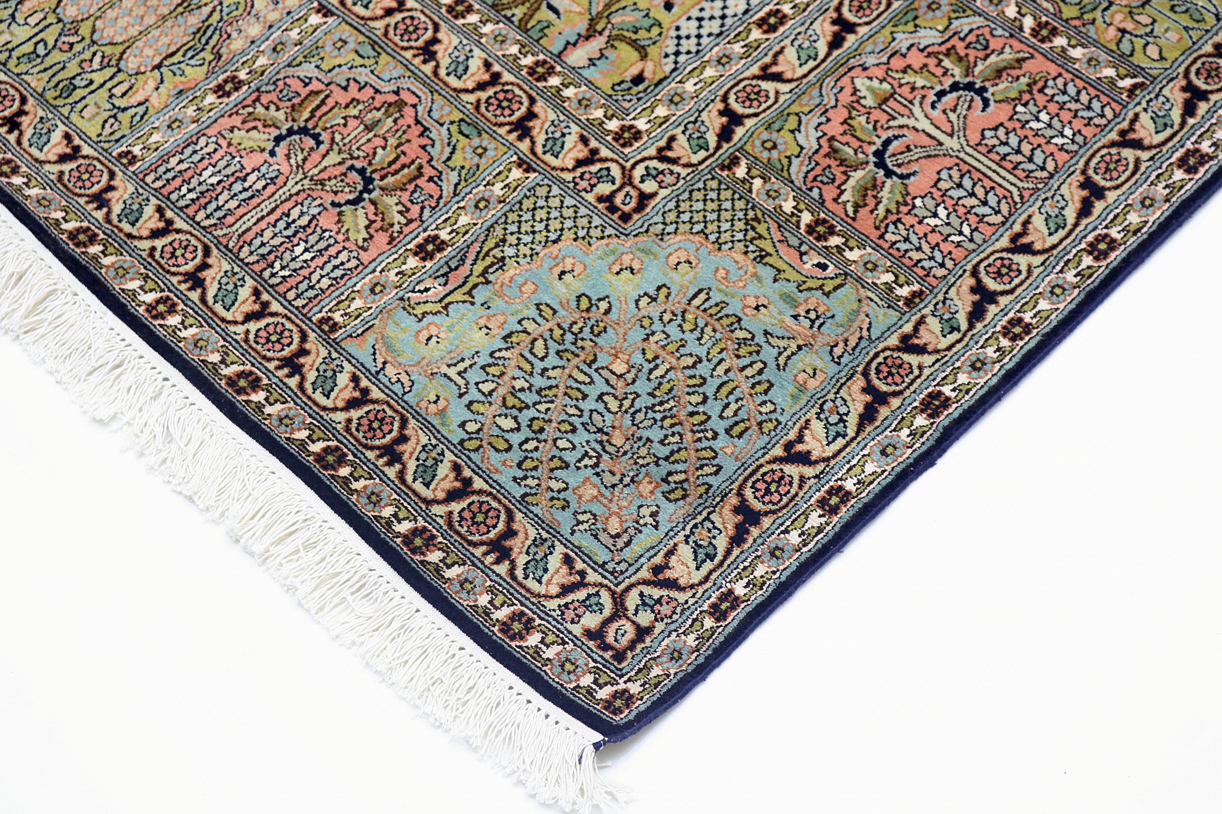 Dette håndknyttede silketæppe fra Kashmir afspejler de indiske tæppevæveres dygtighed. Ikke alene er det lavet af ren silke, men knudetætheden er så fin, at kun meget erfarne vævere kan skabe sådan et værk. Den fine natursilke er et fascinerende highlight. Den er ikke bare særlig blød at røre ved, men lader også farverne skinne i en lang række facetter. Afhængigt af lysindfaldet kommer der helt nye detaljer og farver til syne, som vil blive ved med at imponere i mange år fremover. Man kan se på et tæppe som dette i timevis og glemme alt om tid - en oplevelse, der ikke kan indfanges på et foto.