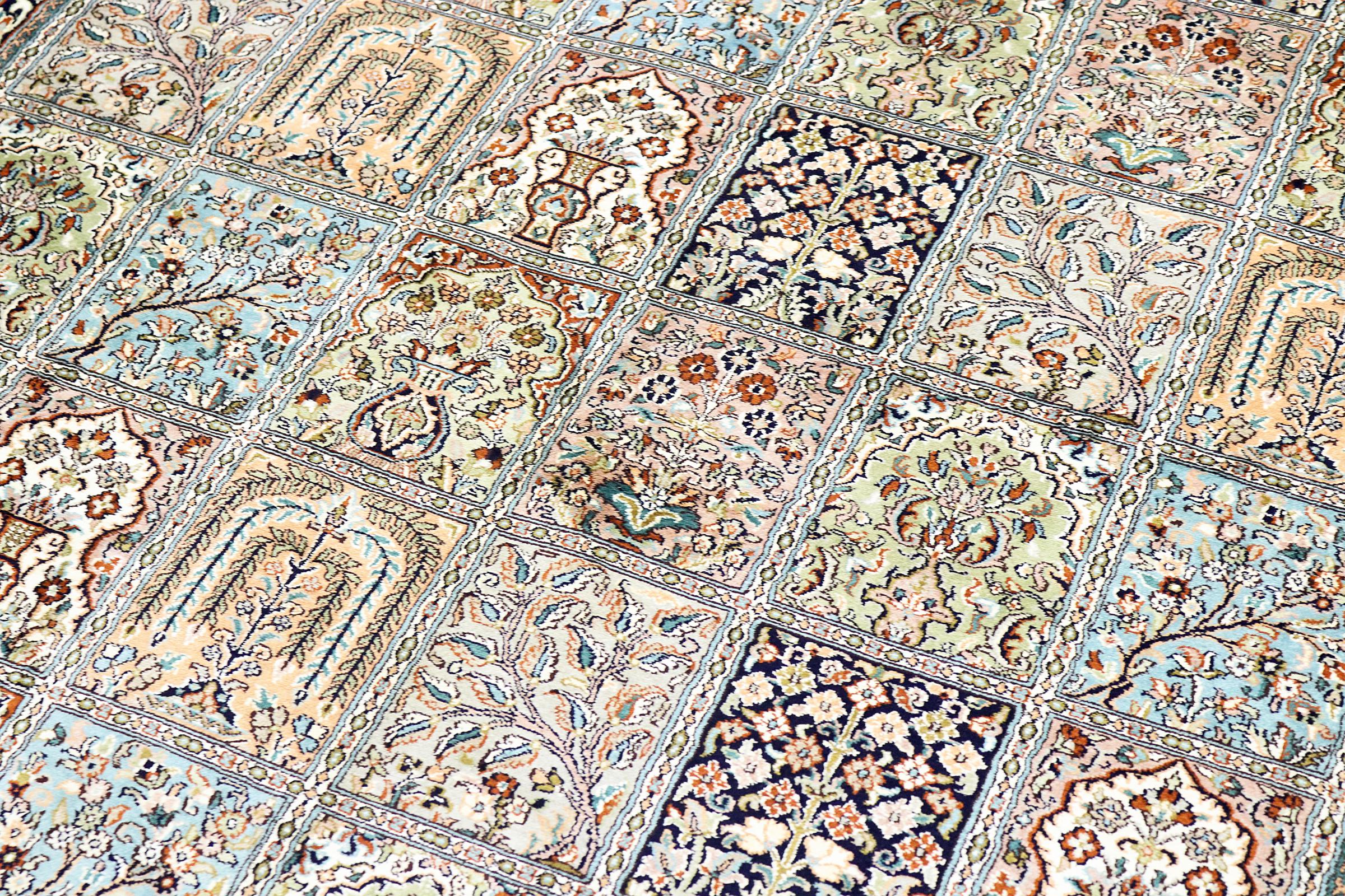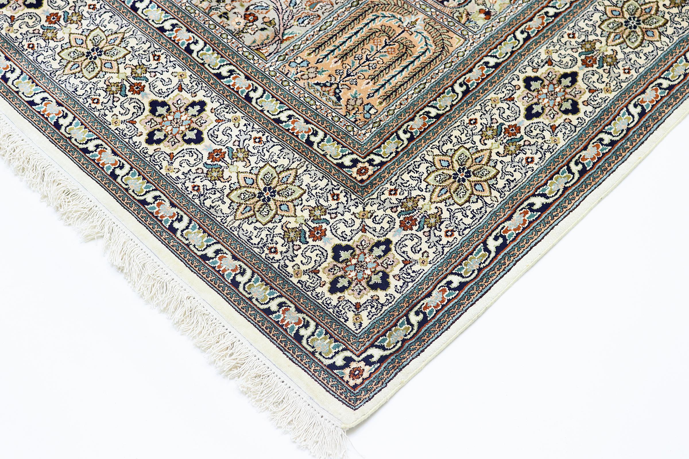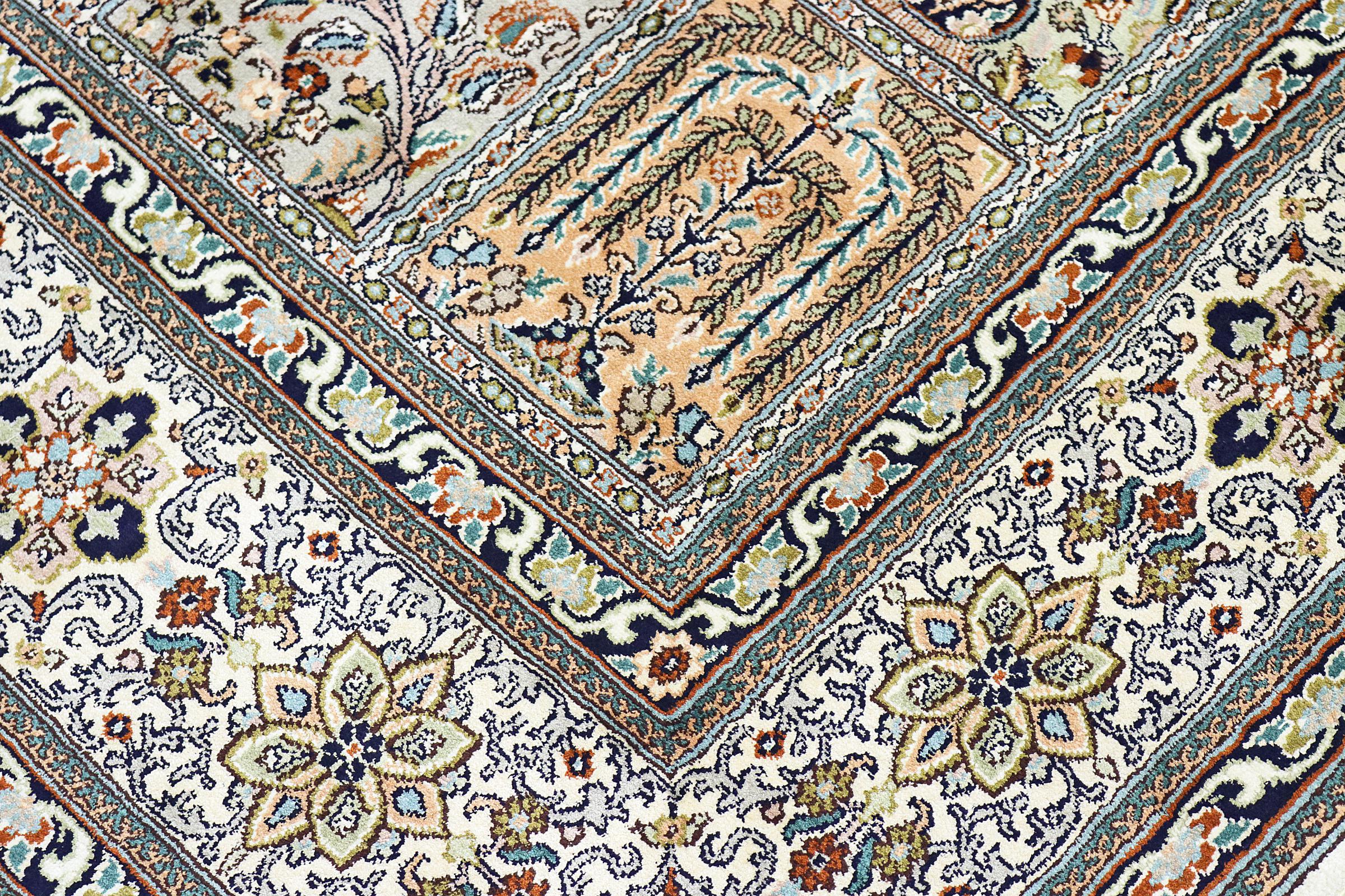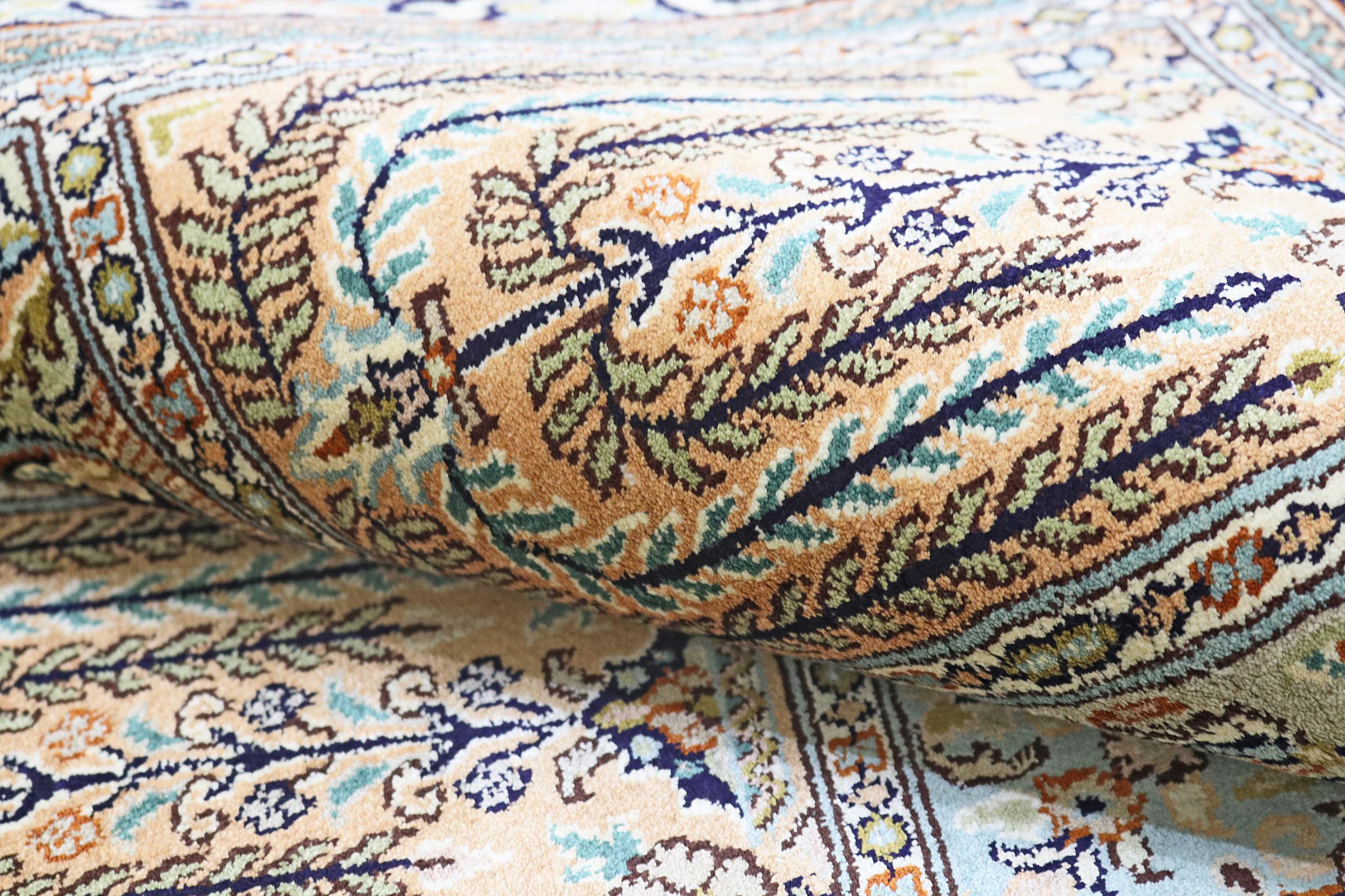 Dette håndknyttede silketæppe fra Kashmir afspejler de indiske tæppevæveres dygtighed. Ikke alene er det lavet af ren silke, men knudetætheden er så fin, at kun meget erfarne vævere kan skabe sådan et værk. Den fine natursilke er et fascinerende highlight. Den er ikke bare særlig blød at røre ved, men lader også farverne skinne i en lang række facetter. Afhængigt af lysindfaldet kommer der helt nye detaljer og farver til syne, som vil blive ved med at imponere i mange år fremover. Man kan se på et tæppe som dette i timevis og glemme alt om tid - en oplevelse, der ikke kan indfanges på et foto.
