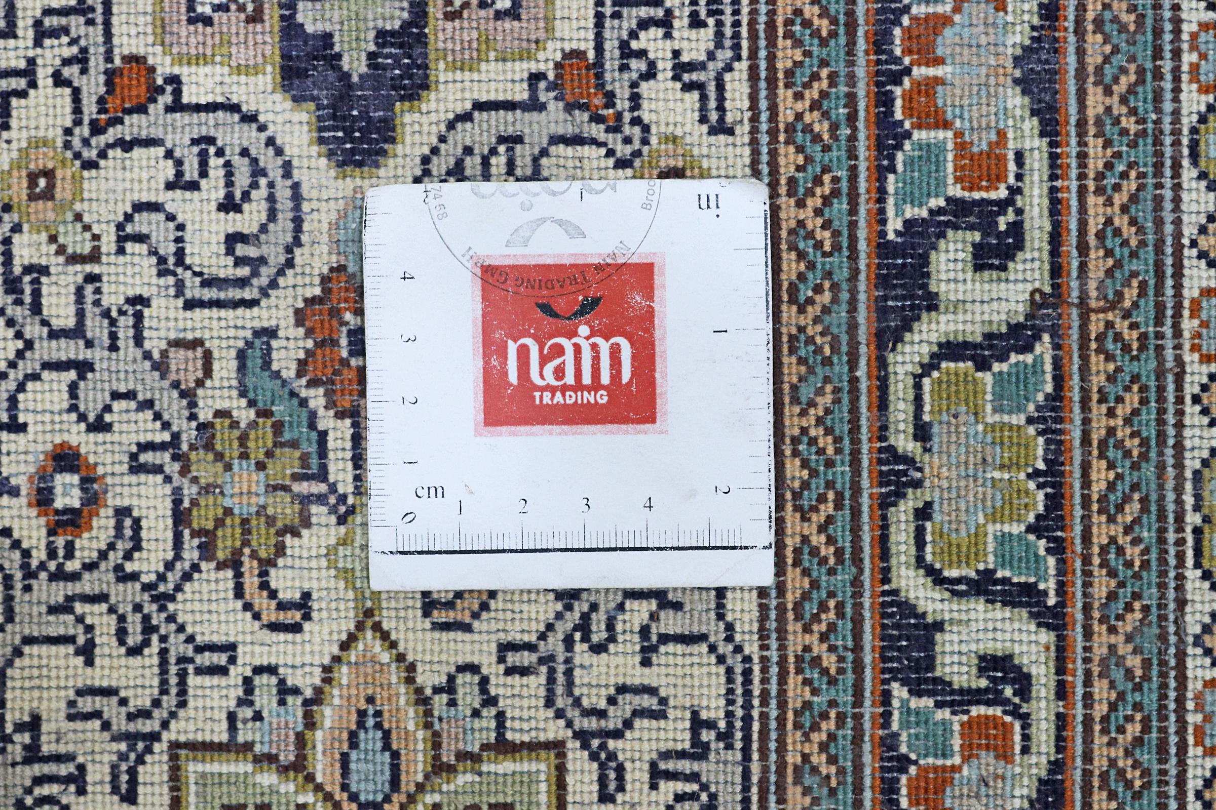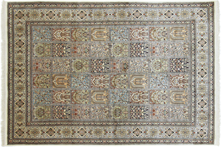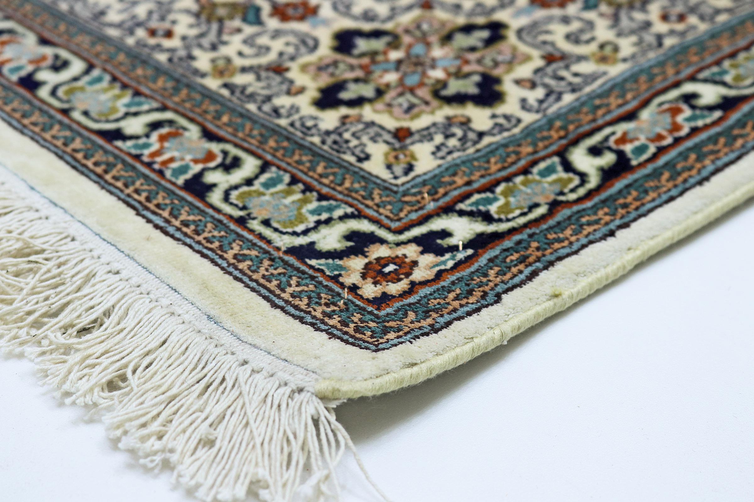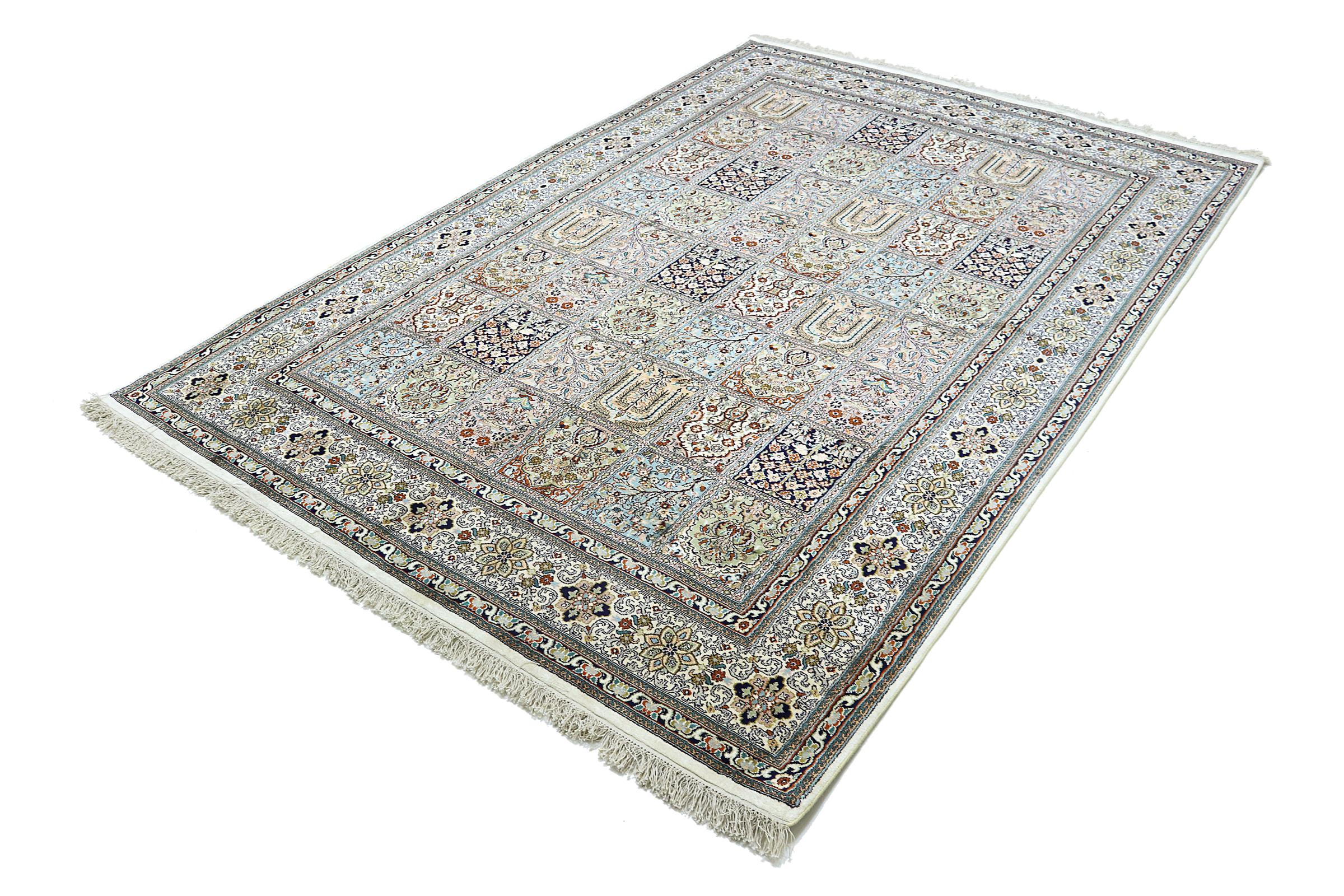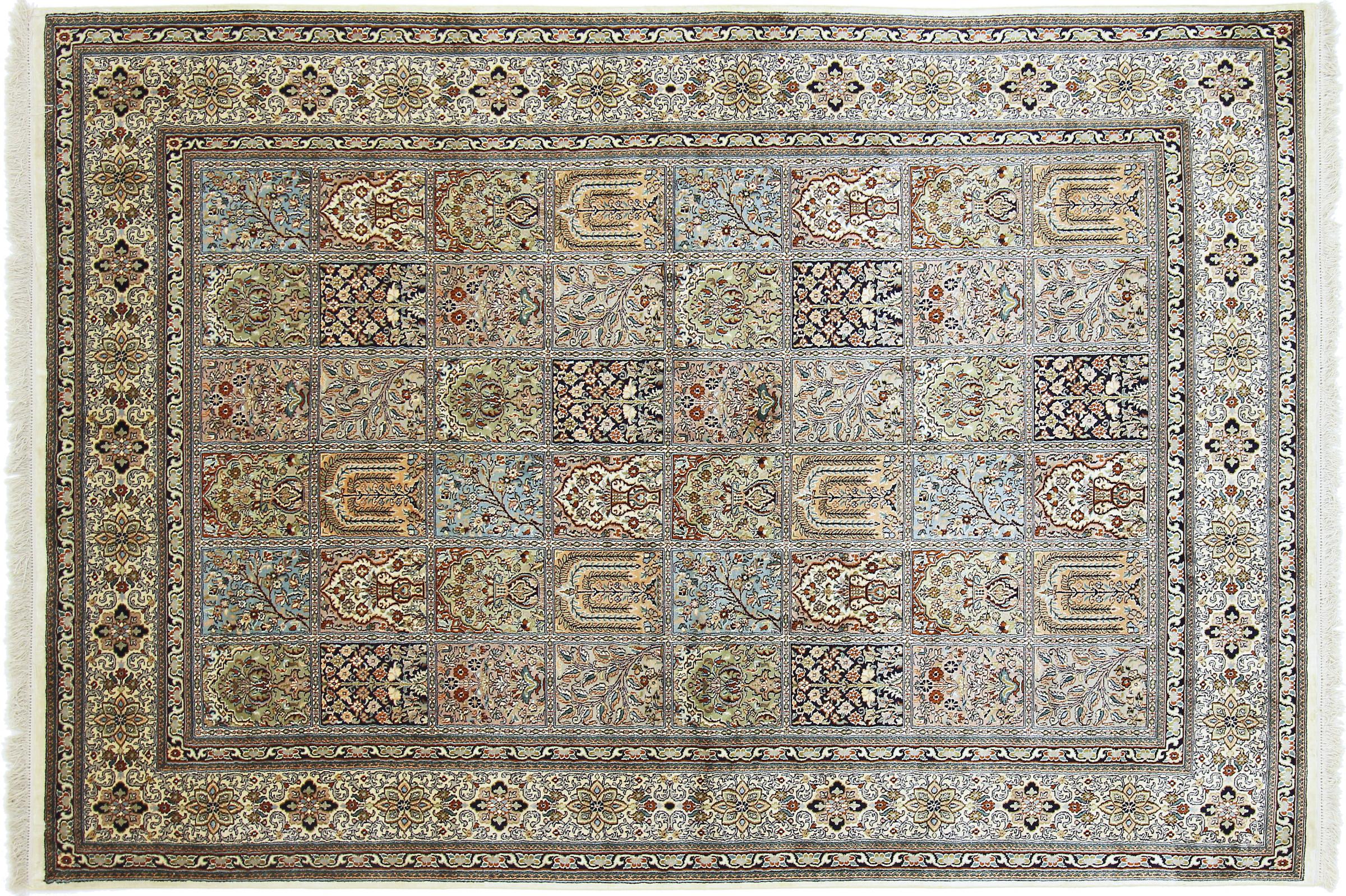 Dette håndknyttede silketæppe fra Kashmir afspejler de indiske tæppevæveres dygtighed. Ikke alene er det lavet af ren silke, men knudetætheden er så fin, at kun meget erfarne vævere kan skabe sådan et værk. Den fine natursilke er et fascinerende highlight. Den er ikke bare særlig blød at røre ved, men lader også farverne skinne i en lang række facetter. Afhængigt af lysindfaldet kommer der helt nye detaljer og farver til syne, som vil blive ved med at imponere i mange år fremover. Man kan se på et tæppe som dette i timevis og glemme alt om tid - en oplevelse, der ikke kan indfanges på et foto.
