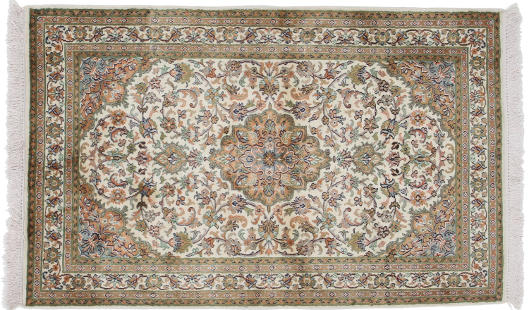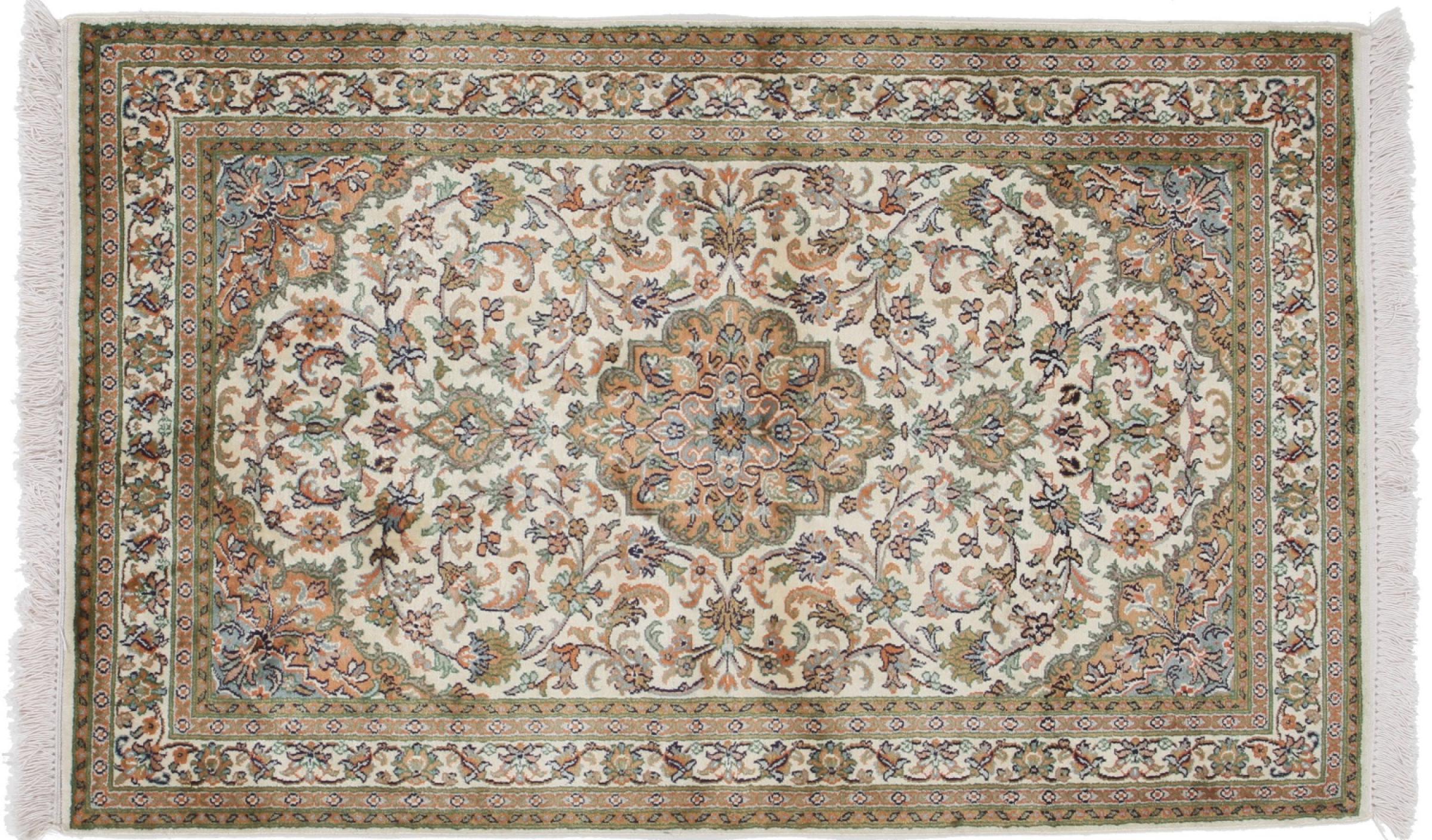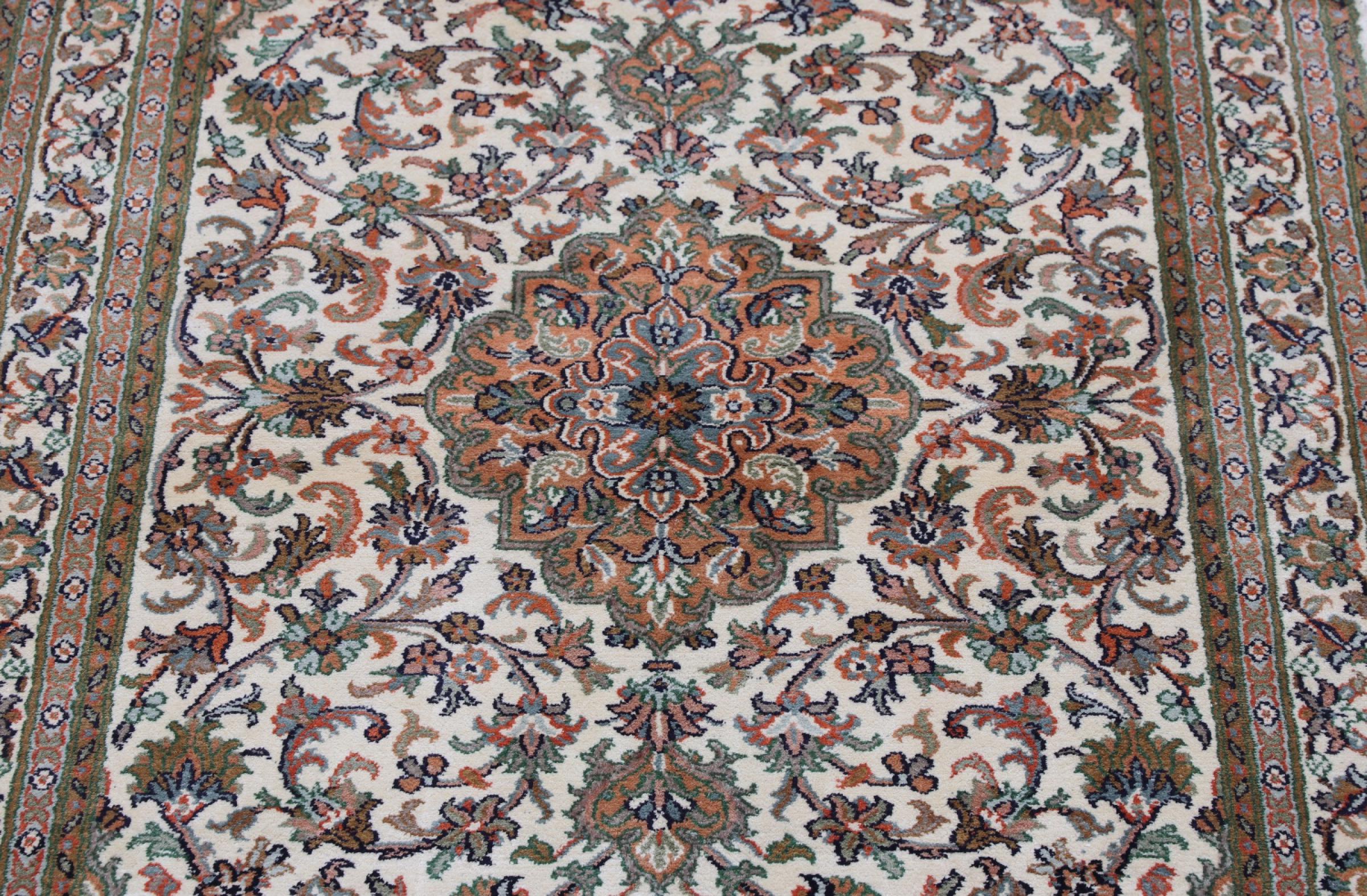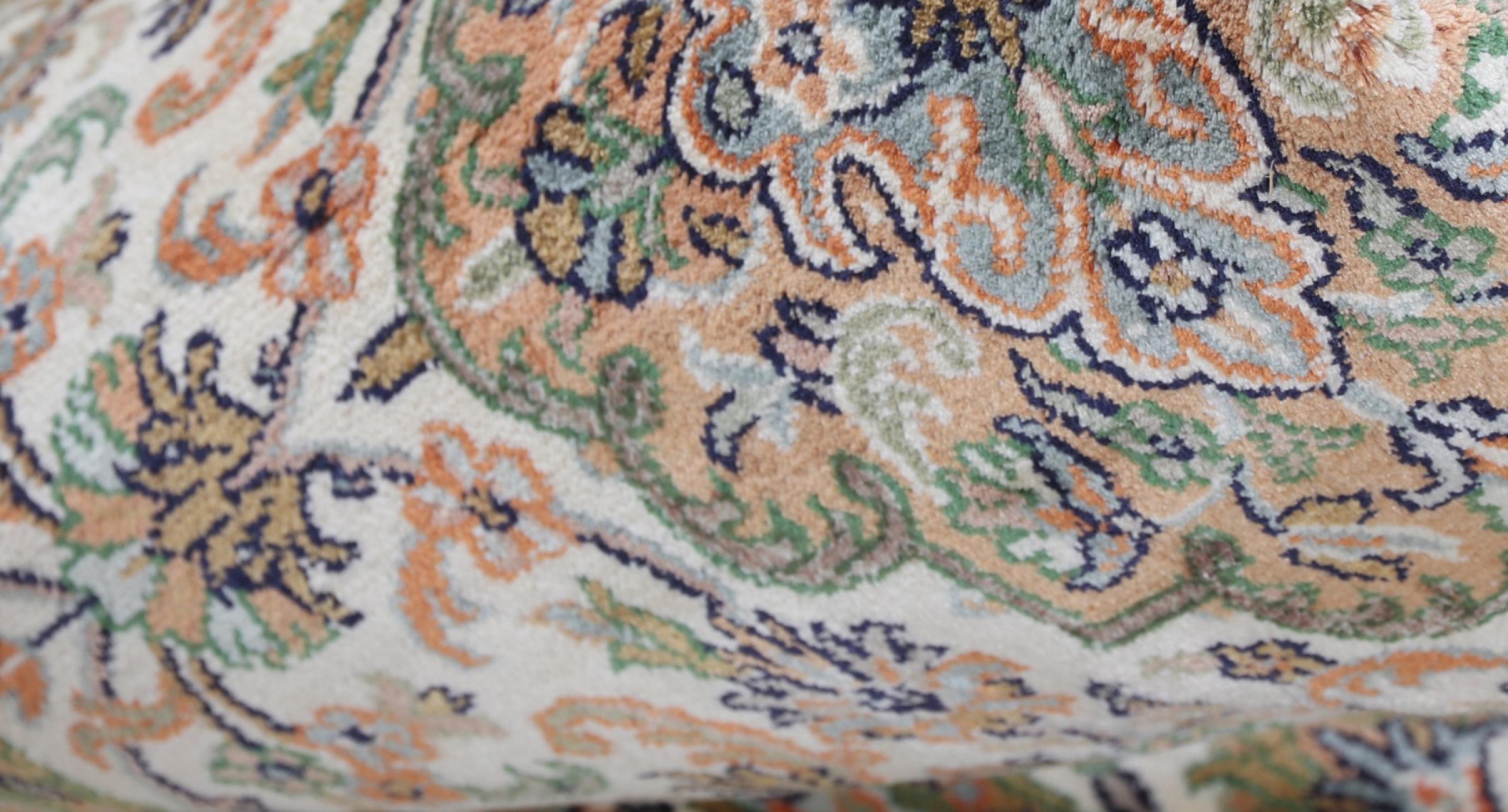 Dette håndknyttede silketæppe fra Kashmir afspejler de indiske tæppevæveres dygtighed. Ikke alene er det lavet af ren silke, men knudetætheden er så fin, at kun meget erfarne vævere kan skabe sådan et værk. Den fine natursilke er et fascinerende highlight. Den er ikke bare særlig blød at røre ved, men lader også farverne skinne i en lang række facetter. Afhængigt af lysindfaldet kommer der helt nye detaljer og farver til syne, som vil blive ved med at imponere i mange år fremover. Man kan se på et tæppe som dette i timevis og glemme alt om tid - en oplevelse, der ikke kan indfanges på et foto.