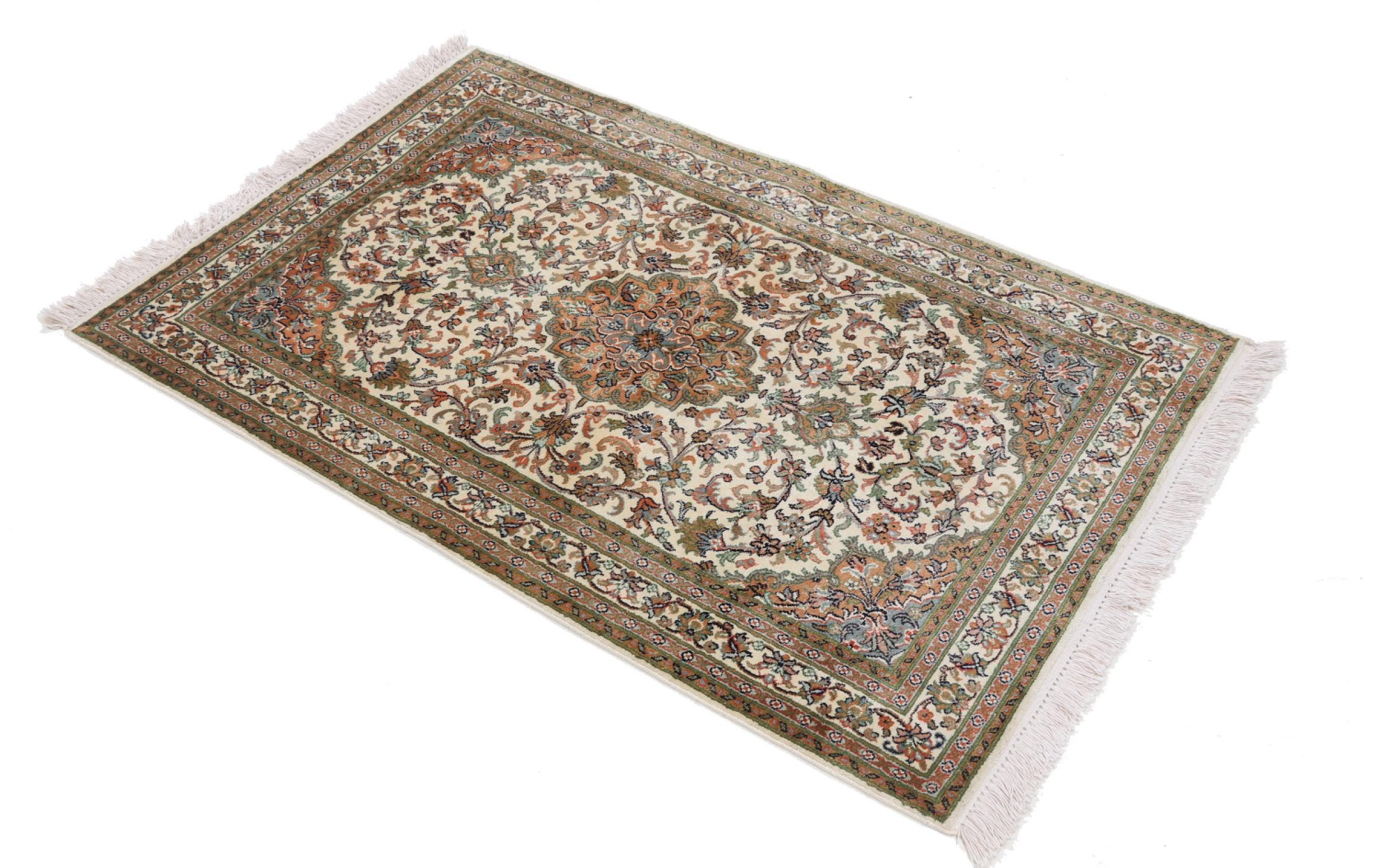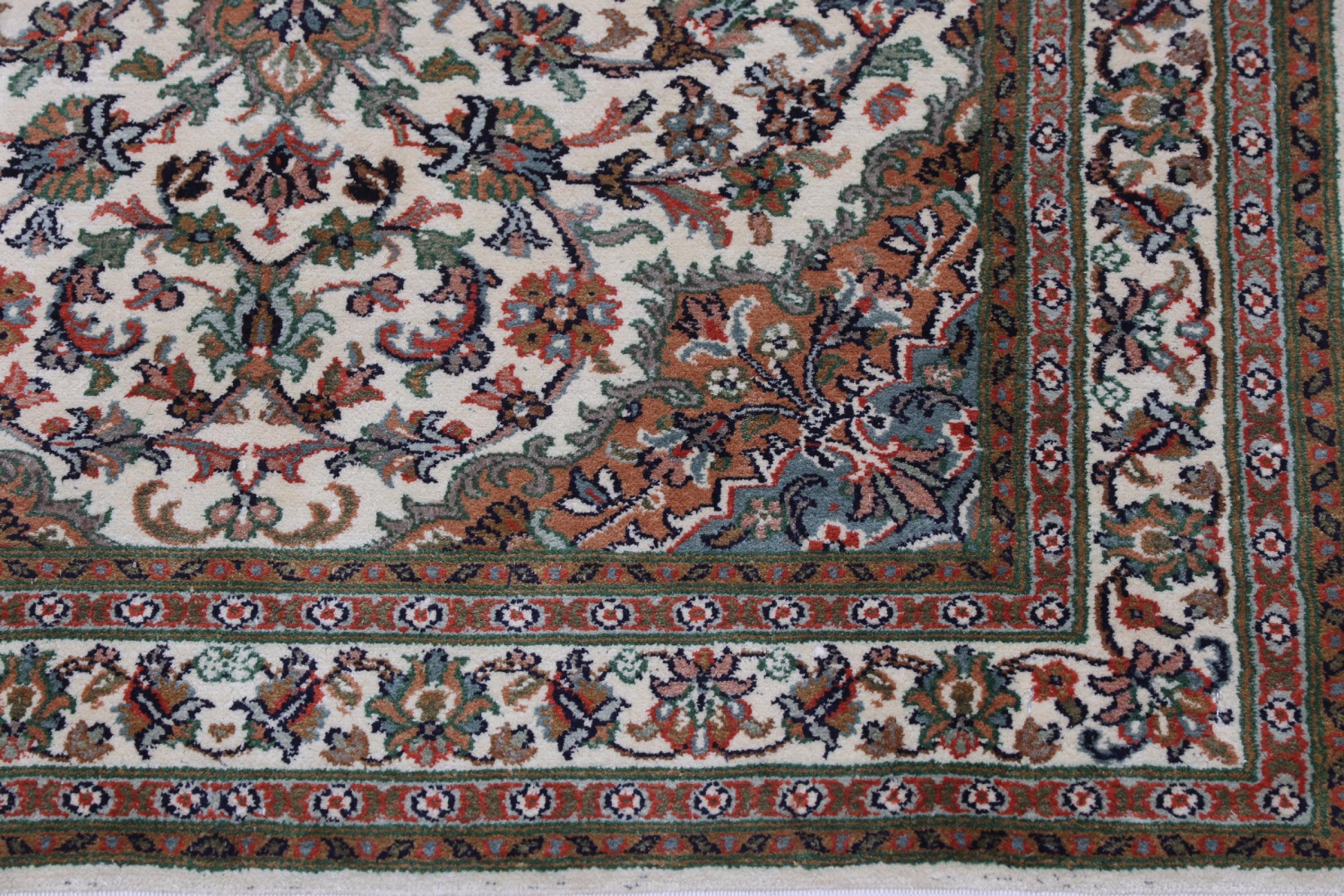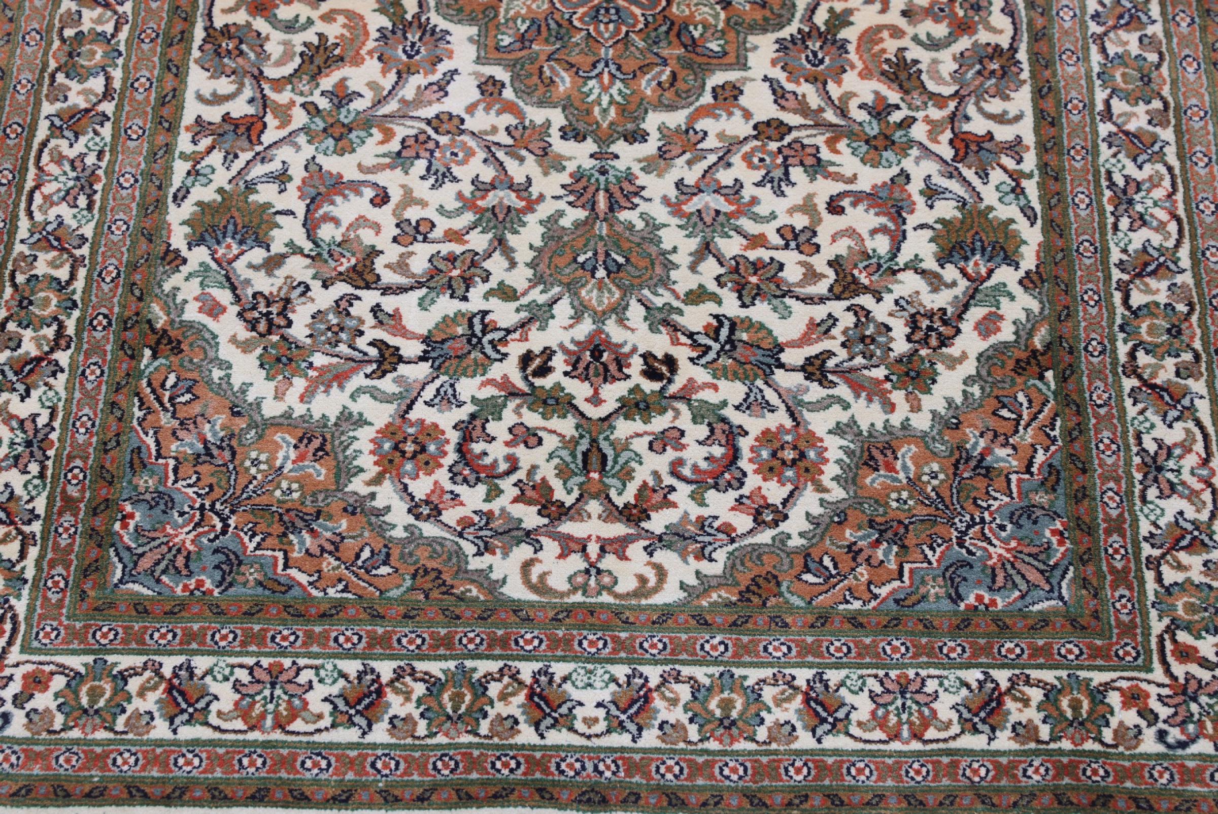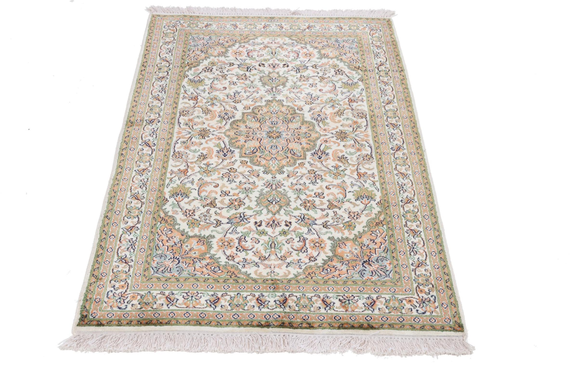 Dette håndknyttede silketæppe fra Kashmir afspejler de indiske tæppevæveres dygtighed. Ikke alene er det lavet af ren silke, men knudetætheden er så fin, at kun meget erfarne vævere kan skabe sådan et værk. Den fine natursilke er et fascinerende highlight. Den er ikke bare særlig blød at røre ved, men lader også farverne skinne i en lang række facetter. Afhængigt af lysindfaldet kommer der helt nye detaljer og farver til syne, som vil blive ved med at imponere i mange år fremover. Man kan se på et tæppe som dette i timevis og glemme alt om tid - en oplevelse, der ikke kan indfanges på et foto.