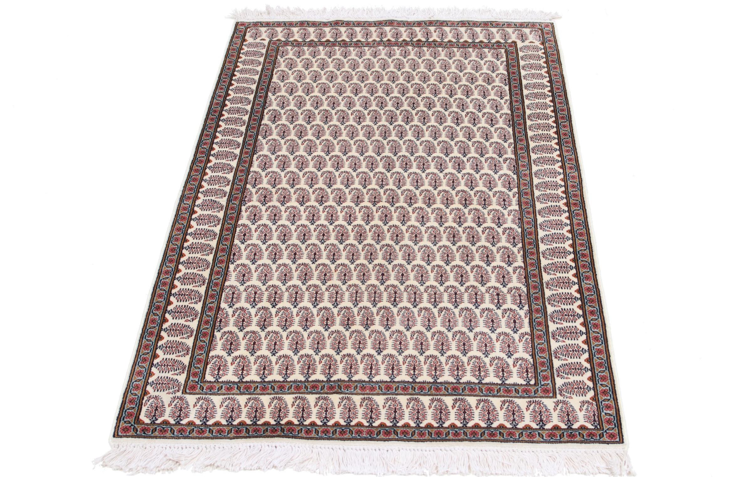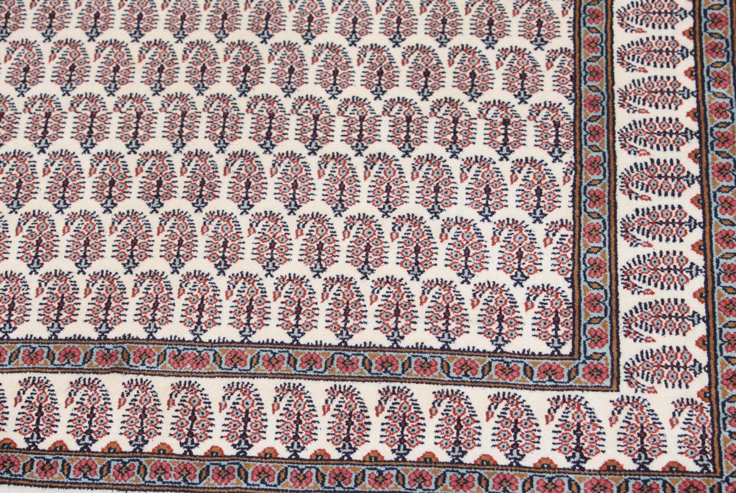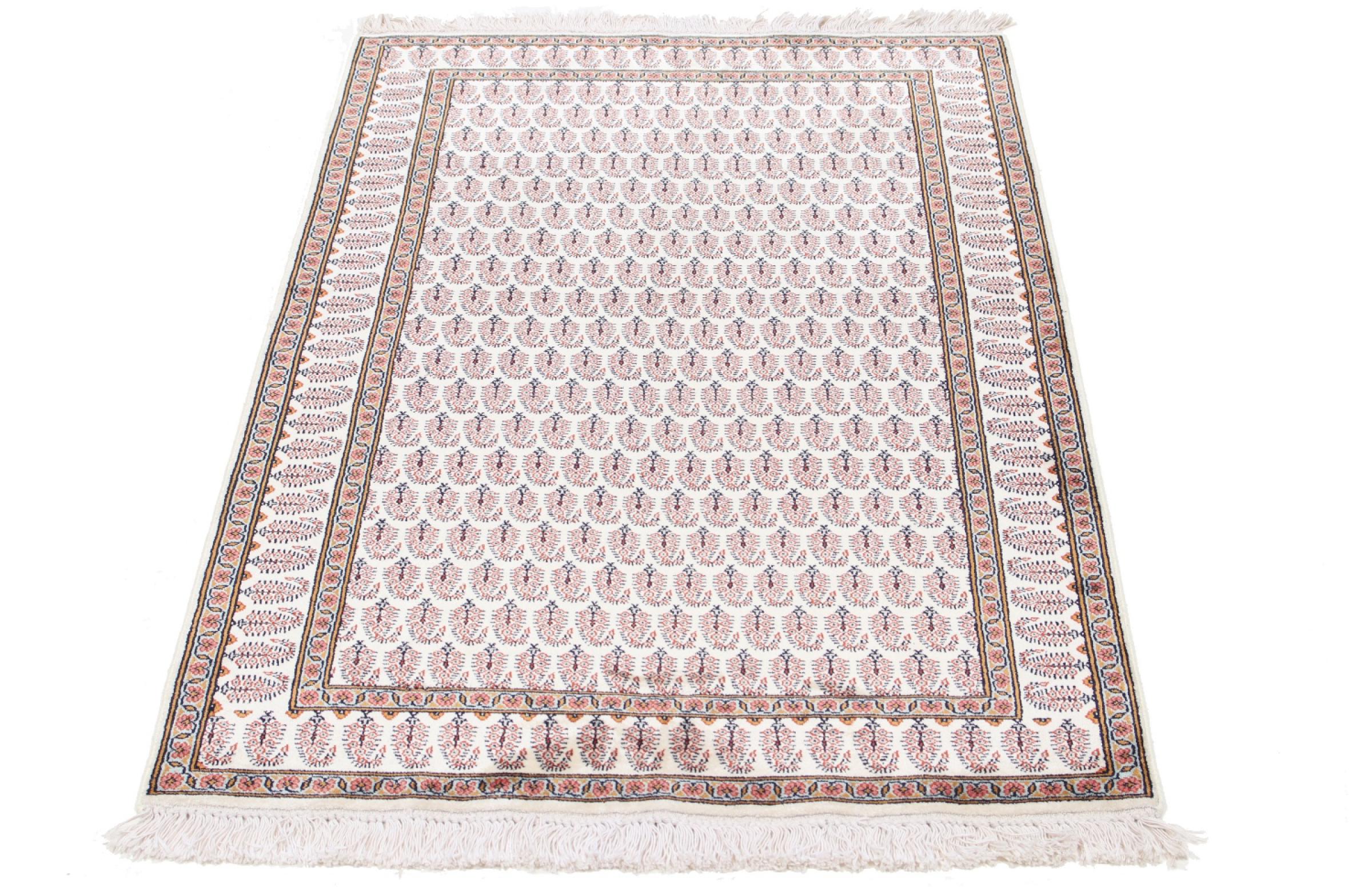 Dette håndknyttede silketæppe fra Kashmir afspejler de indiske tæppevæveres dygtighed. Ikke alene er det lavet af ren silke, men knudetætheden er så fin, at kun meget erfarne vævere kan skabe sådan et værk. Den fine natursilke er et fascinerende highlight. Den er ikke bare særlig blød at røre ved, men lader også farverne skinne i en lang række facetter. Afhængigt af lysindfaldet kommer der helt nye detaljer og farver til syne, som vil blive ved med at imponere i mange år fremover. Man kan se på et tæppe som dette i timevis og glemme alt om tid - en oplevelse, der ikke kan indfanges på et foto.