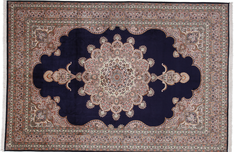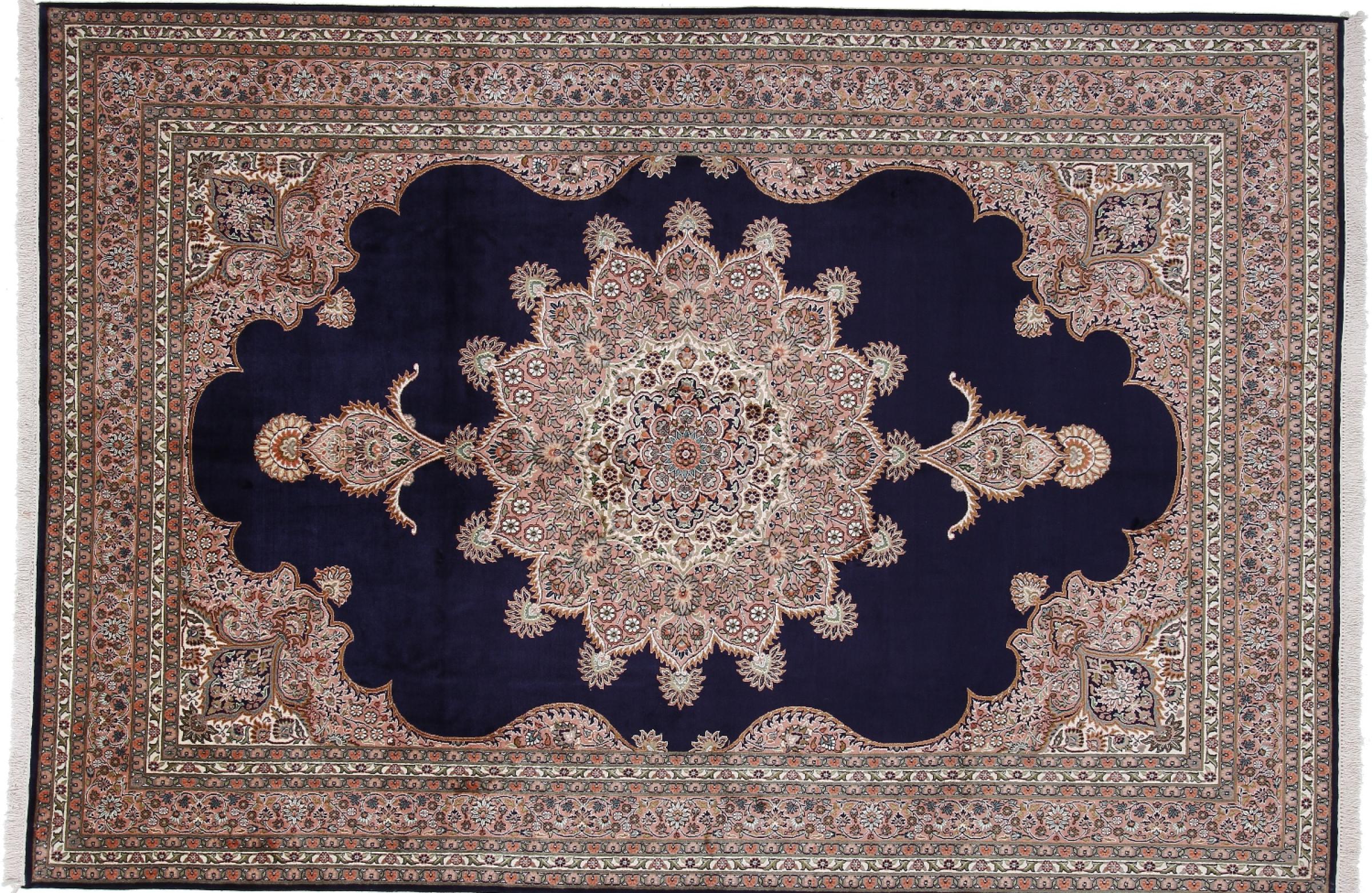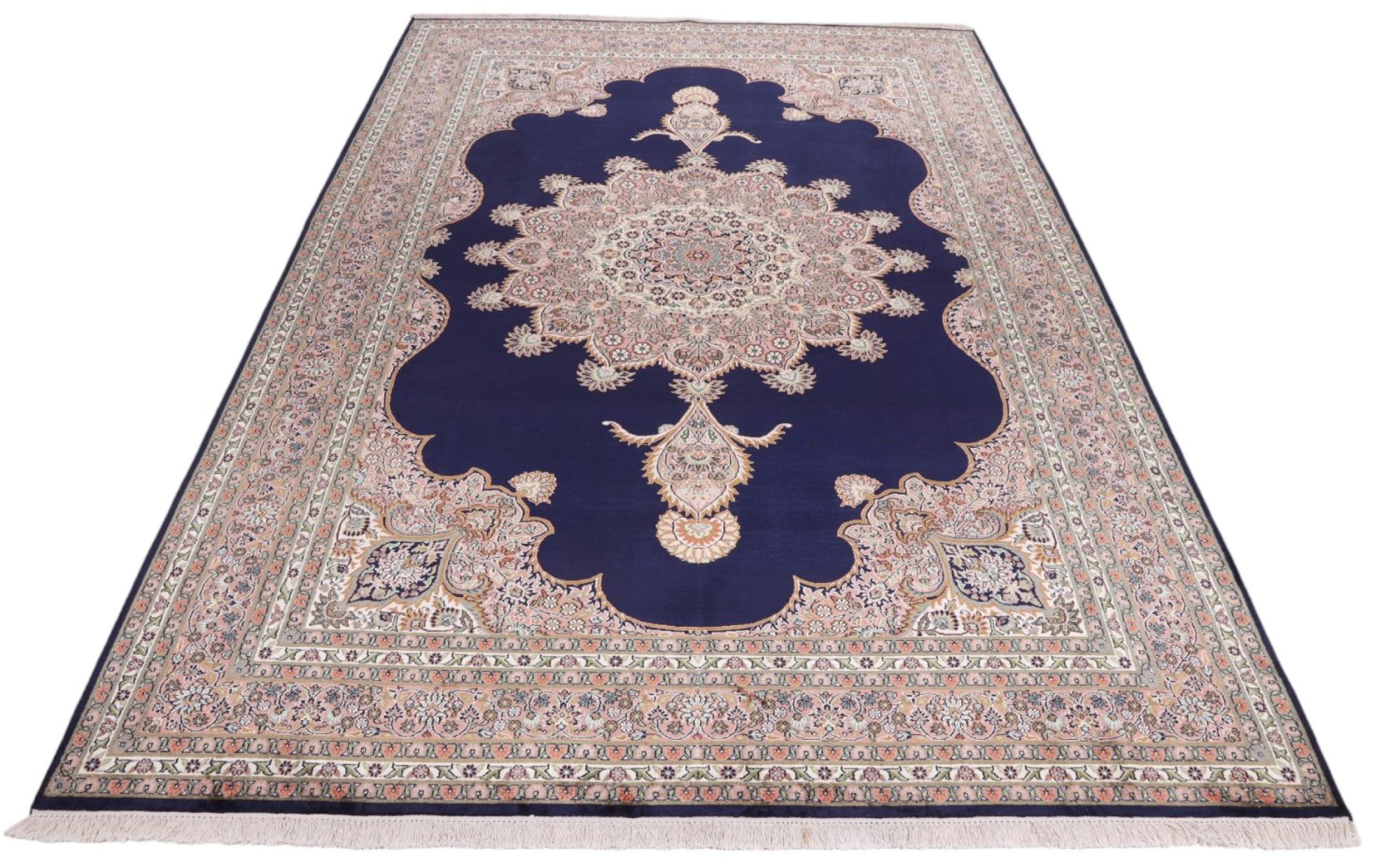 Dette håndknyttede silketæppe fra Kashmir afspejler de indiske tæppevæveres dygtighed. Ikke alene er det lavet af ren silke, men knudetætheden er så fin, at kun meget erfarne vævere kan skabe sådan et værk. Den fine natursilke er et fascinerende highlight. Den er ikke bare særlig blød at røre ved, men lader også farverne skinne i en lang række facetter. Afhængigt af lysindfaldet kommer der helt nye detaljer og farver til syne, som vil blive ved med at imponere i mange år fremover. Man kan se på et tæppe som dette i timevis og glemme alt om tid - en oplevelse, der ikke kan indfanges på et foto.