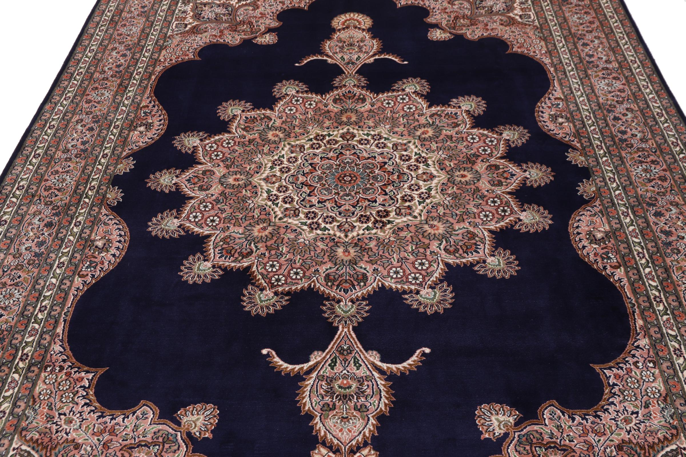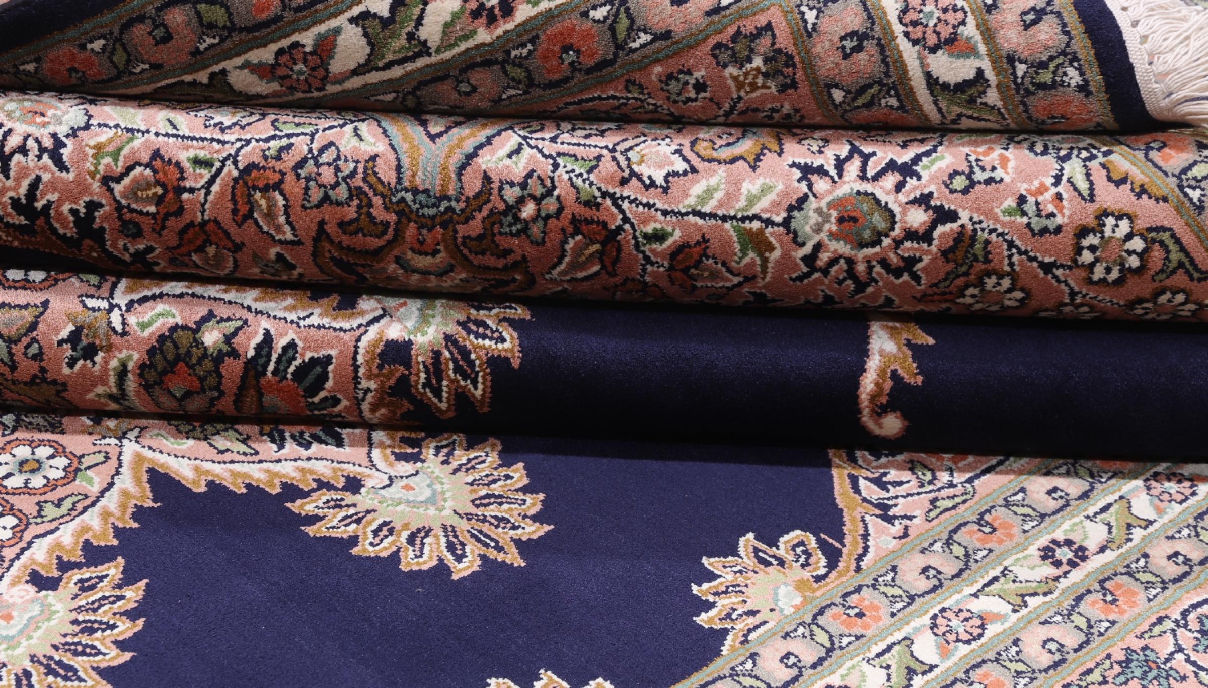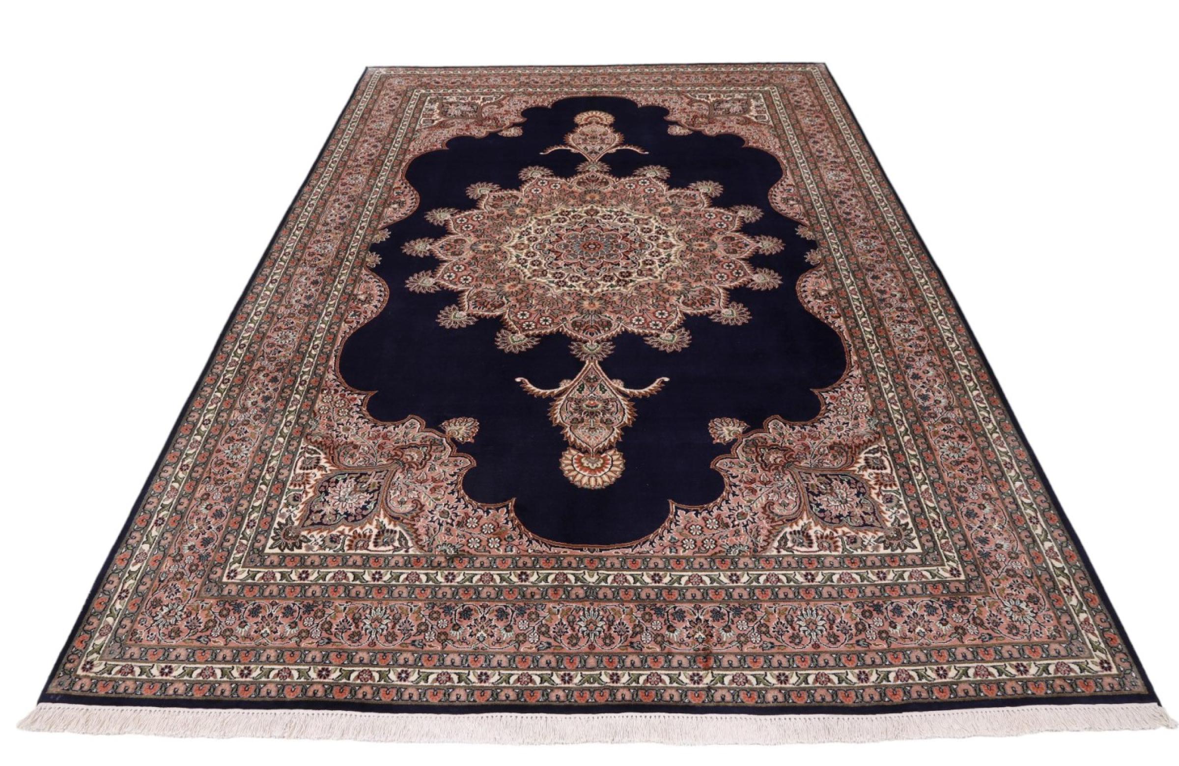 Dette håndknyttede silketæppe fra Kashmir afspejler de indiske tæppevæveres dygtighed. Ikke alene er det lavet af ren silke, men knudetætheden er så fin, at kun meget erfarne vævere kan skabe sådan et værk. Den fine natursilke er et fascinerende highlight. Den er ikke bare særlig blød at røre ved, men lader også farverne skinne i en lang række facetter. Afhængigt af lysindfaldet kommer der helt nye detaljer og farver til syne, som vil blive ved med at imponere i mange år fremover. Man kan se på et tæppe som dette i timevis og glemme alt om tid - en oplevelse, der ikke kan indfanges på et foto.