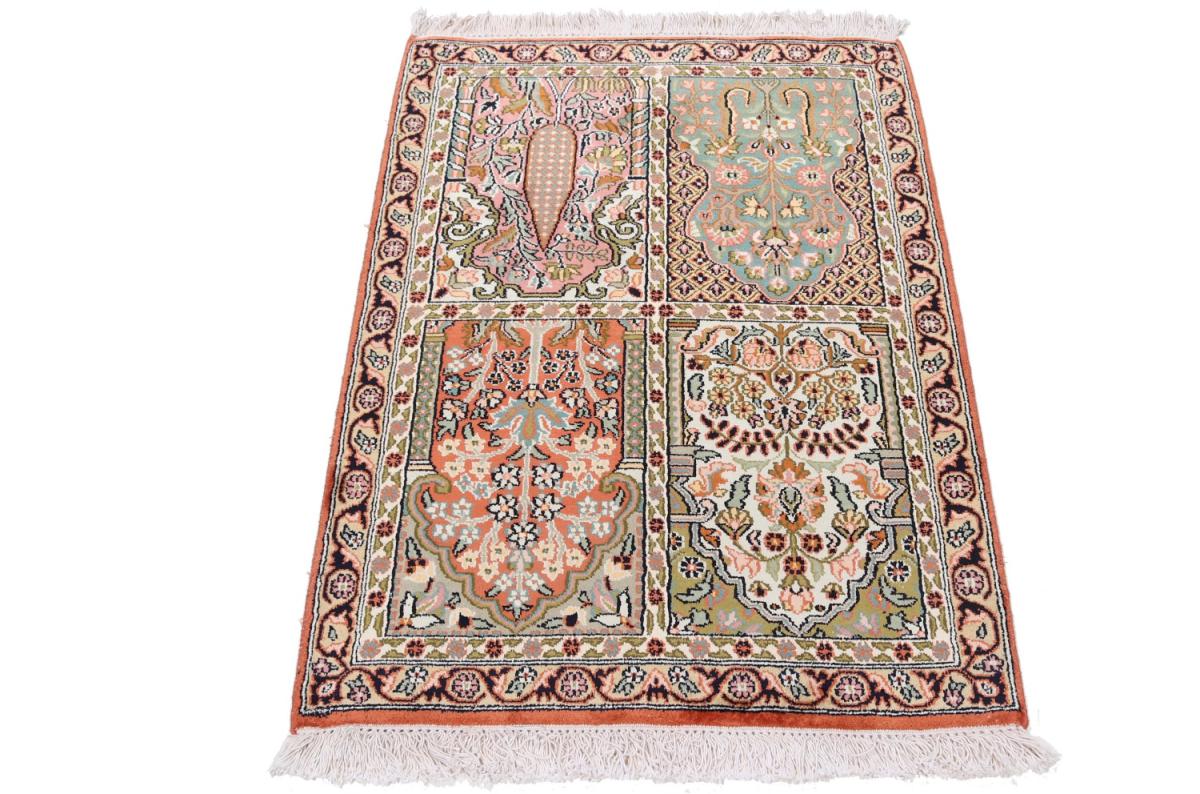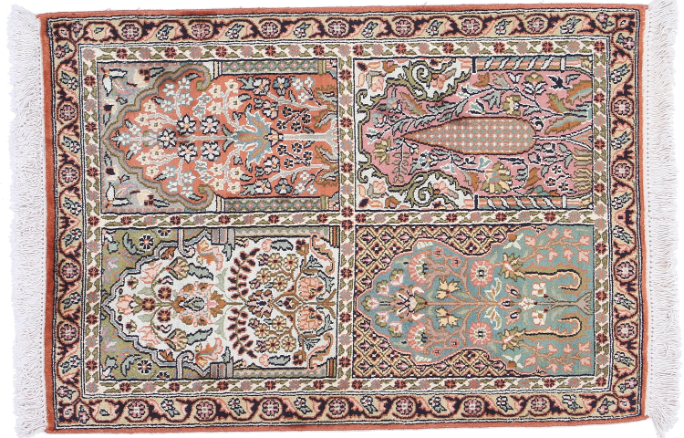 Dette håndknyttede silketæppe fra Kashmir afspejler de indiske tæppevæveres dygtighed. Ikke alene er det lavet af ren silke, men knudetætheden er så fin, at kun meget erfarne vævere kan skabe sådan et værk. Den fine natursilke er et fascinerende highlight. Den er ikke bare særlig blød at røre ved, men lader også farverne skinne i en lang række facetter. Afhængigt af lysindfaldet kommer der helt nye detaljer og farver til syne, som vil blive ved med at imponere i mange år fremover. Man kan se på et tæppe som dette i timevis og glemme alt om tid - en oplevelse, der ikke kan indfanges på et foto.