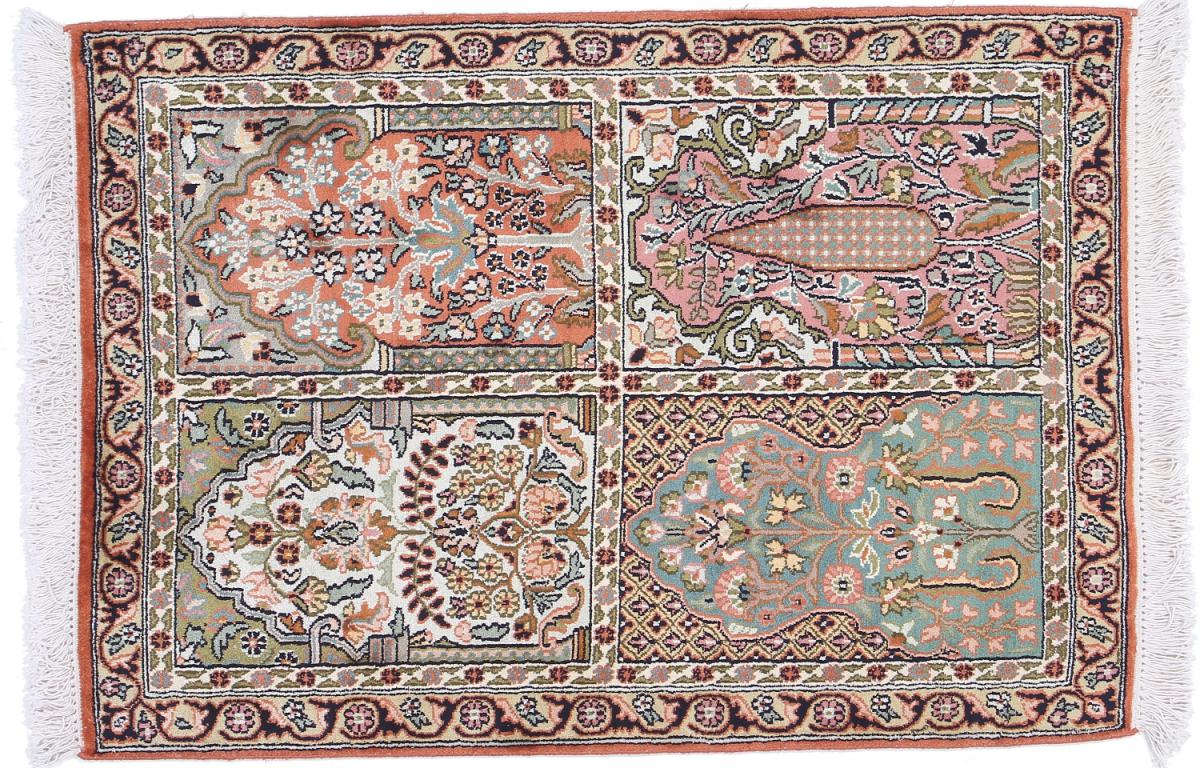 Tæppe-nr.: 47140056207 Størrelse: 88x63 cm Tykkelse: ca. 4 mm Knuder: 600 000 / m² Forarbejdelse: Knyttet i hånden Luv: Silke Kæde: Bomuld Oprindelse: Indien Alder: Ny Vægt: ca. 1 kg Antal på lager: Unik - Kun 1 tilbage på lager