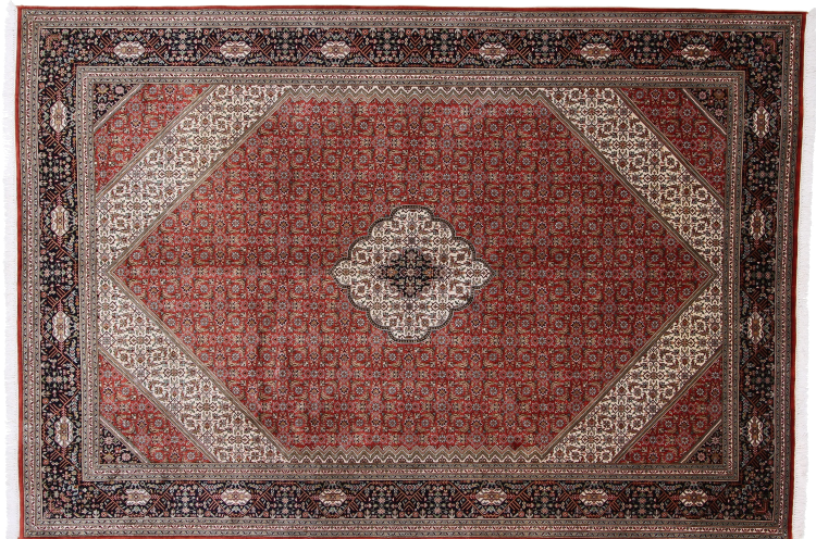 Dette håndknyttede silketæppe fra Kashmir afspejler de indiske tæppevæveres dygtighed. Ikke alene er det lavet af ren silke, men knudetætheden er så fin, at kun meget erfarne vævere kan skabe sådan et værk. Den fine natursilke er et fascinerende highlight. Den er ikke bare særlig blød at røre ved, men lader også farverne skinne i en lang række facetter. Afhængigt af lysindfaldet kommer der helt nye detaljer og farver til syne, som vil blive ved med at imponere i mange år fremover. Man kan se på et tæppe som dette i timevis og glemme alt om tid - en oplevelse, der ikke kan indfanges på et foto.