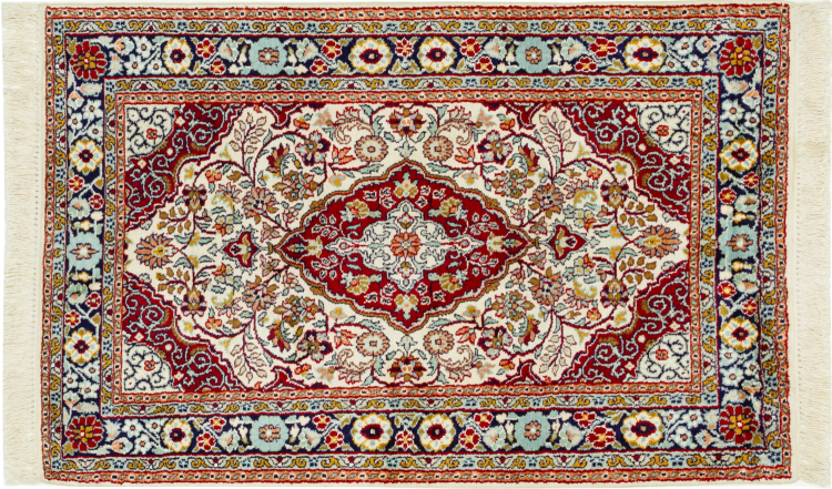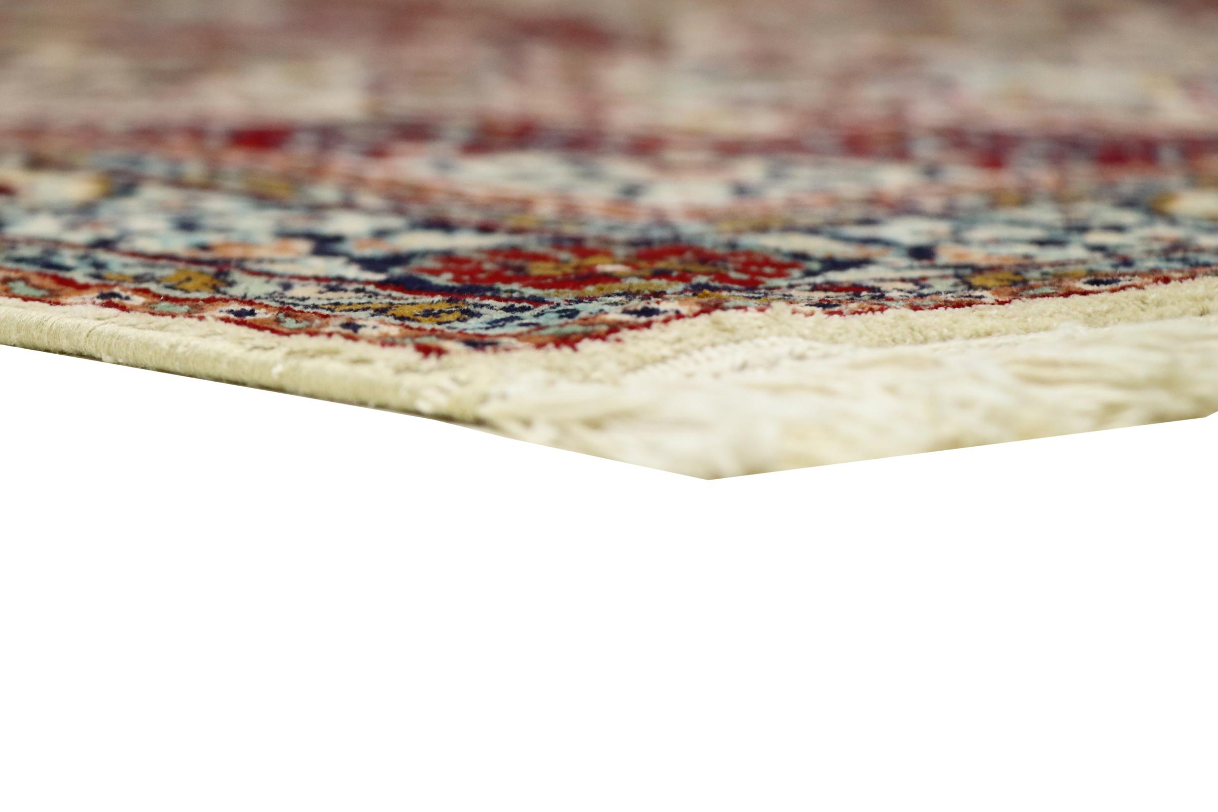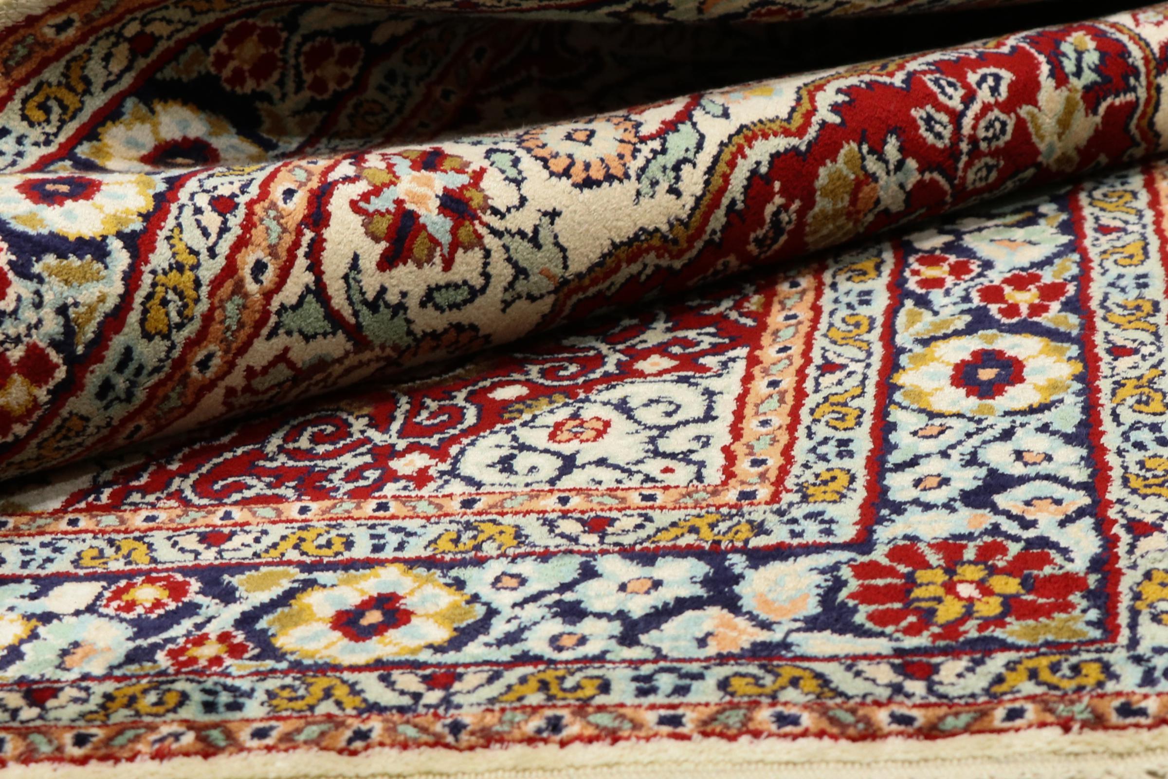 Dette håndknyttede silketæppe fra Kashmir afspejler de indiske tæppevæveres dygtighed. Ikke alene er det lavet af ren silke, men knudetætheden er så fin, at kun meget erfarne vævere kan skabe sådan et værk. Den fine natursilke er et fascinerende highlight. Den er ikke bare særlig blød at røre ved, men lader også farverne skinne i en lang række facetter. Afhængigt af lysindfaldet kommer der helt nye detaljer og farver til syne, som vil blive ved med at imponere i mange år fremover. Man kan se på et tæppe som dette i timevis og glemme alt om tid - en oplevelse, der ikke kan indfanges på et foto.