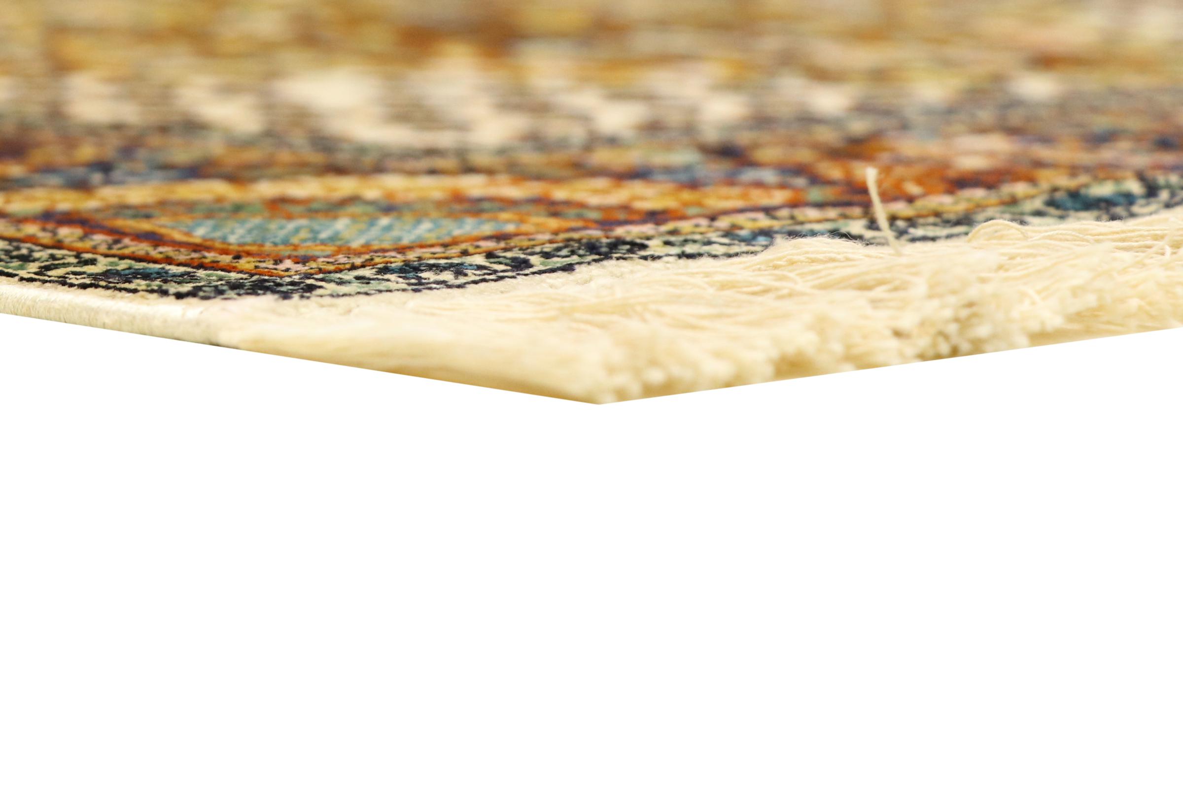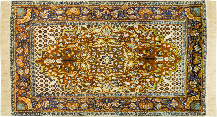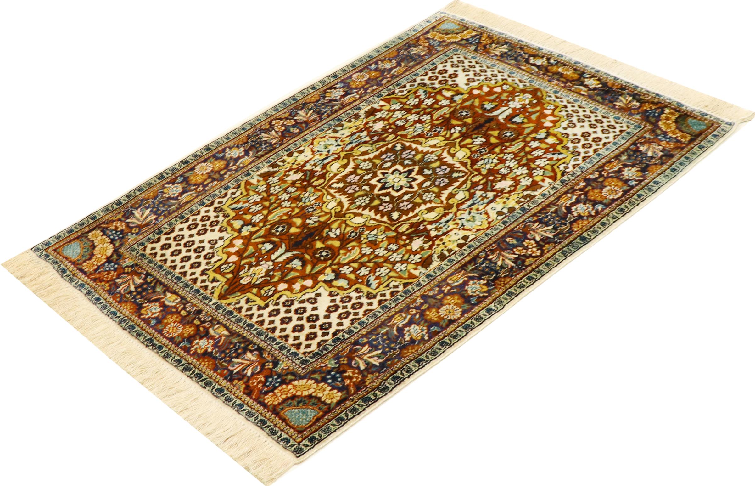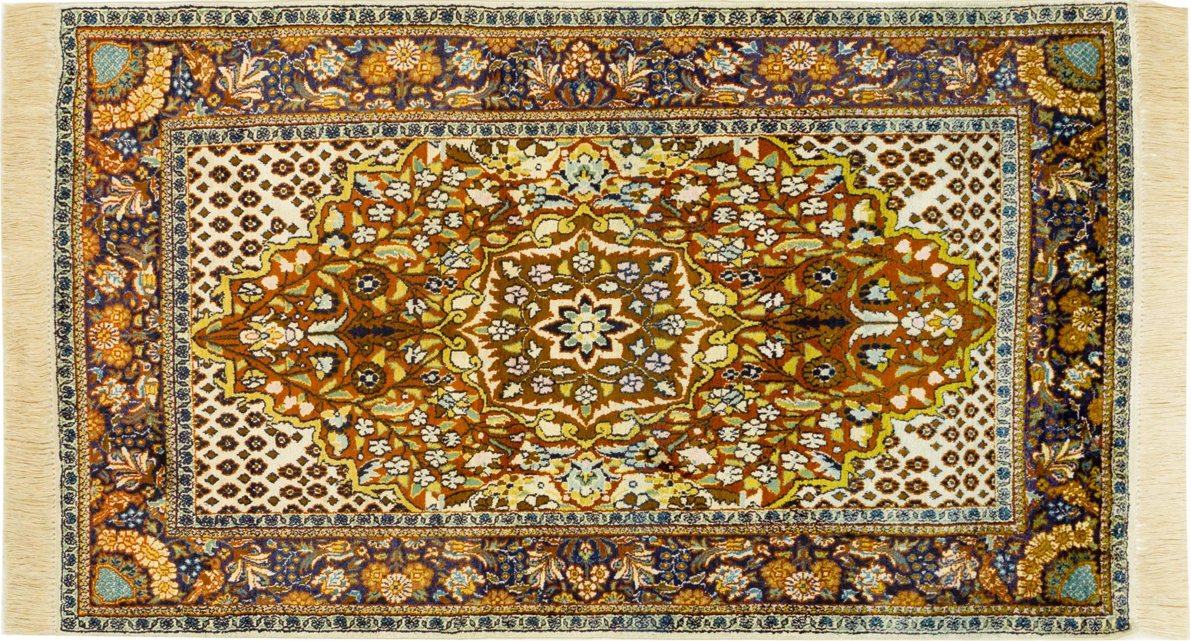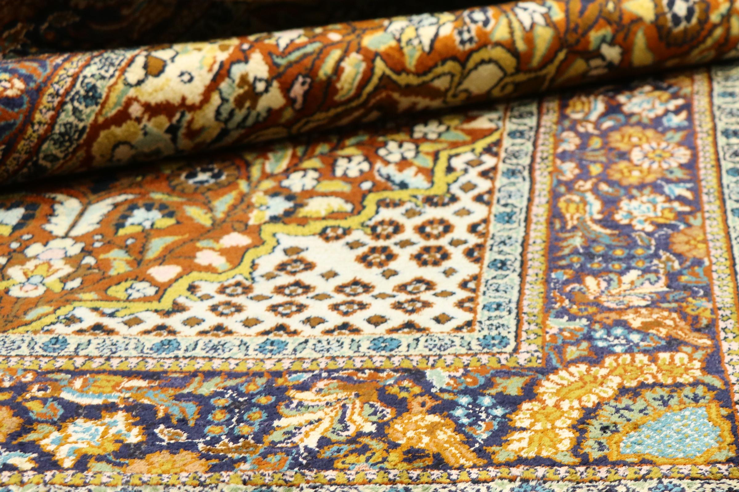 Dette håndknyttede silketæppe fra Kashmir afspejler de indiske tæppevæveres dygtighed. Ikke alene er det lavet af ren silke, men knudetætheden er så fin, at kun meget erfarne vævere kan skabe sådan et værk. Den fine natursilke er et fascinerende highlight. Den er ikke bare særlig blød at røre ved, men lader også farverne skinne i en lang række facetter. Afhængigt af lysindfaldet kommer der helt nye detaljer og farver til syne, som vil blive ved med at imponere i mange år fremover. Man kan se på et tæppe som dette i timevis og glemme alt om tid - en oplevelse, der ikke kan indfanges på et foto.
