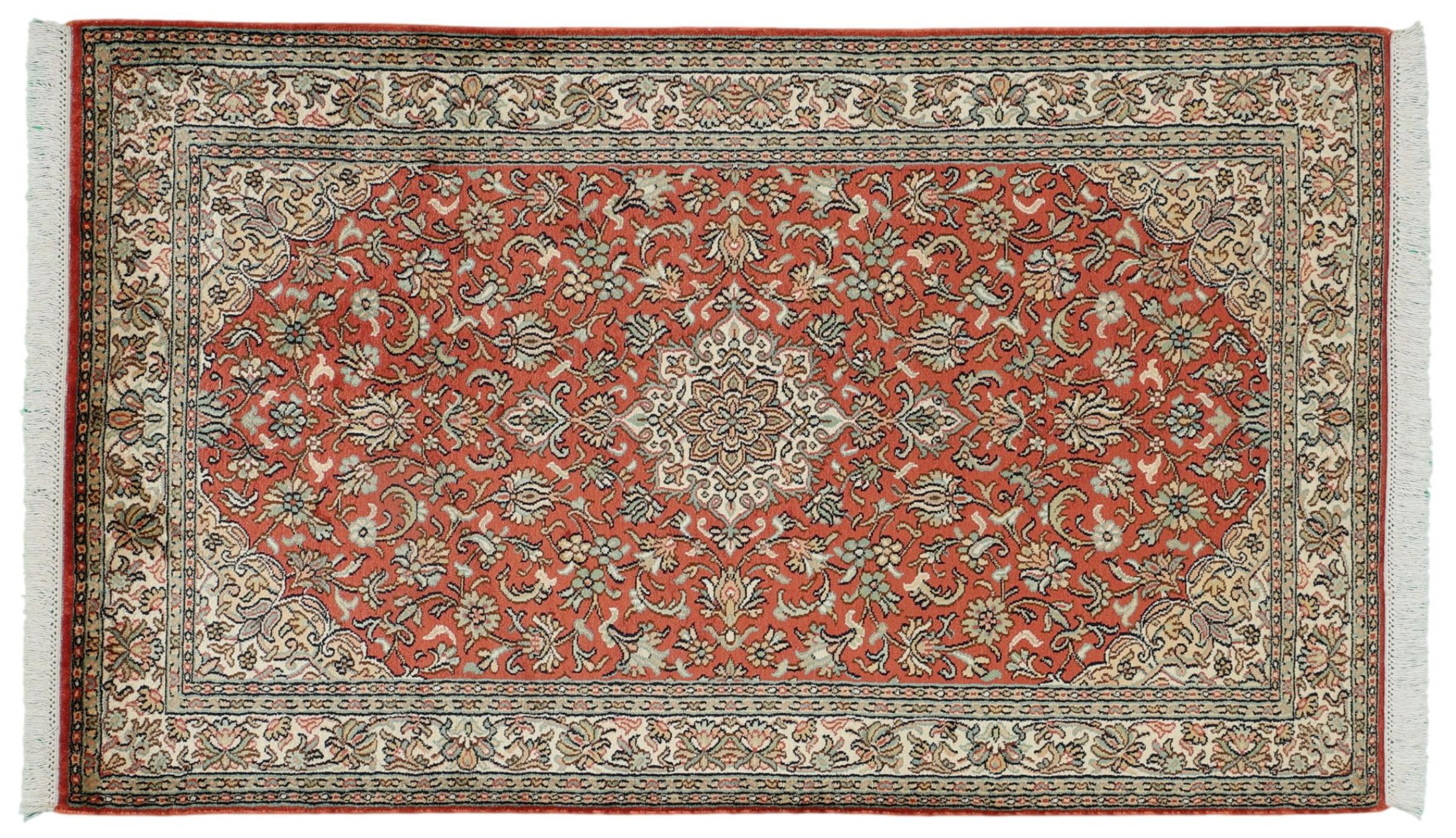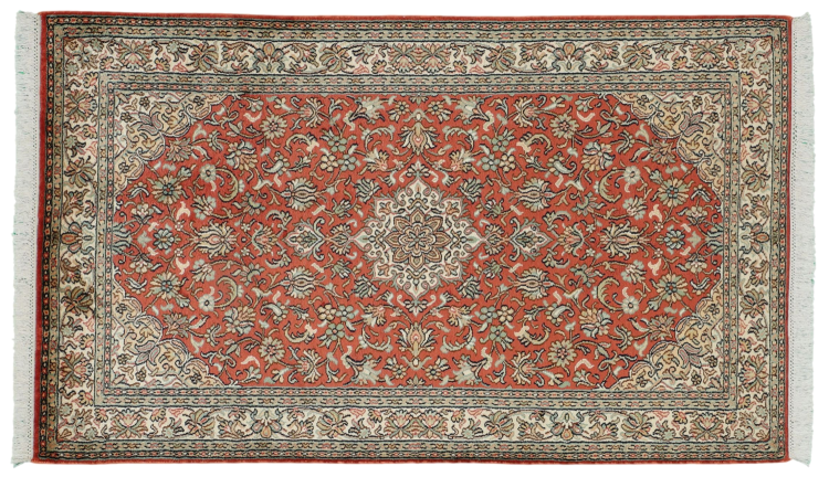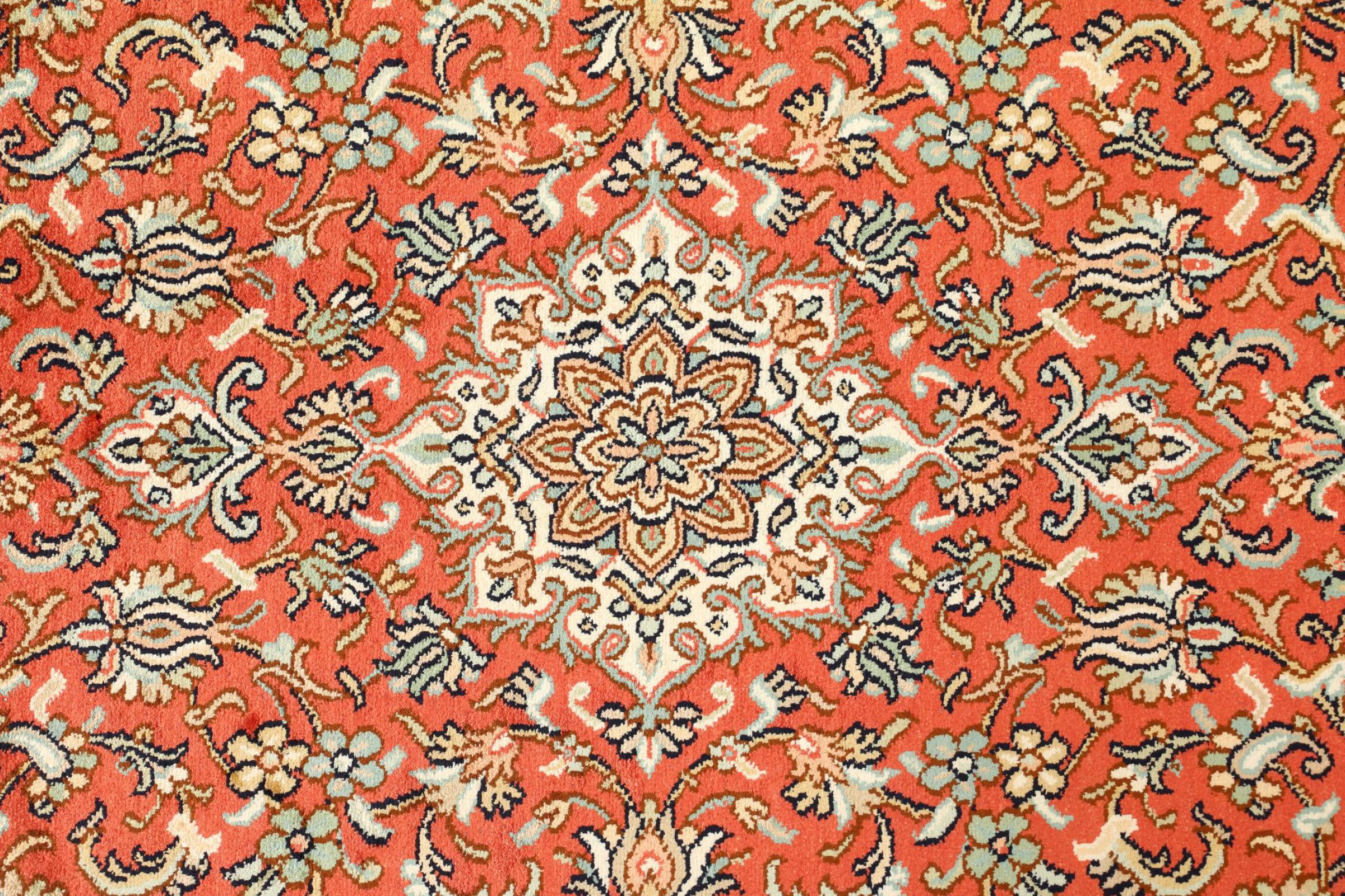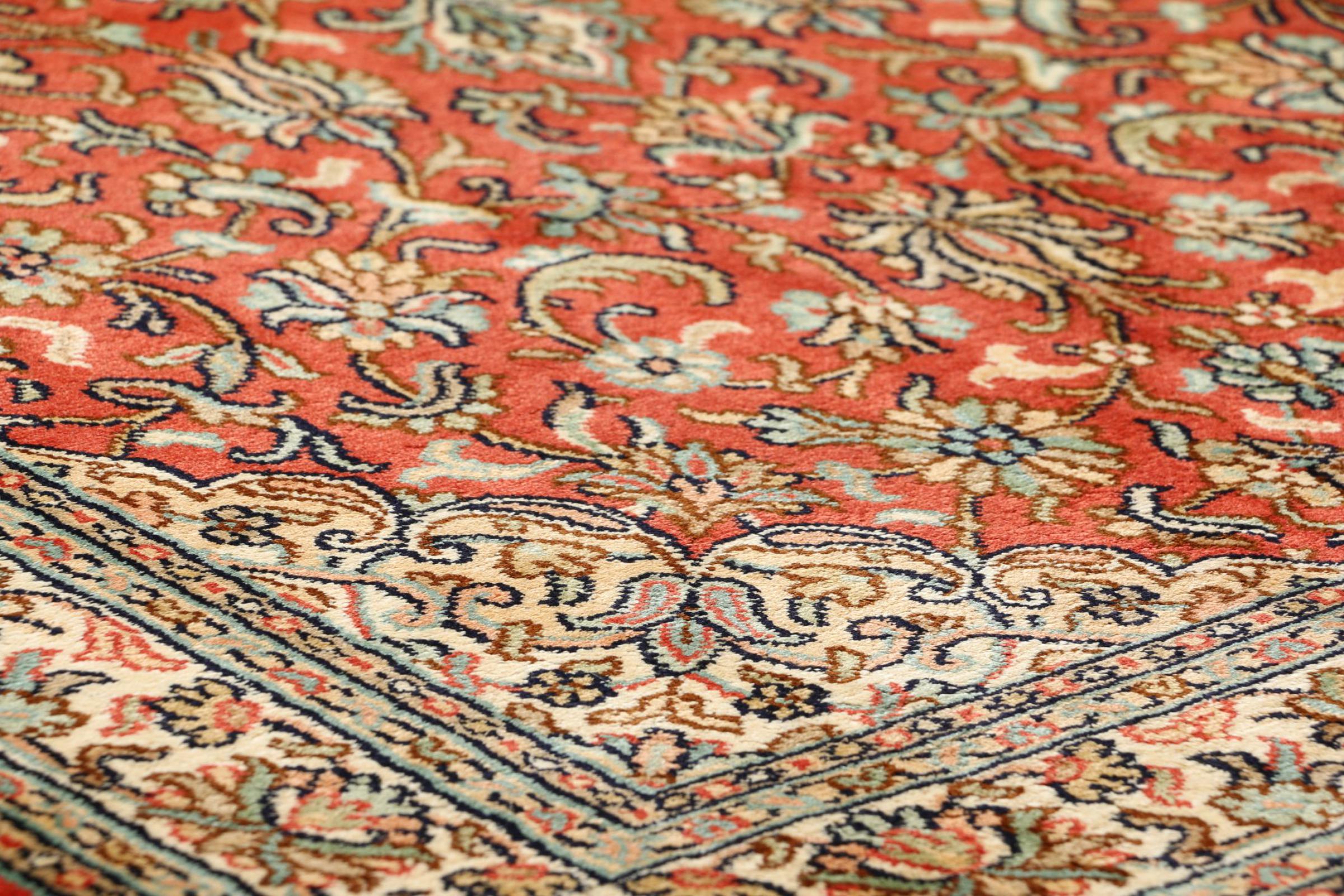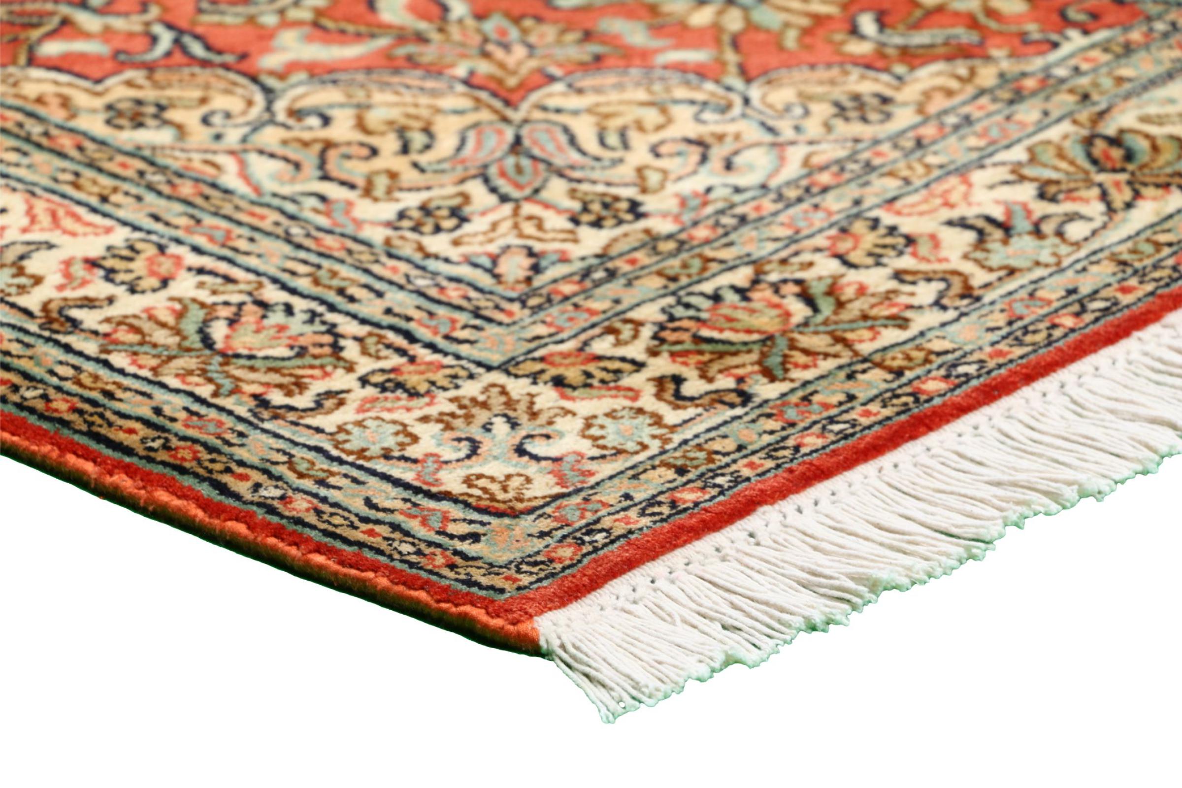 Dette håndknyttede silketæppe fra Kashmir afspejler de indiske tæppevæveres dygtighed. Ikke alene er det lavet af ren silke, men knudetætheden er så fin, at kun meget erfarne vævere kan skabe sådan et værk. Den fine natursilke er et fascinerende highlight. Den er ikke bare særlig blød at røre ved, men lader også farverne skinne i en lang række facetter. Afhængigt af lysindfaldet kommer der helt nye detaljer og farver til syne, som vil blive ved med at imponere i mange år fremover. Man kan se på et tæppe som dette i timevis og glemme alt om tid - en oplevelse, der ikke kan indfanges på et foto.