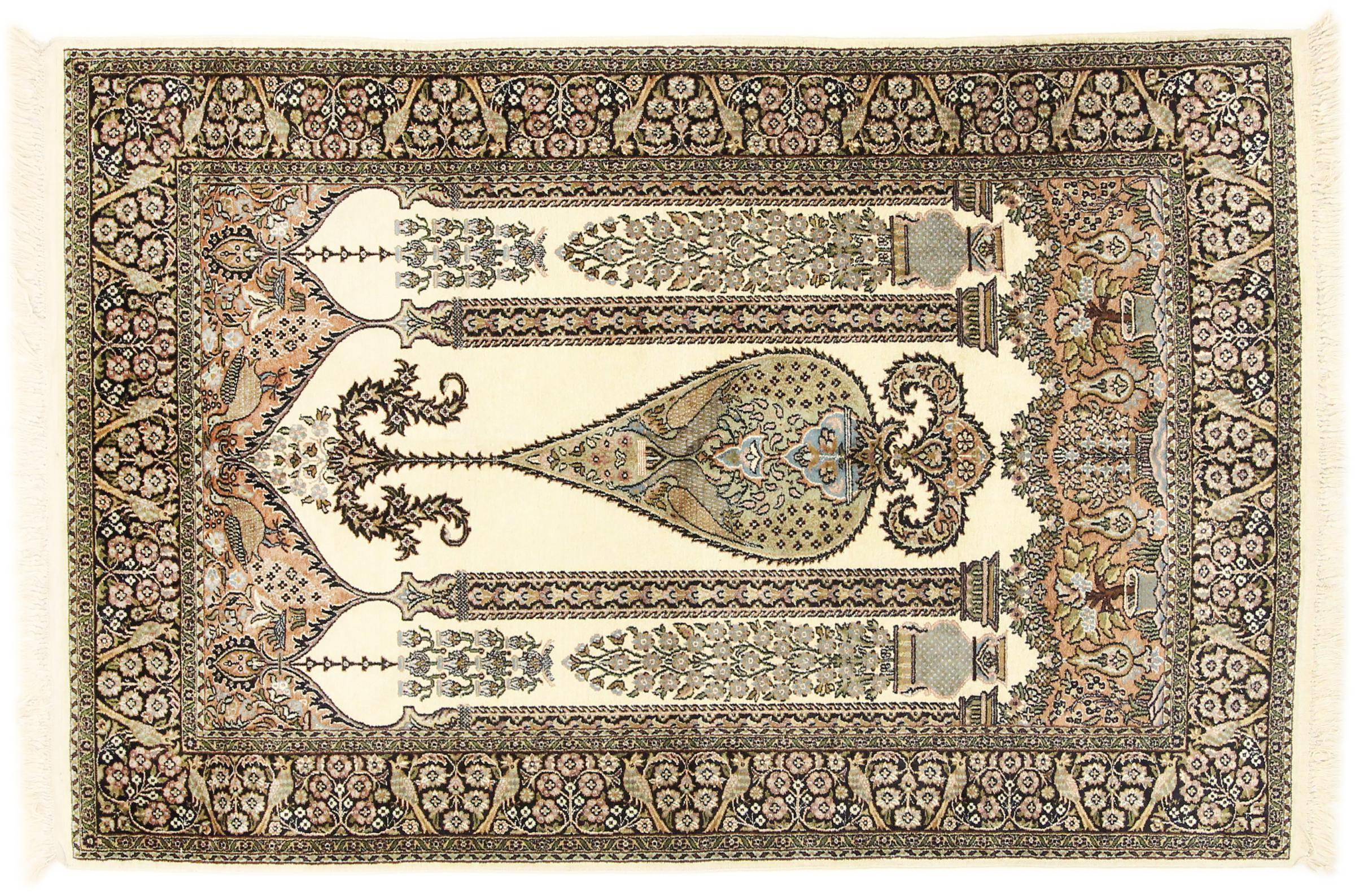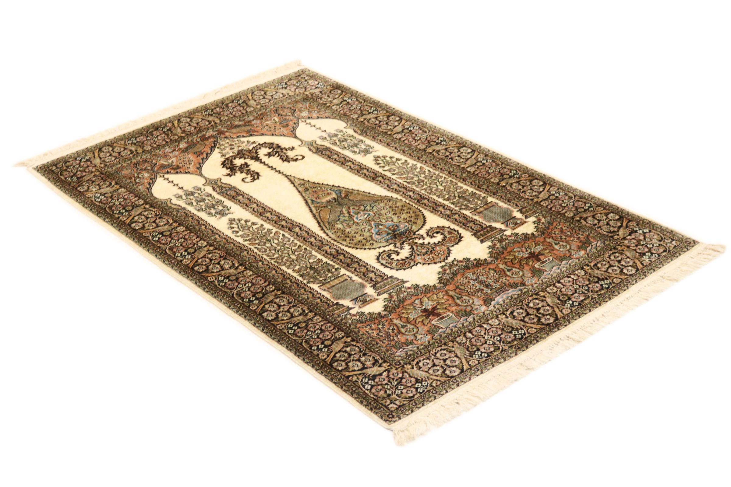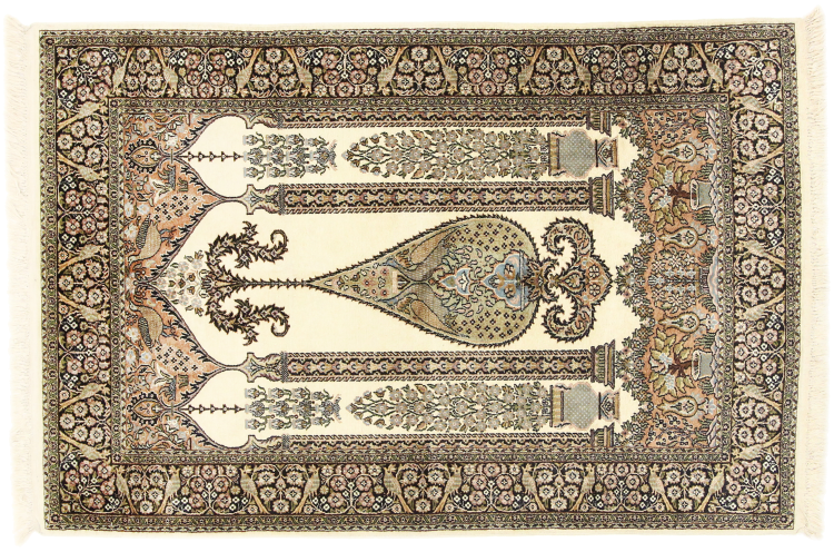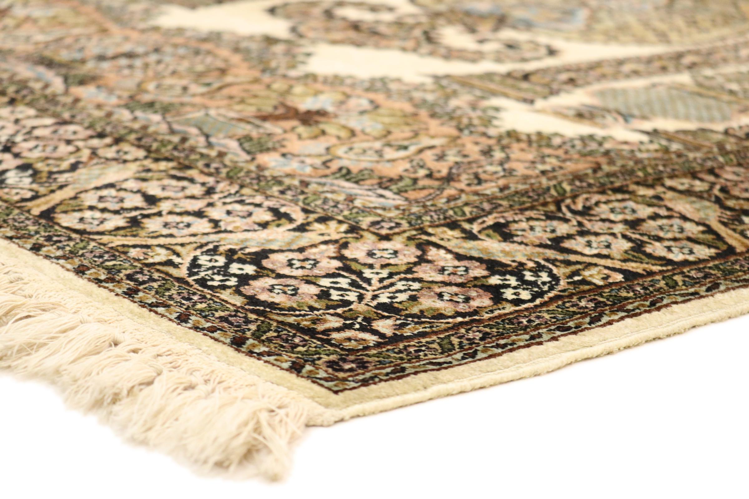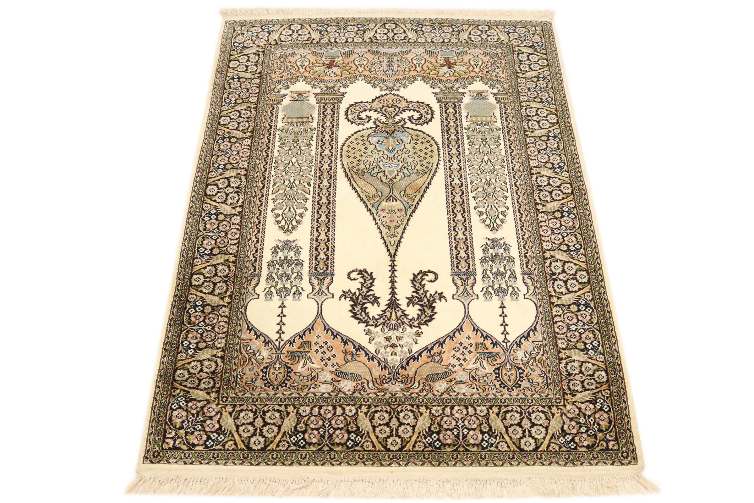 Dette håndknyttede silketæppe fra Kashmir afspejler de indiske tæppevæveres dygtighed. Ikke alene er det lavet af ren silke, men knudetætheden er så fin, at kun meget erfarne vævere kan skabe sådan et værk. Den fine natursilke er et fascinerende highlight. Den er ikke bare særlig blød at røre ved, men lader også farverne skinne i en lang række facetter. Afhængigt af lysindfaldet kommer der helt nye detaljer og farver til syne, som vil blive ved med at imponere i mange år fremover. Man kan se på et tæppe som dette i timevis og glemme alt om tid - en oplevelse, der ikke kan indfanges på et foto.