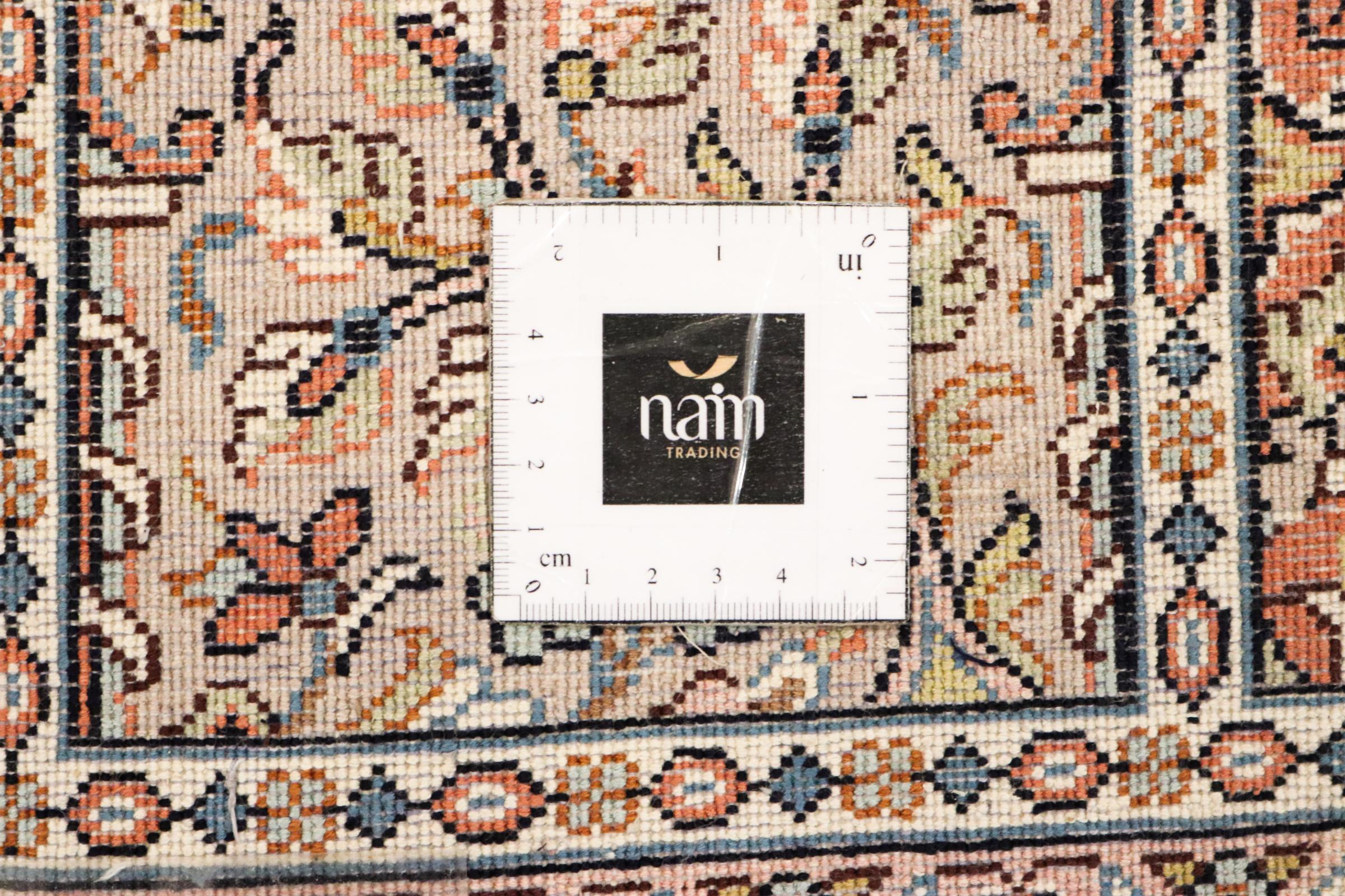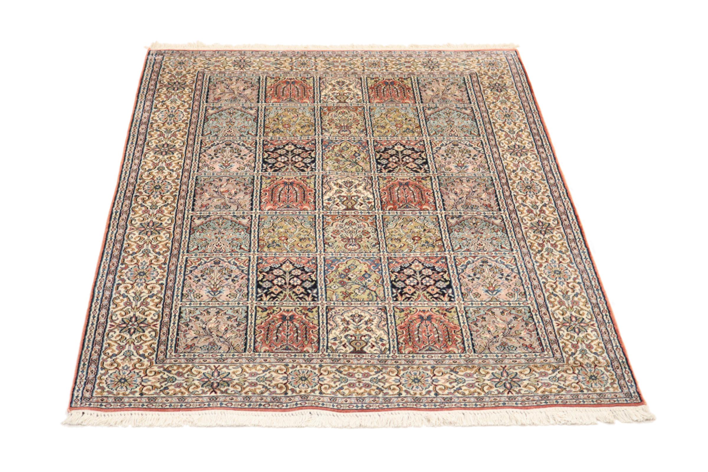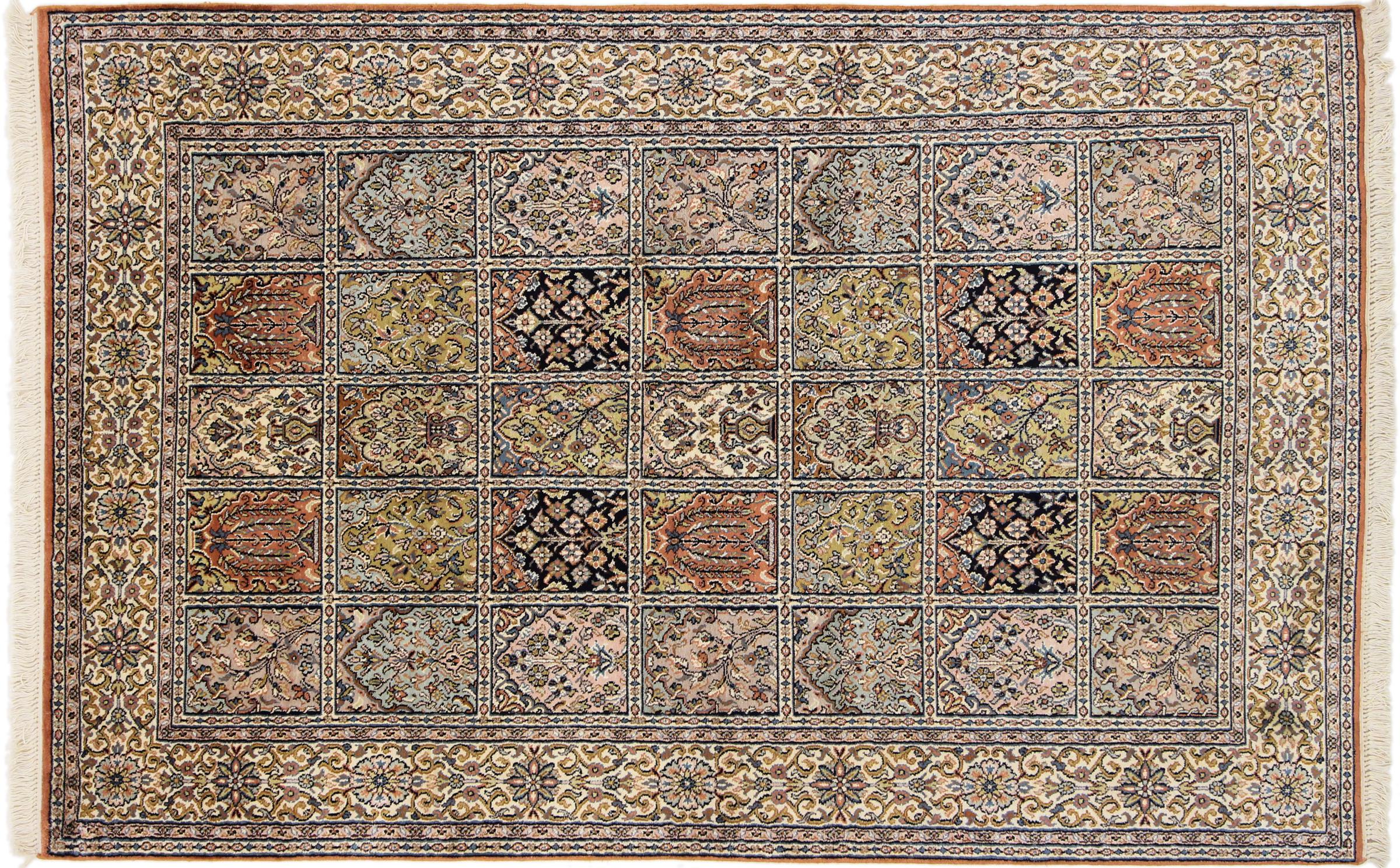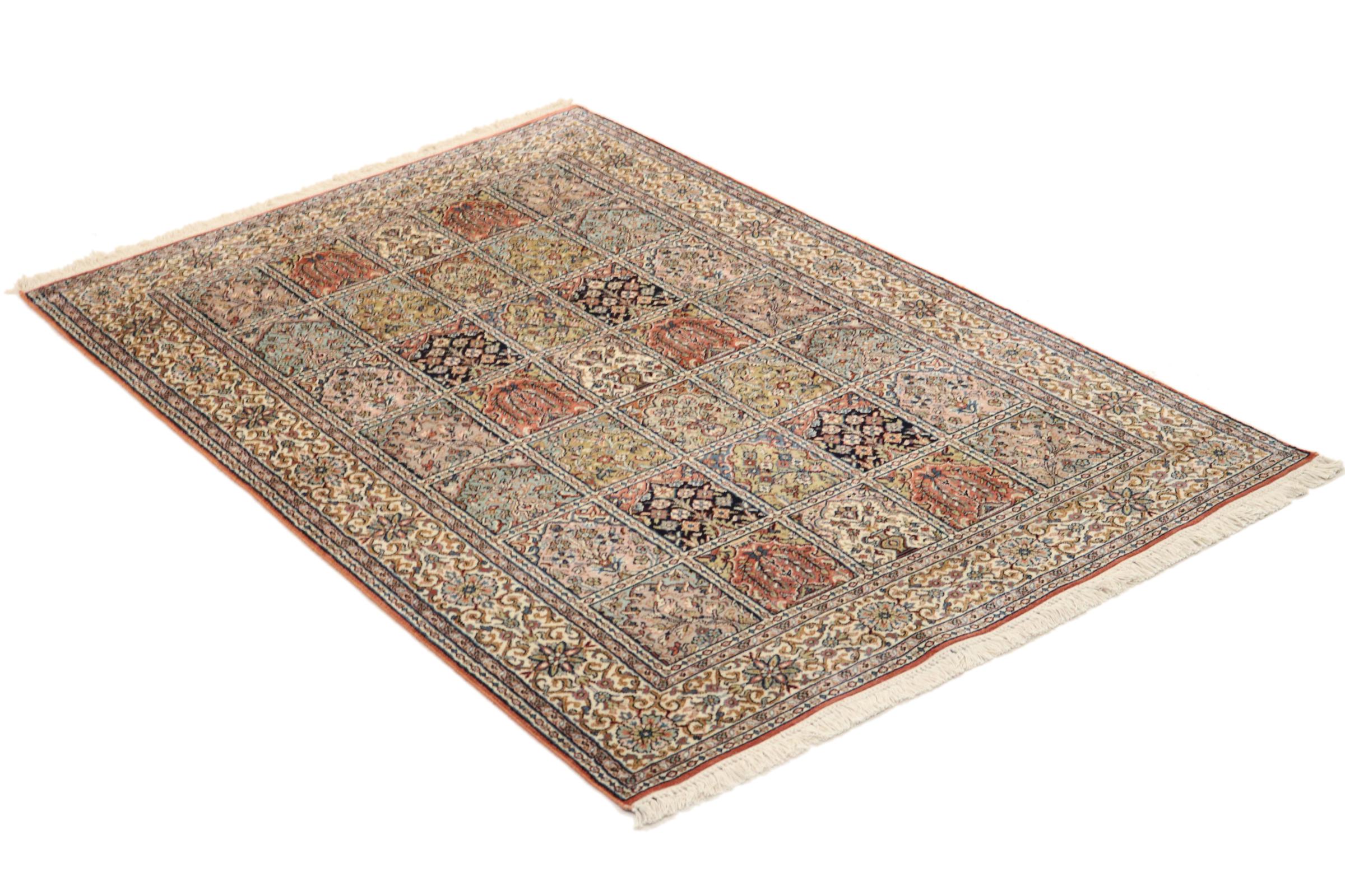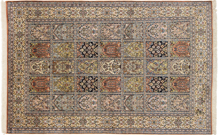 Dette håndknyttede silketæppe fra Kashmir afspejler de indiske tæppevæveres dygtighed. Ikke alene er det lavet af ren silke, men knudetætheden er så fin, at kun meget erfarne vævere kan skabe sådan et værk. Den fine natursilke er et fascinerende highlight. Den er ikke bare særlig blød at røre ved, men lader også farverne skinne i en lang række facetter. Afhængigt af lysindfaldet kommer der helt nye detaljer og farver til syne, som vil blive ved med at imponere i mange år fremover. Man kan se på et tæppe som dette i timevis og glemme alt om tid - en oplevelse, der ikke kan indfanges på et foto.