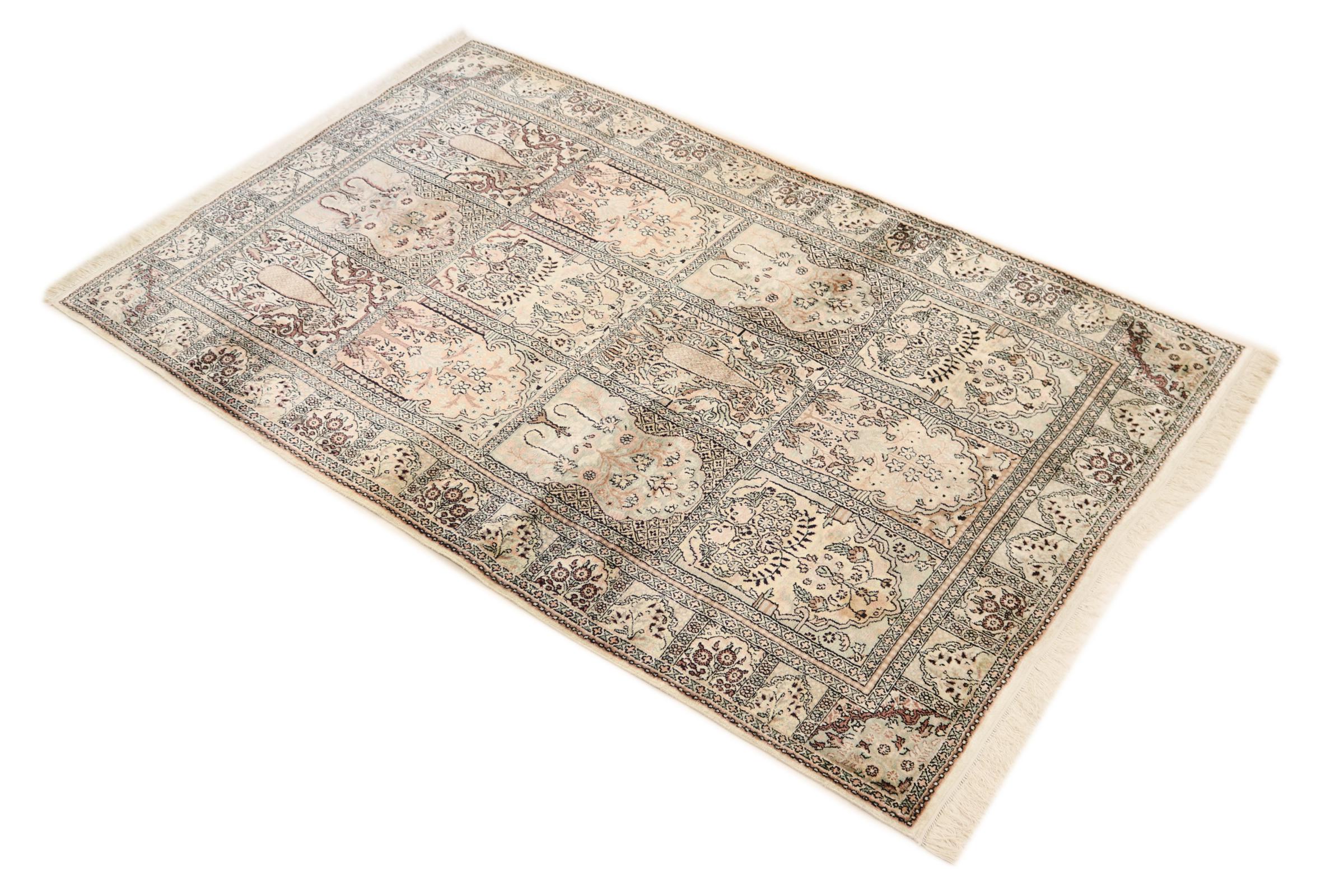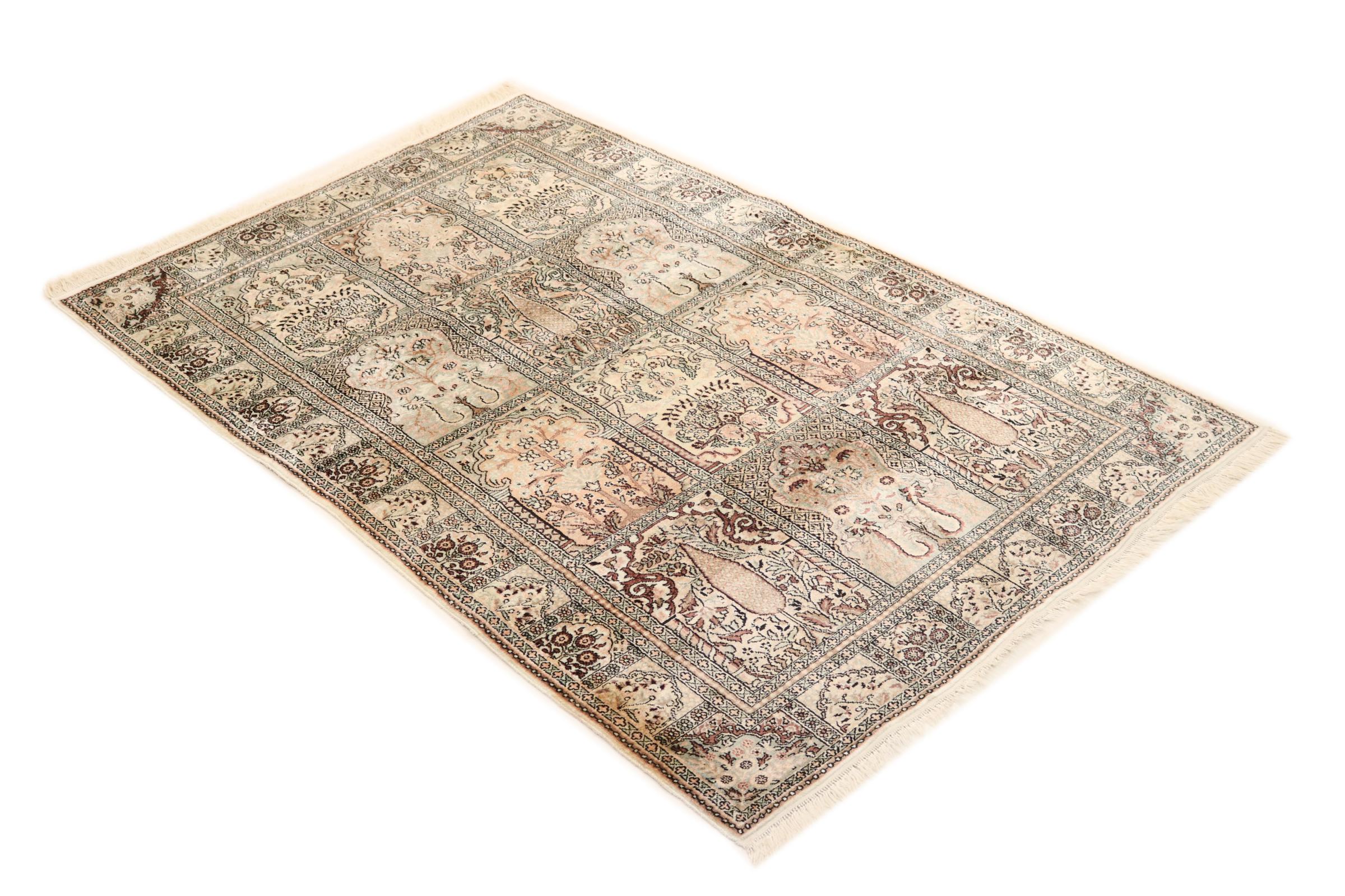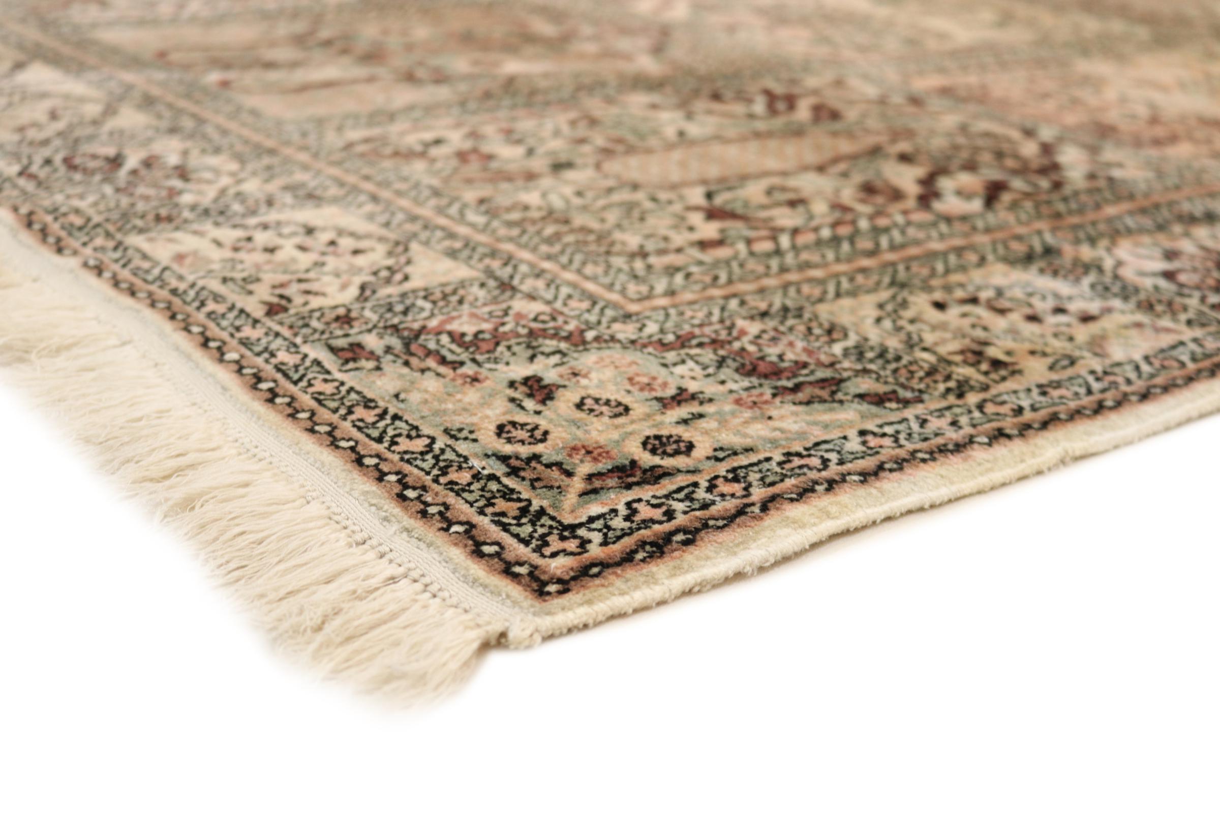 Dette håndknyttede silketæppe fra Kashmir afspejler de indiske tæppevæveres dygtighed. Ikke alene er det lavet af ren silke, men knudetætheden er så fin, at kun meget erfarne vævere kan skabe sådan et værk. Den fine natursilke er et fascinerende highlight. Den er ikke bare særlig blød at røre ved, men lader også farverne skinne i en lang række facetter. Afhængigt af lysindfaldet kommer der helt nye detaljer og farver til syne, som vil blive ved med at imponere i mange år fremover. Man kan se på et tæppe som dette i timevis og glemme alt om tid - en oplevelse, der ikke kan indfanges på et foto.