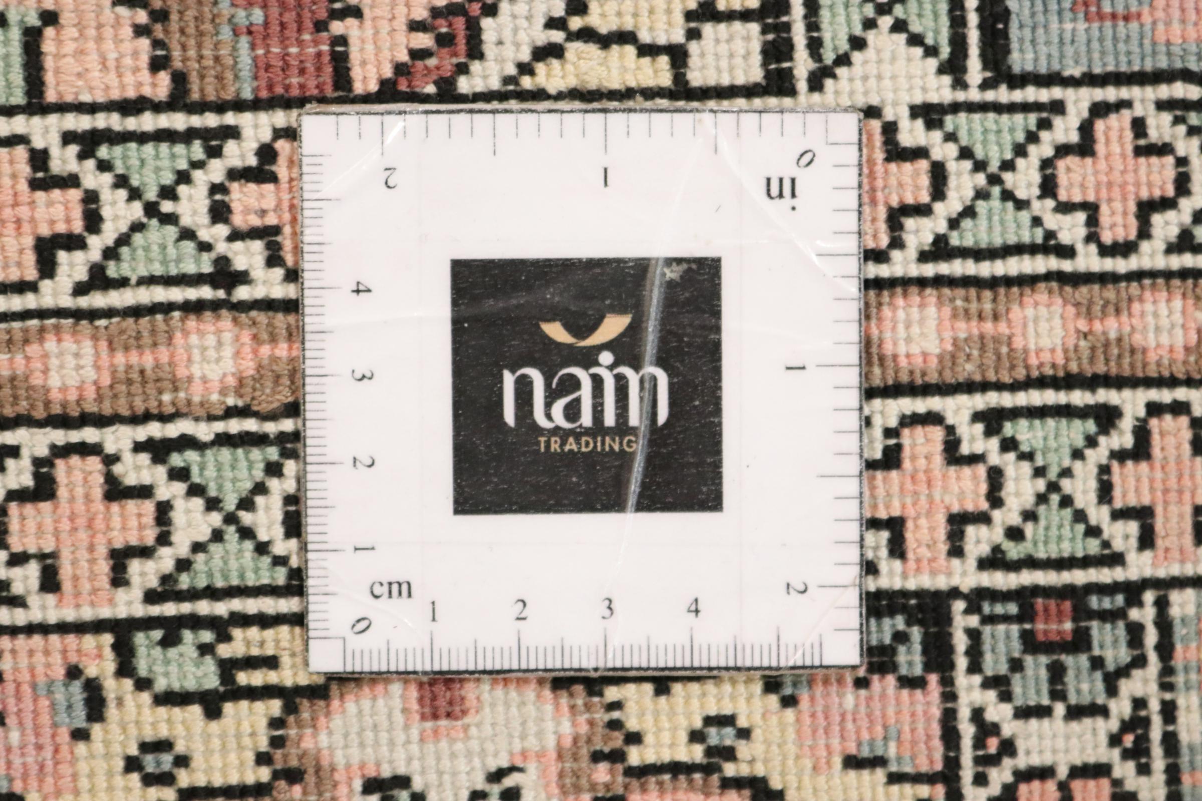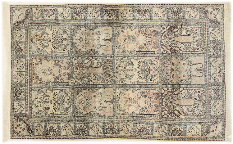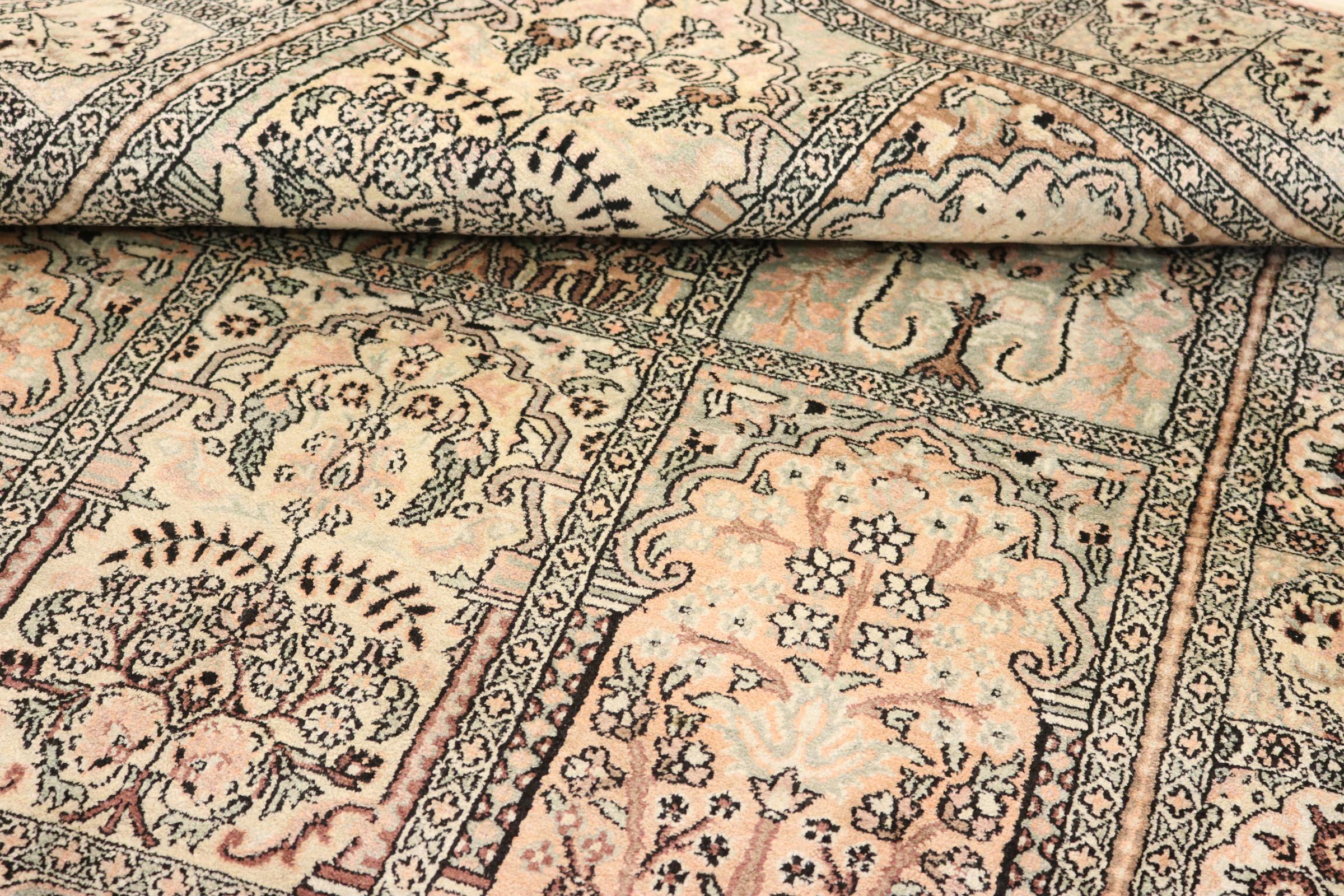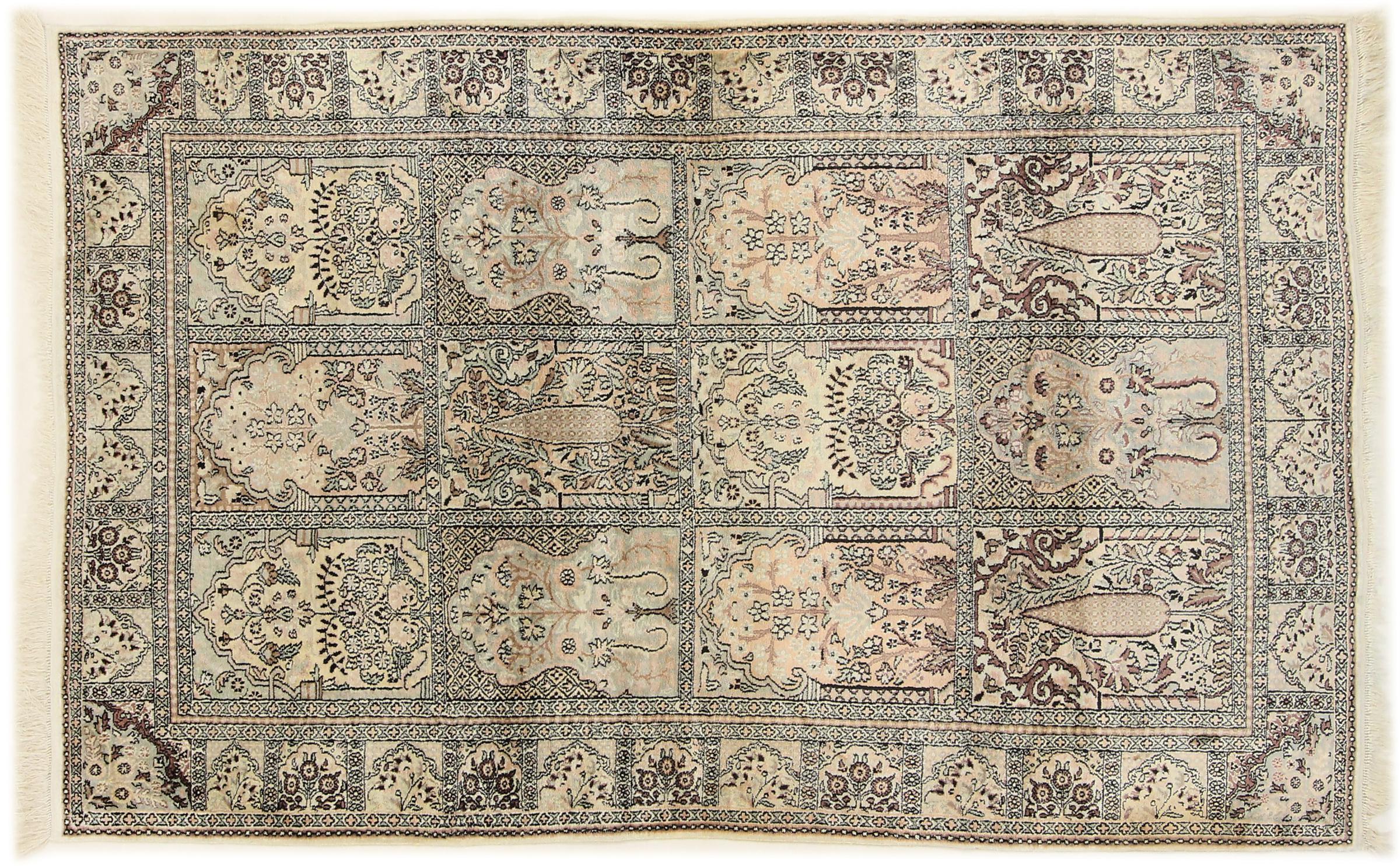 Dette håndknyttede silketæppe fra Kashmir afspejler de indiske tæppevæveres dygtighed. Ikke alene er det lavet af ren silke, men knudetætheden er så fin, at kun meget erfarne vævere kan skabe sådan et værk. Den fine natursilke er et fascinerende highlight. Den er ikke bare særlig blød at røre ved, men lader også farverne skinne i en lang række facetter. Afhængigt af lysindfaldet kommer der helt nye detaljer og farver til syne, som vil blive ved med at imponere i mange år fremover. Man kan se på et tæppe som dette i timevis og glemme alt om tid - en oplevelse, der ikke kan indfanges på et foto.