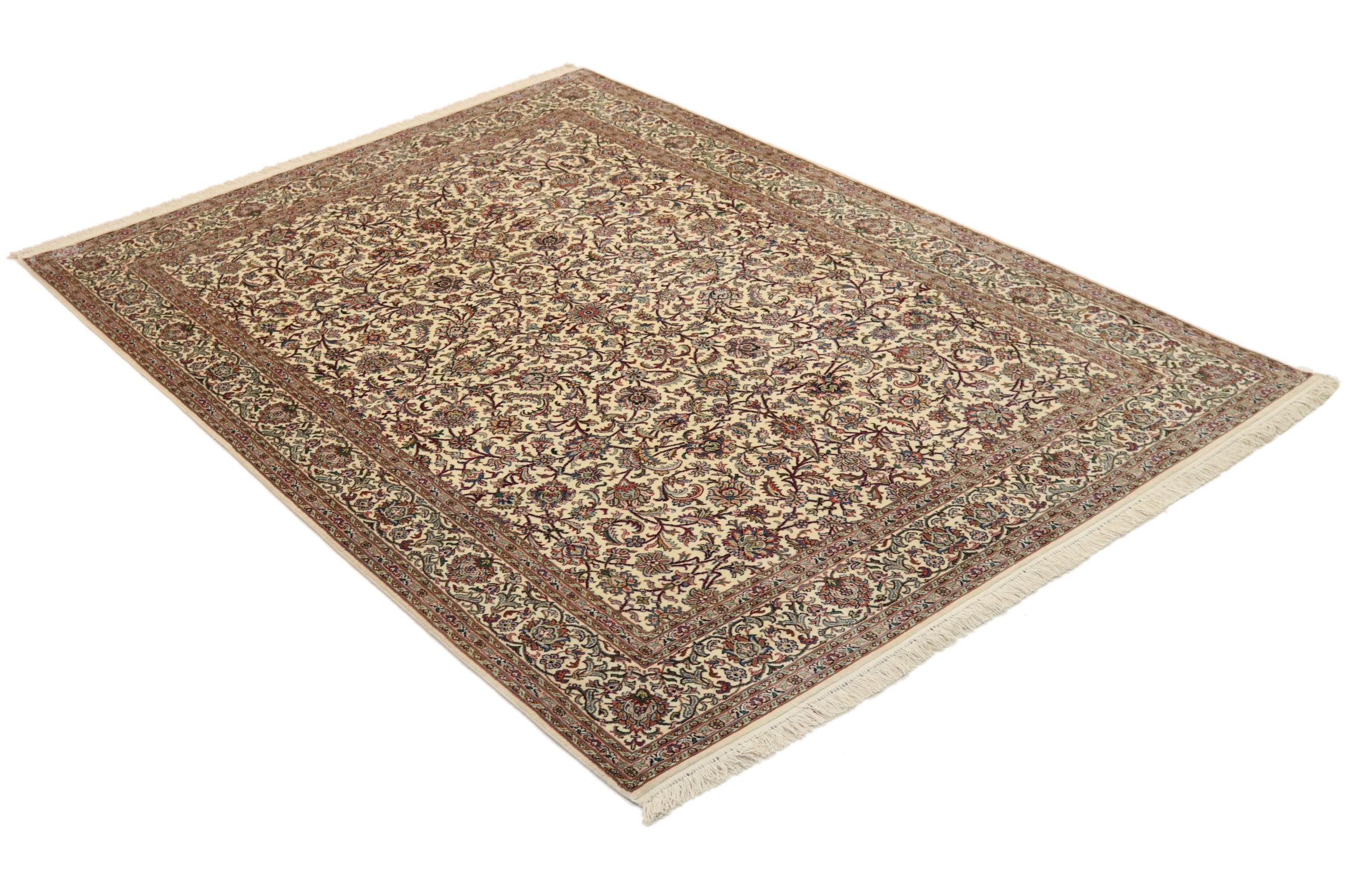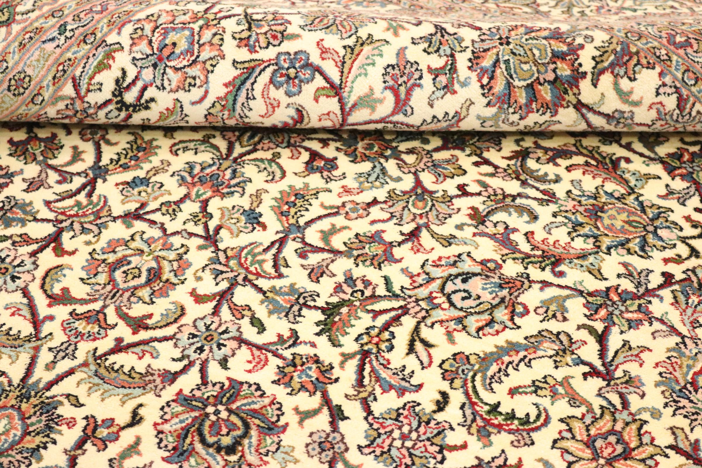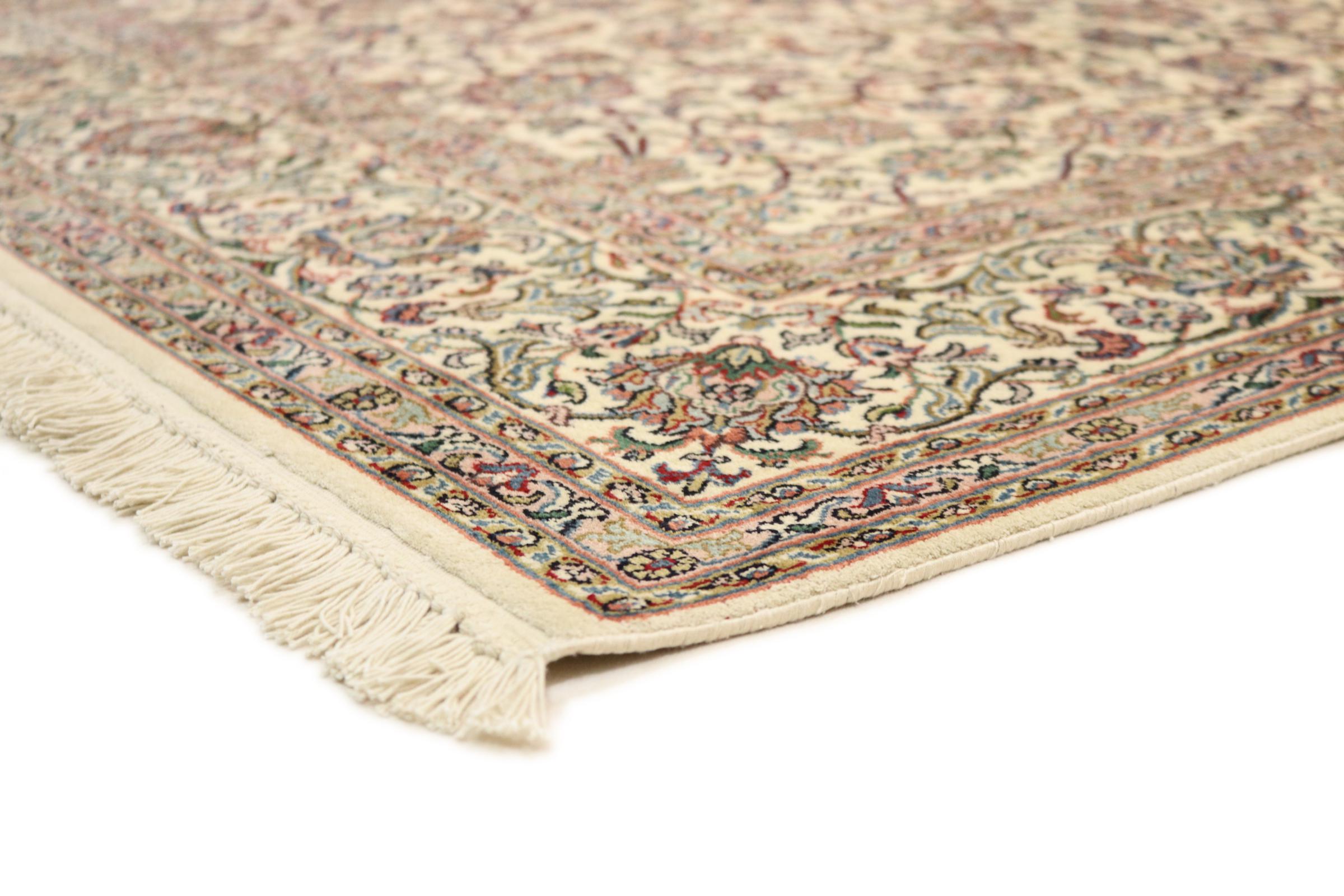 Dette håndknyttede silketæppe fra Kashmir afspejler de indiske tæppevæveres dygtighed. Ikke alene er det lavet af ren silke, men knudetætheden er så fin, at kun meget erfarne vævere kan skabe sådan et værk. Den fine natursilke er et fascinerende highlight. Den er ikke bare særlig blød at røre ved, men lader også farverne skinne i en lang række facetter. Afhængigt af lysindfaldet kommer der helt nye detaljer og farver til syne, som vil blive ved med at imponere i mange år fremover. Man kan se på et tæppe som dette i timevis og glemme alt om tid - en oplevelse, der ikke kan indfanges på et foto.