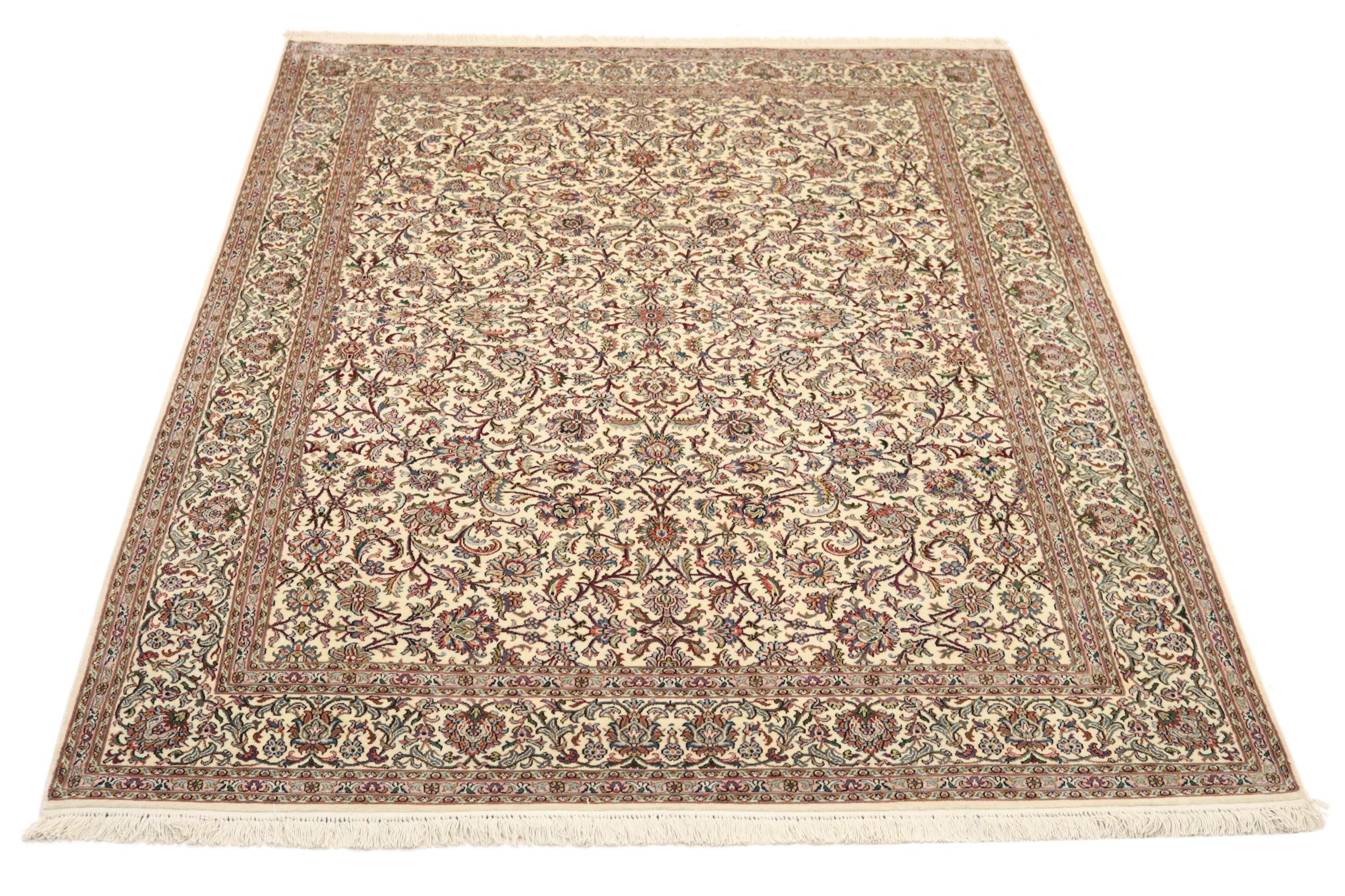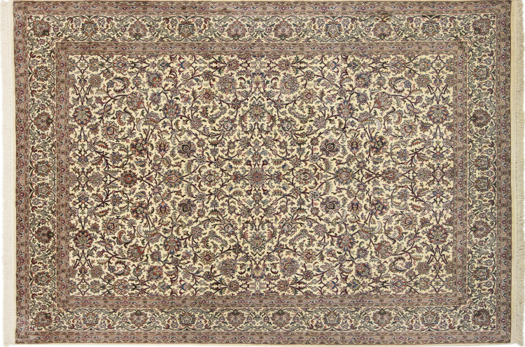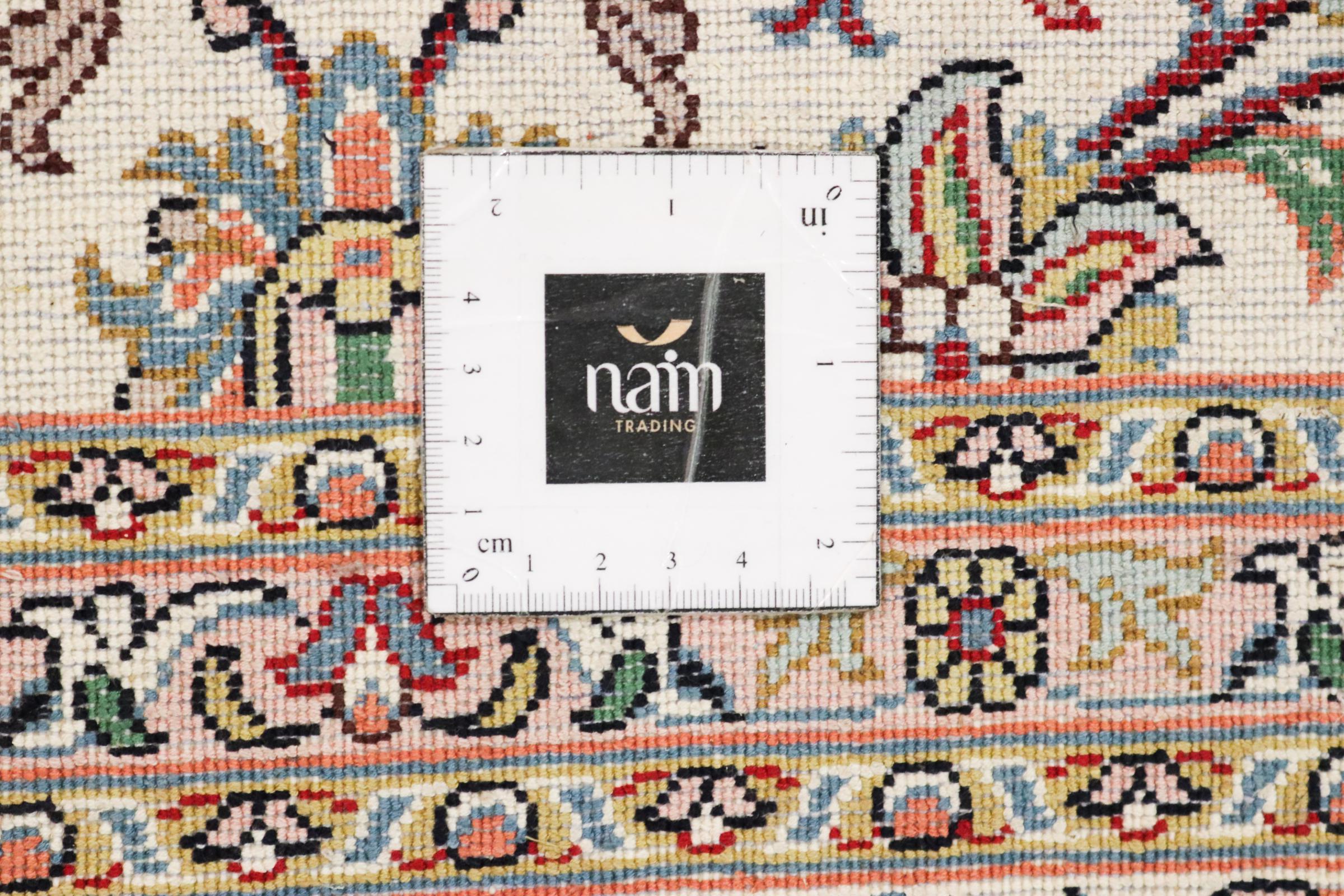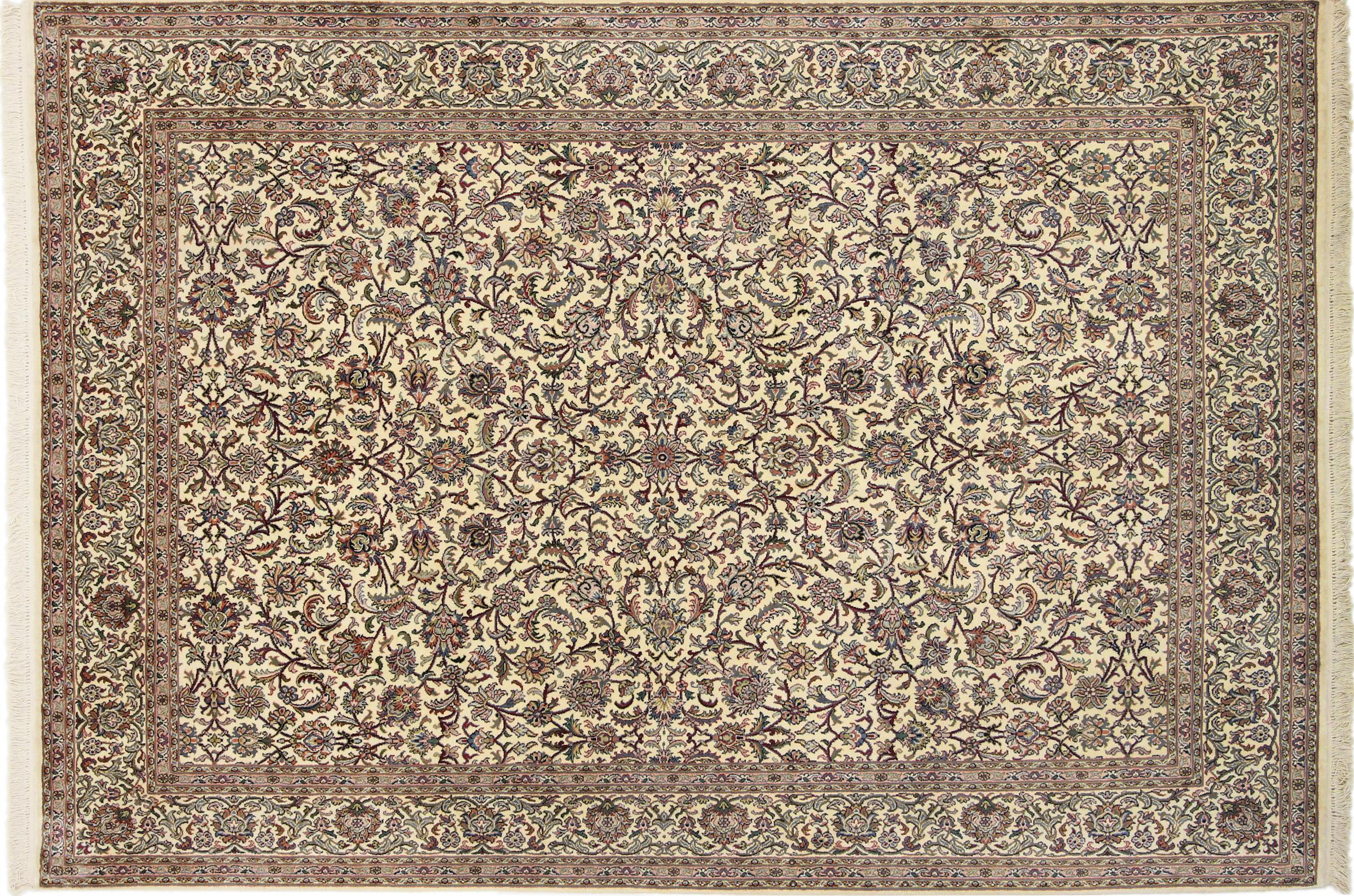 Dette håndknyttede silketæppe fra Kashmir afspejler de indiske tæppevæveres dygtighed. Ikke alene er det lavet af ren silke, men knudetætheden er så fin, at kun meget erfarne vævere kan skabe sådan et værk. Den fine natursilke er et fascinerende highlight. Den er ikke bare særlig blød at røre ved, men lader også farverne skinne i en lang række facetter. Afhængigt af lysindfaldet kommer der helt nye detaljer og farver til syne, som vil blive ved med at imponere i mange år fremover. Man kan se på et tæppe som dette i timevis og glemme alt om tid - en oplevelse, der ikke kan indfanges på et foto.