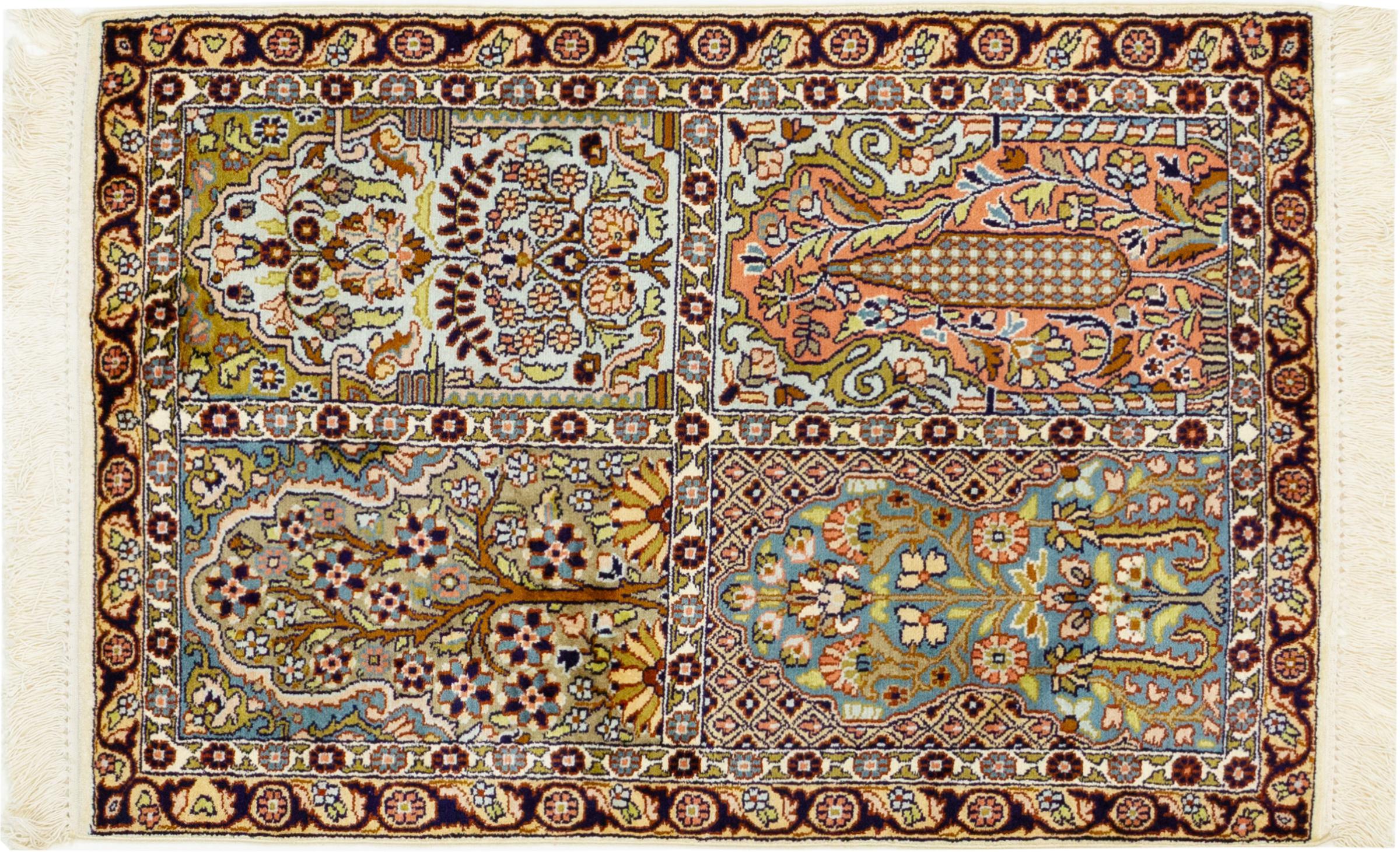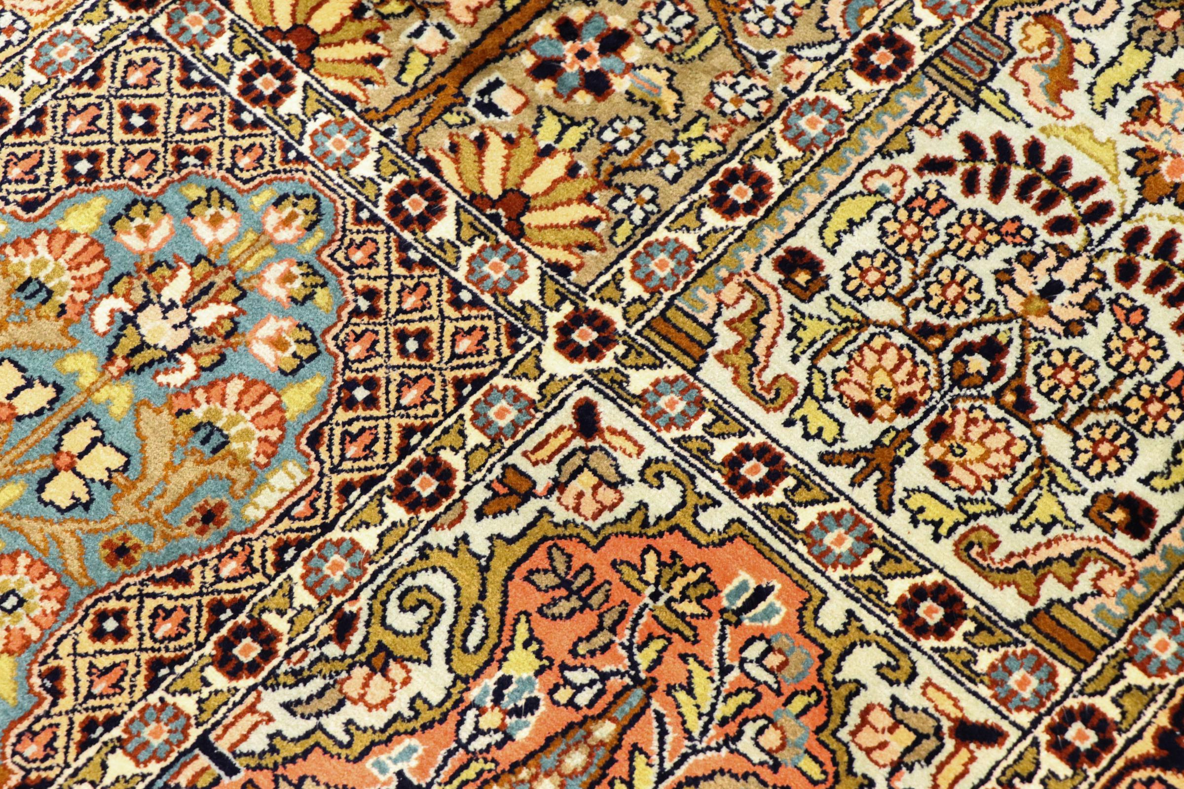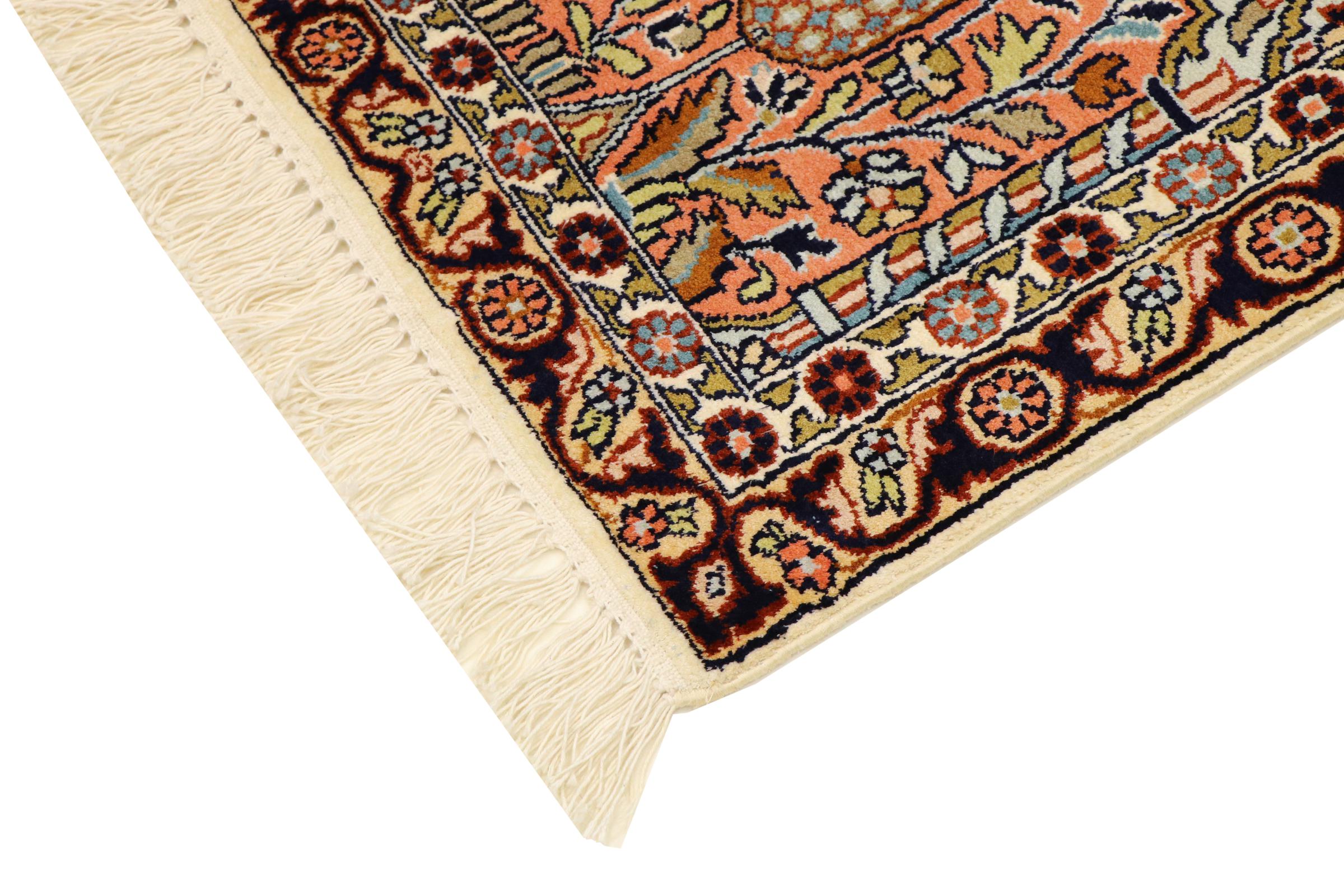 Dette håndknyttede silketæppe fra Kashmir afspejler de indiske tæppevæveres dygtighed. Ikke alene er det lavet af ren silke, men knudetætheden er så fin, at kun meget erfarne vævere kan skabe sådan et værk. Den fine natursilke er et fascinerende highlight. Den er ikke bare særlig blød at røre ved, men lader også farverne skinne i en lang række facetter. Afhængigt af lysindfaldet kommer der helt nye detaljer og farver til syne, som vil blive ved med at imponere i mange år fremover. Man kan se på et tæppe som dette i timevis og glemme alt om tid - en oplevelse, der ikke kan indfanges på et foto.
