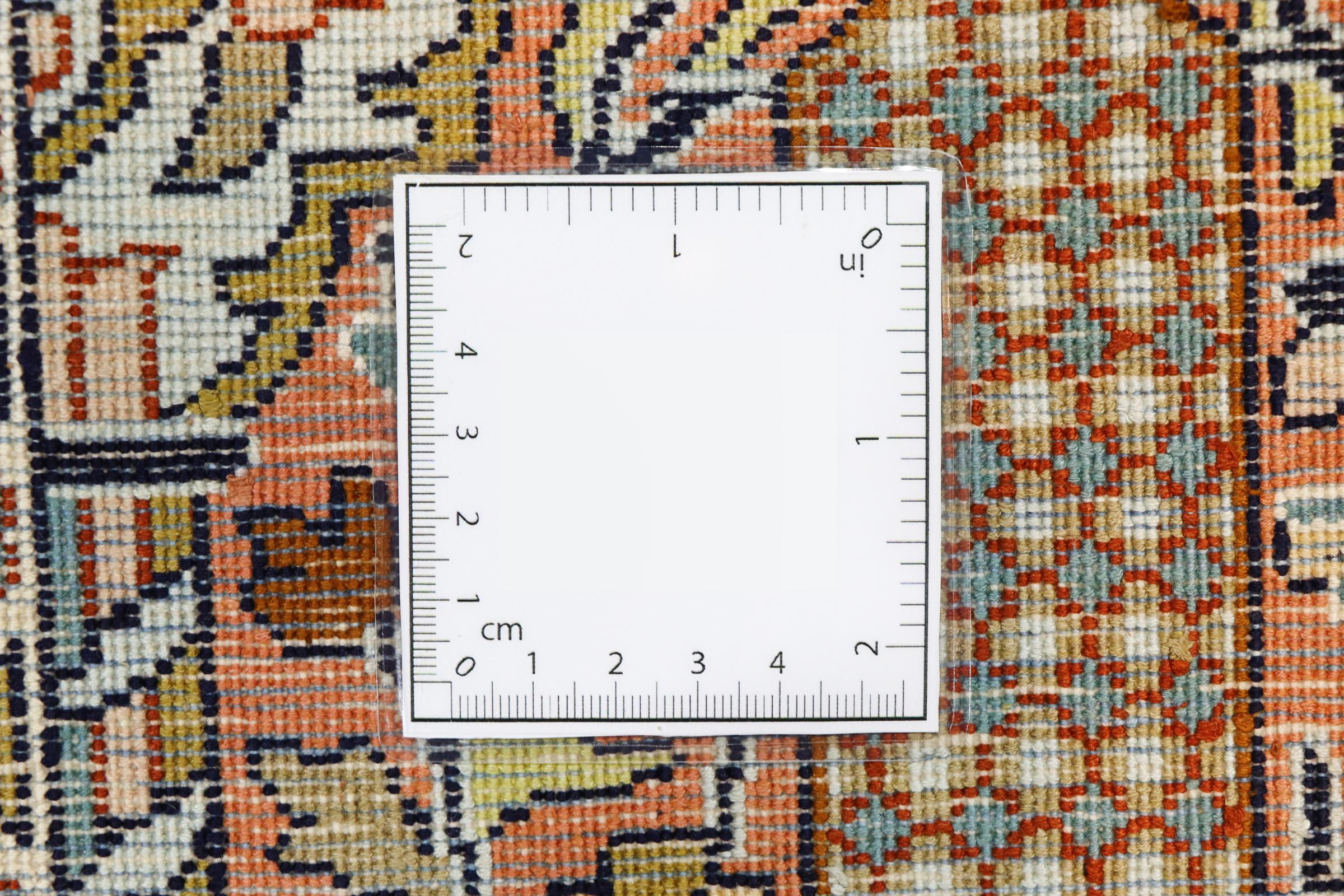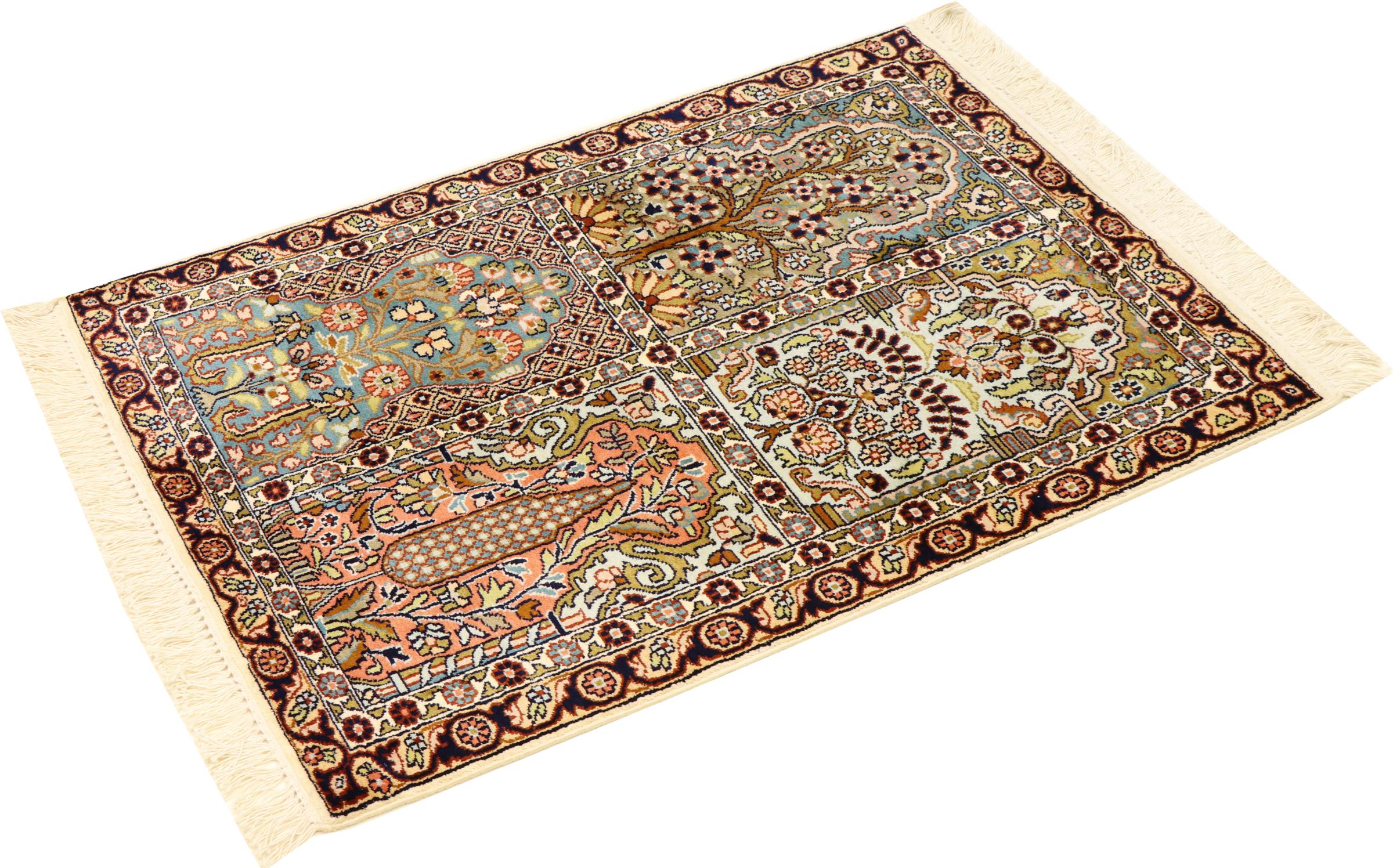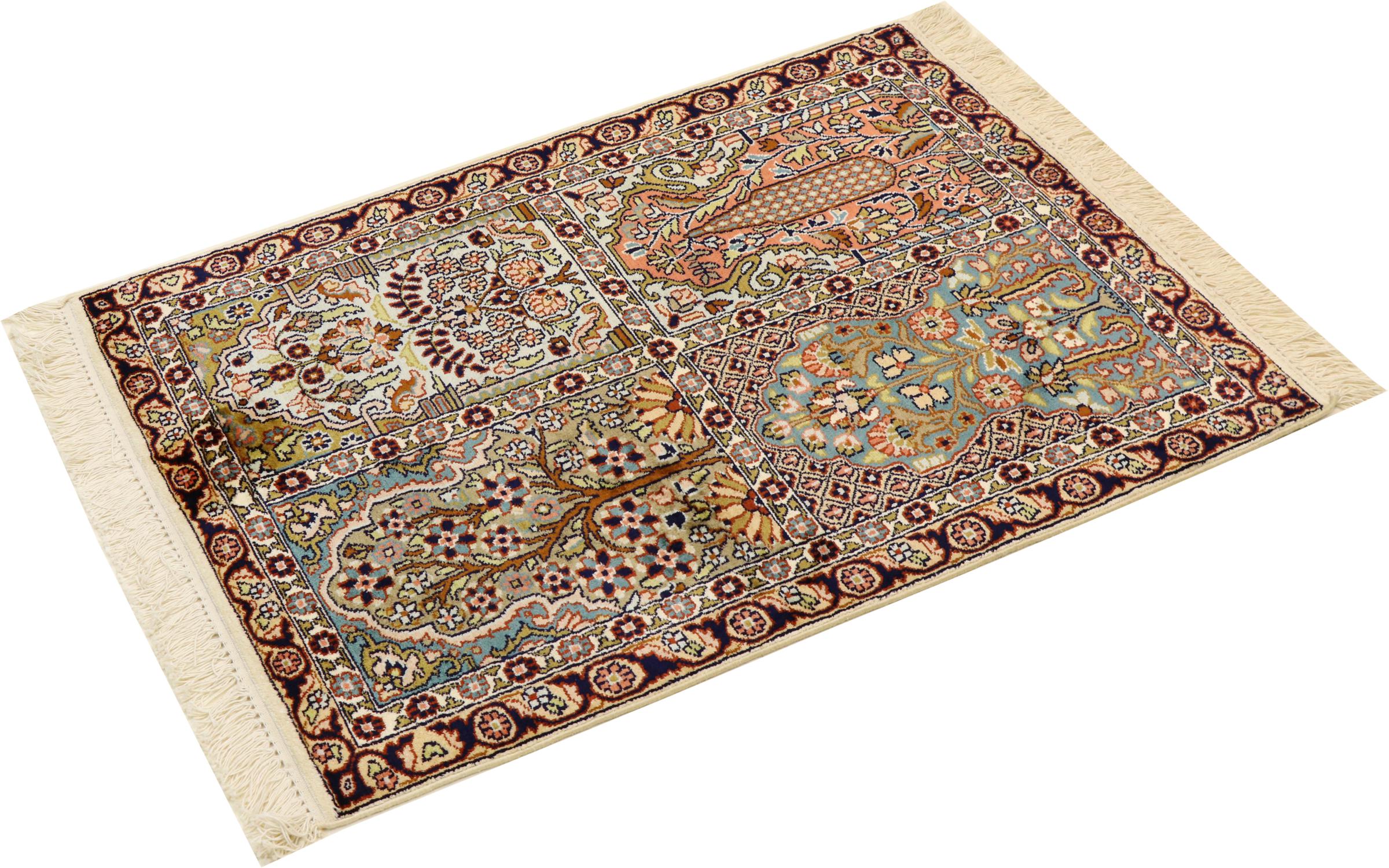 Dette håndknyttede silketæppe fra Kashmir afspejler de indiske tæppevæveres dygtighed. Ikke alene er det lavet af ren silke, men knudetætheden er så fin, at kun meget erfarne vævere kan skabe sådan et værk. Den fine natursilke er et fascinerende highlight. Den er ikke bare særlig blød at røre ved, men lader også farverne skinne i en lang række facetter. Afhængigt af lysindfaldet kommer der helt nye detaljer og farver til syne, som vil blive ved med at imponere i mange år fremover. Man kan se på et tæppe som dette i timevis og glemme alt om tid - en oplevelse, der ikke kan indfanges på et foto.