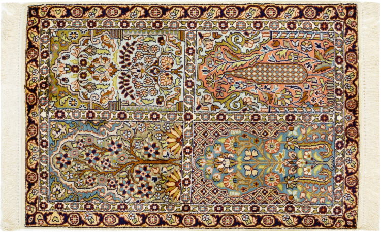 Tæppe-nr.: 303328005144743 Størrelse: 96x63 cm Tykkelse: ca. 5 mm Knuder: 440 000 - 490 000 / m² Forarbejdelse: Knyttet i hånden Luv: Silke Kæde: Bomuld Oprindelse: Indien Alder: Ny Vægt: ca. 2 kg Antal på lager: Unik - Kun 1 tilbage på lager