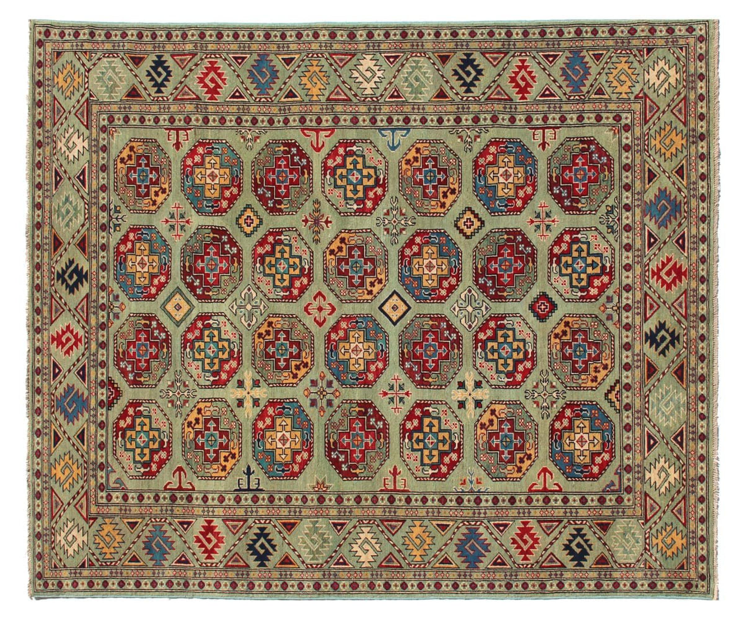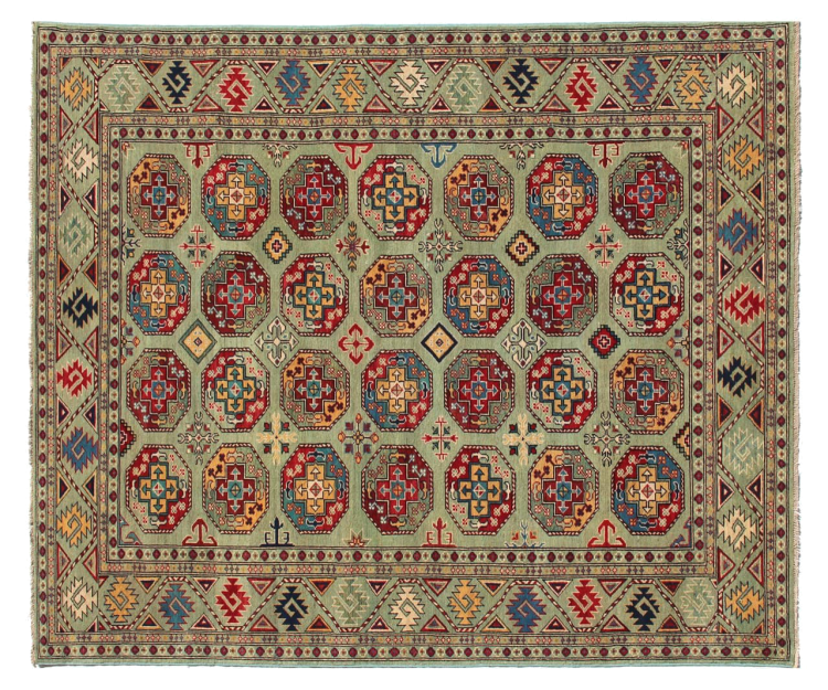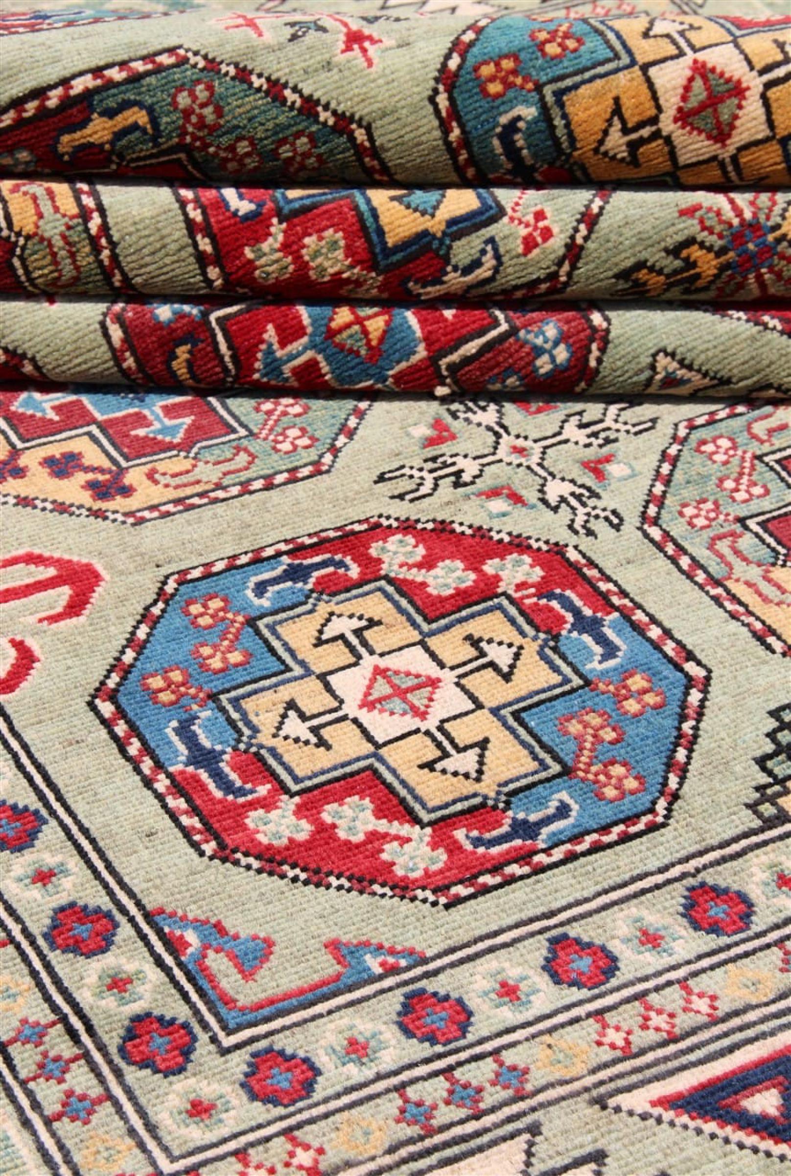 Dette håndknyttede Kazak er håndknyttet i stil med kaukasiske tæpper og imponerer med sin høje robusthed og levende farver. Det afspejler således kulturen i Kaukasus i en smuk komposition. En kultur, der i århundreder har mestret kunsten at væve tæpper og præsenterer den for omverdenen med charmerende enkle former i imponerende levende farver.