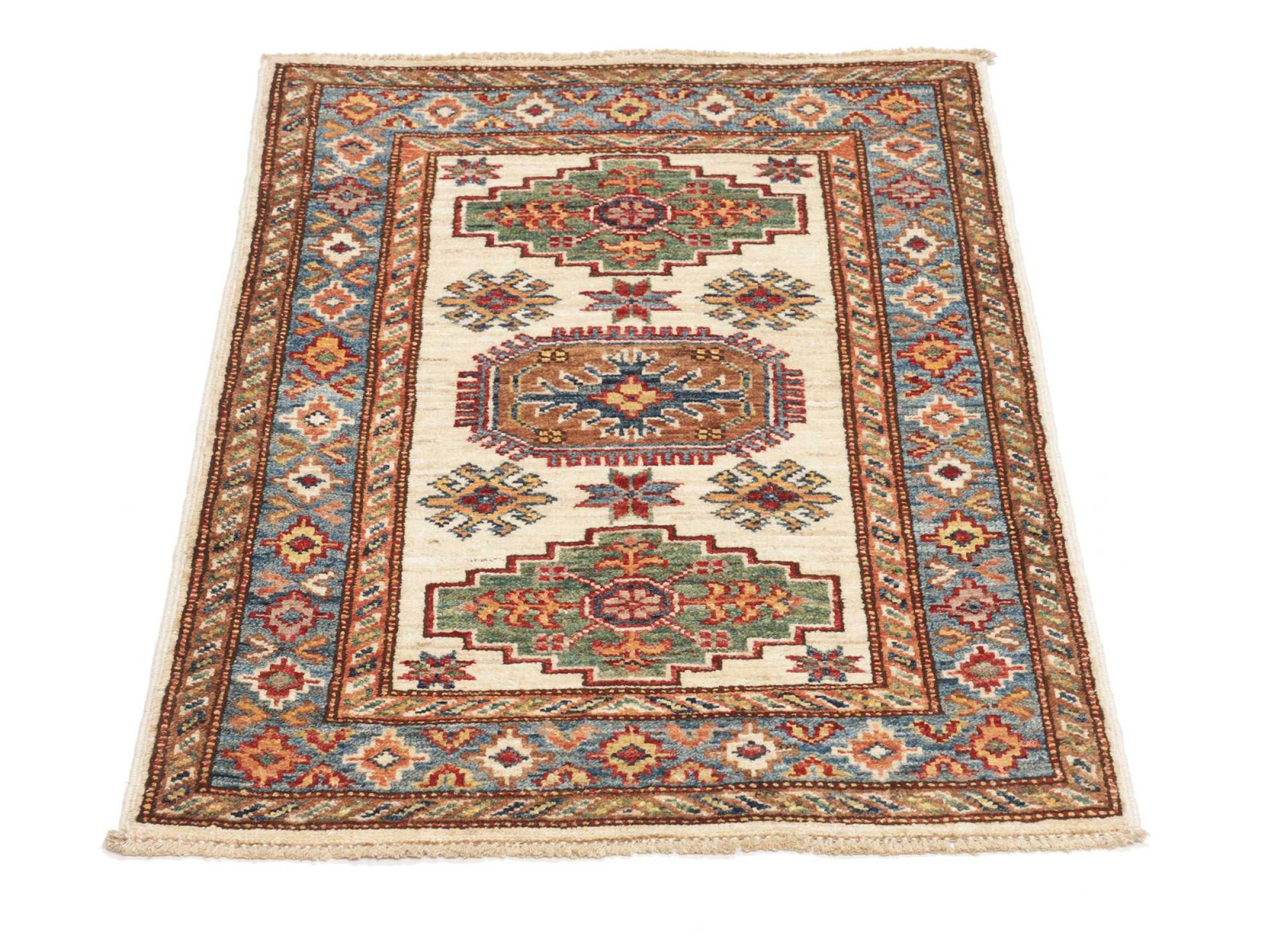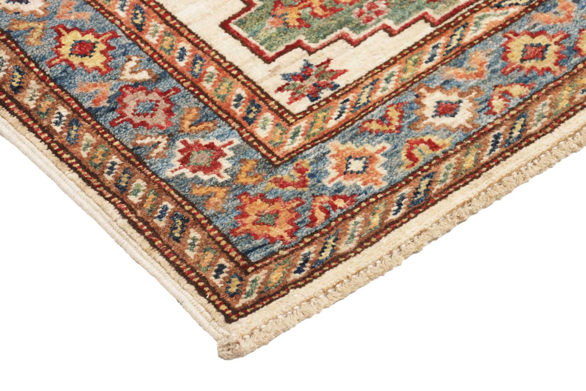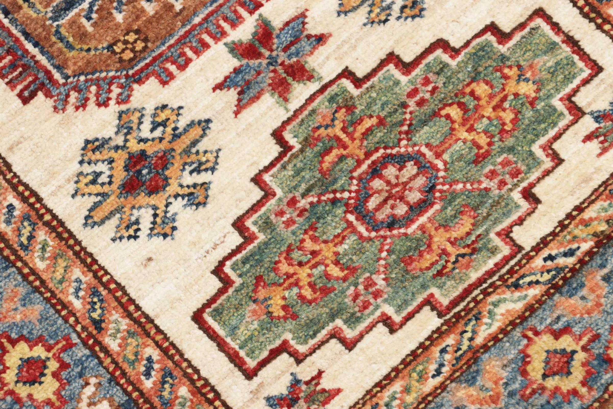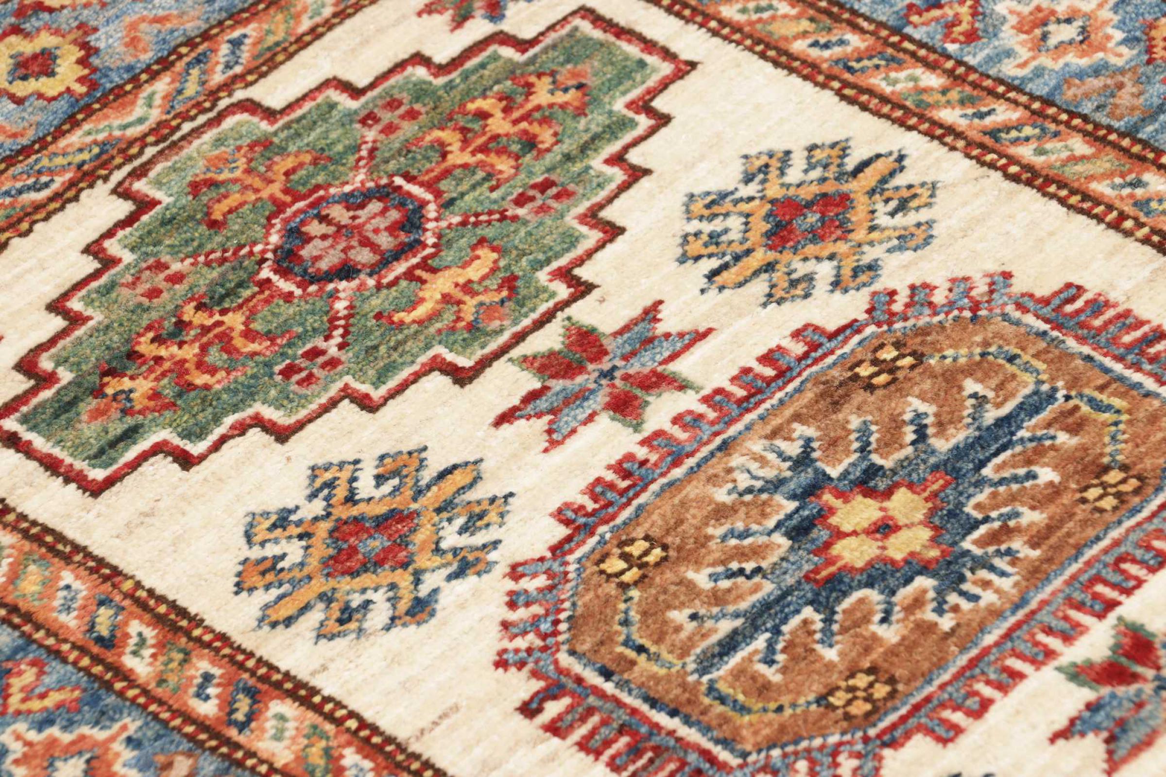 Dette håndknyttede Kazak er håndknyttet i stil med kaukasiske tæpper og imponerer med sin høje robusthed og levende farver. Det afspejler således kulturen i Kaukasus i en smuk komposition. En kultur, der i århundreder har mestret kunsten at væve tæpper og præsenterer den for omverdenen med charmerende enkle former i imponerende levende farver.