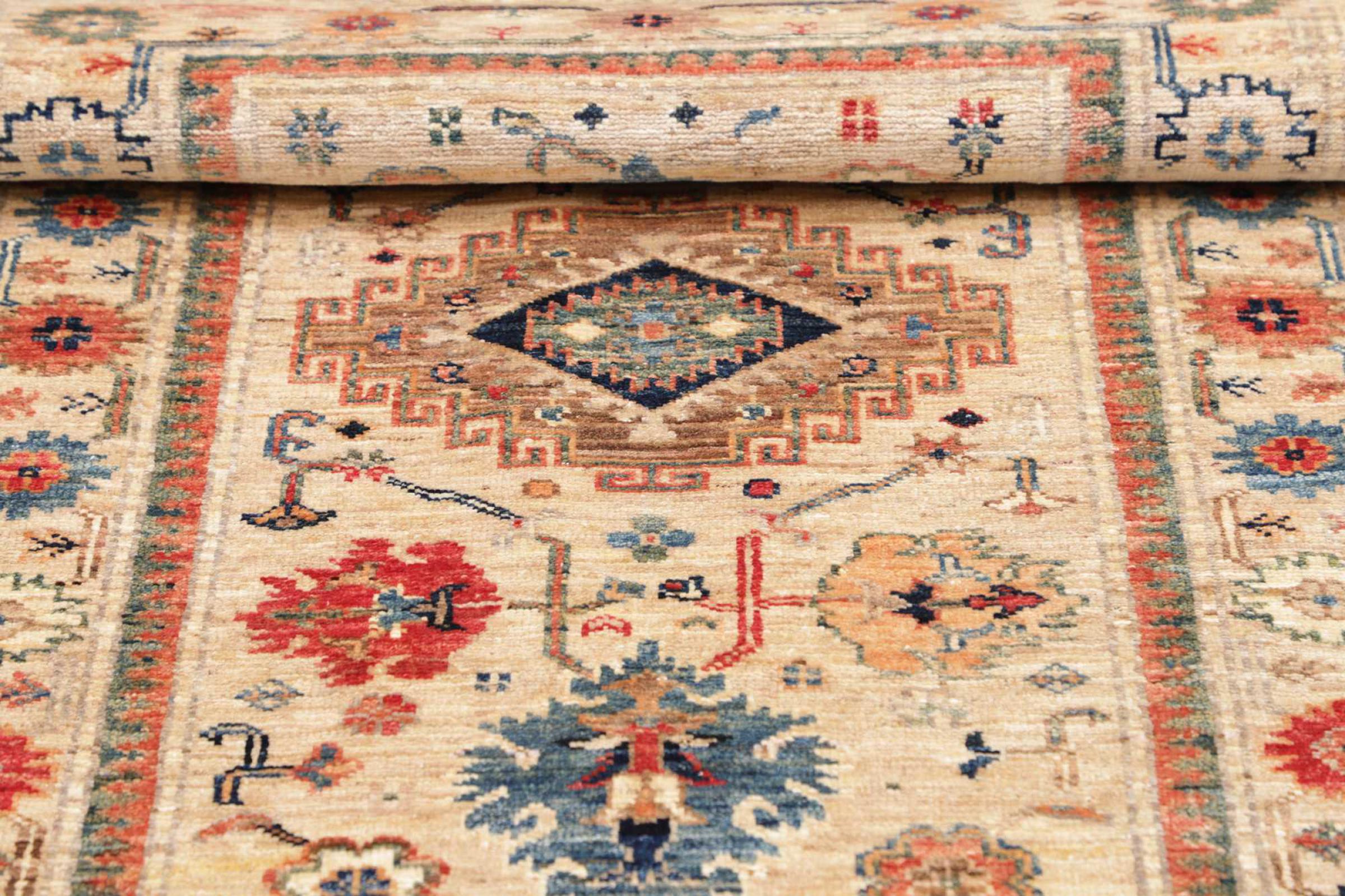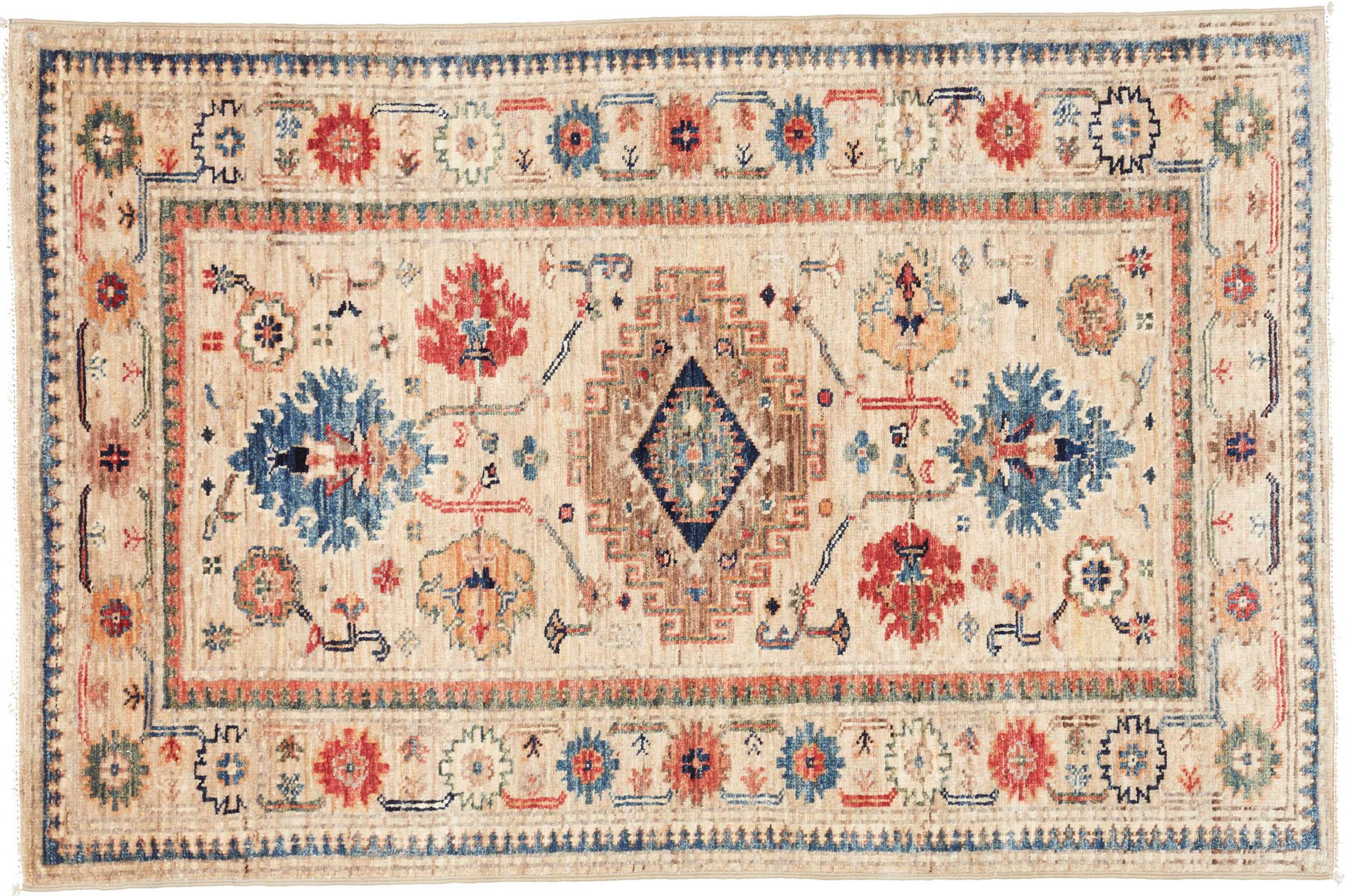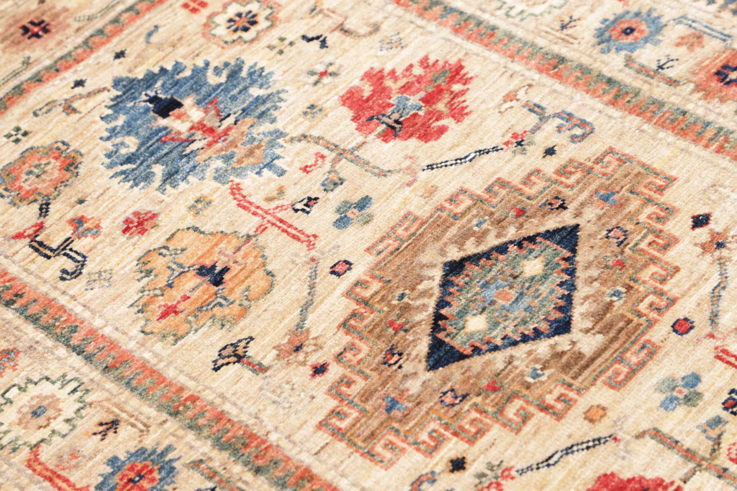 Dette håndknyttede Kazak er håndknyttet i stil med kaukasiske tæpper og imponerer med sin høje robusthed og levende farver. Det afspejler således kulturen i Kaukasus i en smuk komposition. En kultur, der i århundreder har mestret kunsten at væve tæpper og præsenterer den for omverdenen med charmerende enkle former i imponerende levende farver.