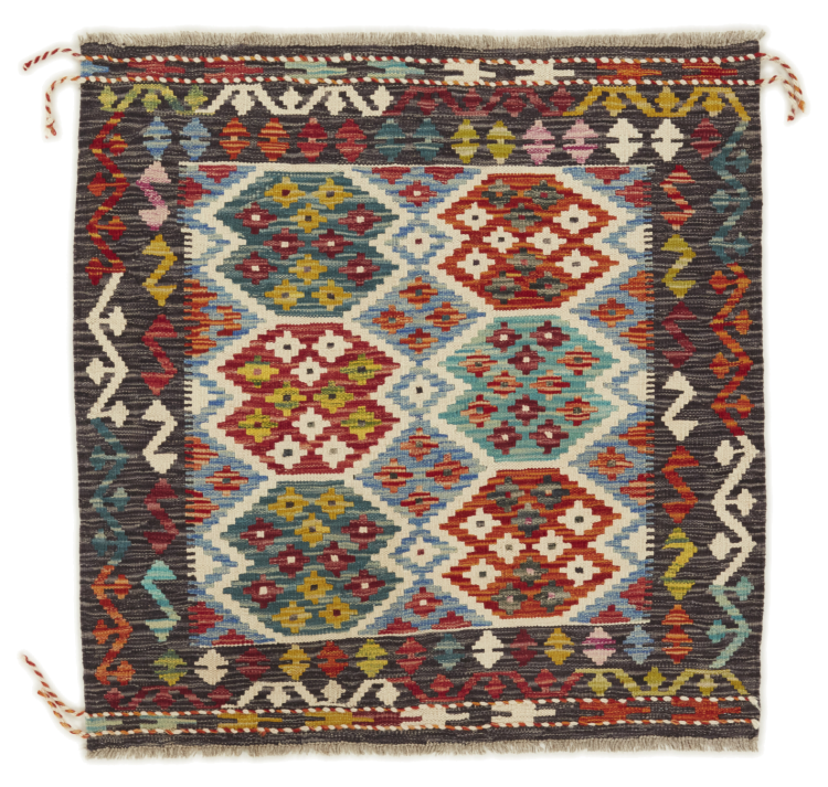 Tæppe-nr.: 299571005792681 Størrelse: 104x102 cm Tykkelse: ca. 3 mm Forarbejdelse: Håndvævet Luv: Håndspunden uld Kæde: Uld Oprindelse: Afghanistan Alder: Ny Vægt: ca. 2 kg Antal på lager: Unik - Kun 1 tilbage på lager